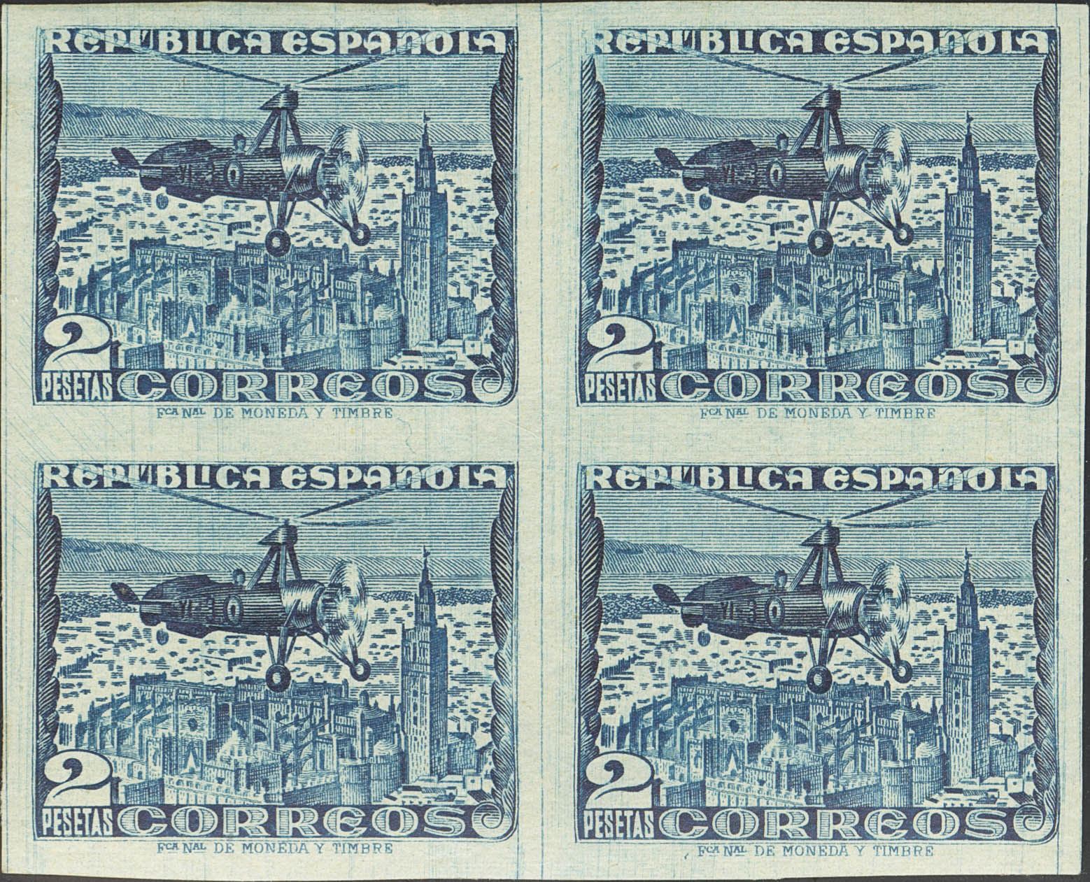 ★ 769s(4). 1938. 2 pts azul, bloque de cuatro. SIN DENTAR. MAGNIFICO. Edifil 2026: 232 Euros