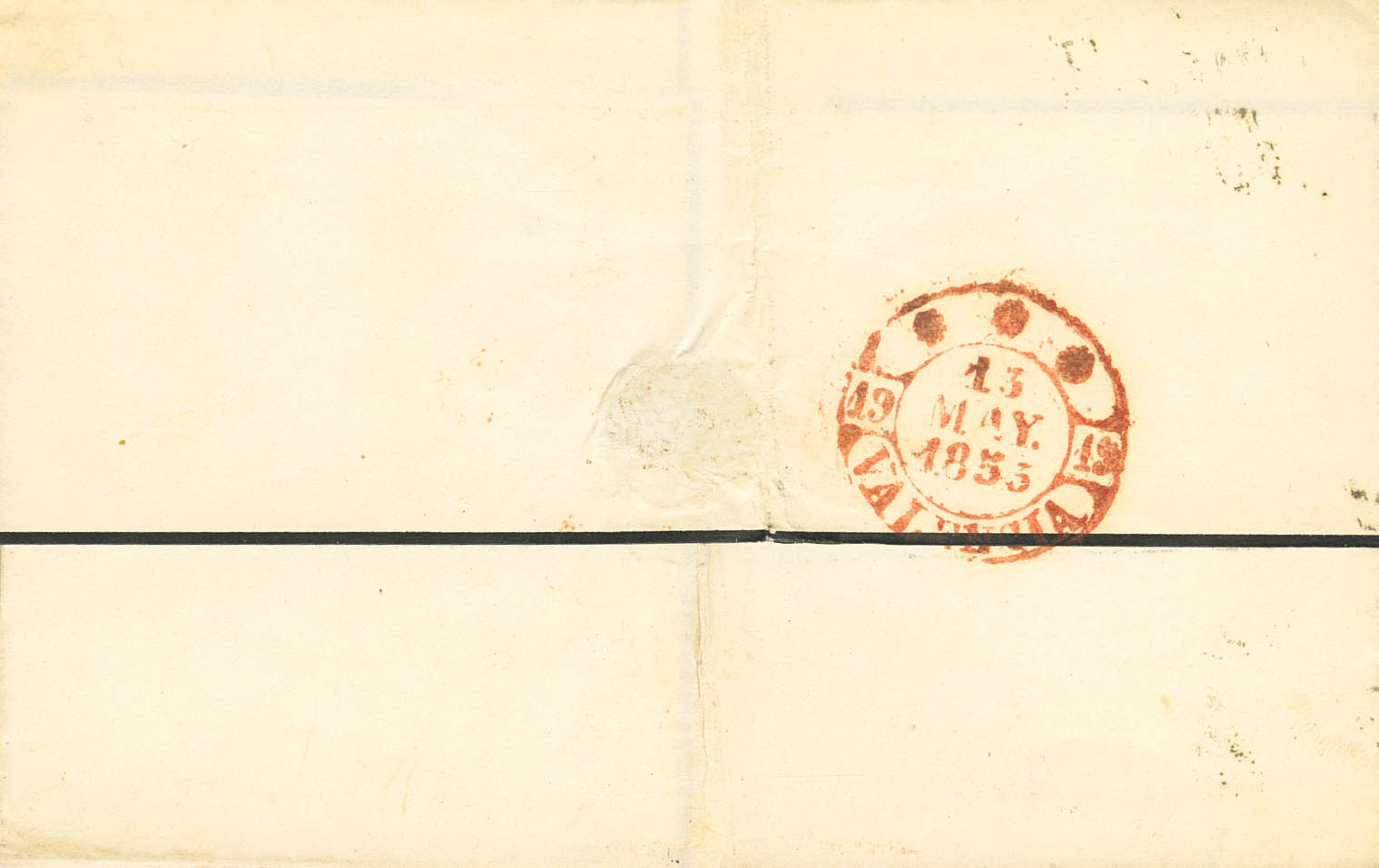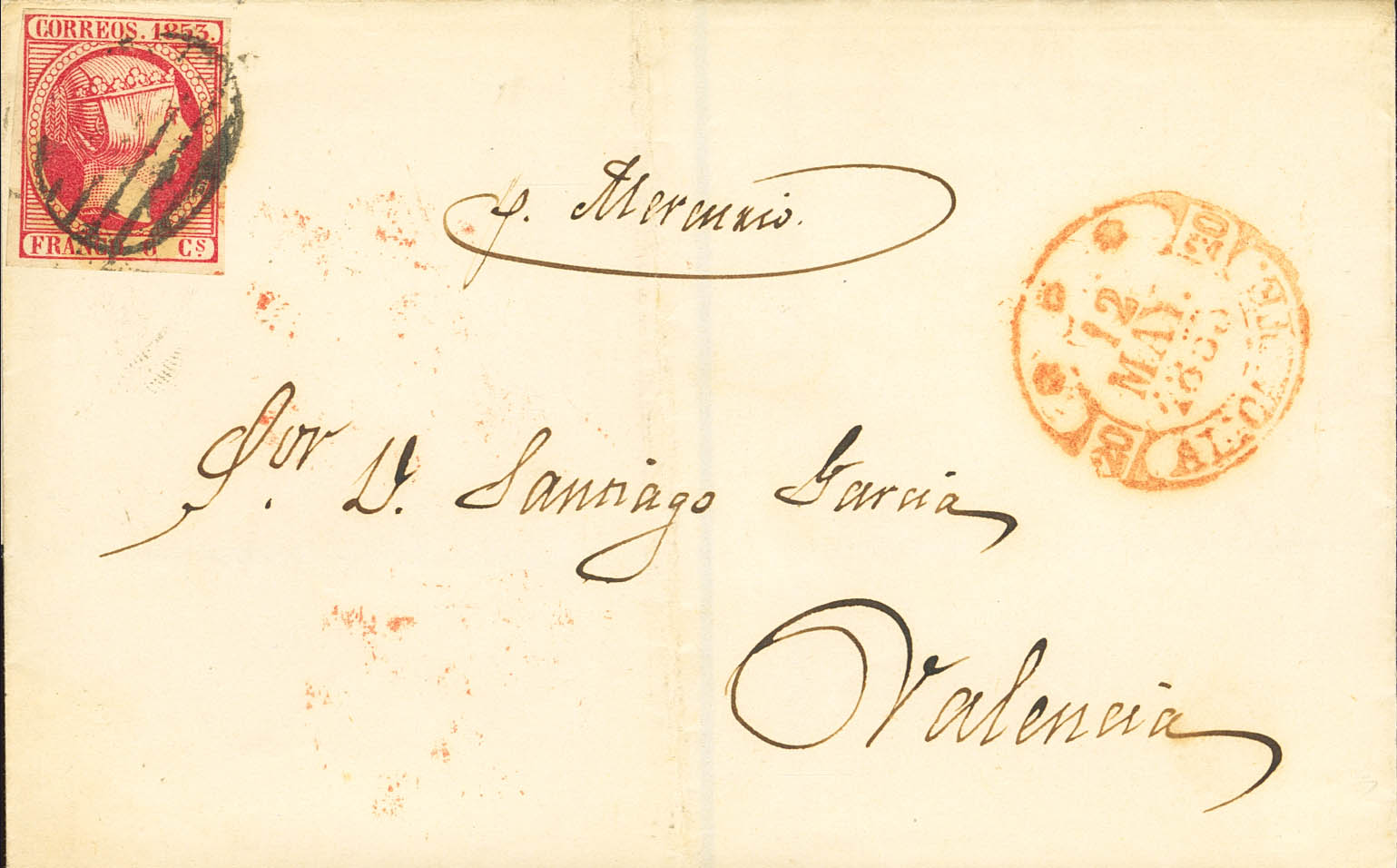 17. 1853. 6 cuartos rosa. ALICANTE a VALENCIA. Manuscrito "P. Mercurio", transportada por vapor. MAGNIFICA.