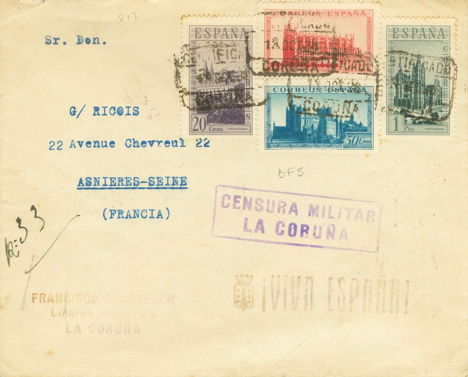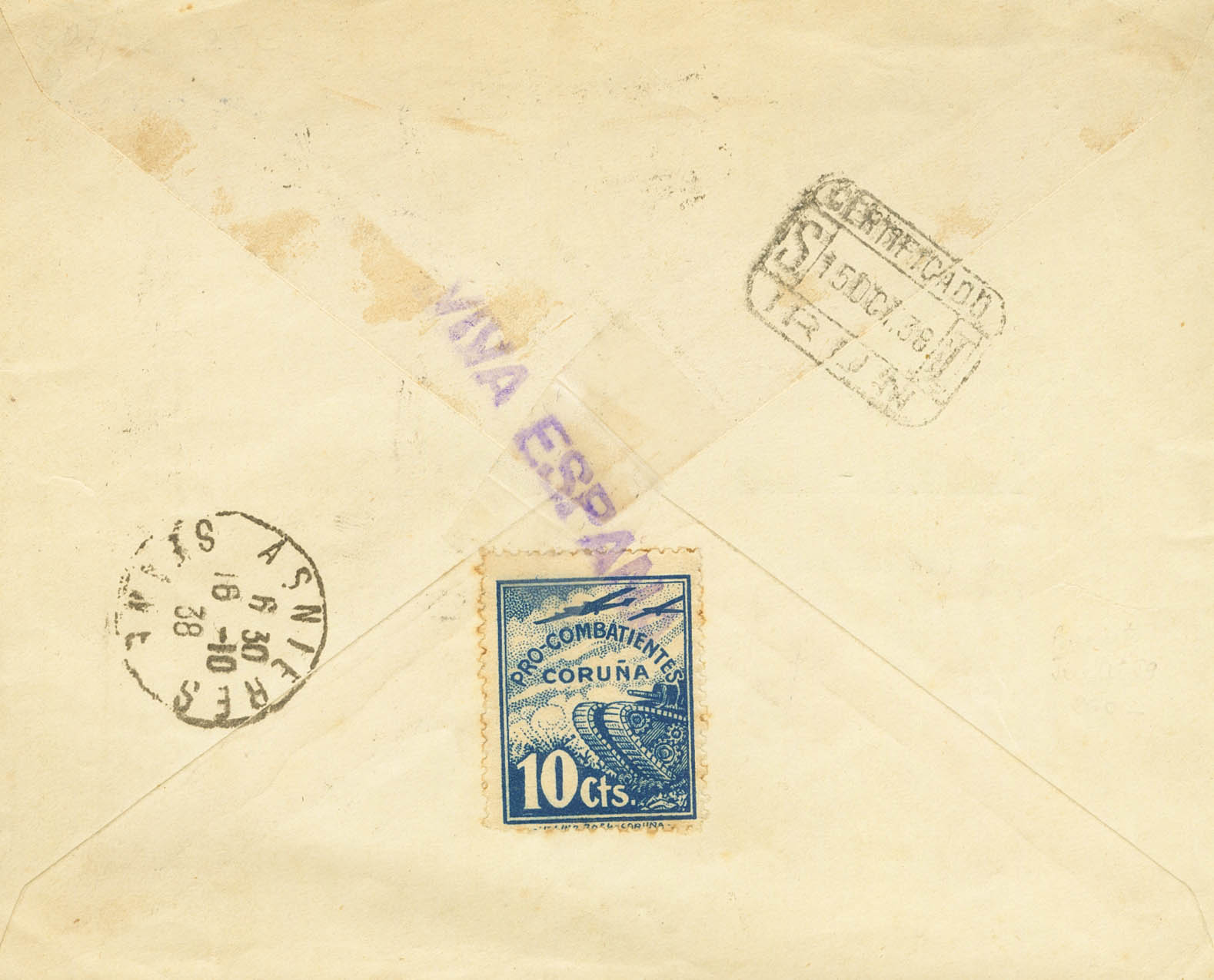 SH847. 1938. Serie completa, procedente de la hoja bloque. Certificado de CORUÑA a ASNIERES SUR SEINE (FRANCIA). Al dorso llegada. MAGNIFICA.