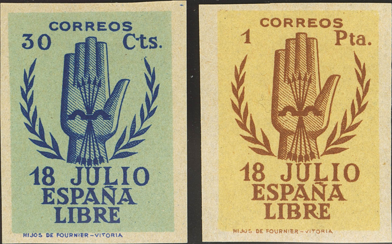 ★★ 853efs, 854efs. 1938. 30 cts azul y 1 pts amarillo. A FALTA DEL FONDO FRANCO y SIN DENTAR. MAGNIFICOS Y RAROS. Edifil 2021: 760 Euros