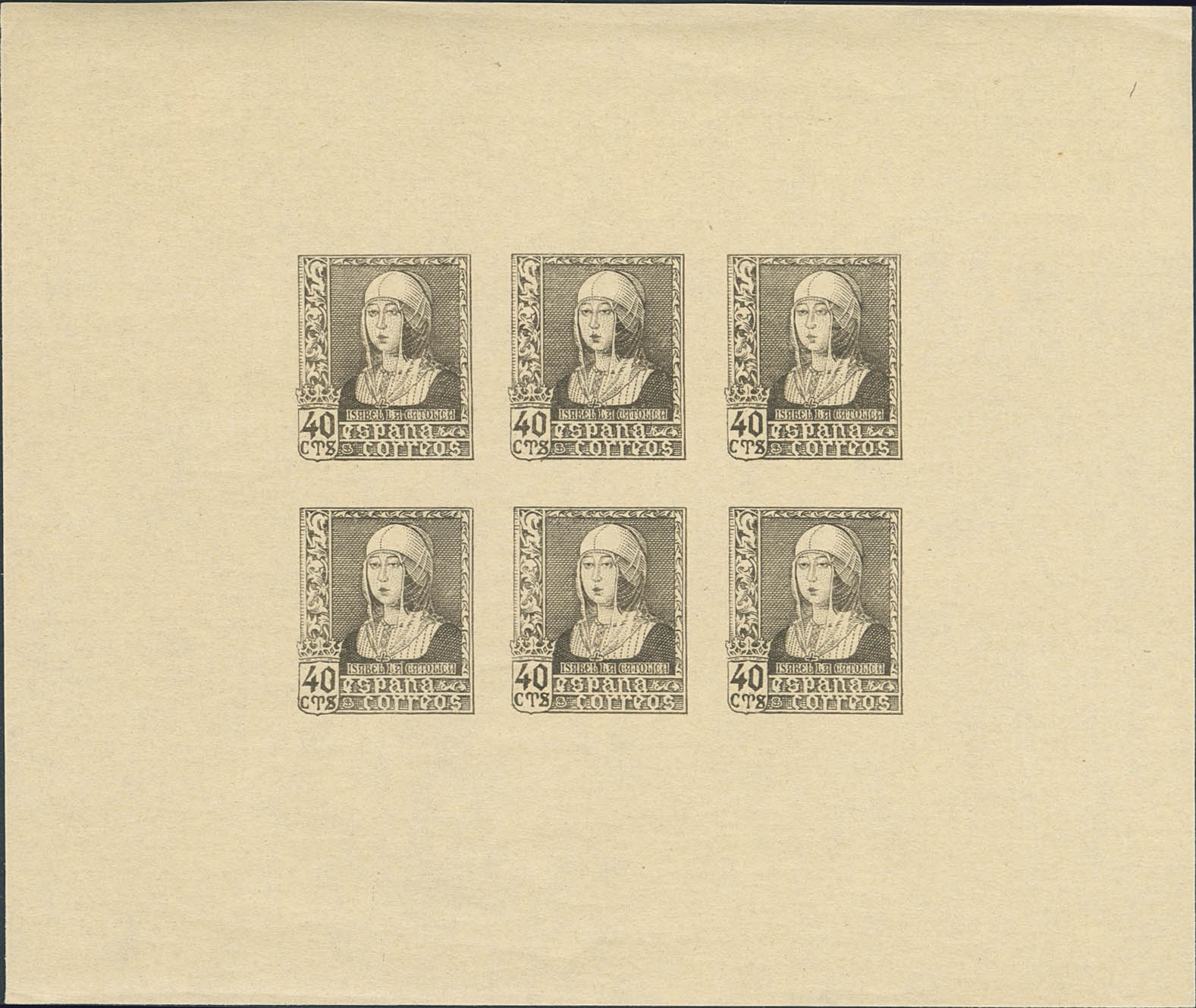 ★★ 858P. 1938. 40 cts gris negro, bloque de seis. PRUEBA DEL BLOQUE REPORTE. MAGNIFICA Y RARISIMA. (Gálvez 3556)