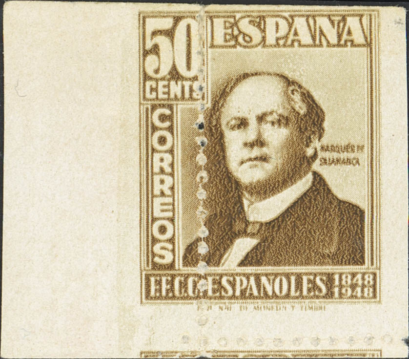 ★ 1037. 1948. 50 cts castaño, borde de hoja. Variedad DENTADO VERTICAL DESPLAZADO. MAGNIFICO Y RARO, NO RESEÑADO.