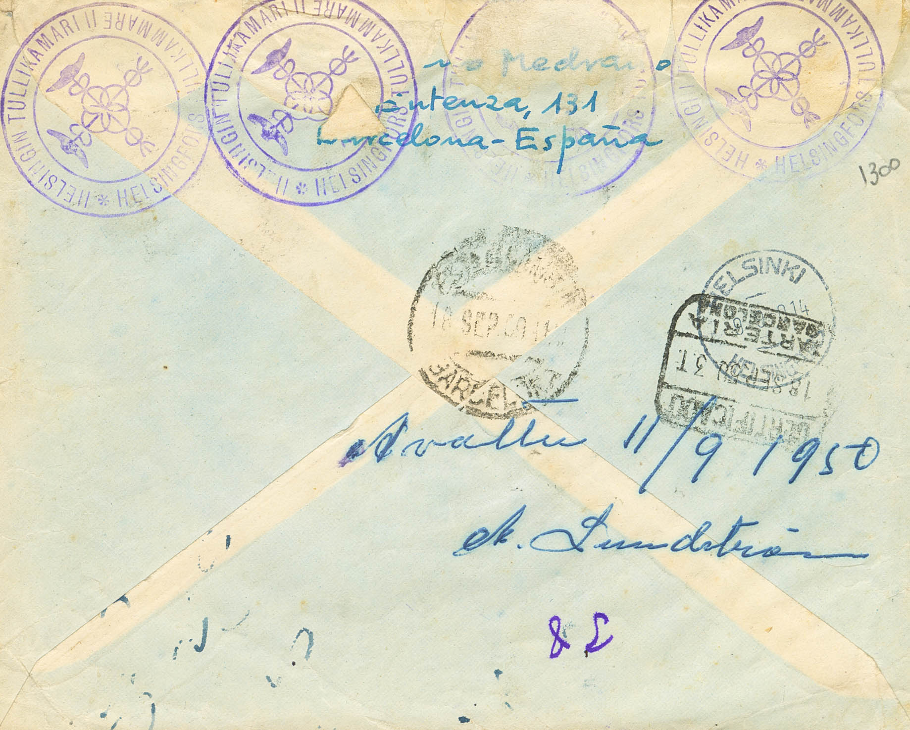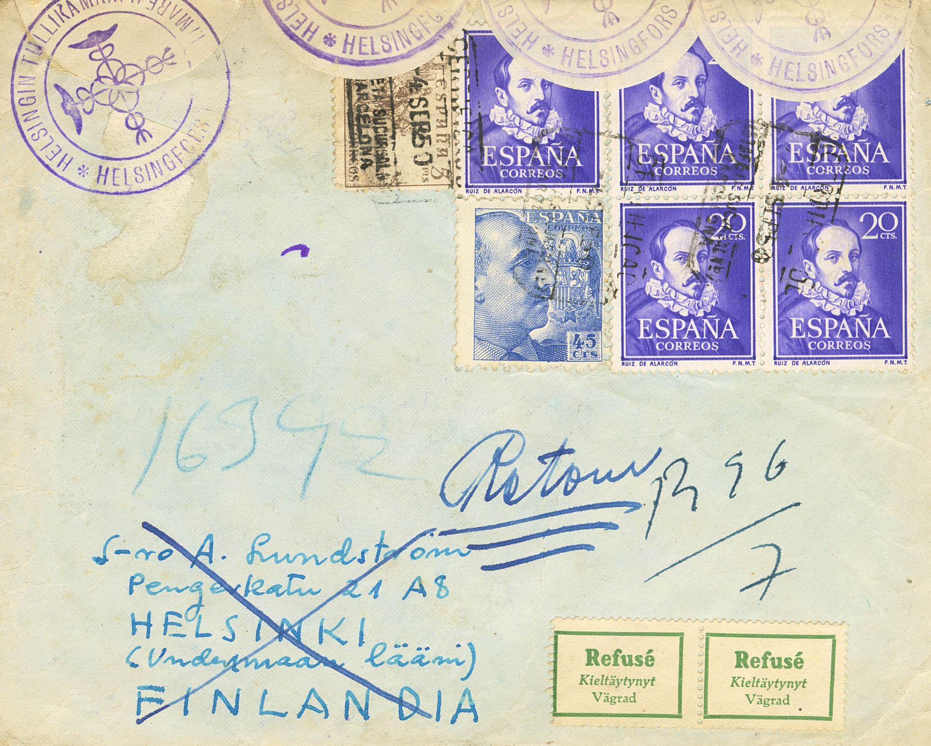1074(4), 926, 1044. 1950. 20 cts violeta, cinco sellos, 45 cts azul y 5 cts sepia. Certificado de BARCELONA a HELSINKI (FINLANDIA), devuelta al remitente con diversas marcas de censura Finlandesa. Al dorso llegada. MAGNIFICA E INUSUAL.