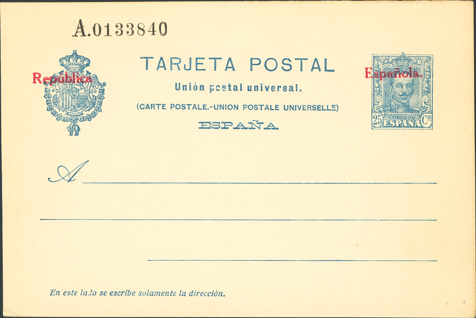 (★) EP63. 1931. 25 cts azul sobre Tarjeta Entero Postal. Sobrecarga REPUBLICA, en rojo. MAGNIFICA. Edifil 2026: 122 Euros