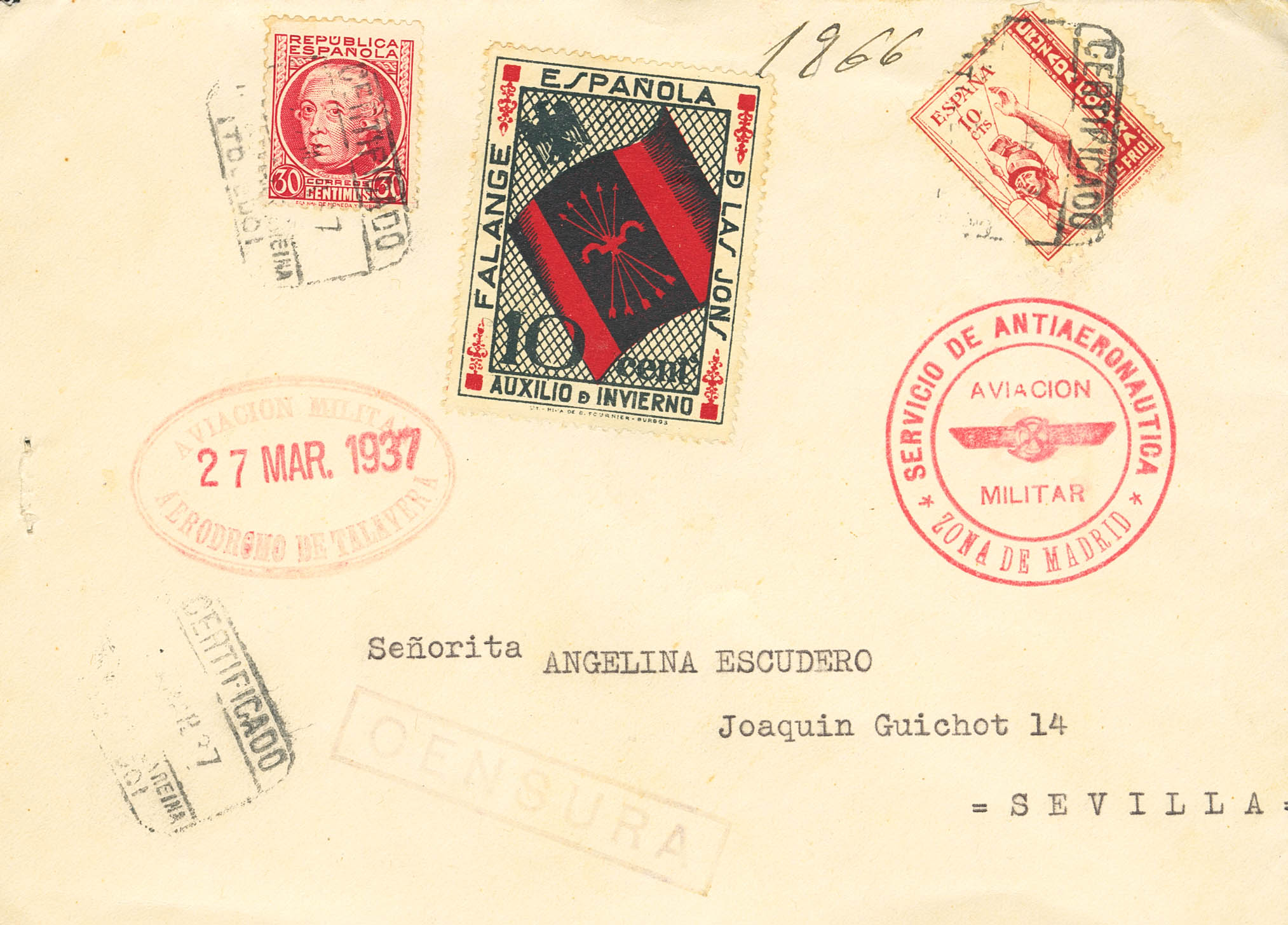 687. 1937. 30 cts carmín, 10 cts de Falange (Auxilio de Invierno) y 10 cts rojo de Cruzada contra el Frío. Certificado de TALAVERA DE LA REINA a SEVILLA. Marcas AVIACION MILITAR / AERODROMO DE TALAVERA y SERVICIO DE ANTIAERONAUTICA / AVIACION / MILITAR / ZONA DE MADRID, ambas en rojo. MAGNIFICA Y RARISIMA.