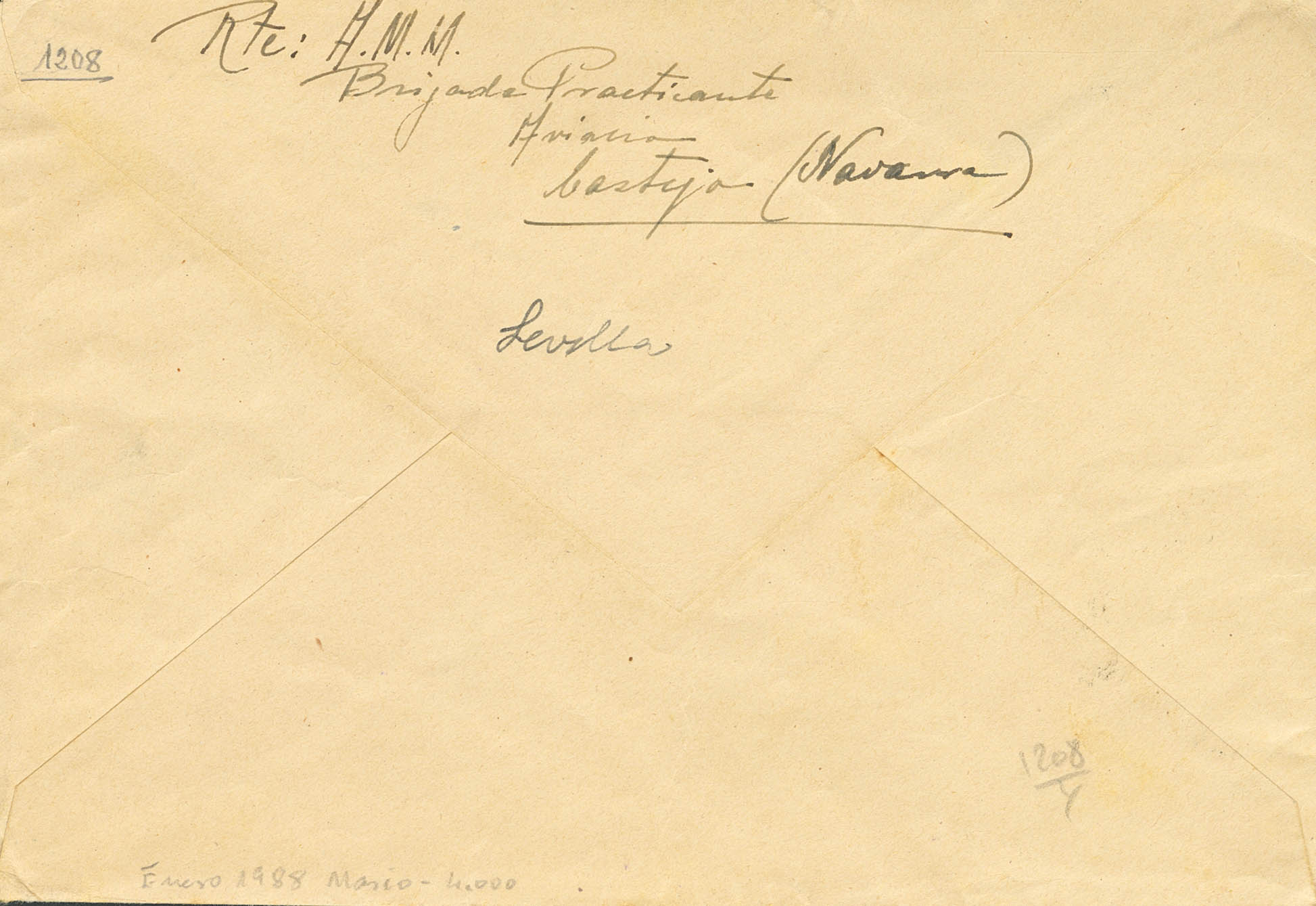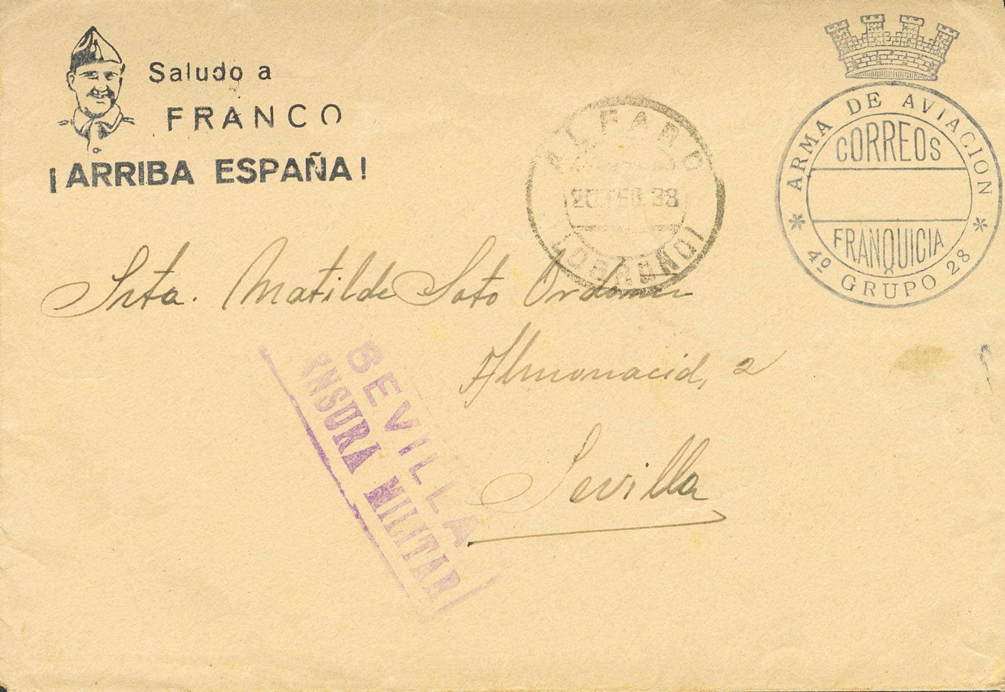 1938. CASTEJON (NAVARRA) a SEVILLA. Marca de franquicia ARMA DE AVIACION / 4º GRUPO 28. MAGNIFICA Y RARA.