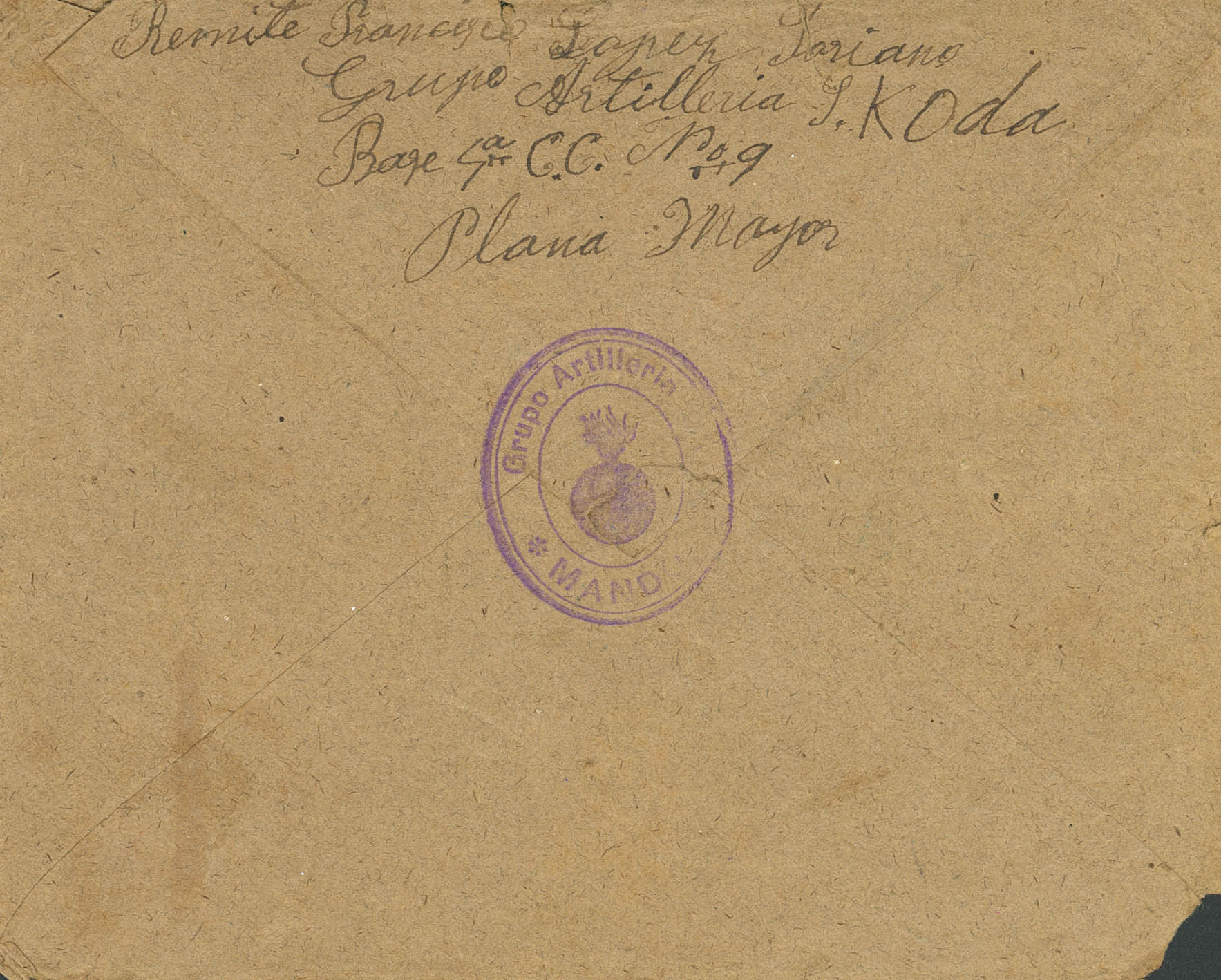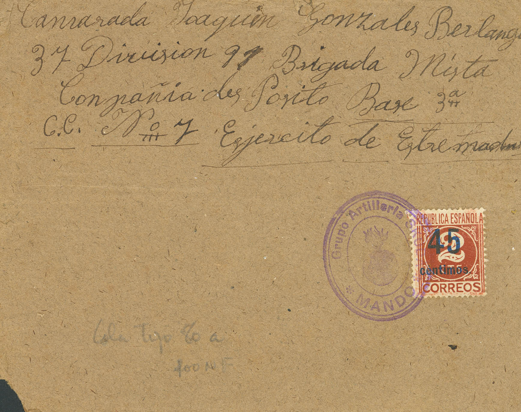 (1937ca). 45 cts sobre 2 cts castaño. Dirigida a un soldado del Ejército de Extremadura. Matasello GRUPO ARTILLERIA SKODA (esta unidad estuvo integrada en las Brigadas Internacionales aunque remitente y destinatario eran españoles, la denominación de Skoda viene dada por el modelo de Cañones utilizados por esta unidad). MAGNIFICA Y RARISIMA.
