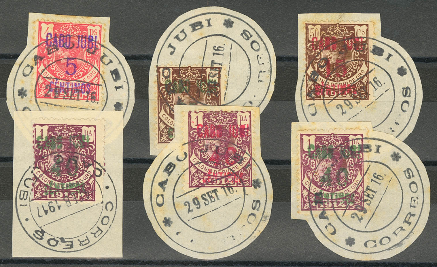 1/4A. 1916. Serie completa, seis valores, sobre fragmentos. Matasello CABO JUBY / CORREOS. BONITA. Edifil 2026: +300 Euros
