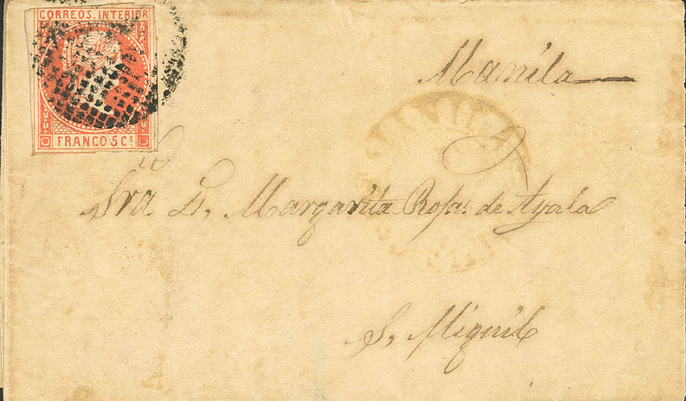 7. (1858ca). 5 cuartos naranja. MANILA a SAN MIGUEL. Matasello CIRCULO DE PUNTOS. MAGNIFICA.