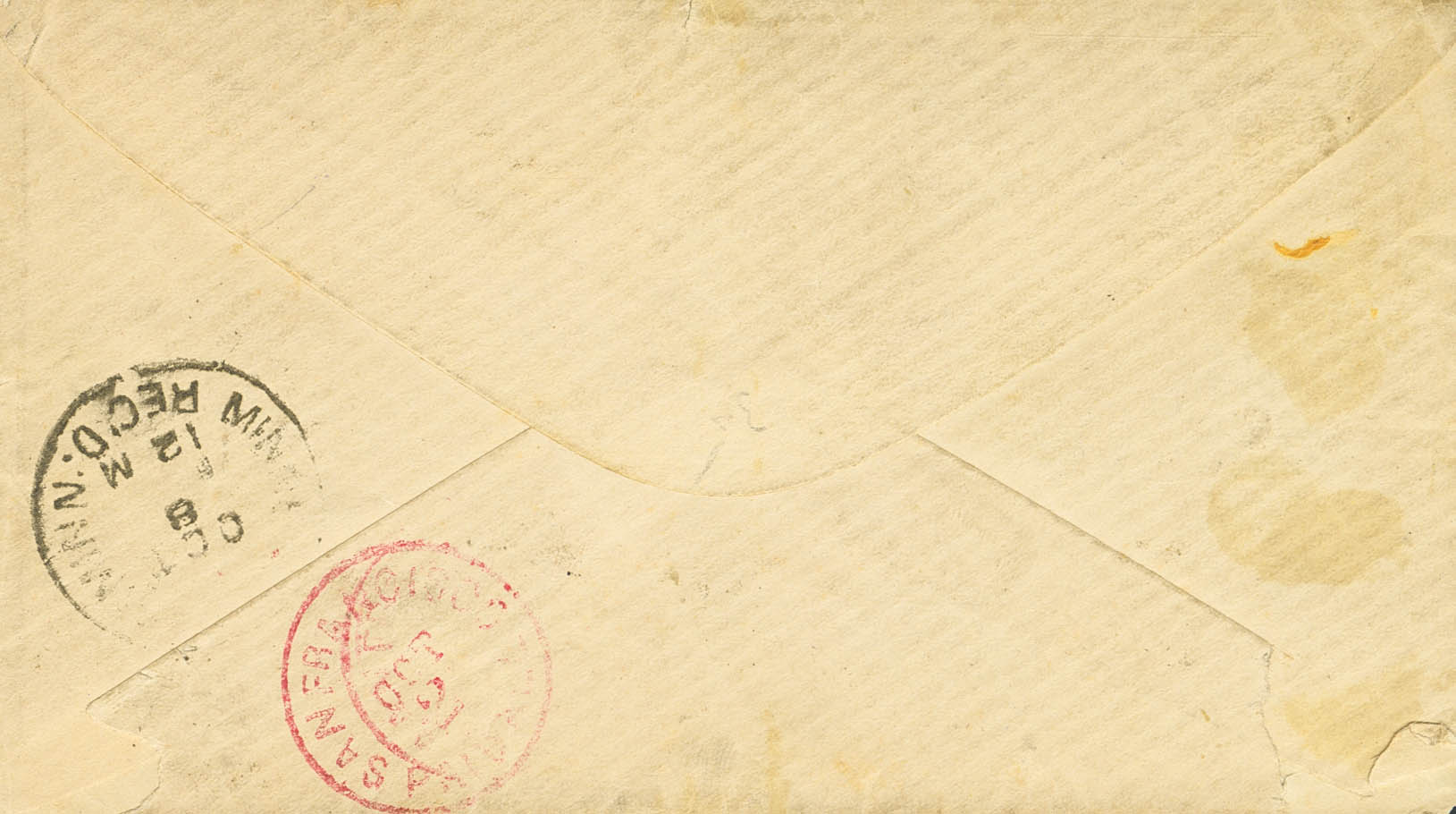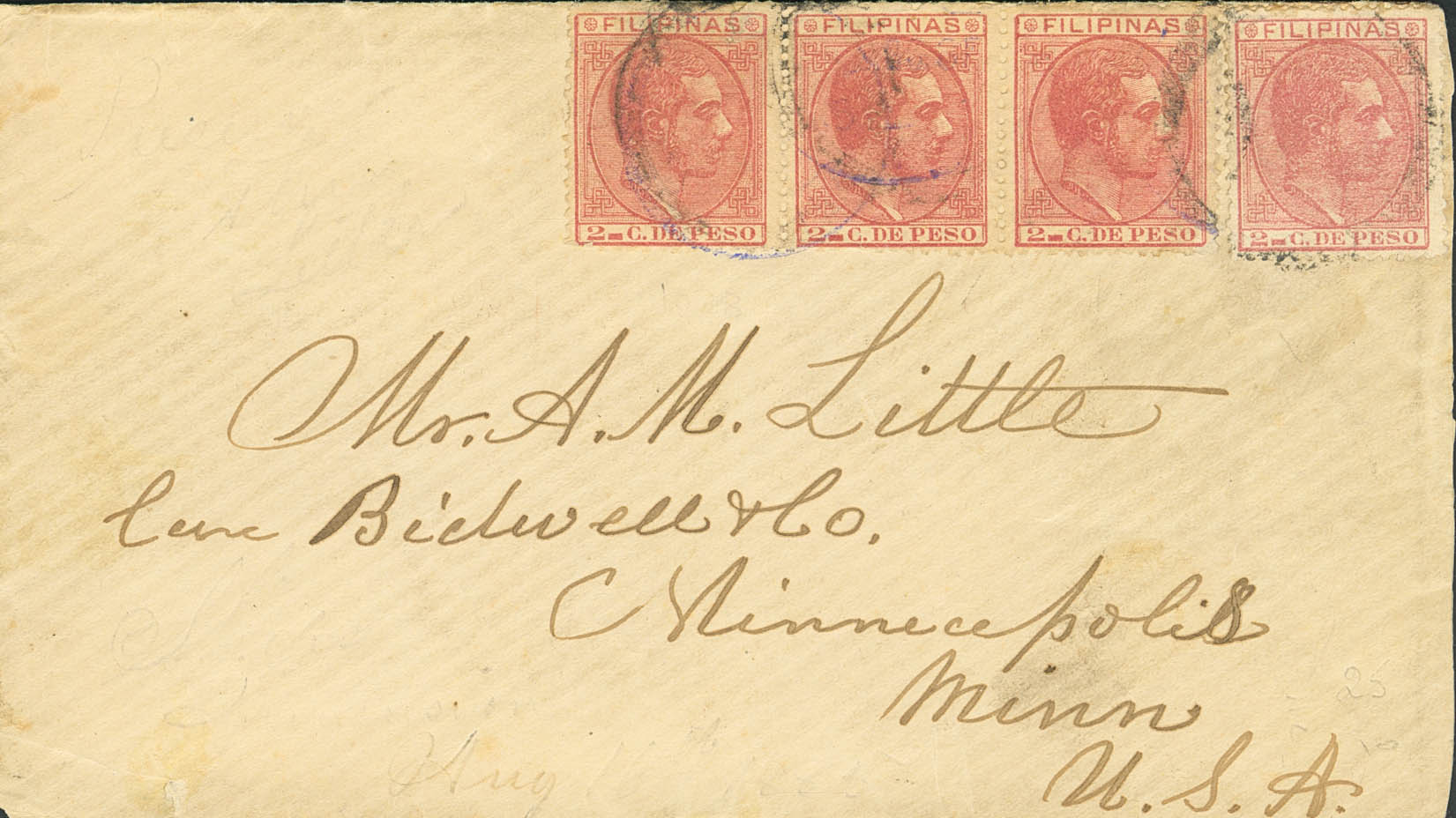 57(4). (1880ca). 2 ctvos rosa, cuatro sellos. Dirigida a MINEAPOLIS (U.S.A.) Al dorso tránsito SAN FRANCISCO, en rojo y llegada. MAGNIFICA Y RARA.