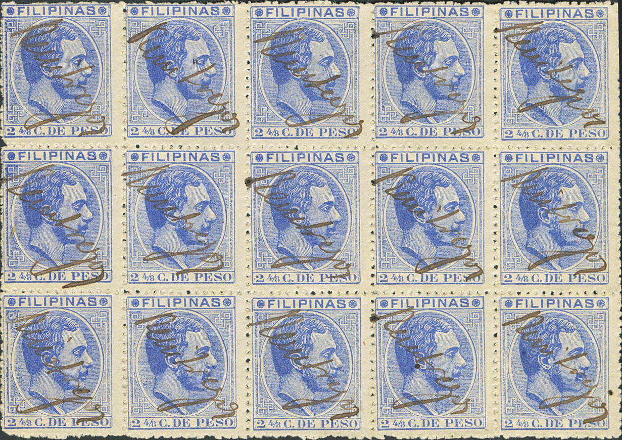 ★ 59(15). 1880. 2 4/8 cts azul, bloque de quince. Matasello manuscrito "Reintegro", a pluma. MAGNIFICO Y RARO.