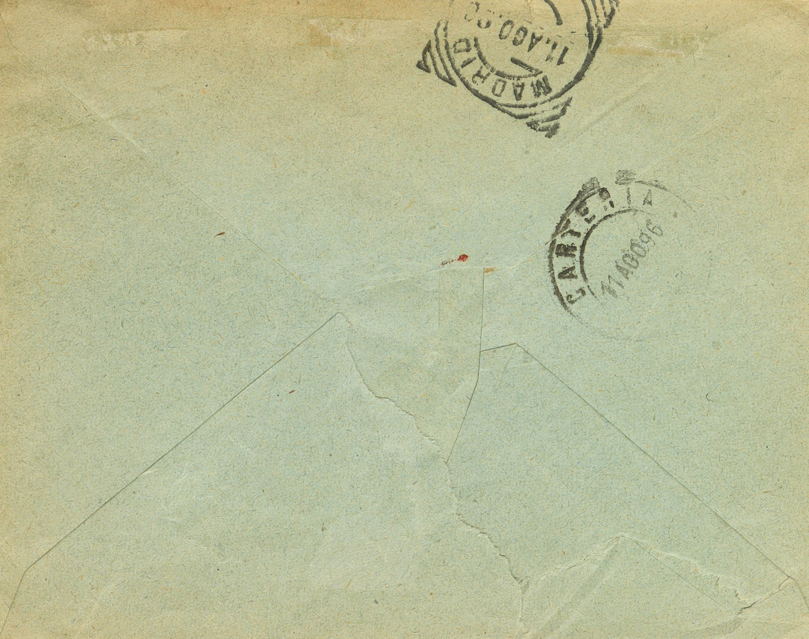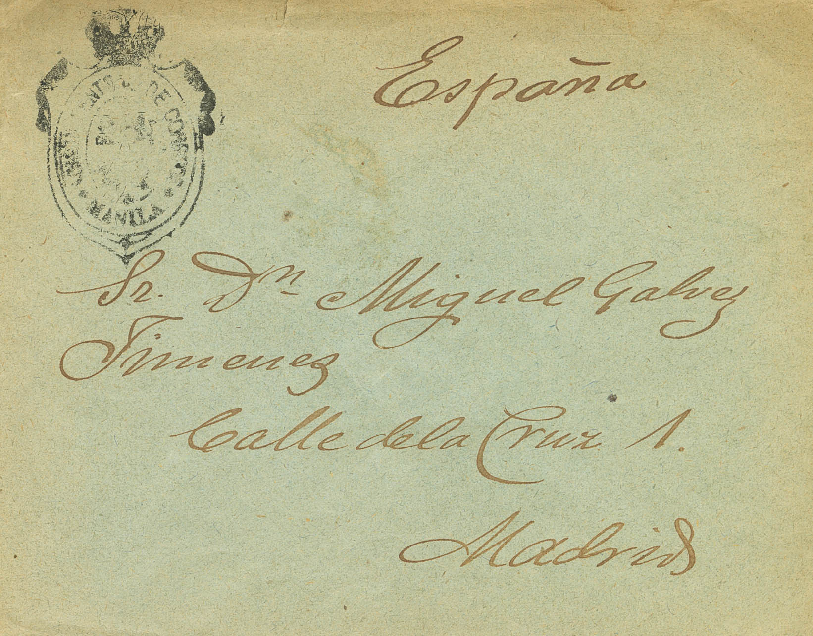 1896. MANILA a MADRID. Marca coronada PRESIDENTE DE CORREOS / MANILA, que sirve de franquicia, al dorso llegada (son los últimos años de dominación española y aún se aprecia el apego a la corona). MAGNIFICA Y MUY RARA.