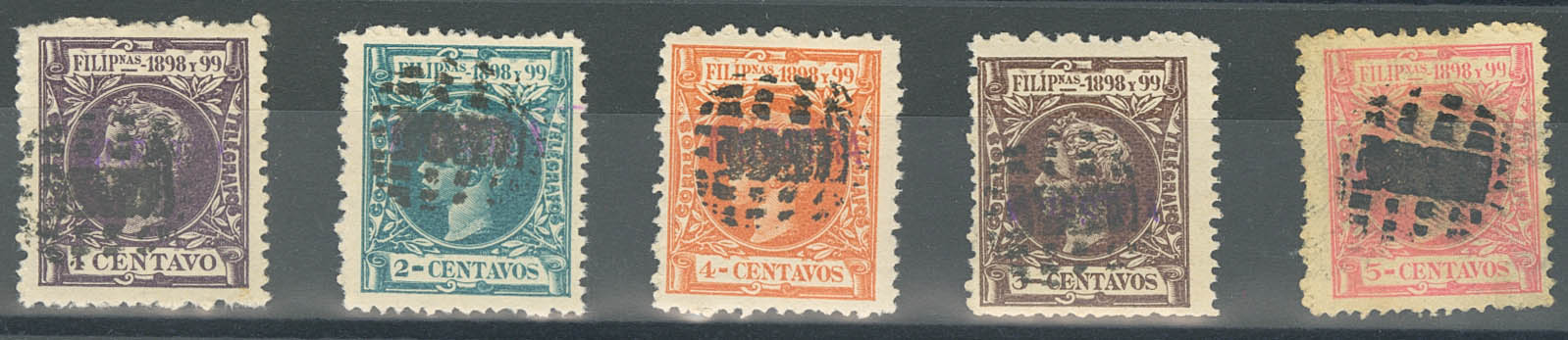 (★) 136/40M. 1898. 1 ctvo violeta, 2 ctvos azul, 3 ctvos castaño, 4 ctvos naranja y 5 ctvos rosa. MUESTRA, anulada con matasello círculo de puntos. MAGNIFICOS Y MUY RAROS.