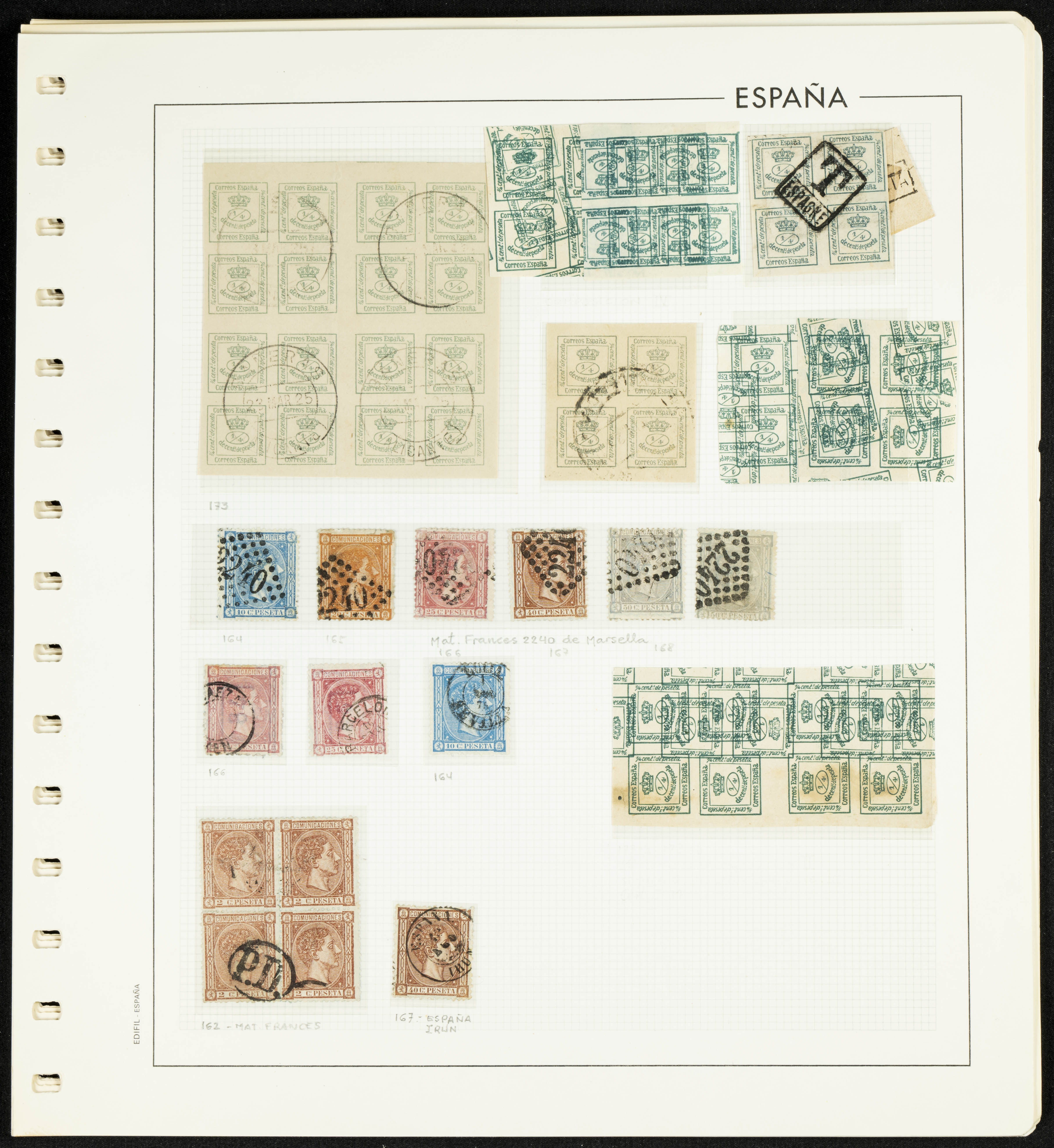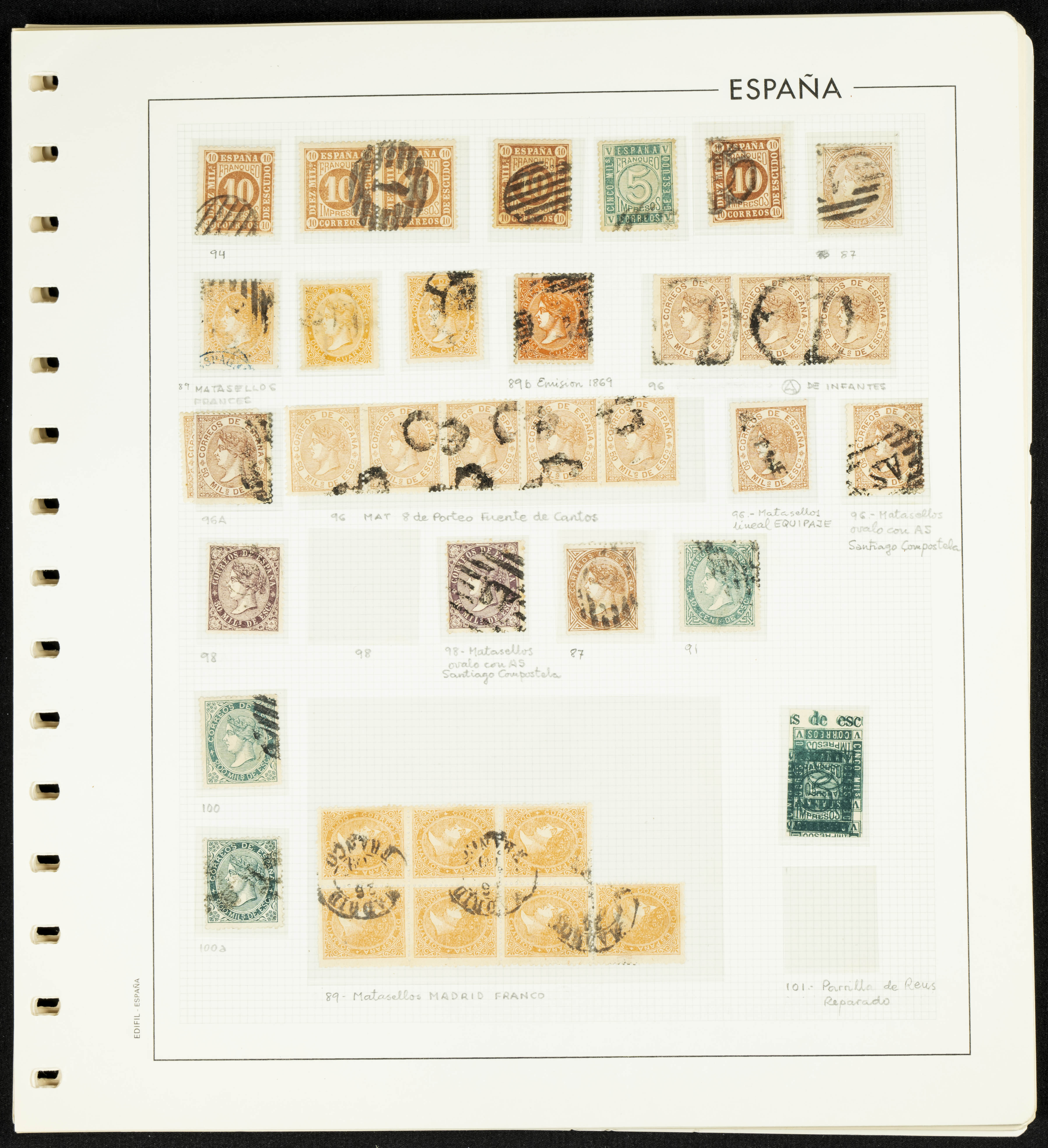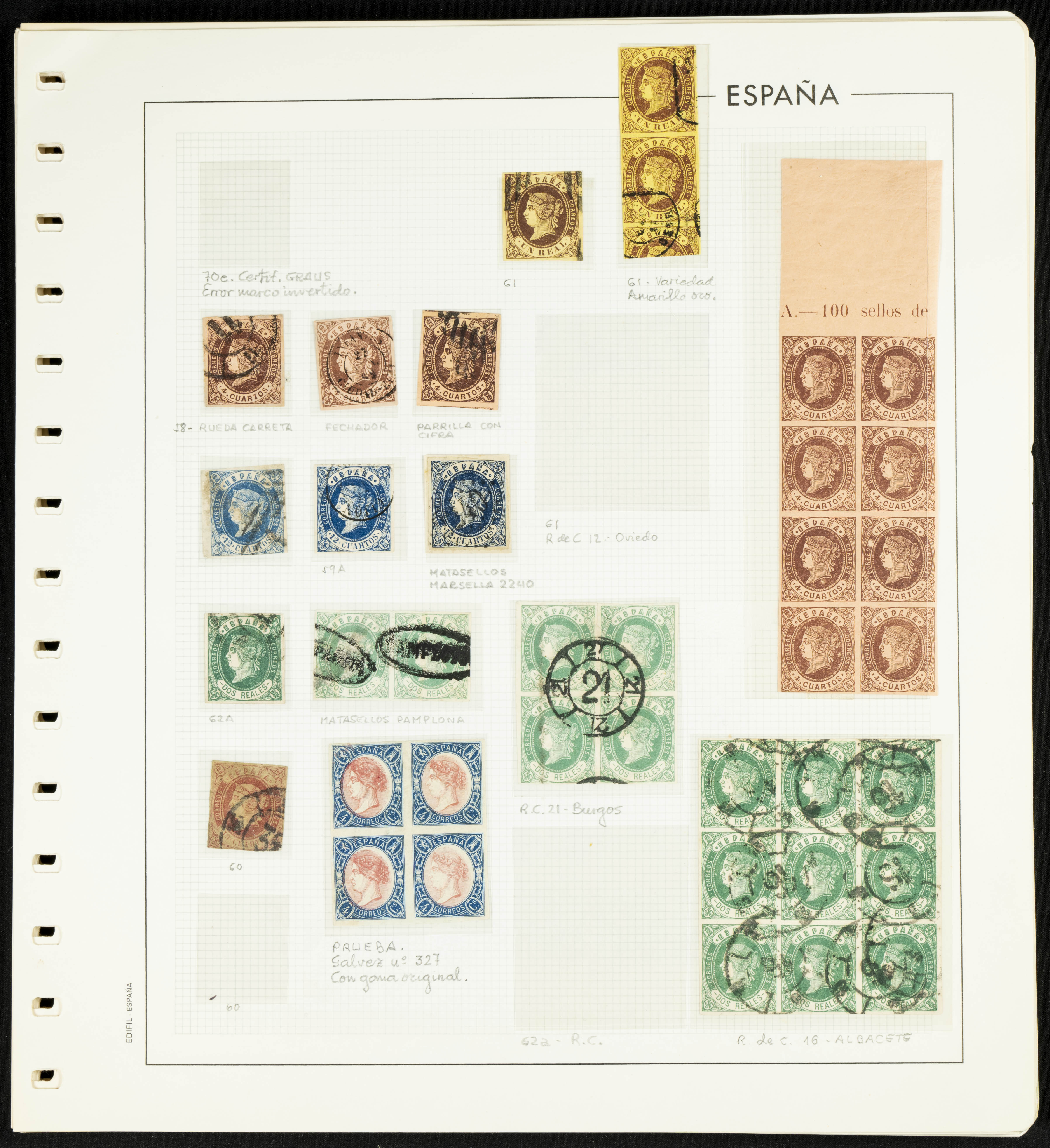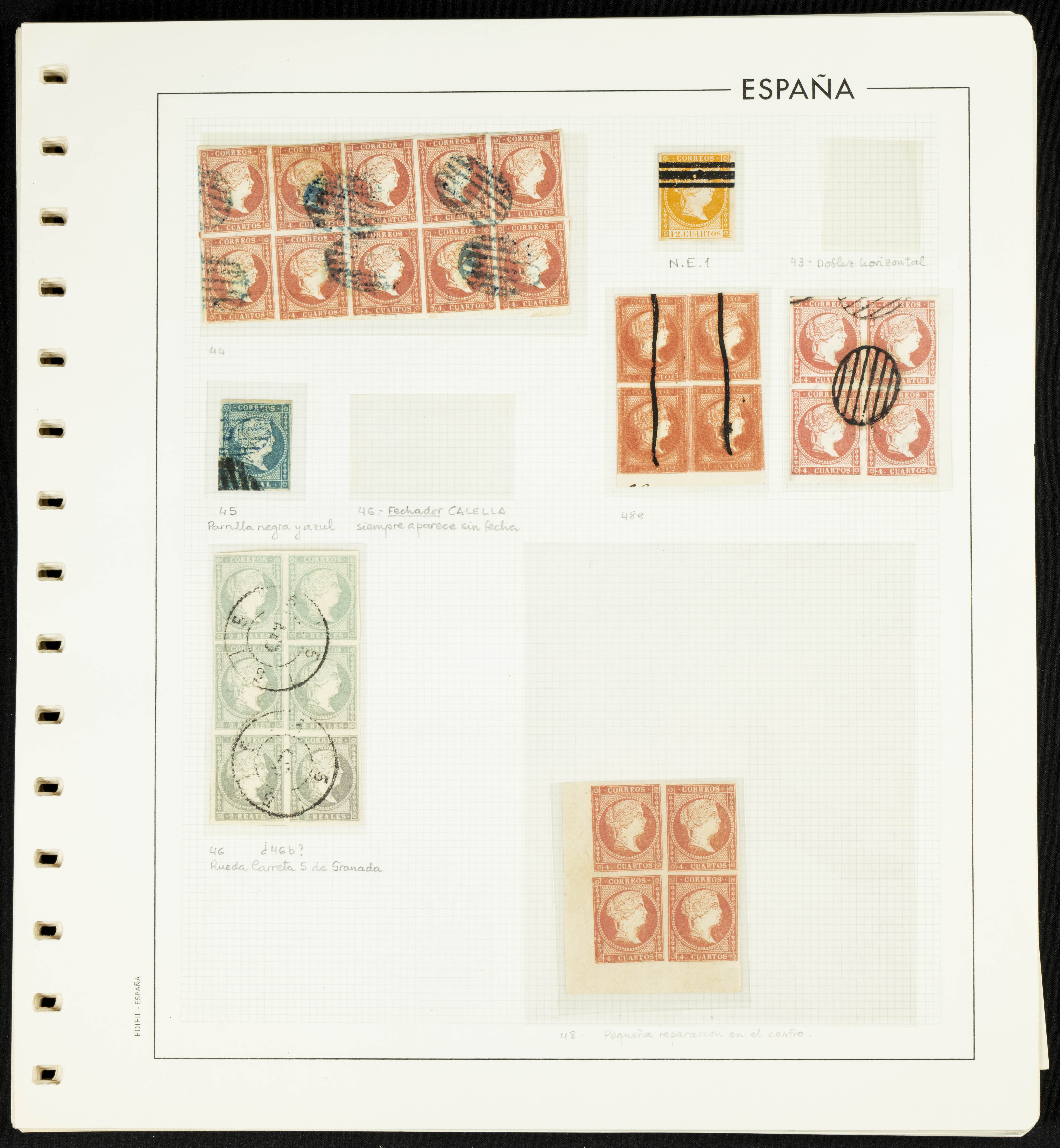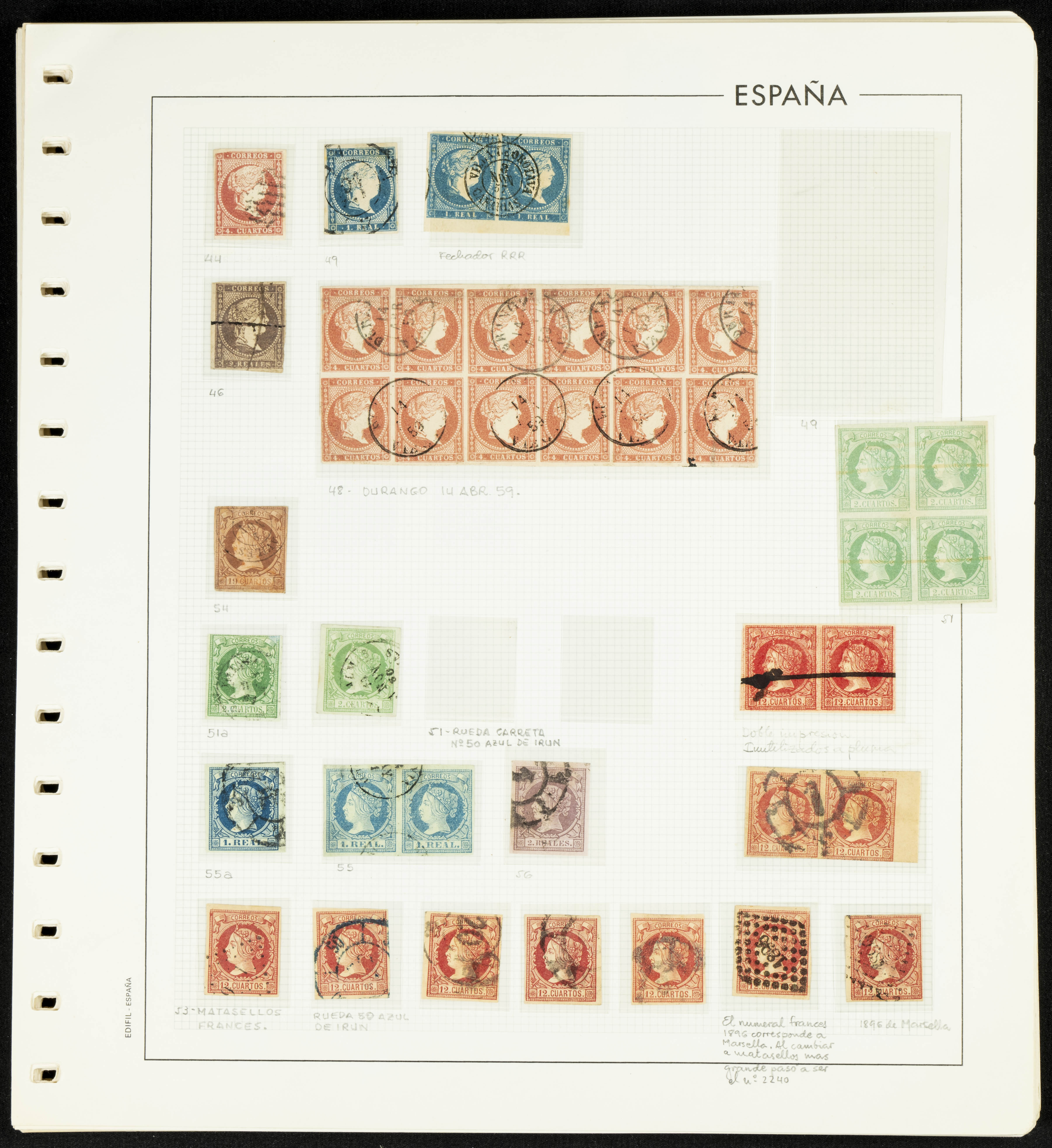 ★/(1853ca). A fascinating collection of classic stamps from 1853 to 1898, in used condition and including numerous cliché varieties, dozens of special postmarks (pre-philatelic, certified, date, wagon wheels, two of Carril, feather, postage, etc.), large blocks (some mint), some letters, etc. A MUST-SEE.