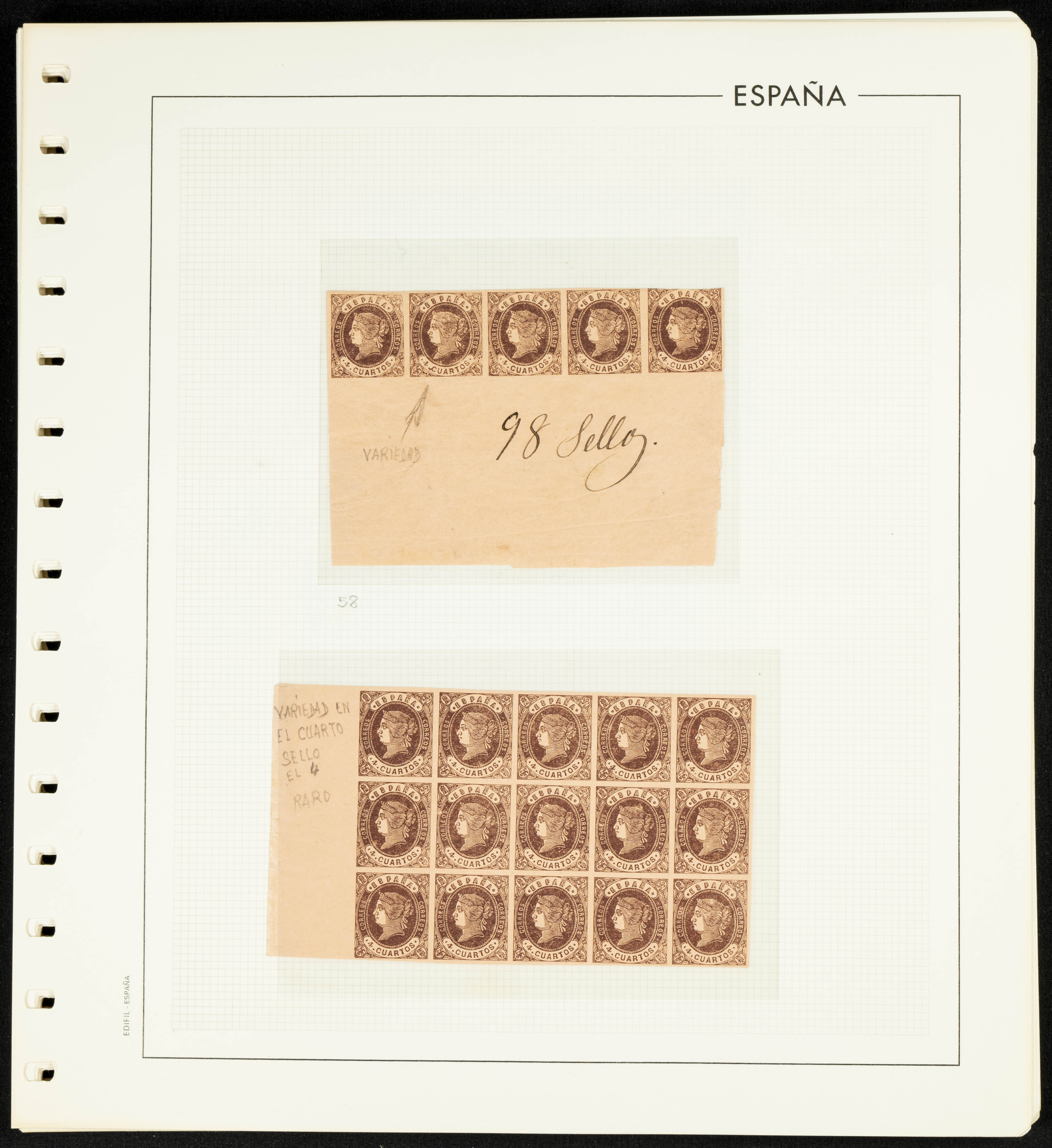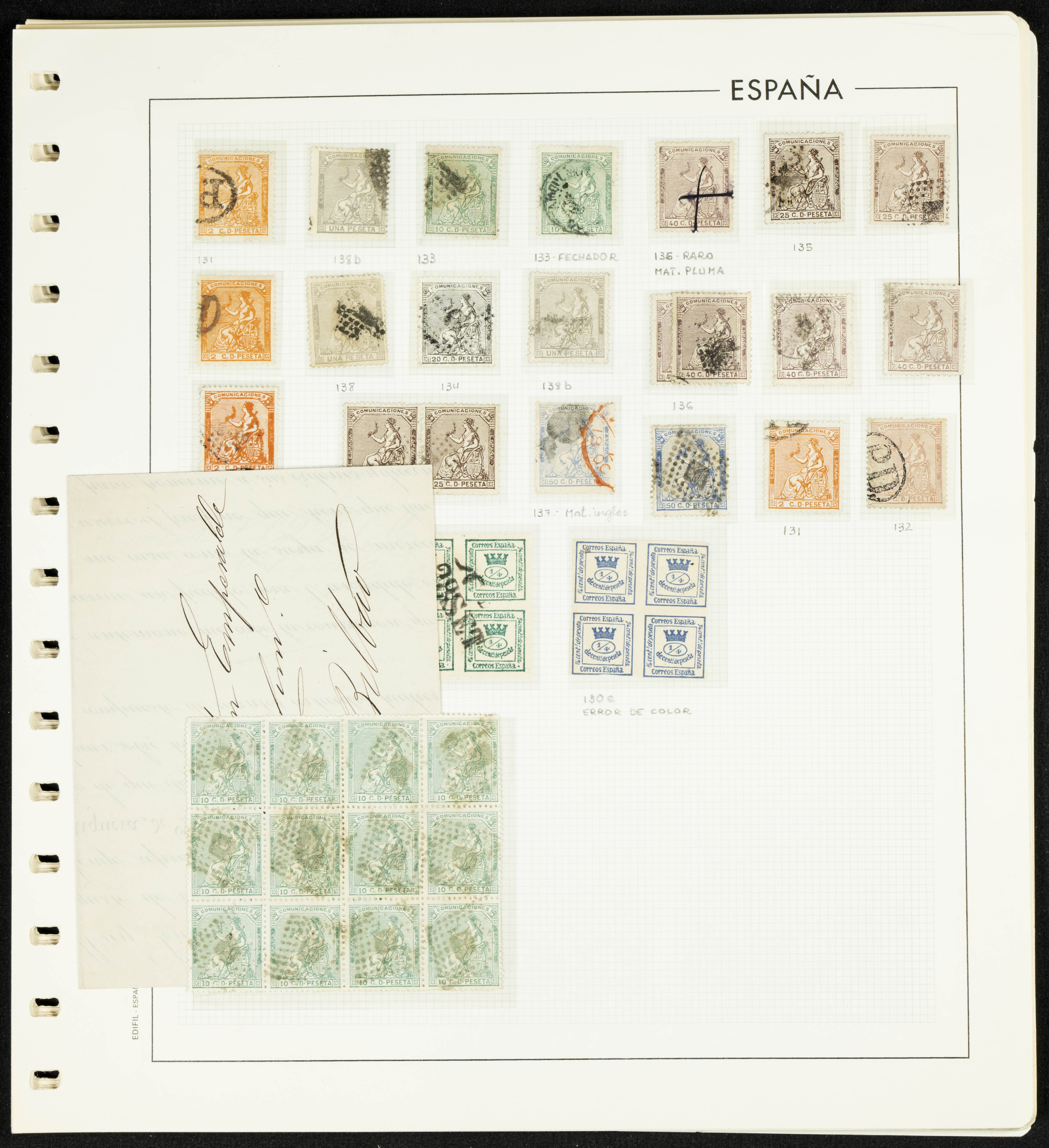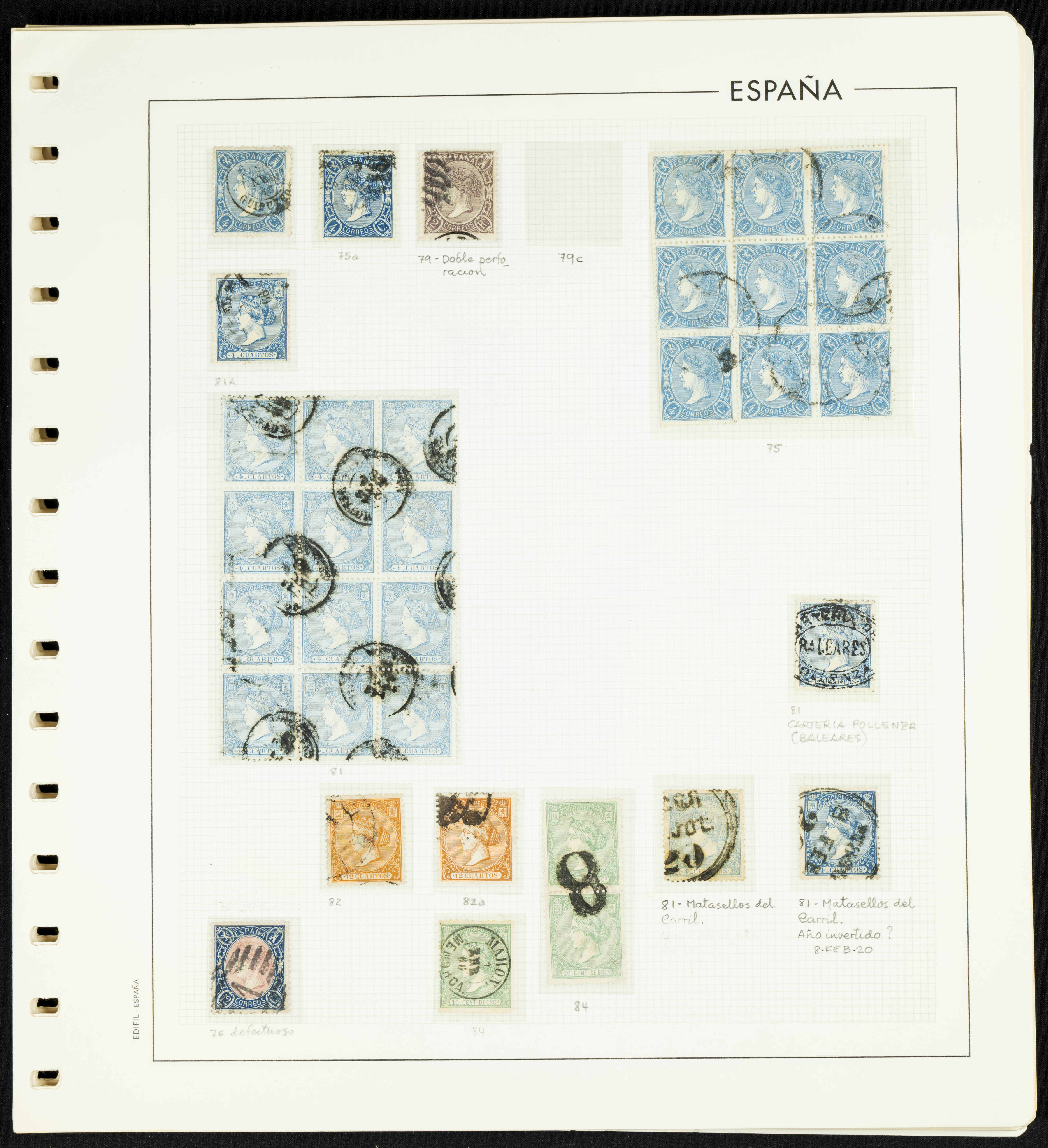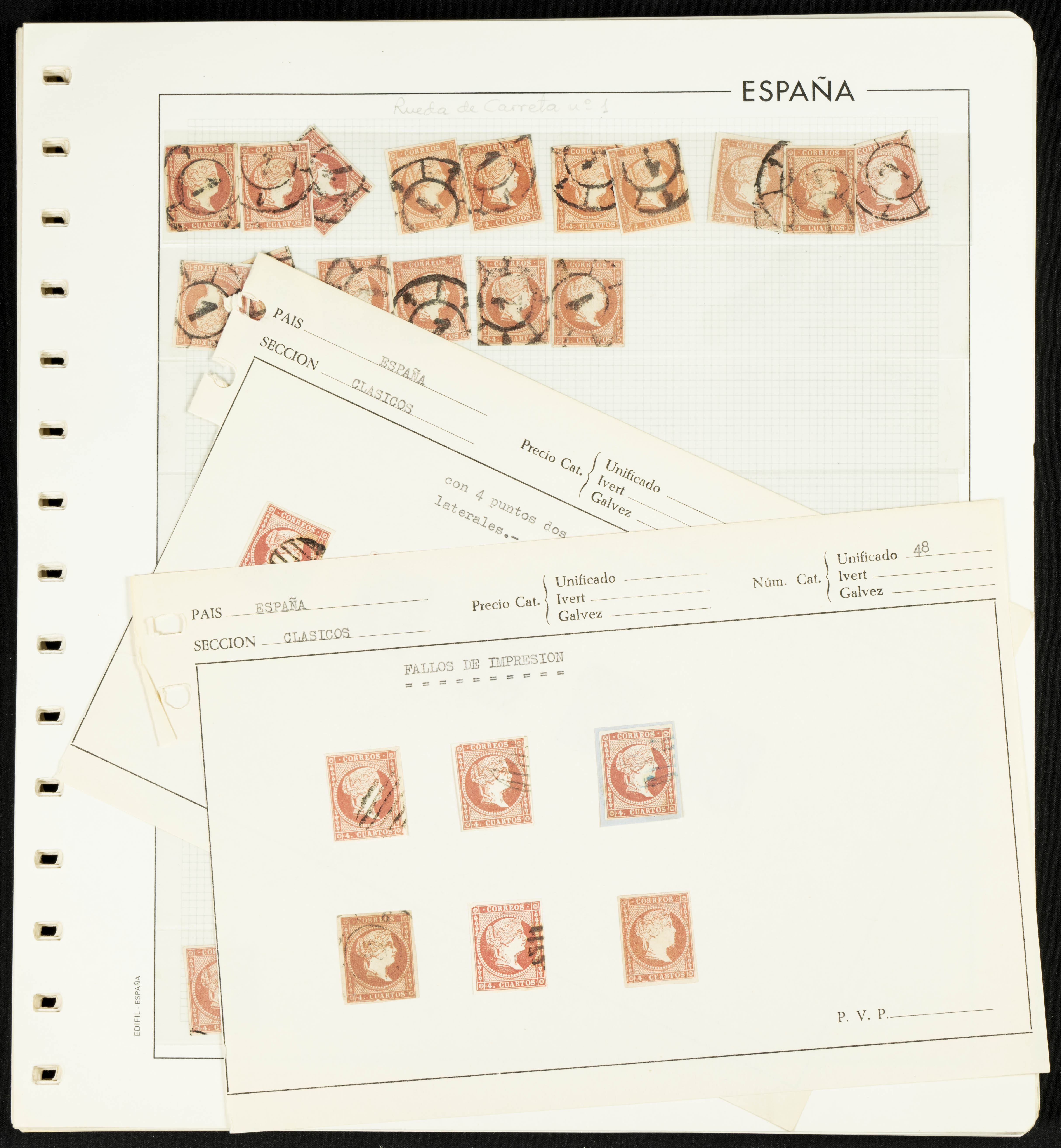 ★/(1853ca). A fascinating collection of classic stamps from 1853 to 1898, in used condition and including numerous cliché varieties, dozens of special postmarks (pre-philatelic, certified, date, wagon wheels, two of Carril, feather, postage, etc.), large blocks (some mint), some letters, etc. A MUST-SEE.