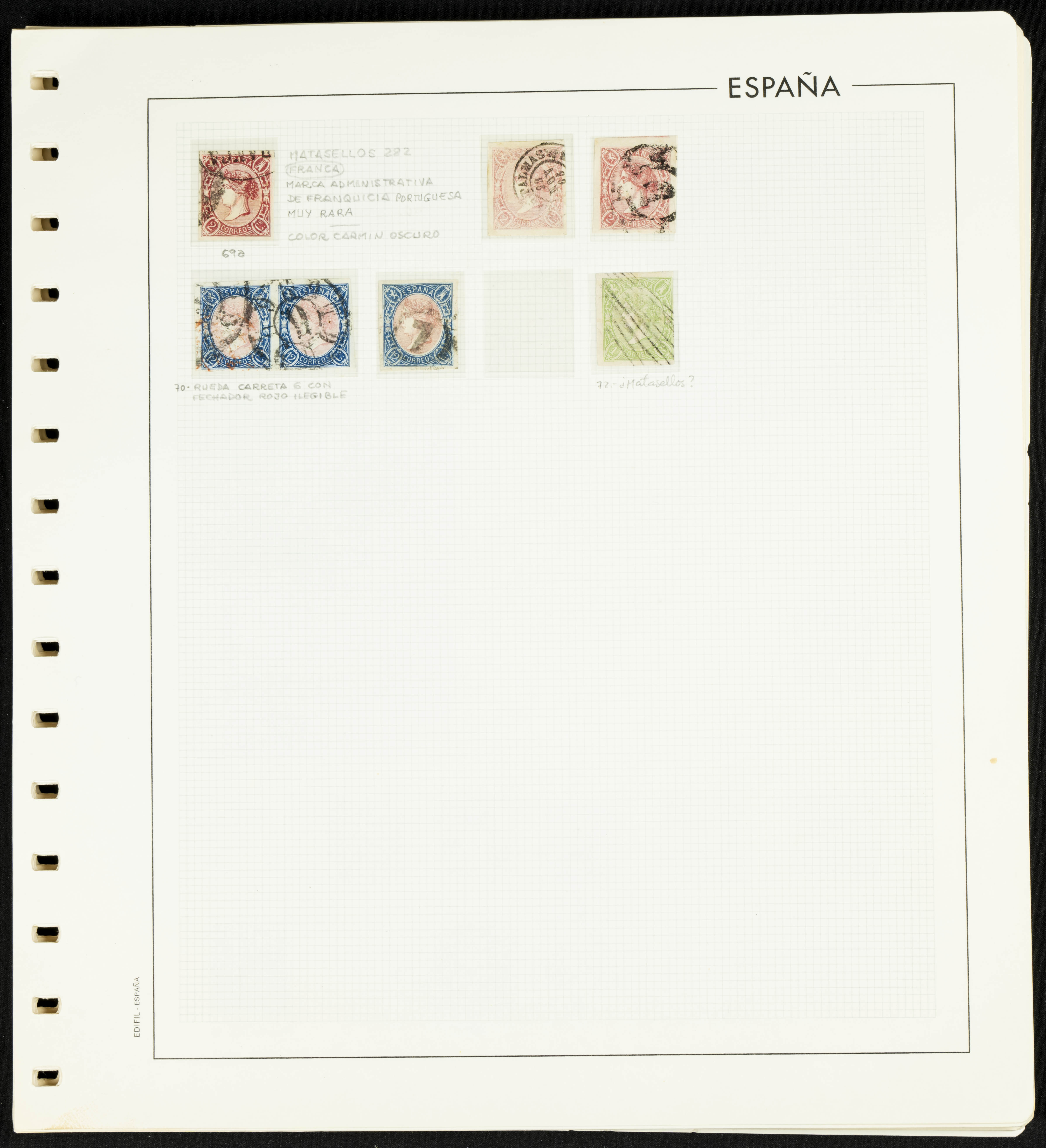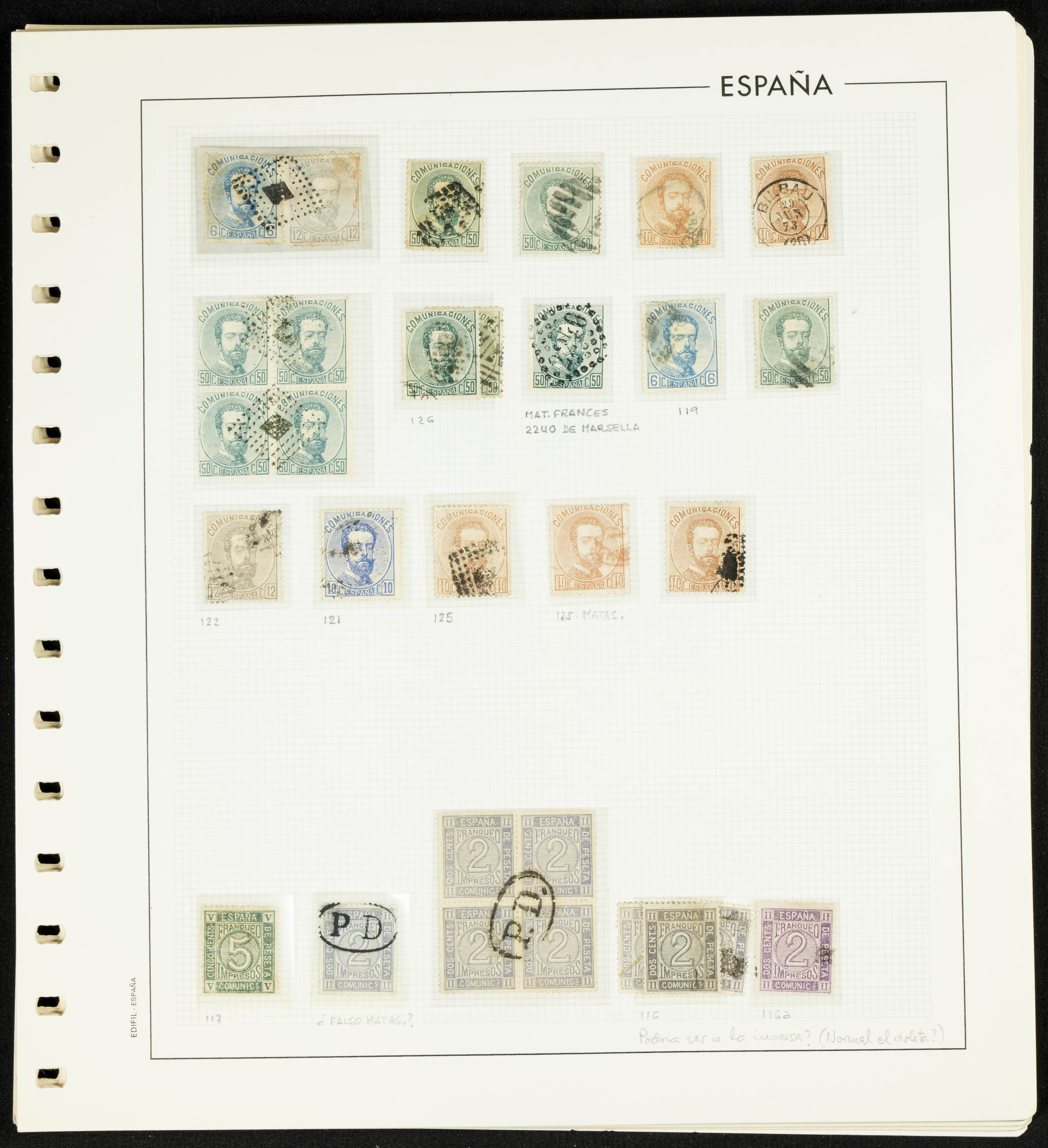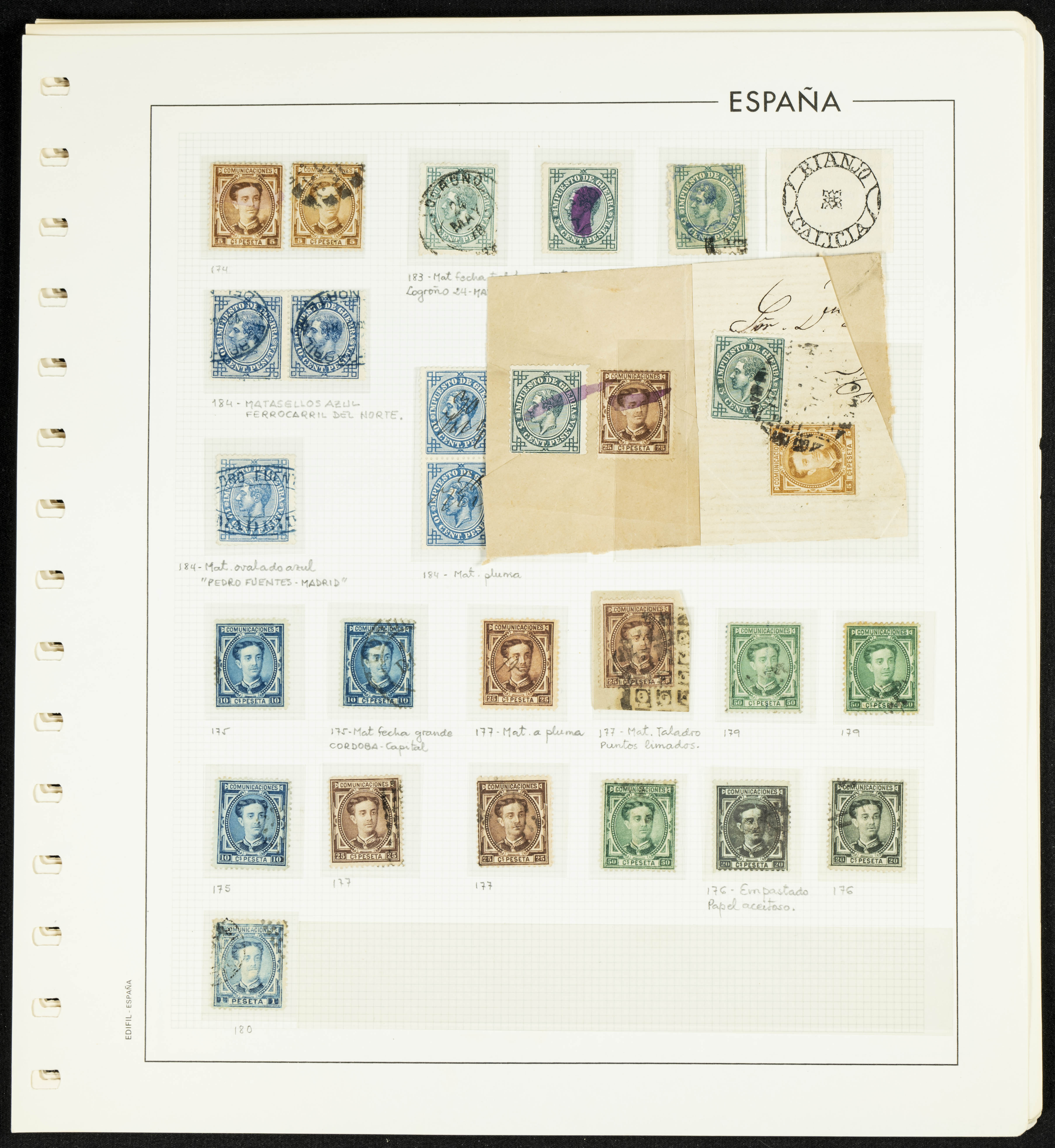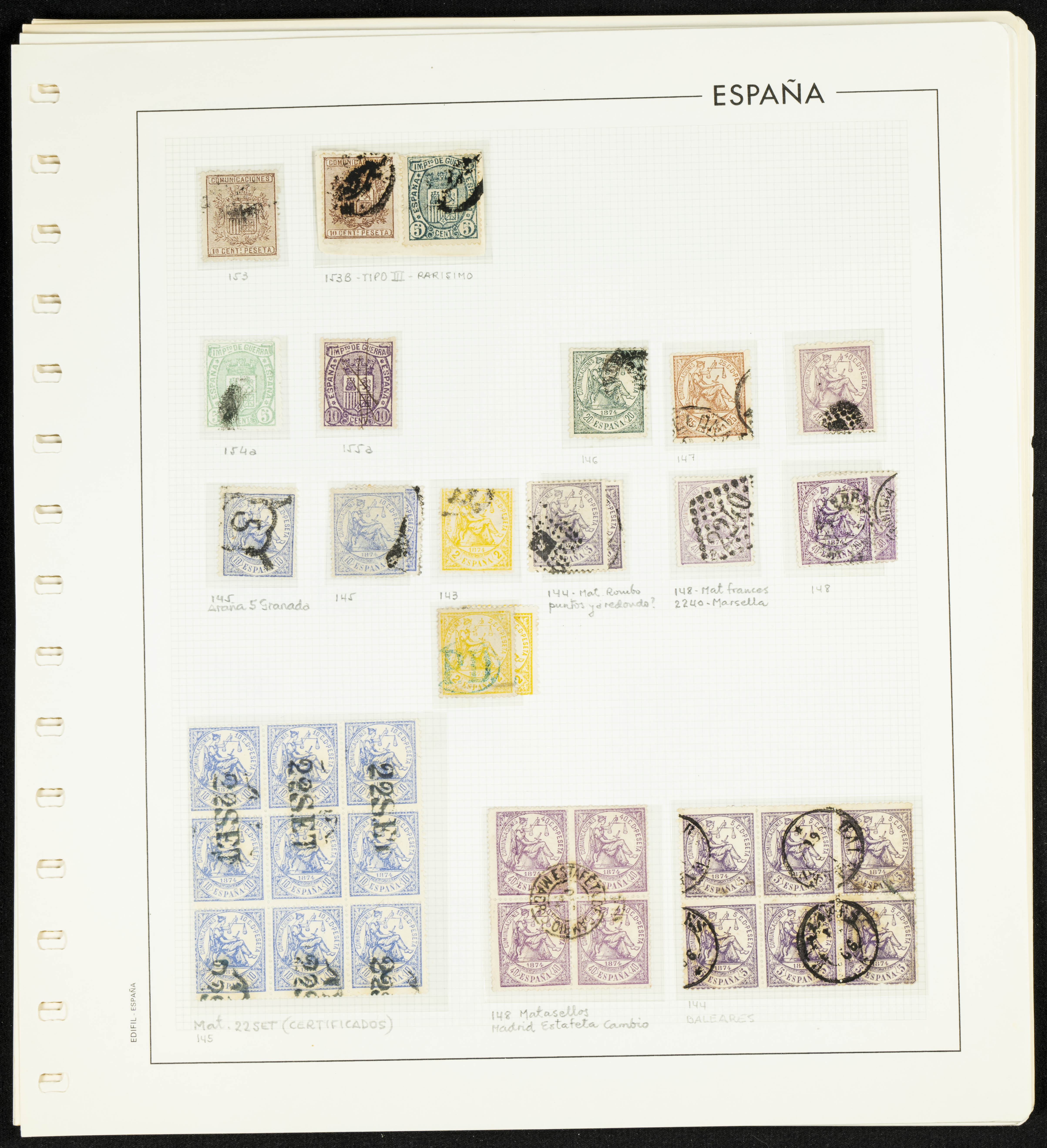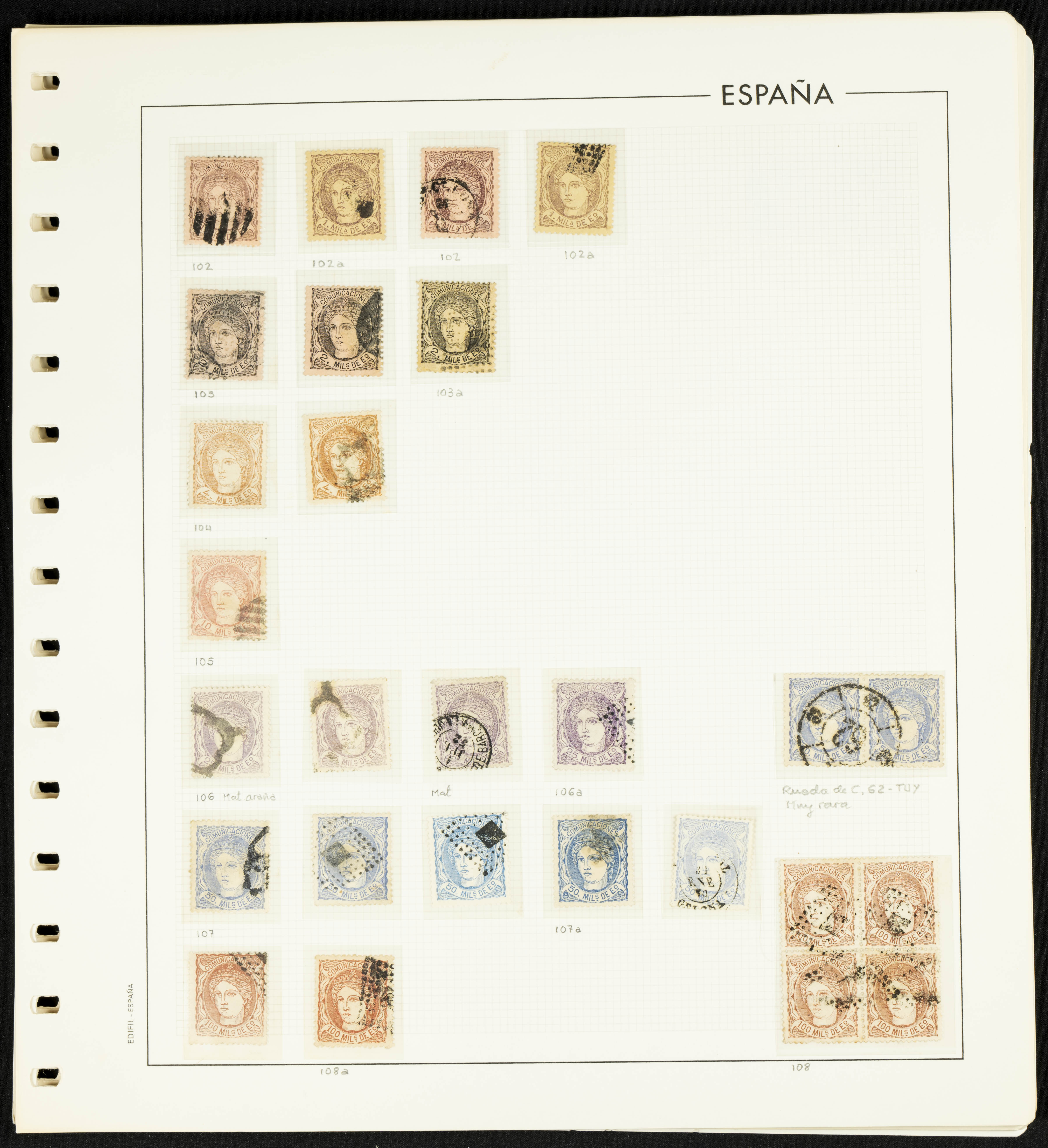★/(1853ca). A fascinating collection of classic stamps from 1853 to 1898, in used condition and including numerous cliché varieties, dozens of special postmarks (pre-philatelic, certified, date, wagon wheels, two of Carril, feather, postage, etc.), large blocks (some mint), some letters, etc. A MUST-SEE.
