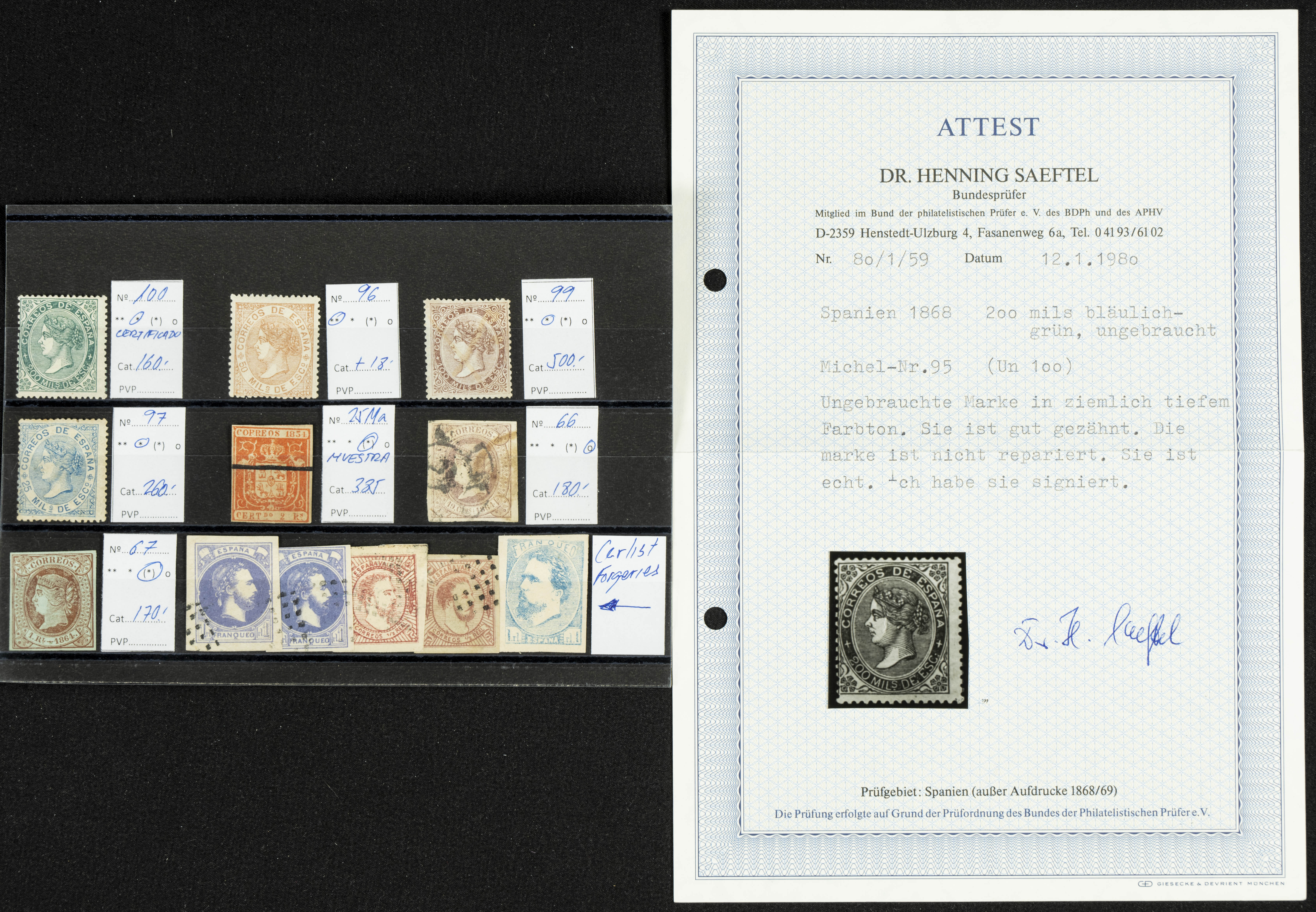 ★/(1854ca). Interesting collection of classic stamps from between 1854 and 1868, both mint and used, notably the 25 mils blue, 100 mils brown, and 200 mils green stamps of 1868. Includes some forged Carlist stamps. HIGH CATALOG VALUE. TO BE EXAMINED.