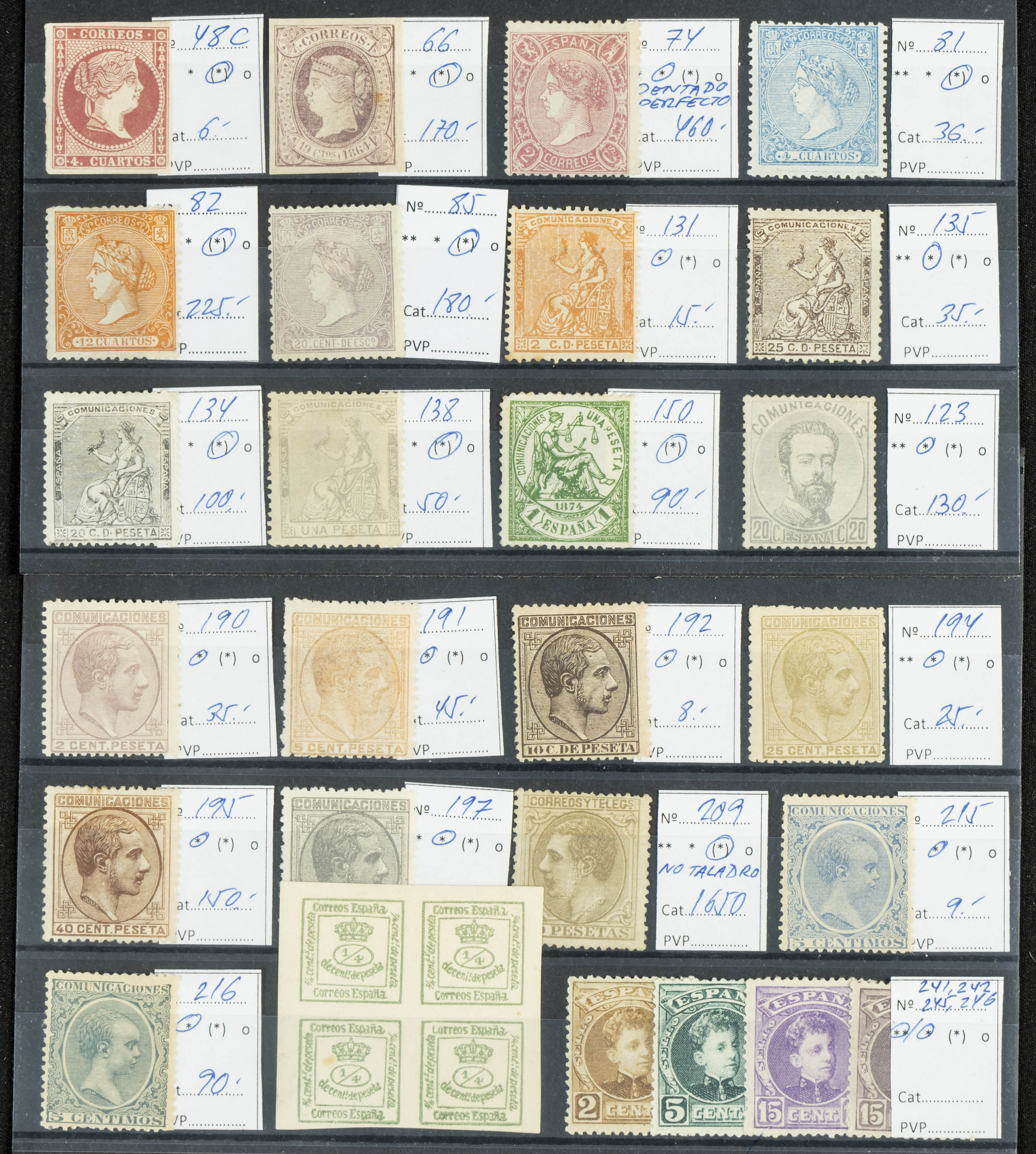 ★/(★)1855. Interesting collection of classic stamps from between 1855 and 1900, in mint condition, including the 1865 2 cuartos rose perforated stamp, the 1866 12 cuartos, the 1879 40 cents chestnut brown stamp, and the 1879 10 pesetas sepia stamp. TO BE EXAMINED. Edifil 2025: +3,580 Euros