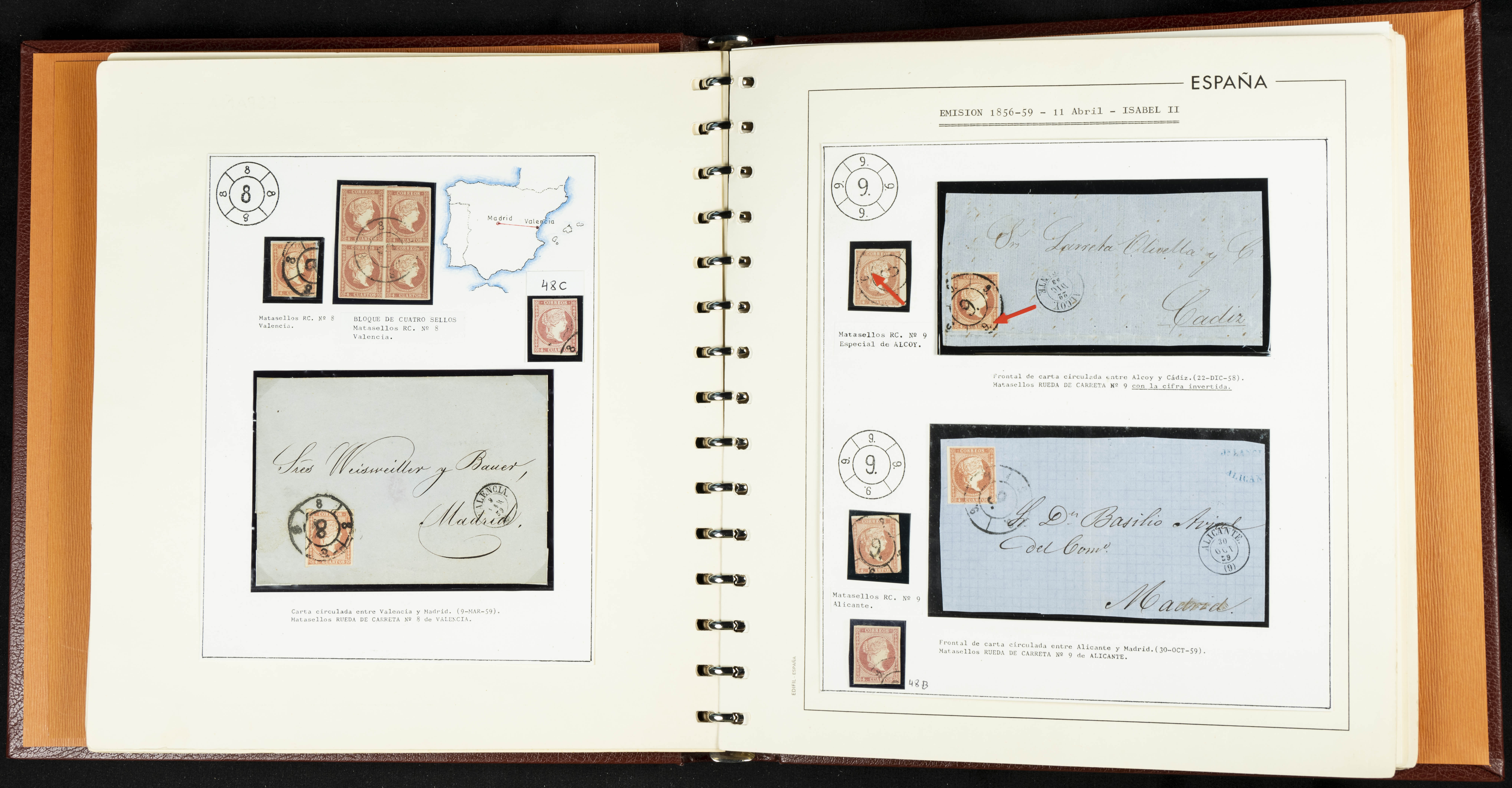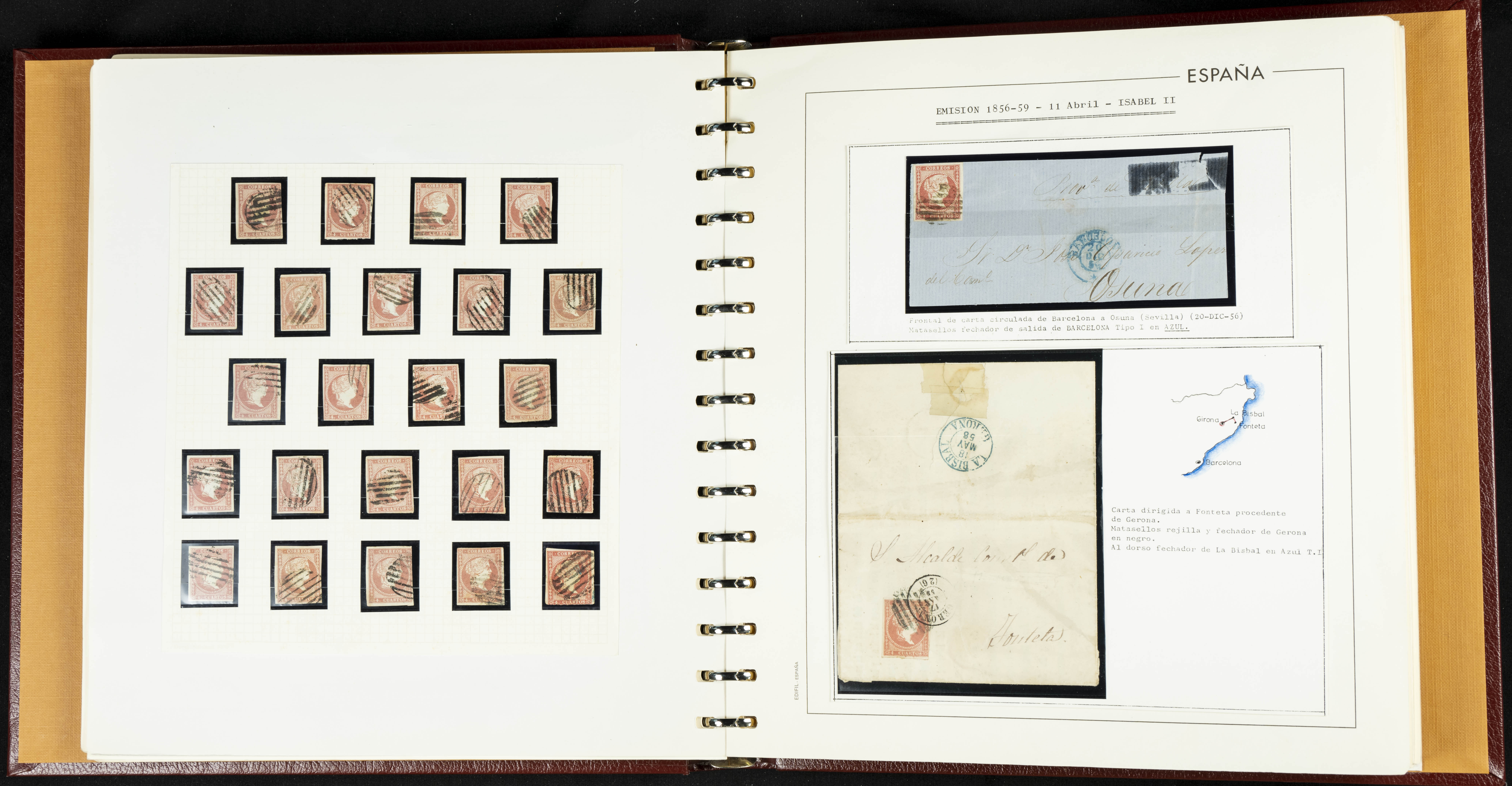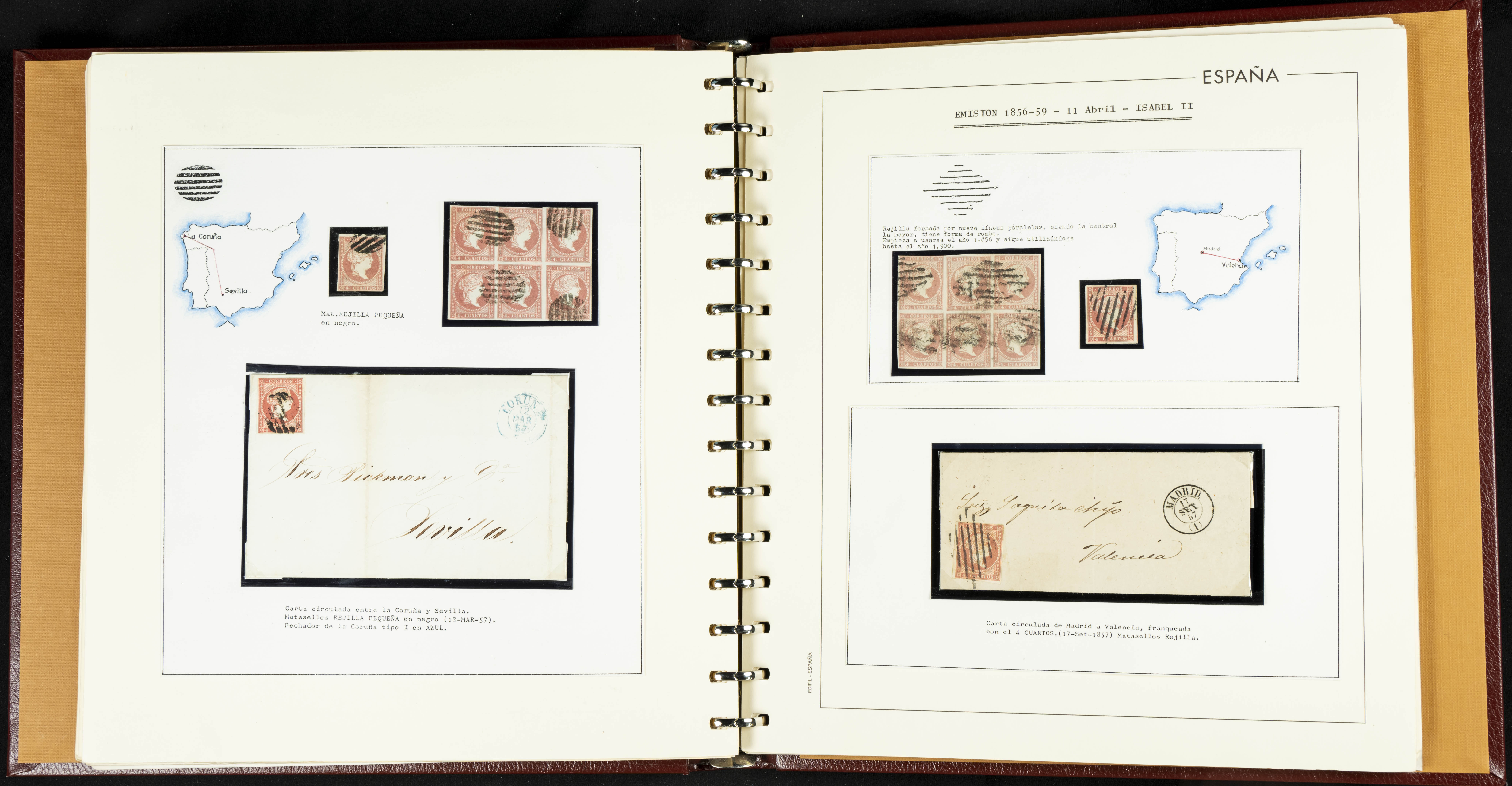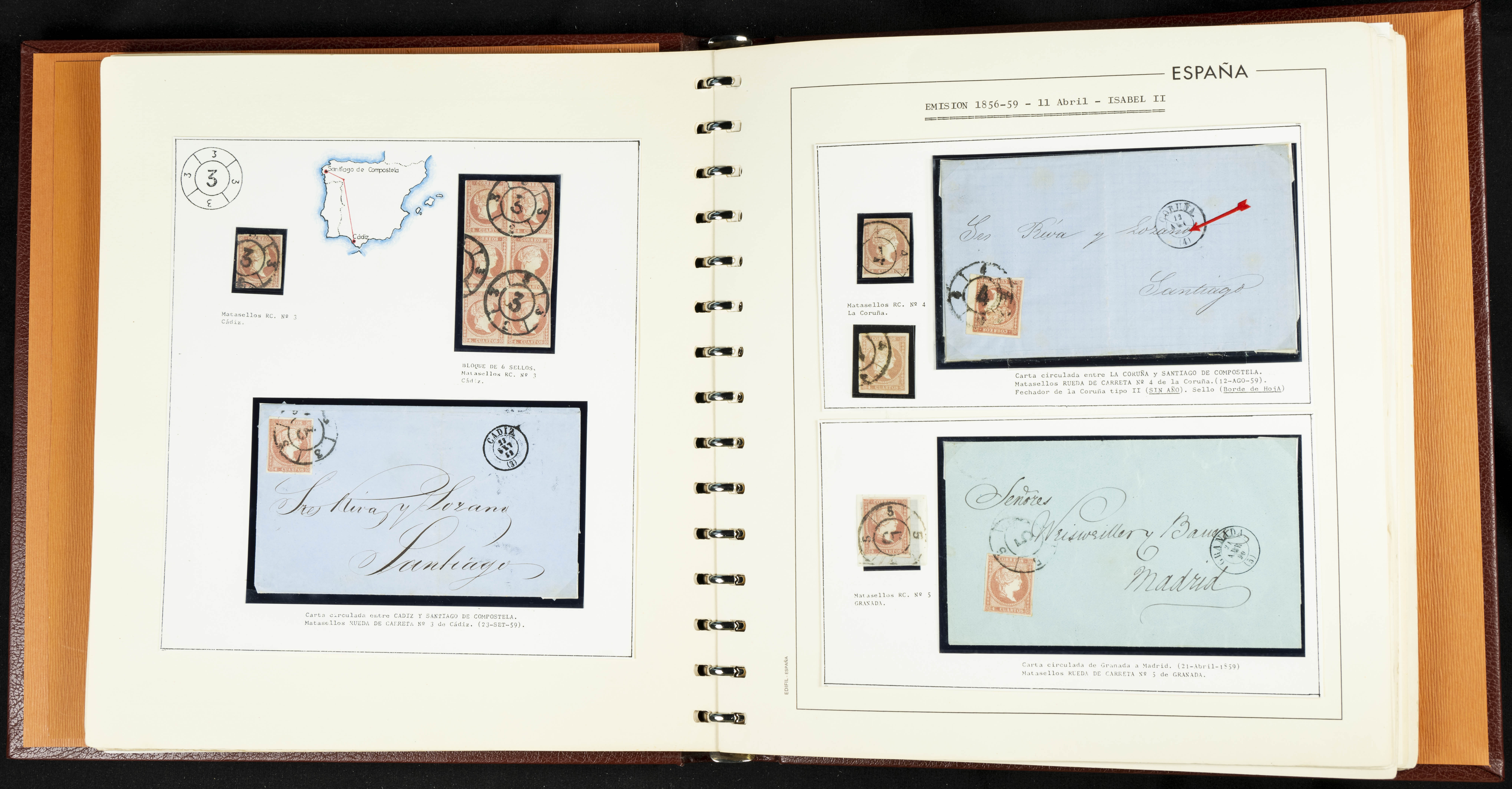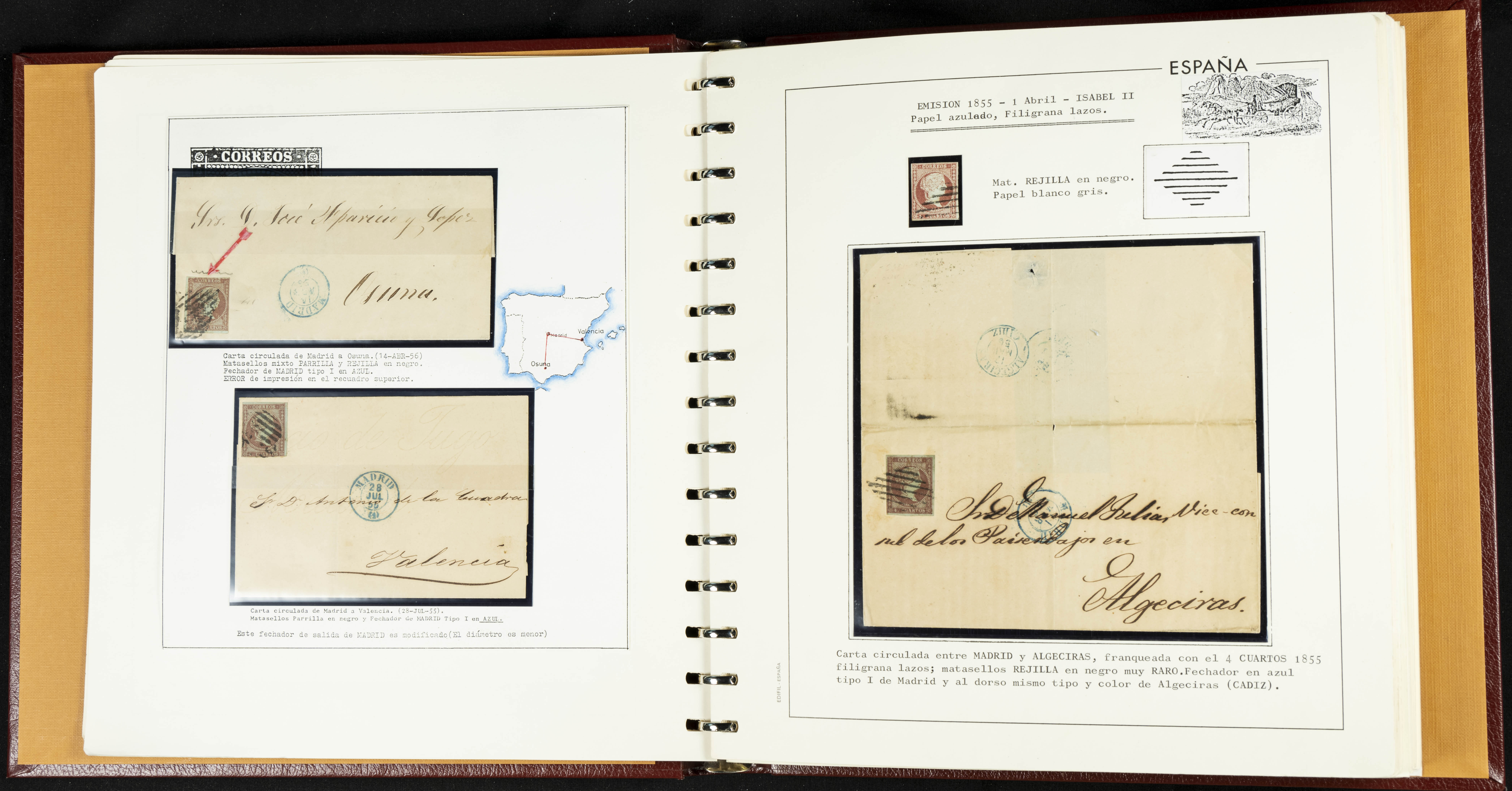 40, 44, 48. 1855. Spectacular collection/study of hundreds of 4 cuartos red stamps (three issues) from 1855, including numerous letters, some with pre-philatelic markings on the front, various multiples, cliché varieties, etc., most canceled with GRILL postmarks (first printings), date stamps (organized by Province), Wagon Wheels (organized by number), and some pre-philatelic postmarks. ESSENTIAL TO EXAMINE.