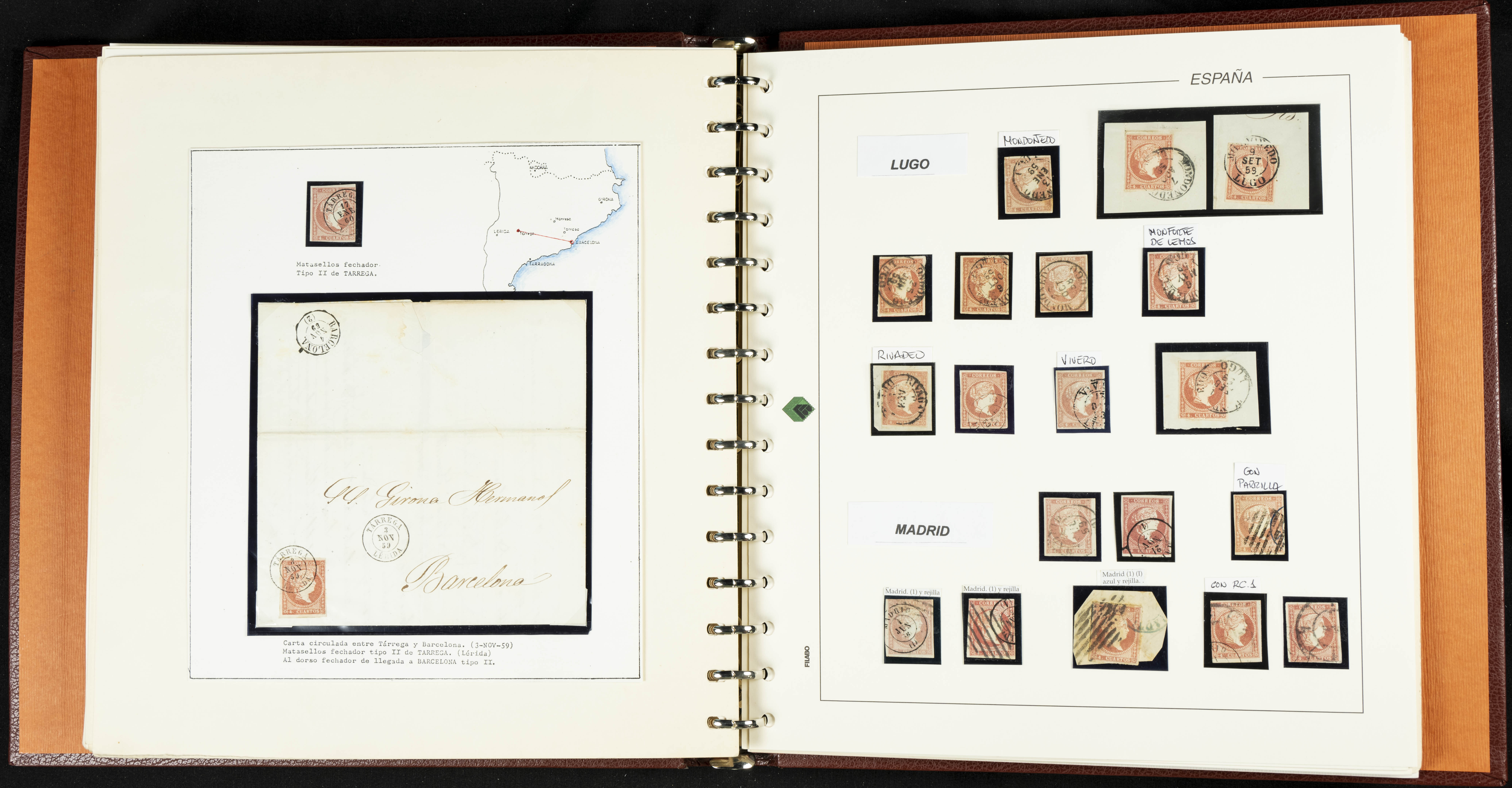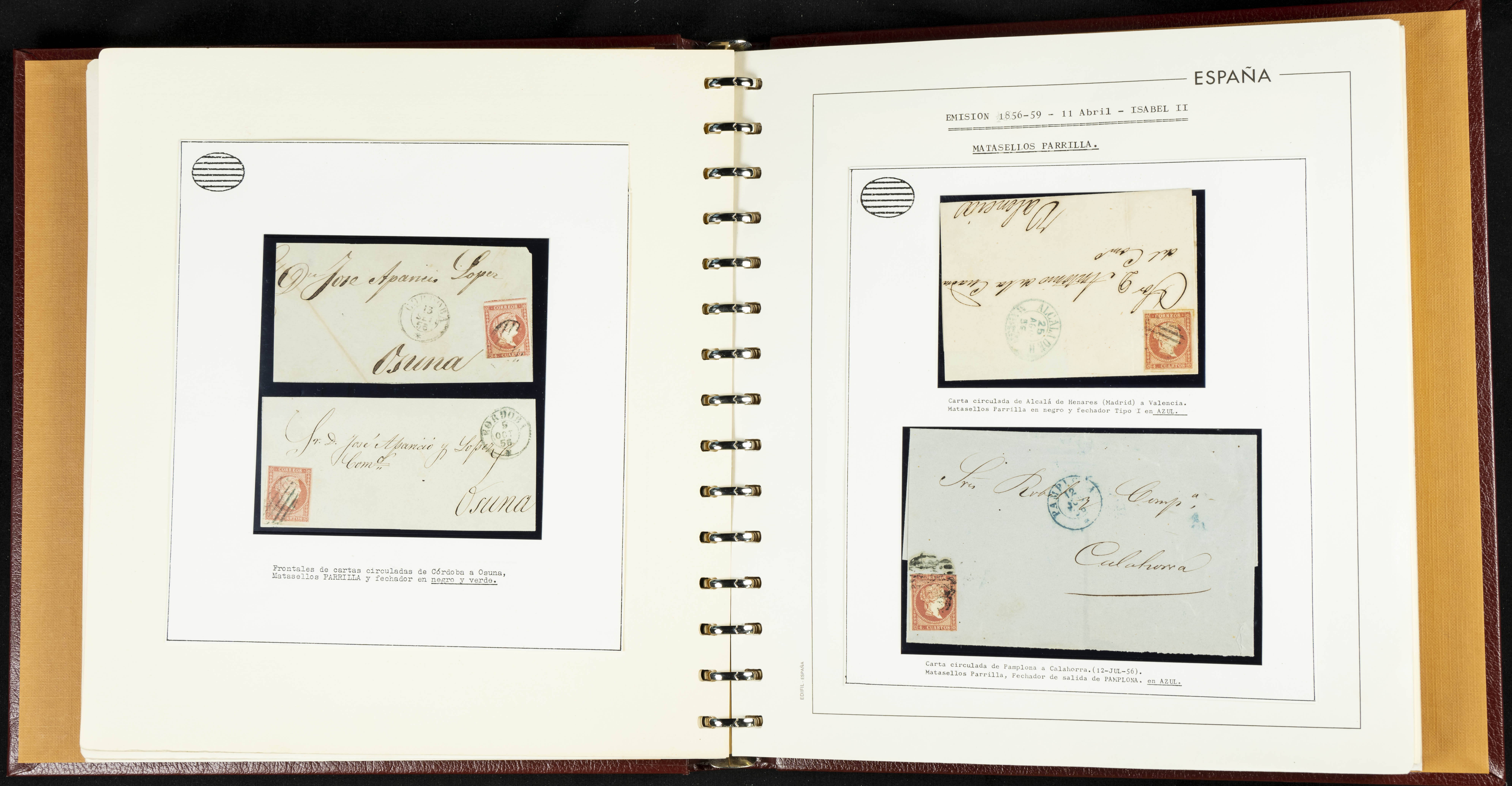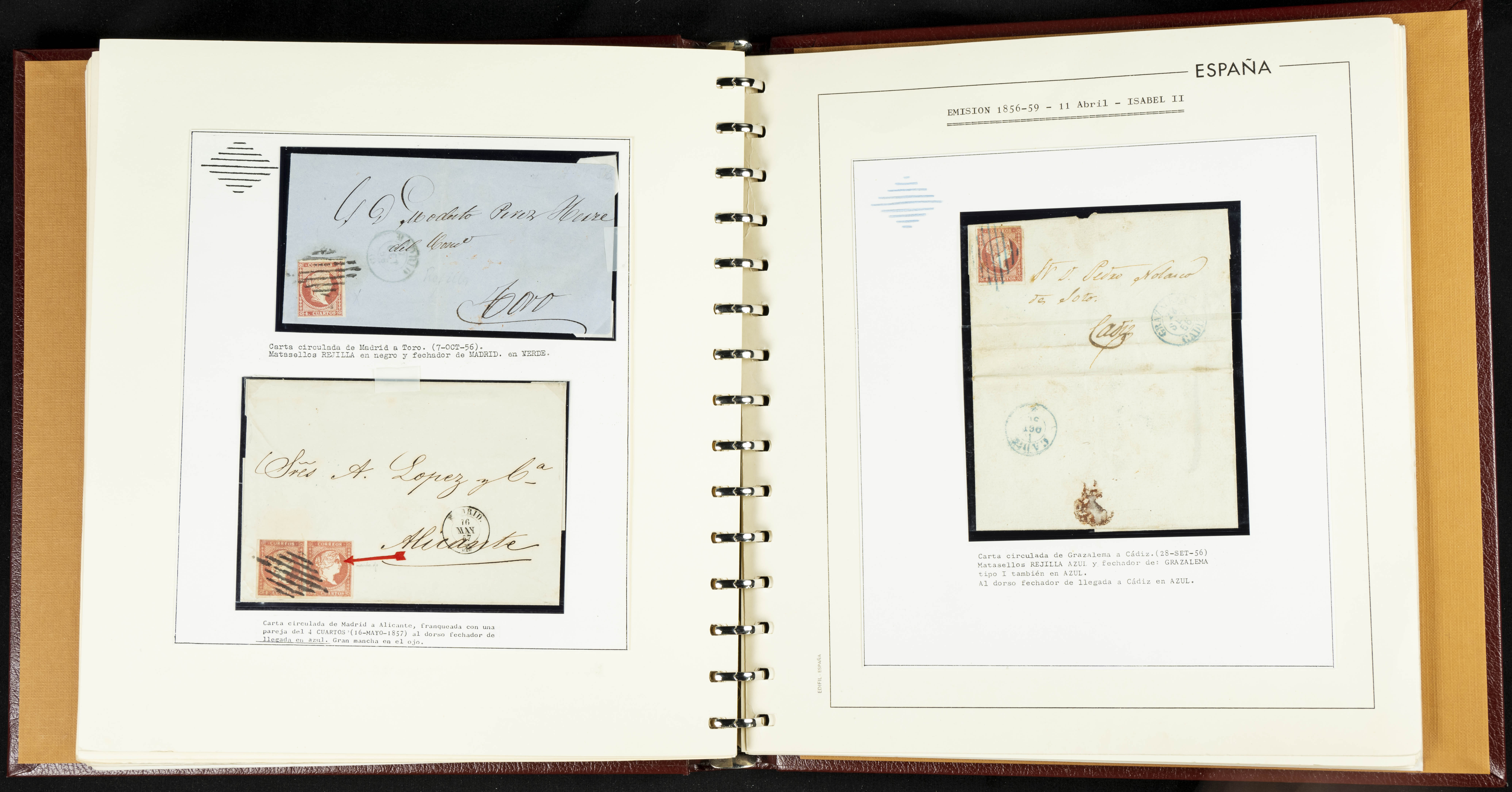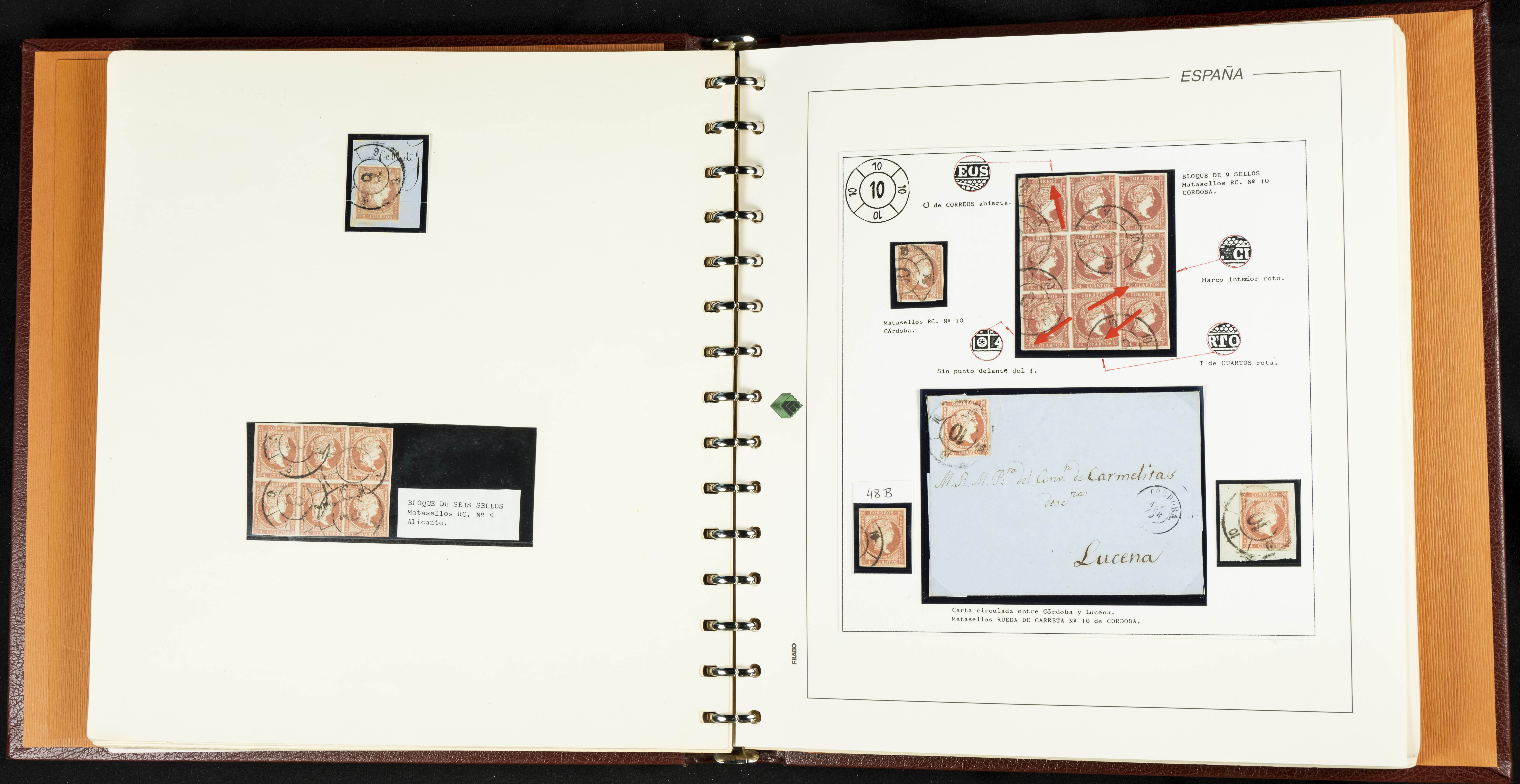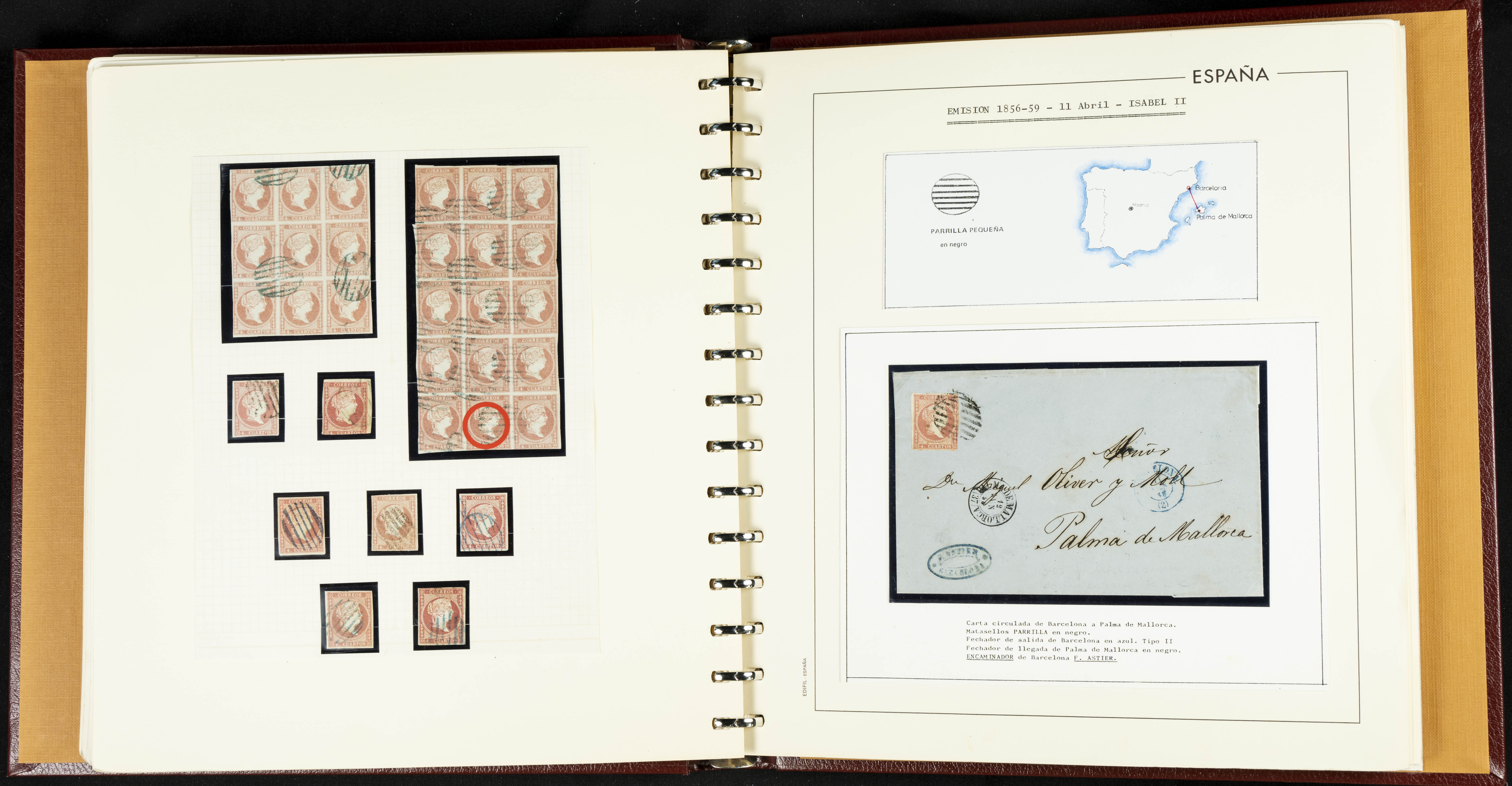 40, 44, 48. 1855. Spectacular collection/study of hundreds of 4 cuartos red stamps (three issues) from 1855, including numerous letters, some with pre-philatelic markings on the front, various multiples, cliché varieties, etc., most canceled with GRILL postmarks (first printings), date stamps (organized by Province), Wagon Wheels (organized by number), and some pre-philatelic postmarks. ESSENTIAL TO EXAMINE.