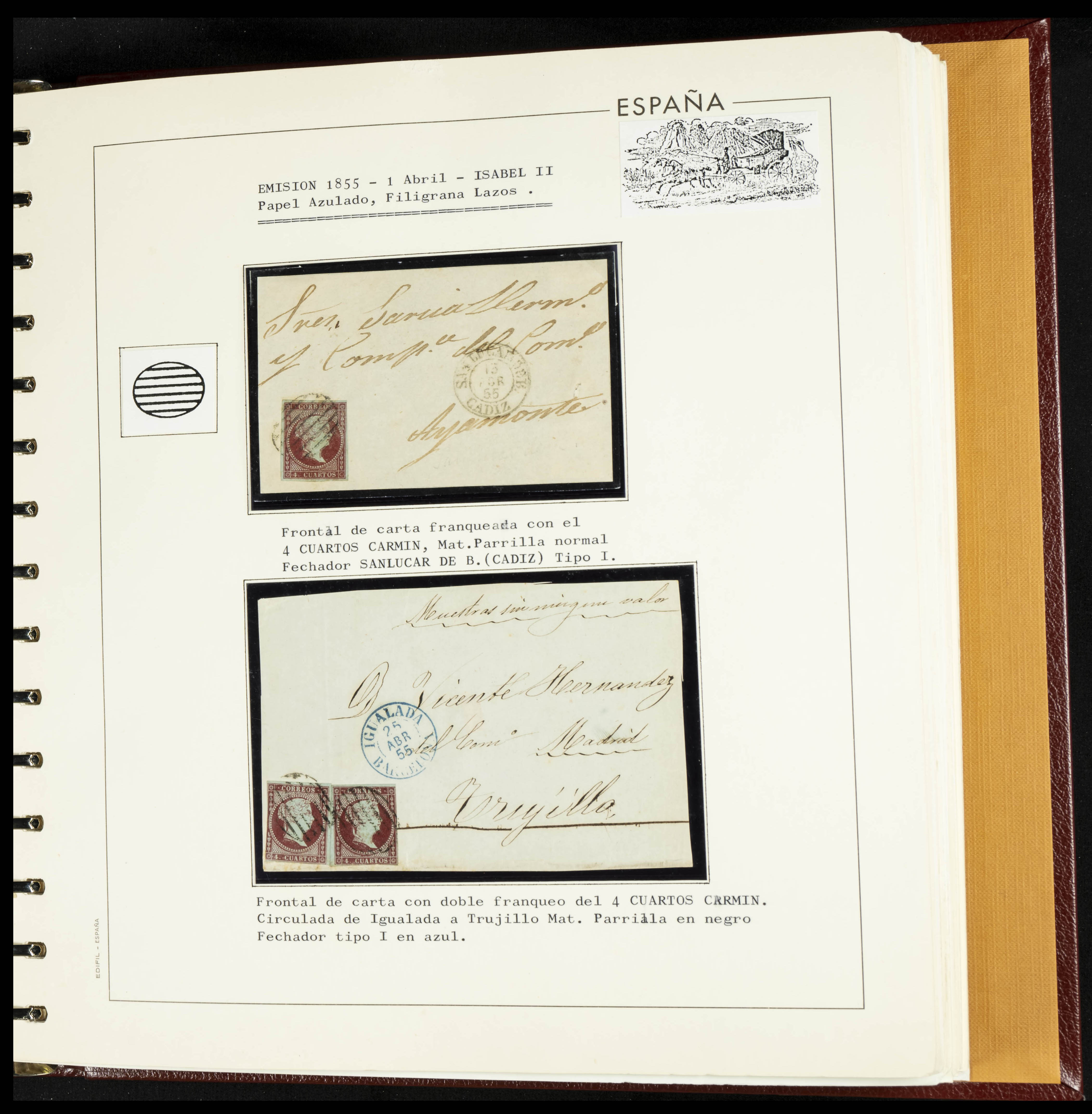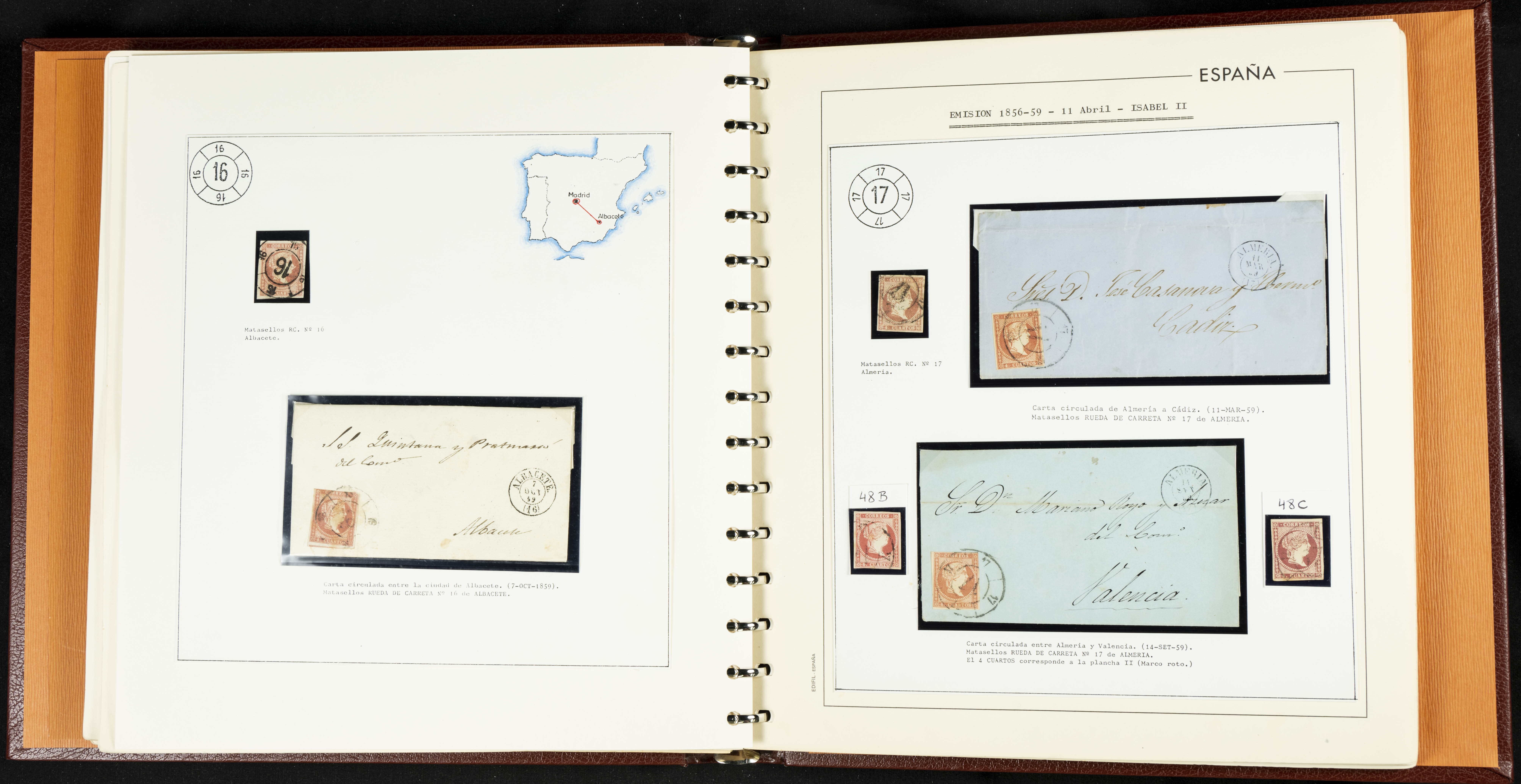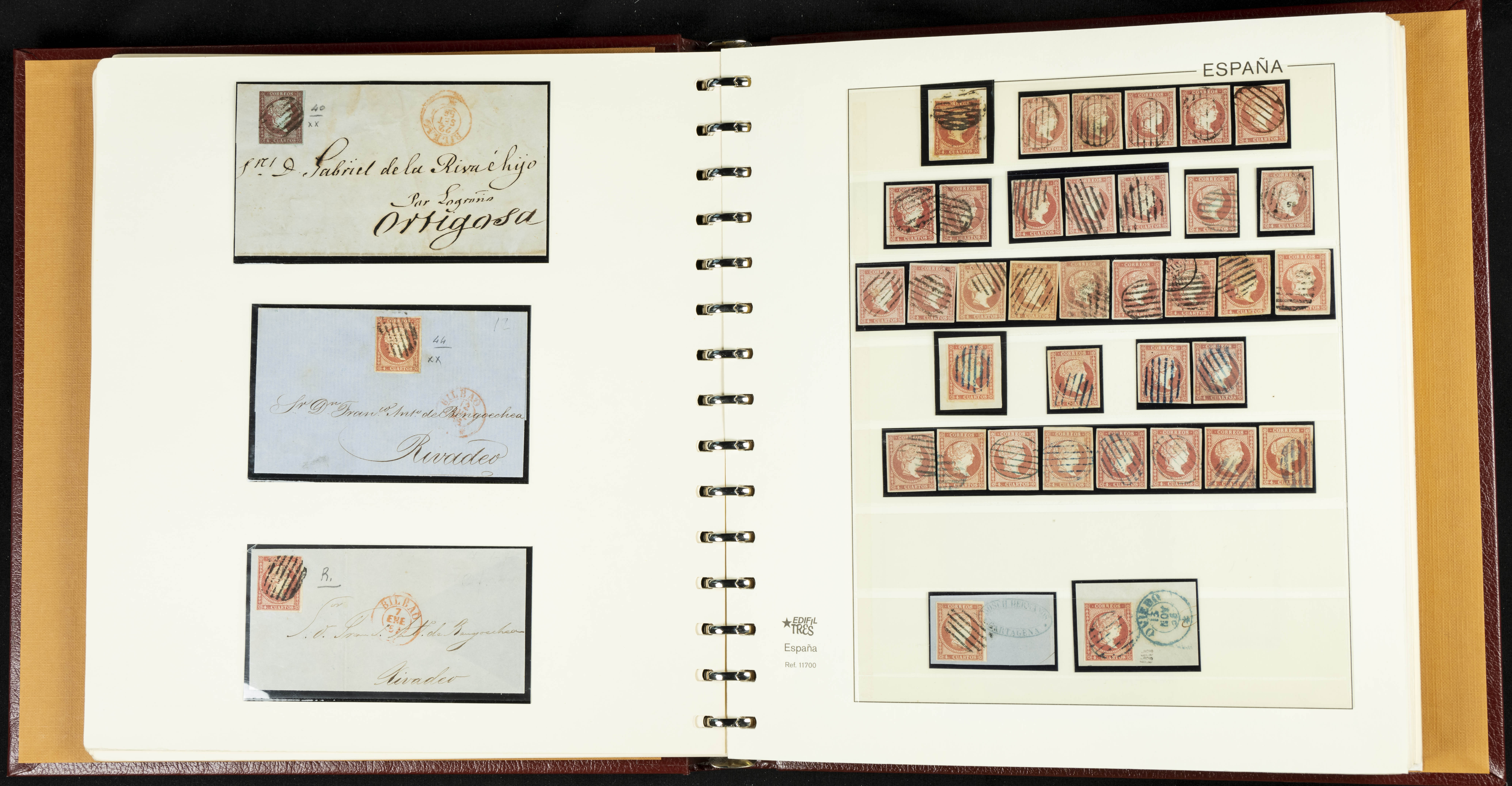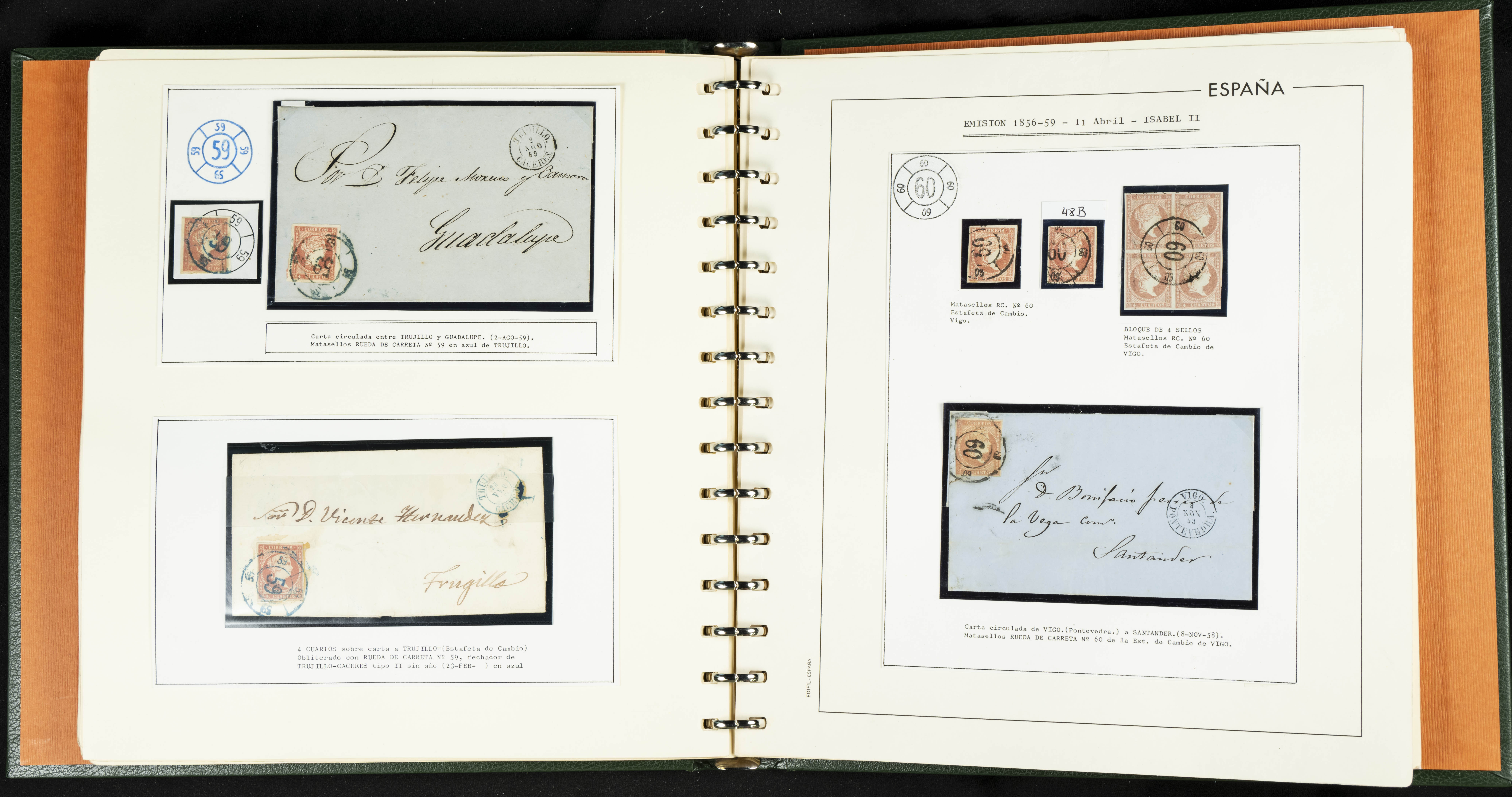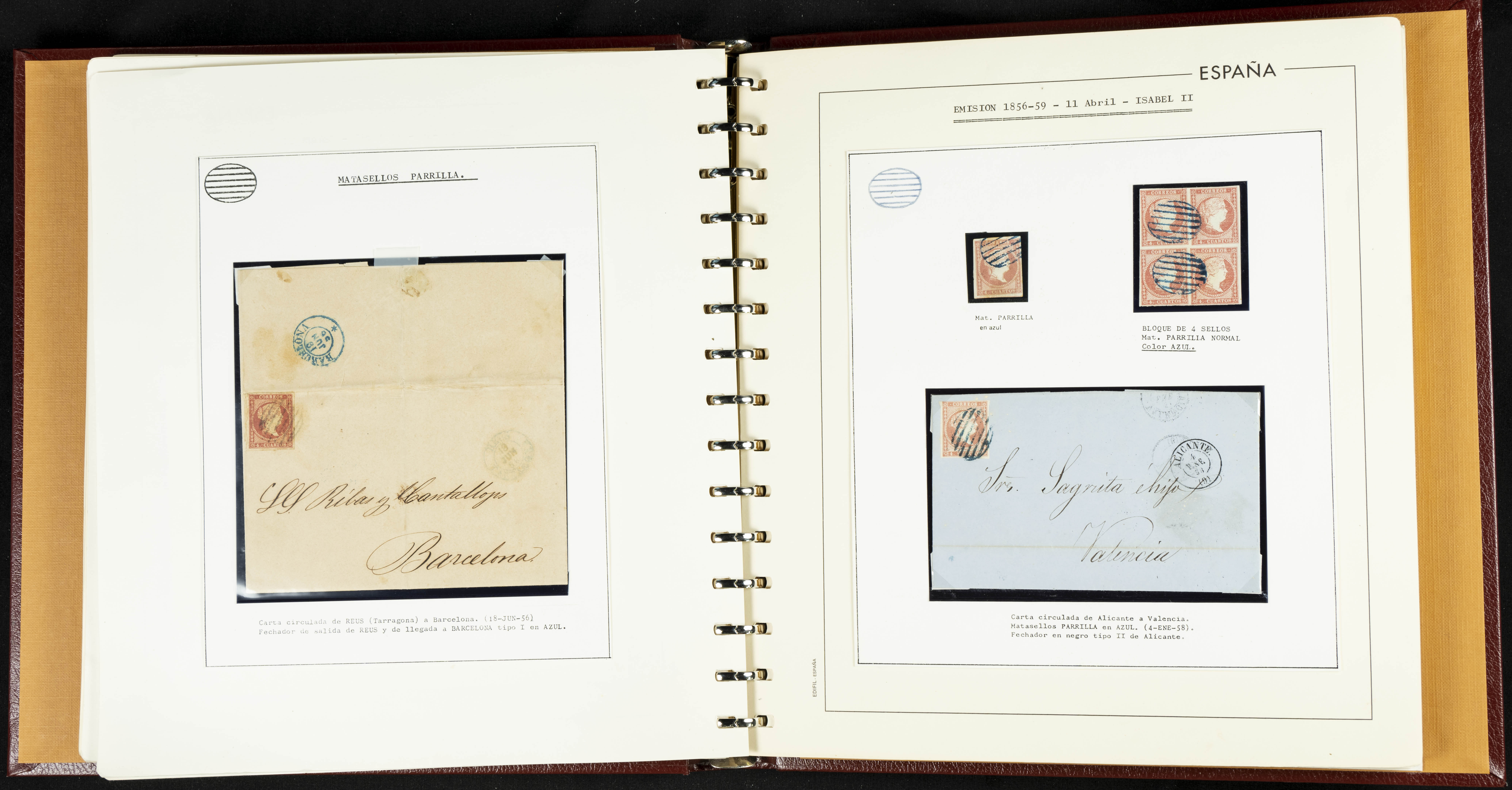 40, 44, 48. 1855. Spectacular collection/study of hundreds of 4 cuartos red stamps (three issues) from 1855, including numerous letters, some with pre-philatelic markings on the front, various multiples, cliché varieties, etc., most canceled with GRILL postmarks (first printings), date stamps (organized by Province), Wagon Wheels (organized by number), and some pre-philatelic postmarks. ESSENTIAL TO EXAMINE.