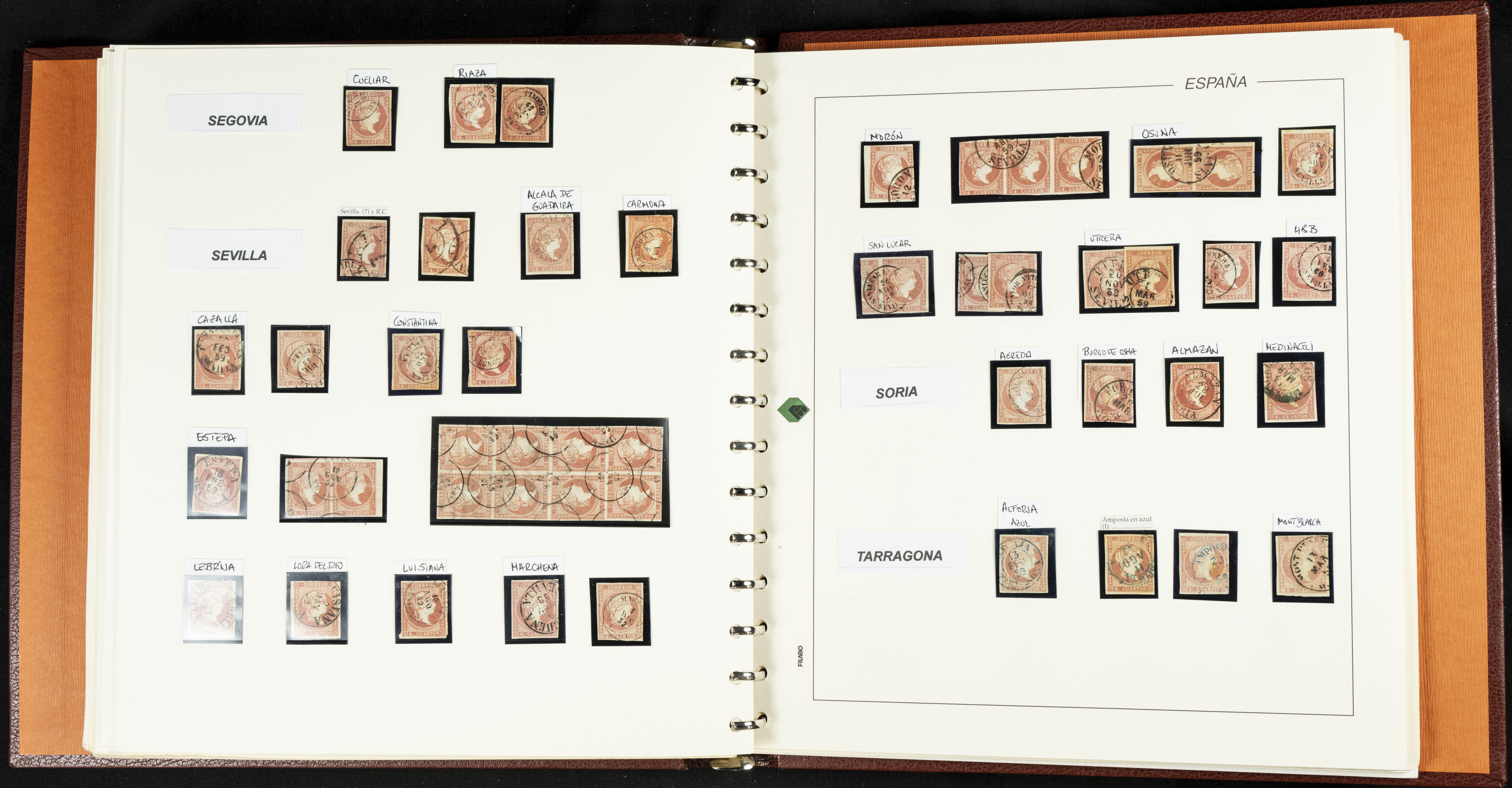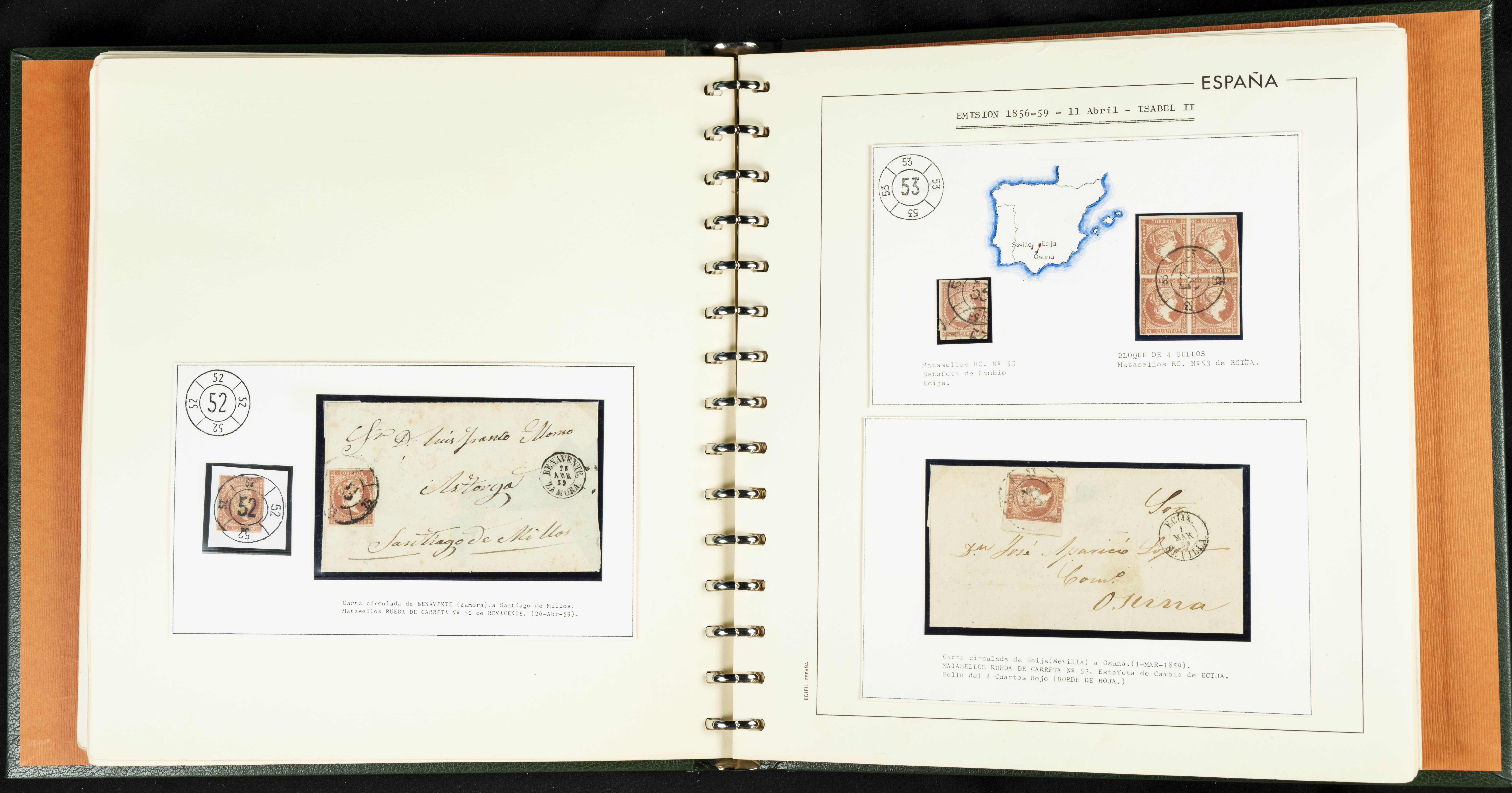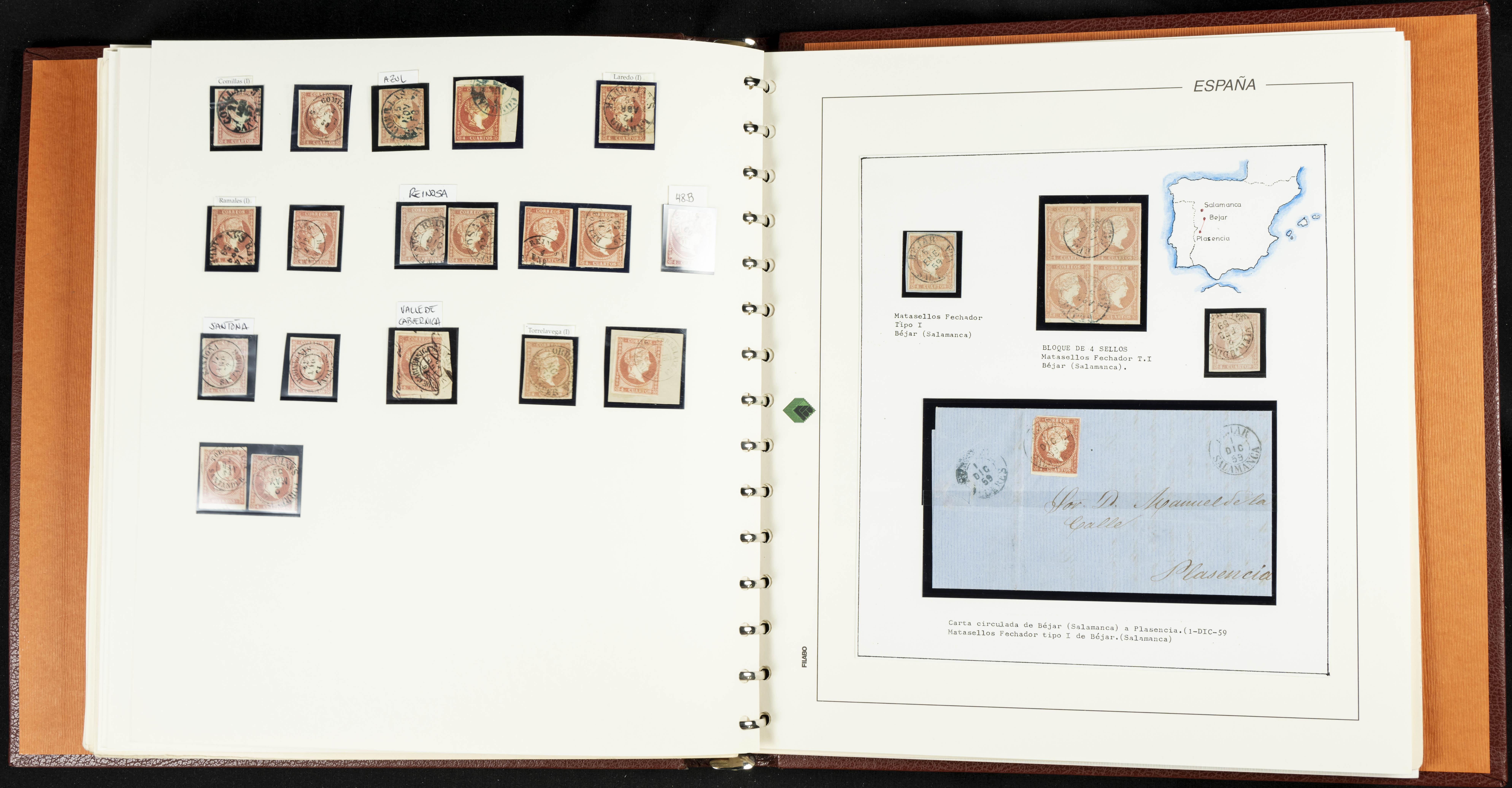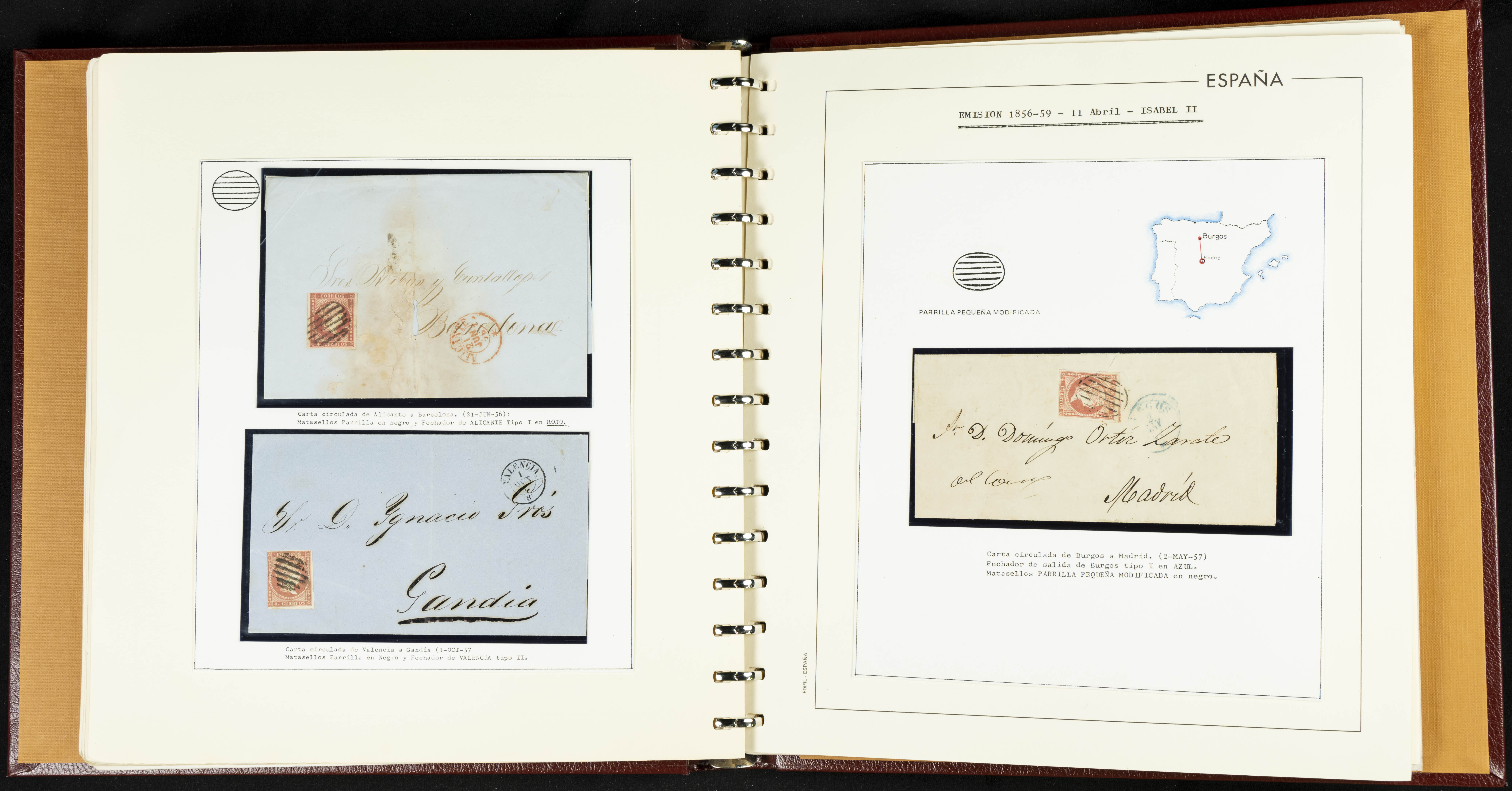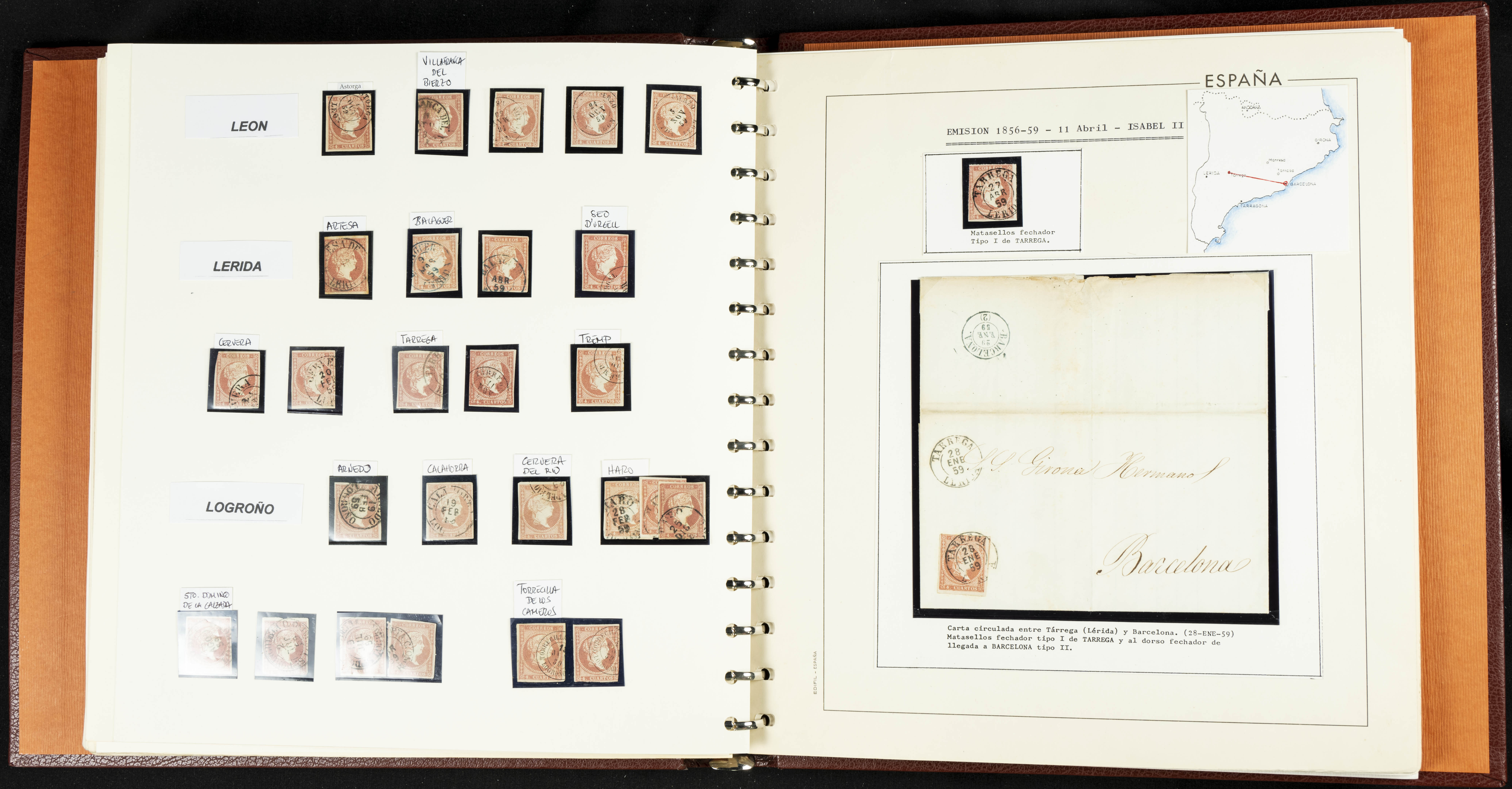40, 44, 48. 1855. Spectacular collection/study of hundreds of 4 cuartos red stamps (three issues) from 1855, including numerous letters, some with pre-philatelic markings on the front, various multiples, cliché varieties, etc., most canceled with GRILL postmarks (first printings), date stamps (organized by Province), Wagon Wheels (organized by number), and some pre-philatelic postmarks. ESSENTIAL TO EXAMINE.