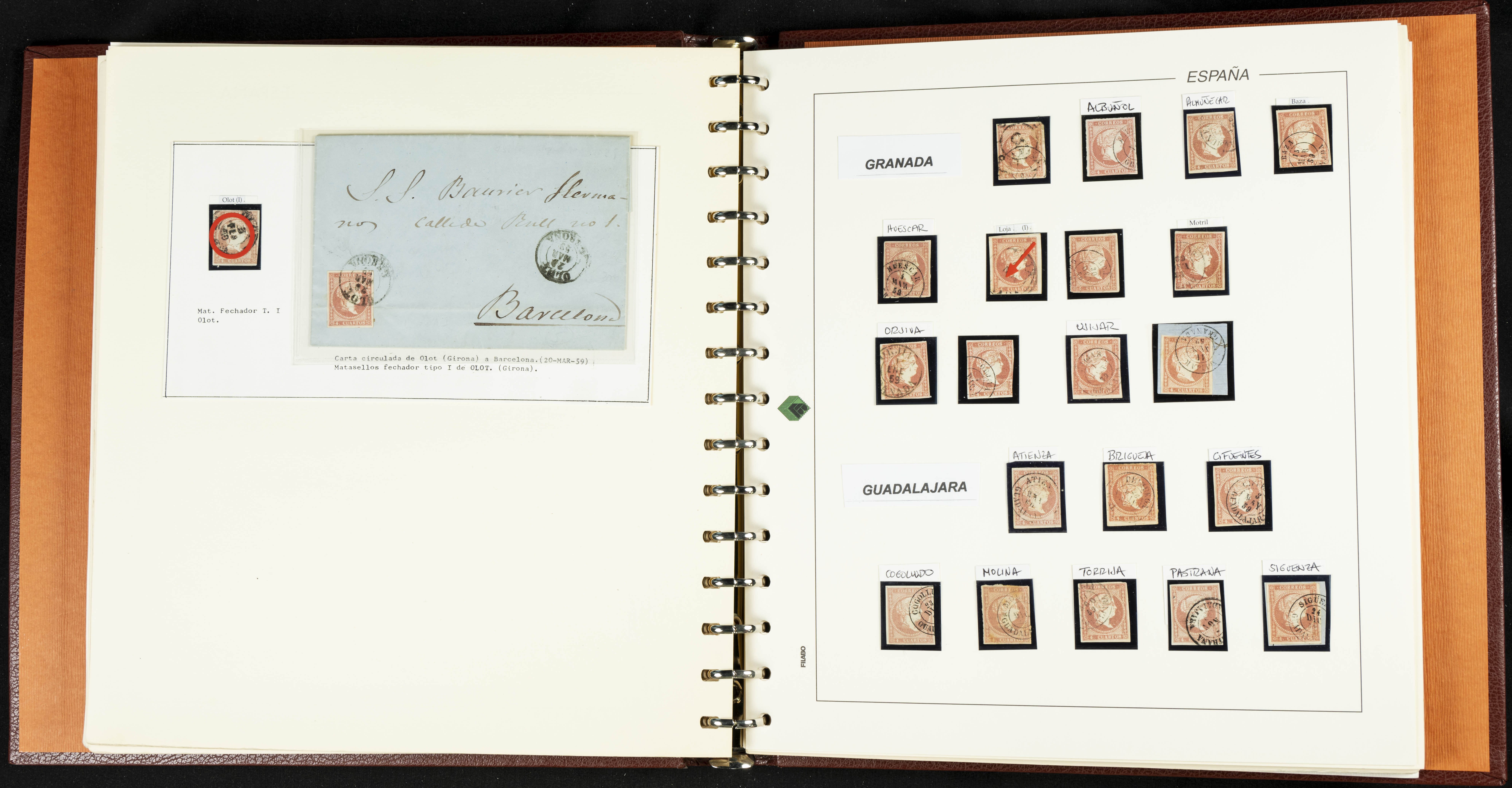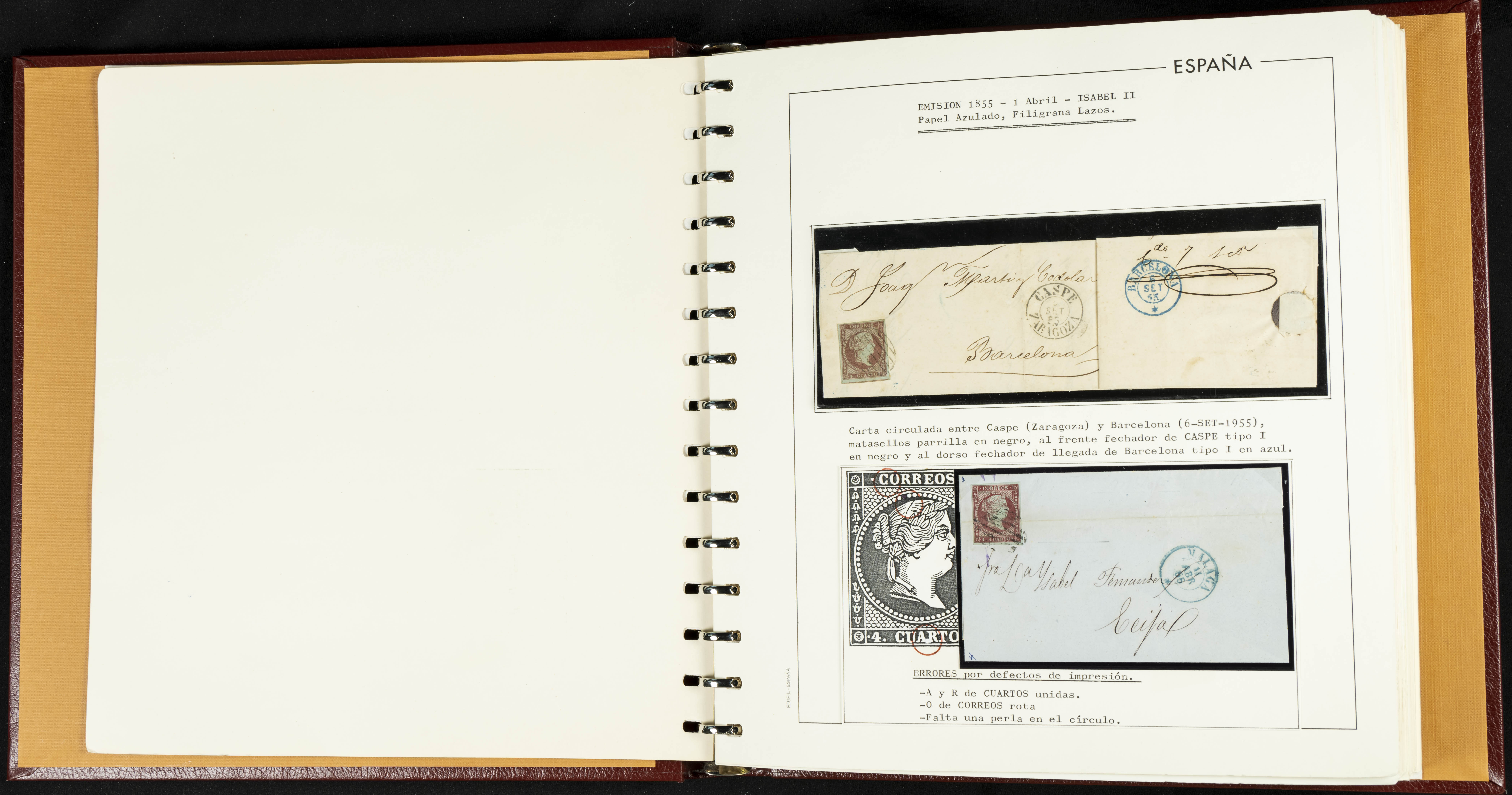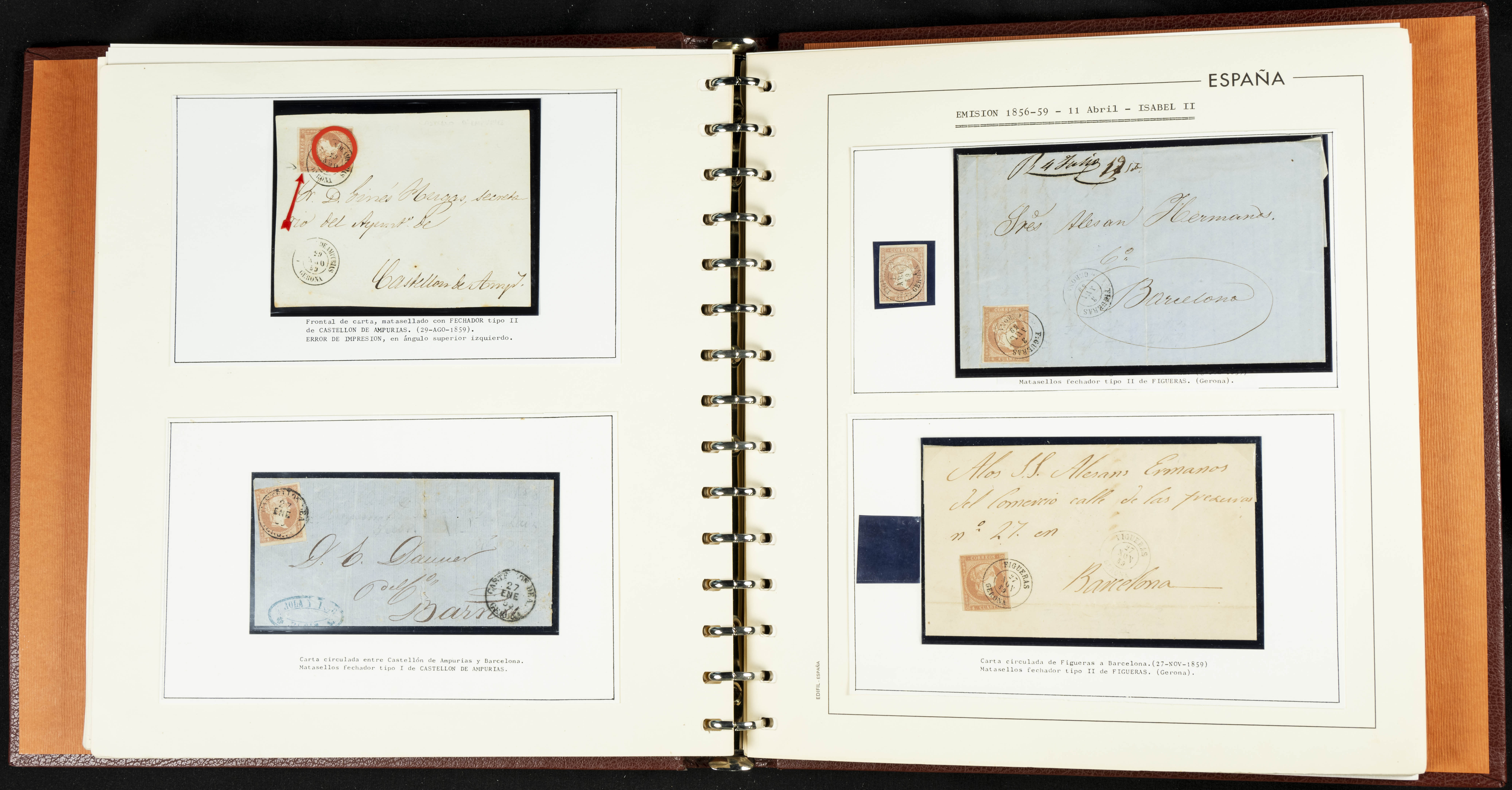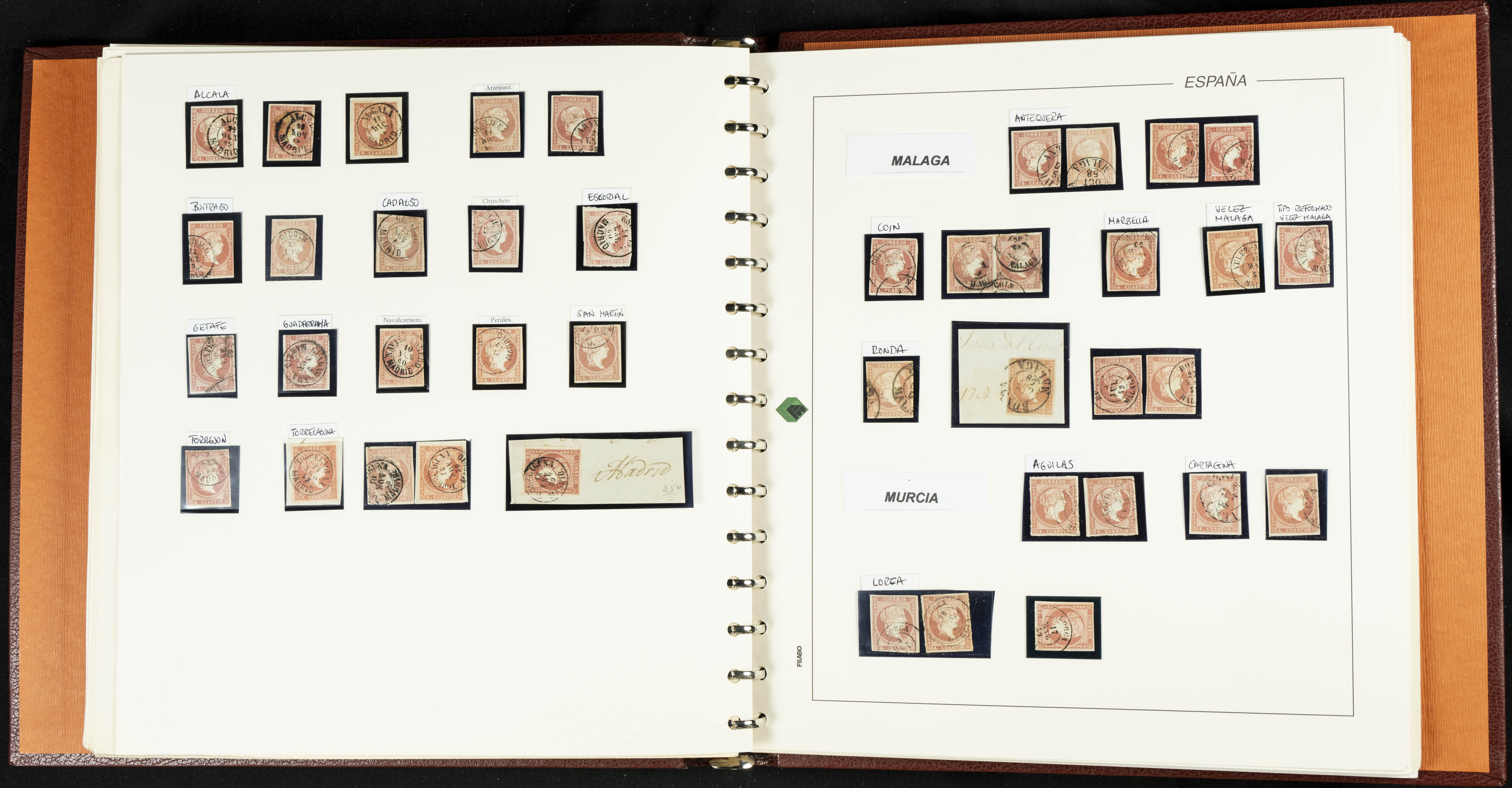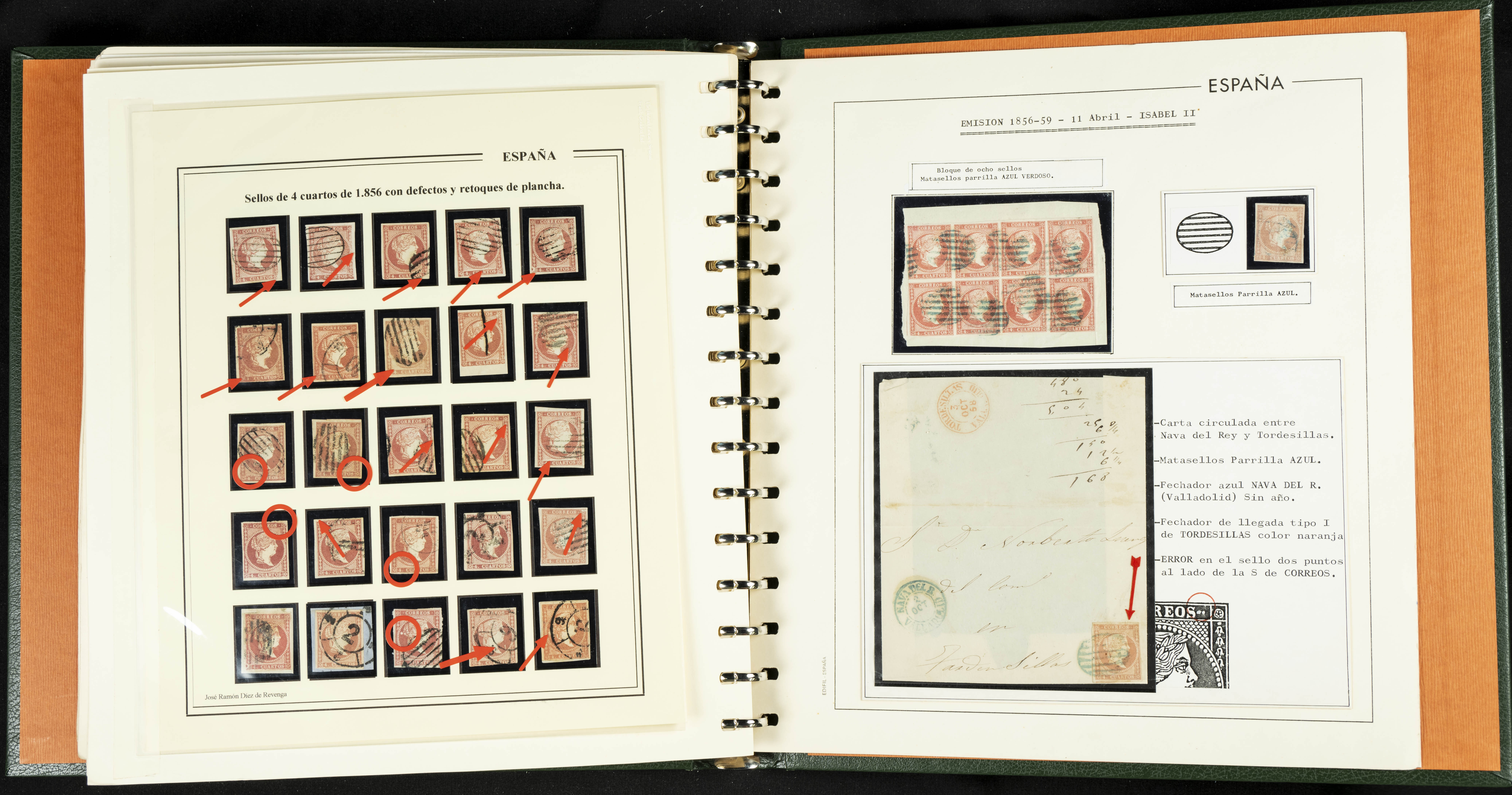 40, 44, 48. 1855. Spectacular collection/study of hundreds of 4 cuartos red stamps (three issues) from 1855, including numerous letters, some with pre-philatelic markings on the front, various multiples, cliché varieties, etc., most canceled with GRILL postmarks (first printings), date stamps (organized by Province), Wagon Wheels (organized by number), and some pre-philatelic postmarks. ESSENTIAL TO EXAMINE.
