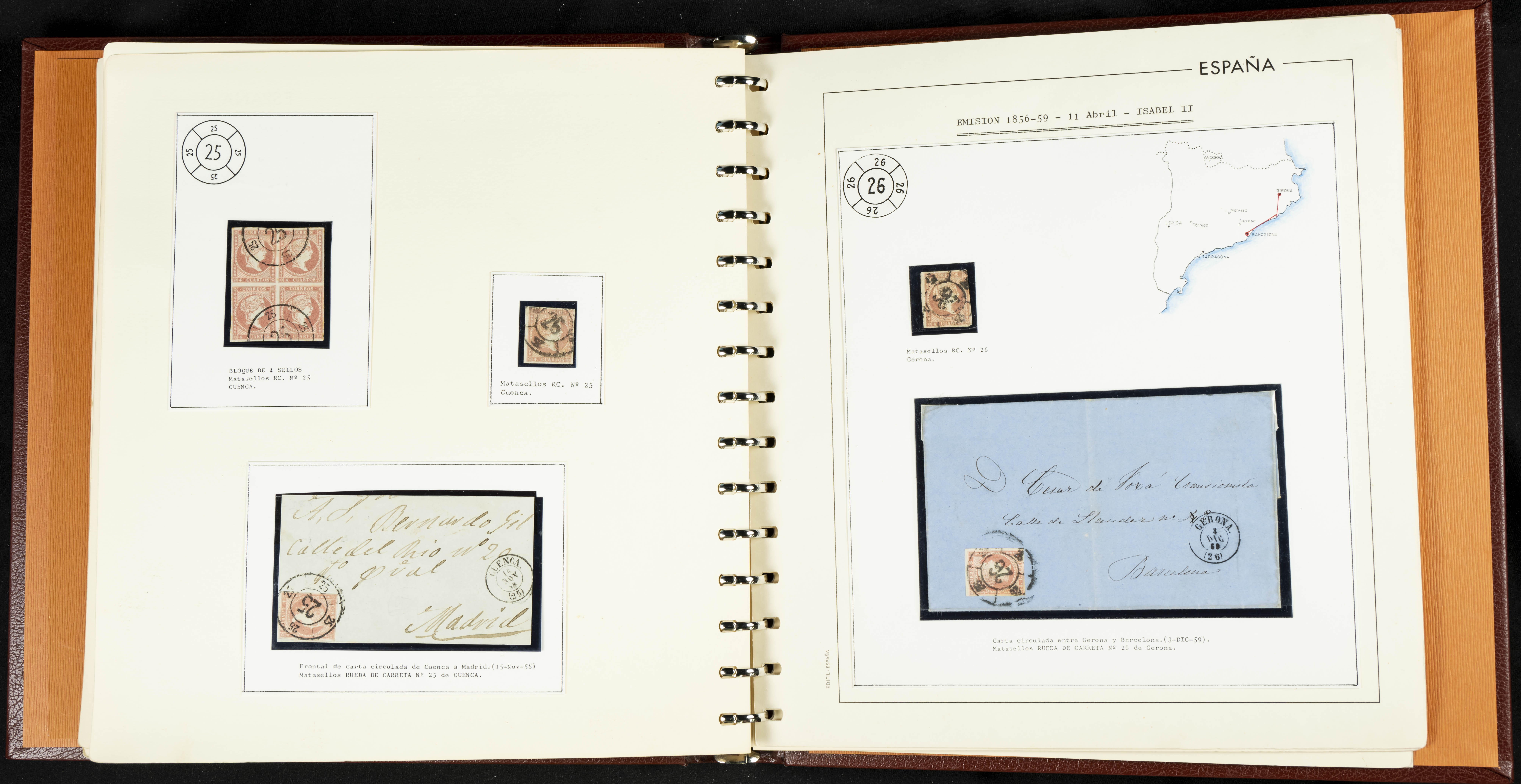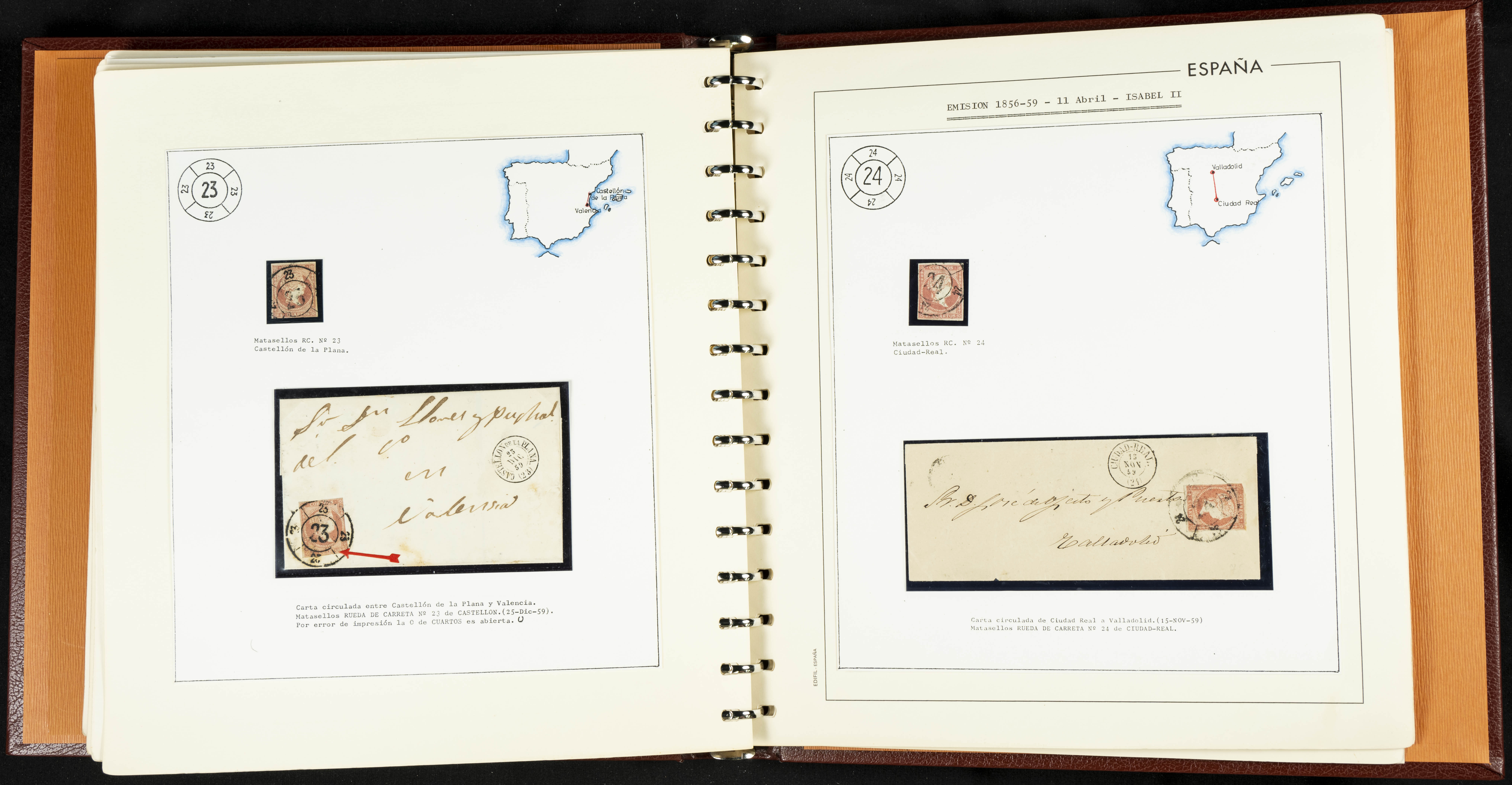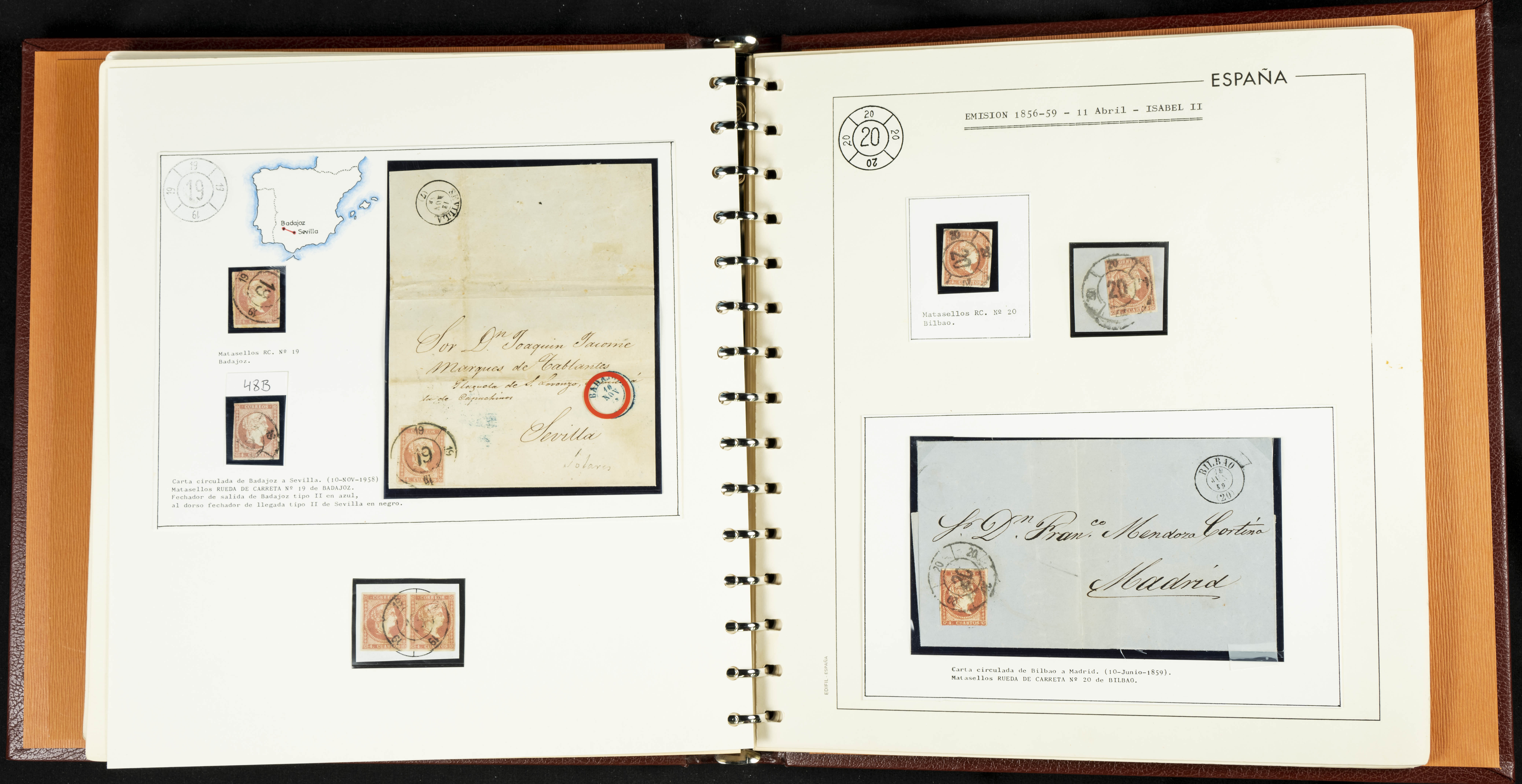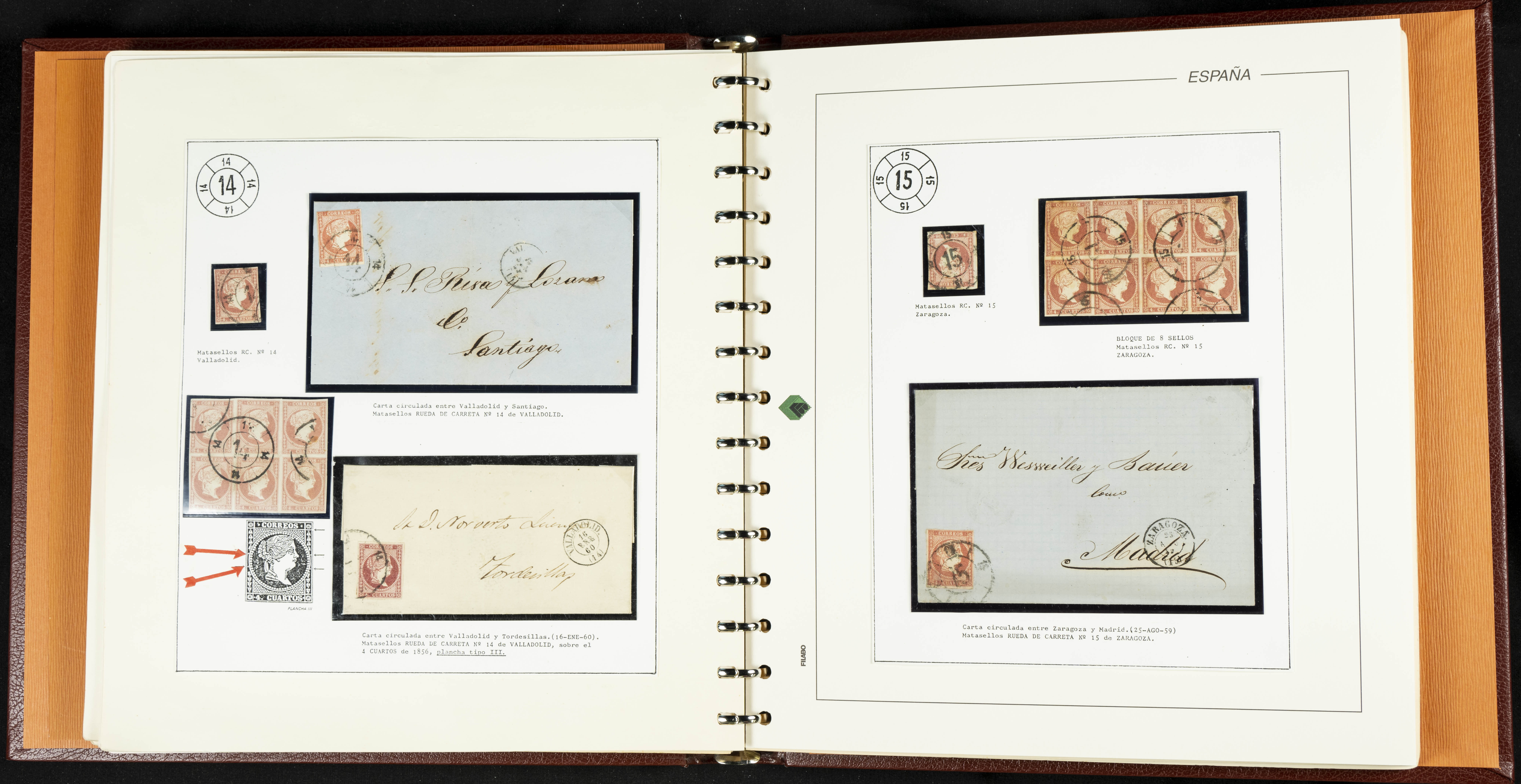 40, 44, 48. 1855. Spectacular collection/study of hundreds of 4 cuartos red stamps (three issues) from 1855, including numerous letters, some with pre-philatelic markings on the front, various multiples, cliché varieties, etc., most canceled with GRILL postmarks (first printings), date stamps (organized by Province), Wagon Wheels (organized by number), and some pre-philatelic postmarks. ESSENTIAL TO EXAMINE.