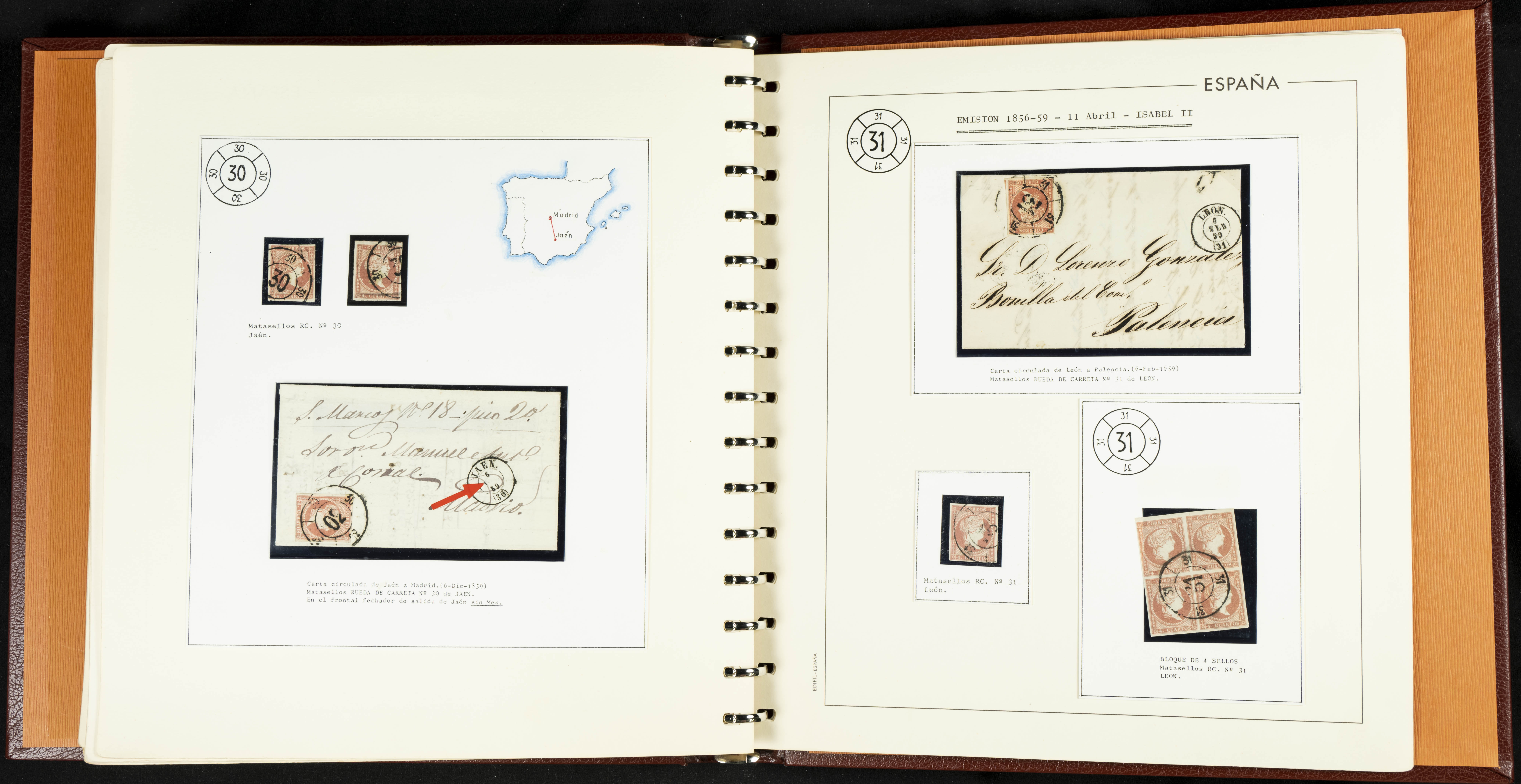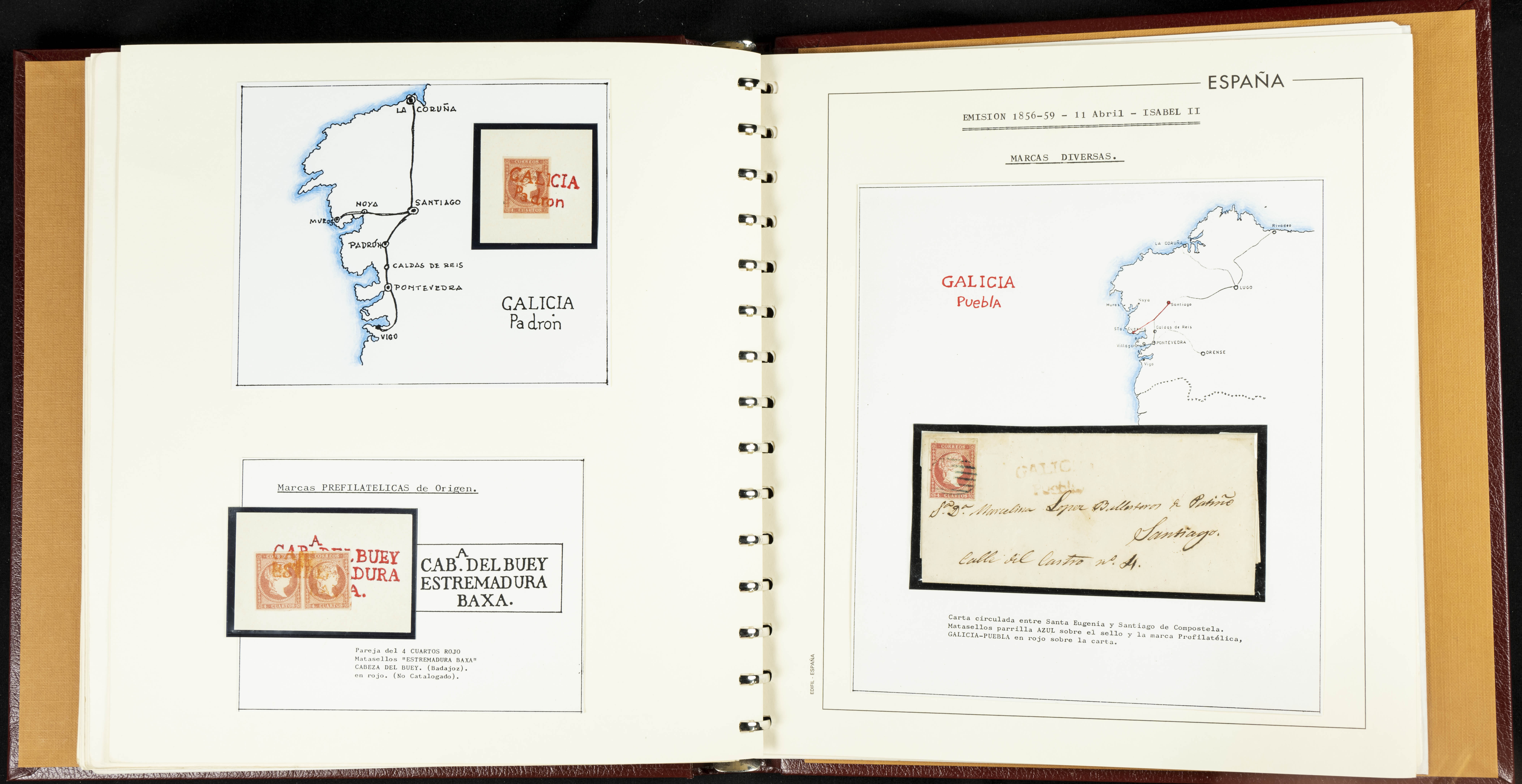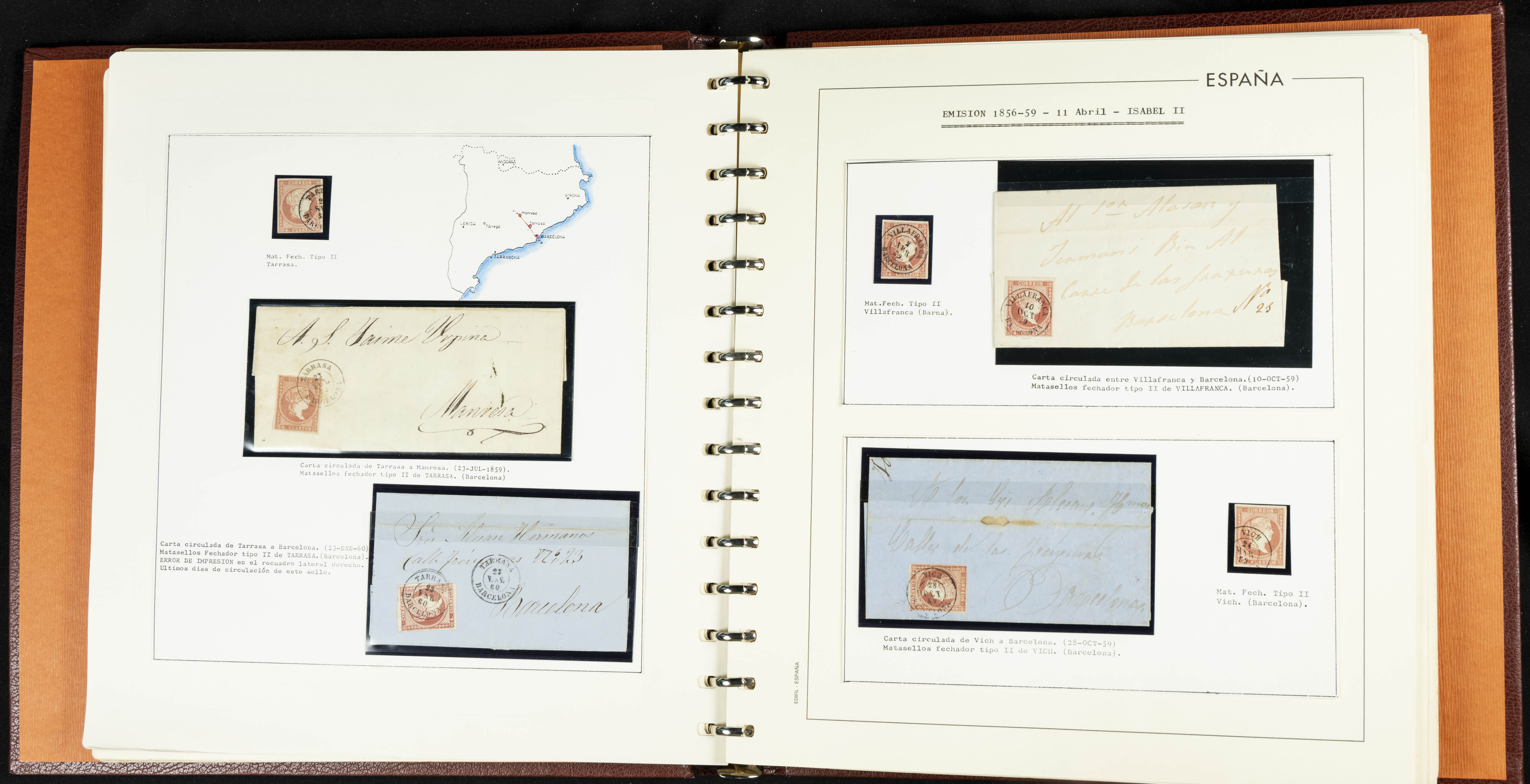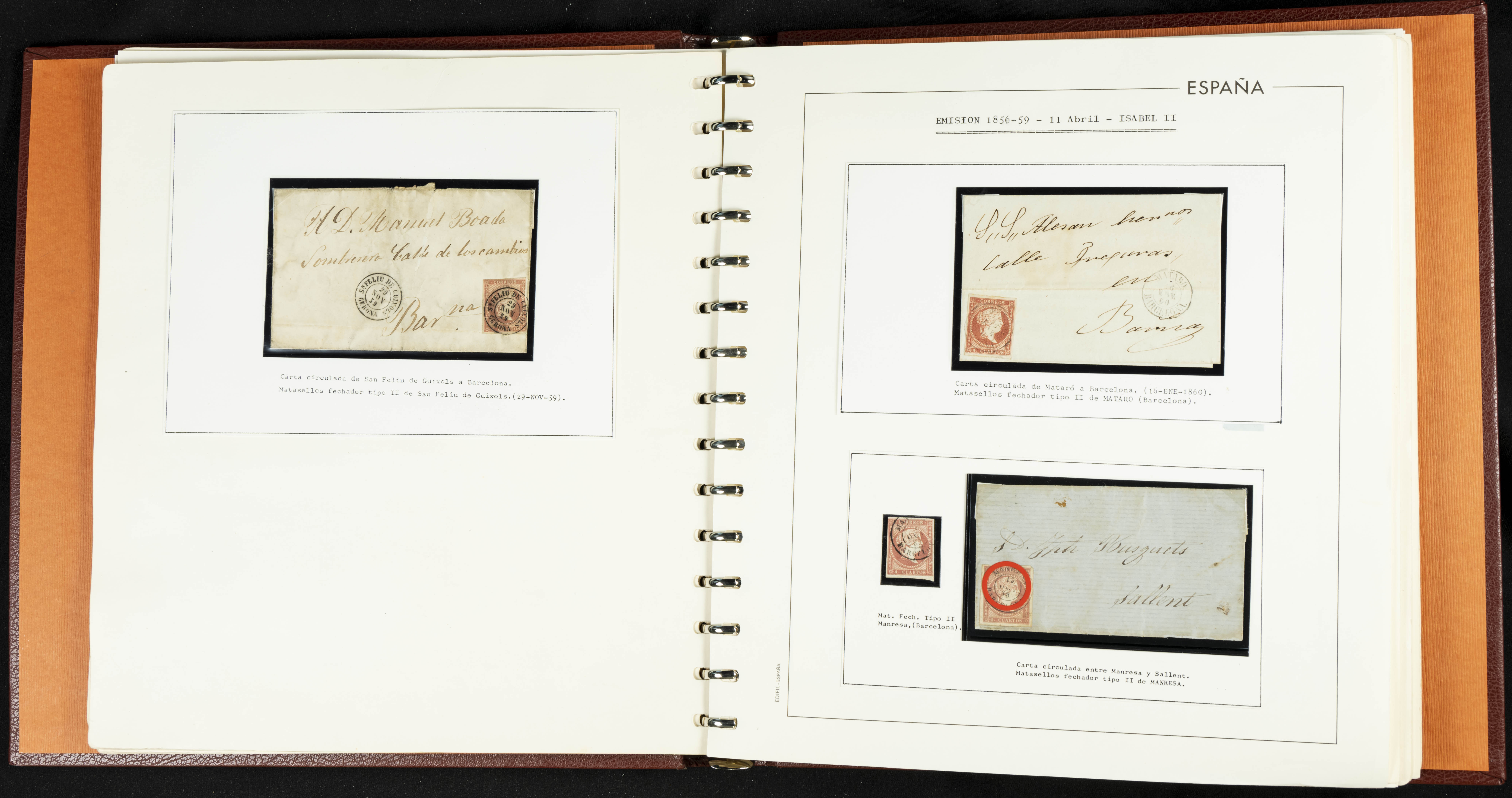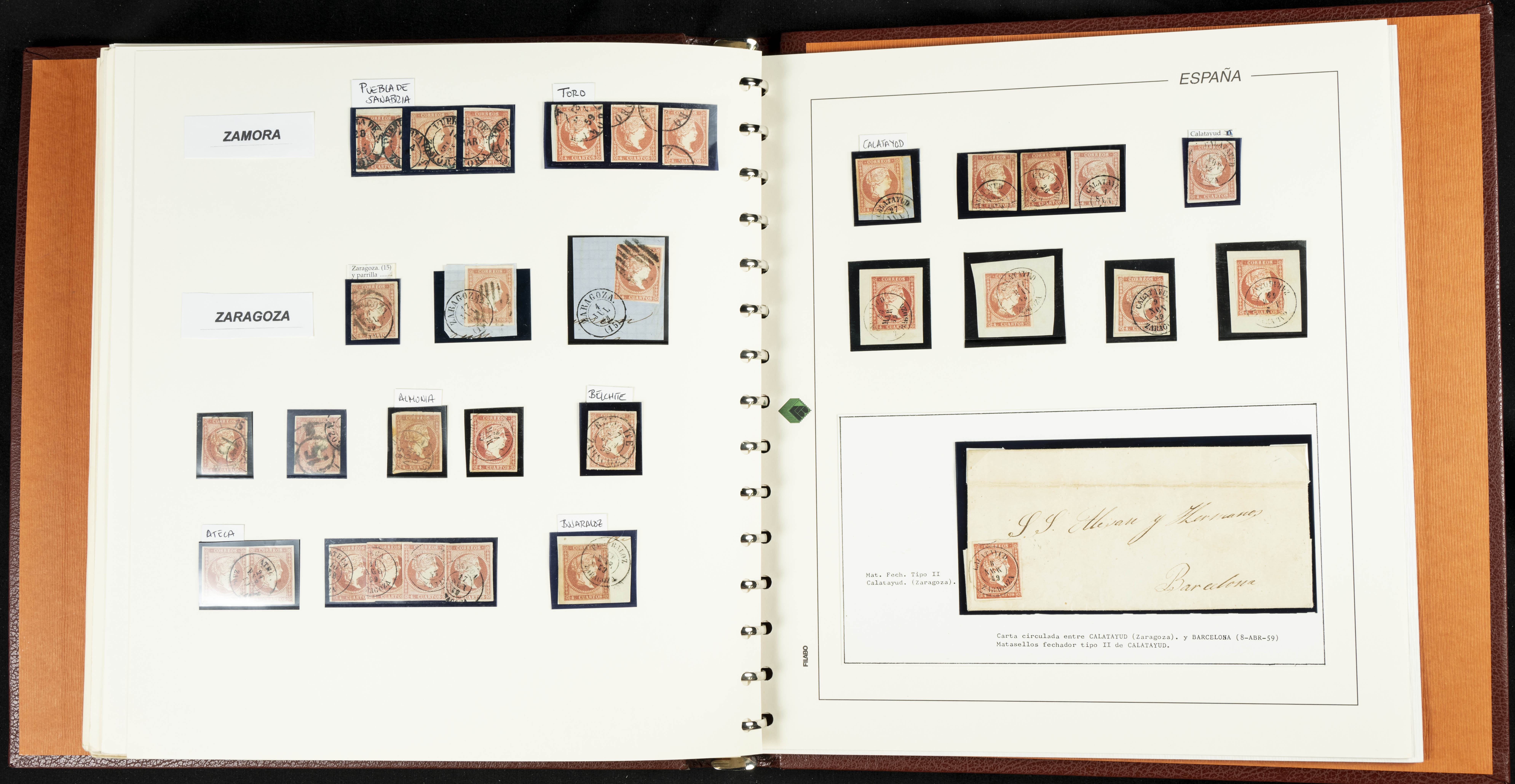 40, 44, 48. 1855. Spectacular collection/study of hundreds of 4 cuartos red stamps (three issues) from 1855, including numerous letters, some with pre-philatelic markings on the front, various multiples, cliché varieties, etc., most canceled with GRILL postmarks (first printings), date stamps (organized by Province), Wagon Wheels (organized by number), and some pre-philatelic postmarks. ESSENTIAL TO EXAMINE.