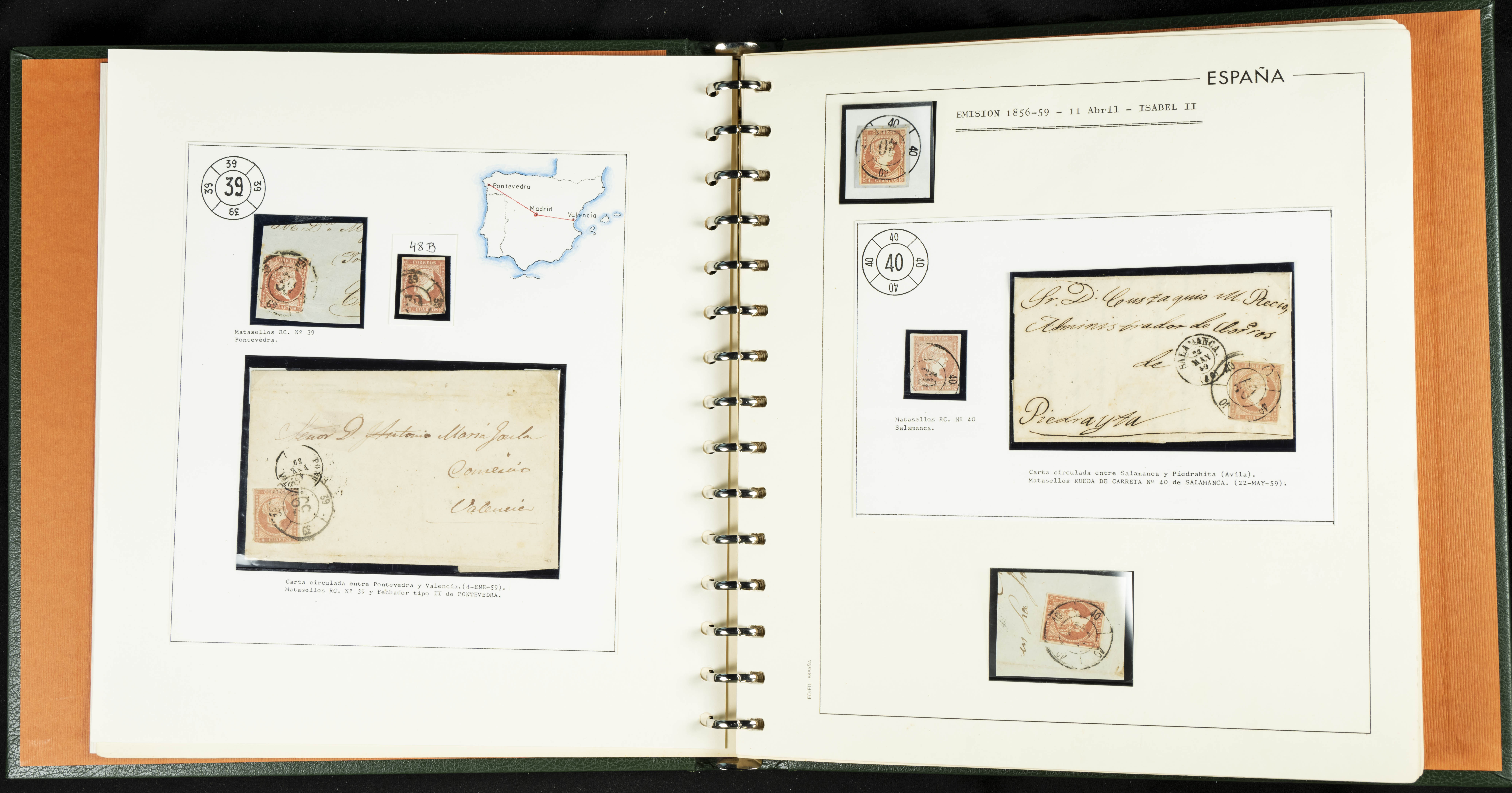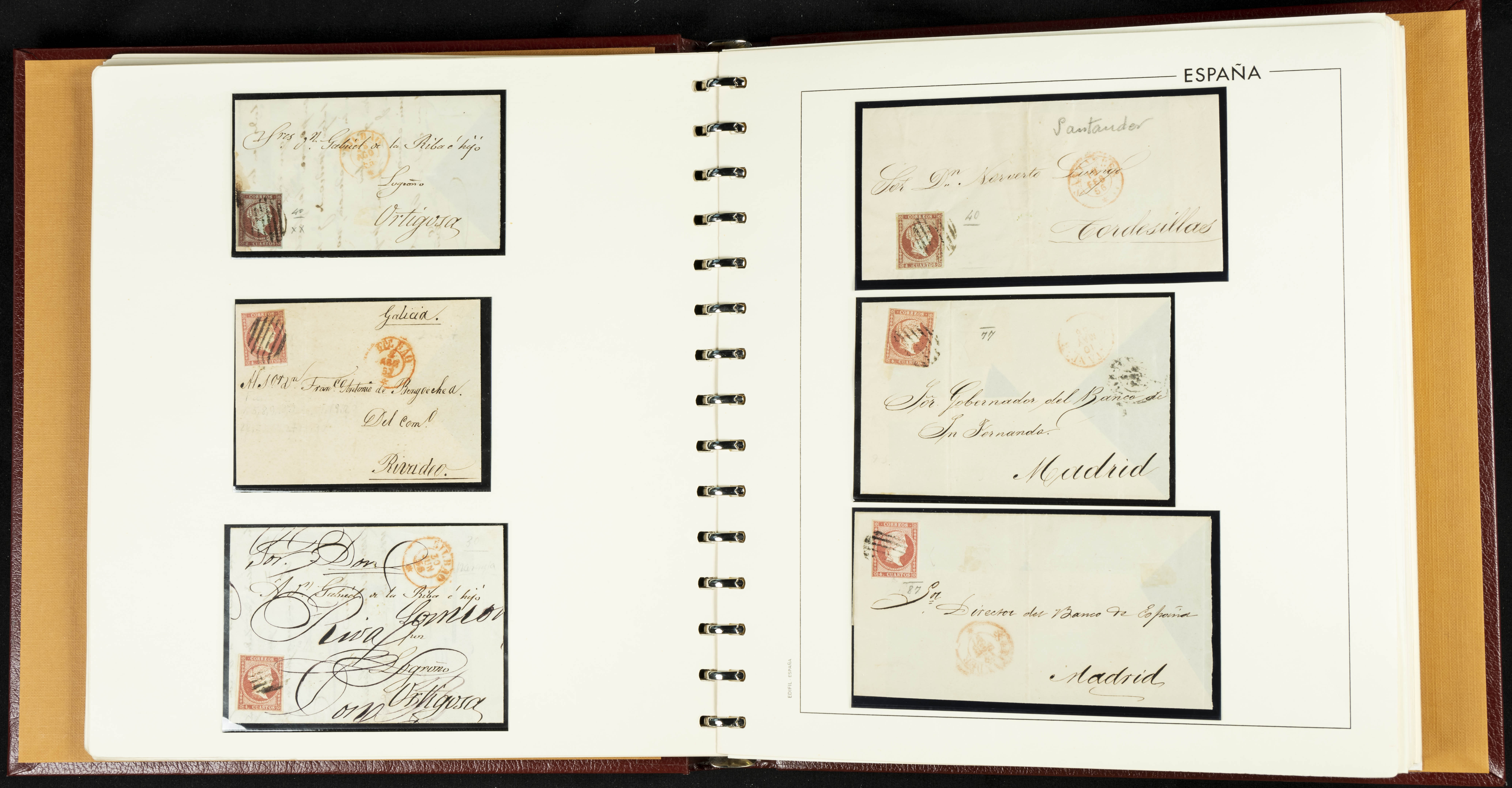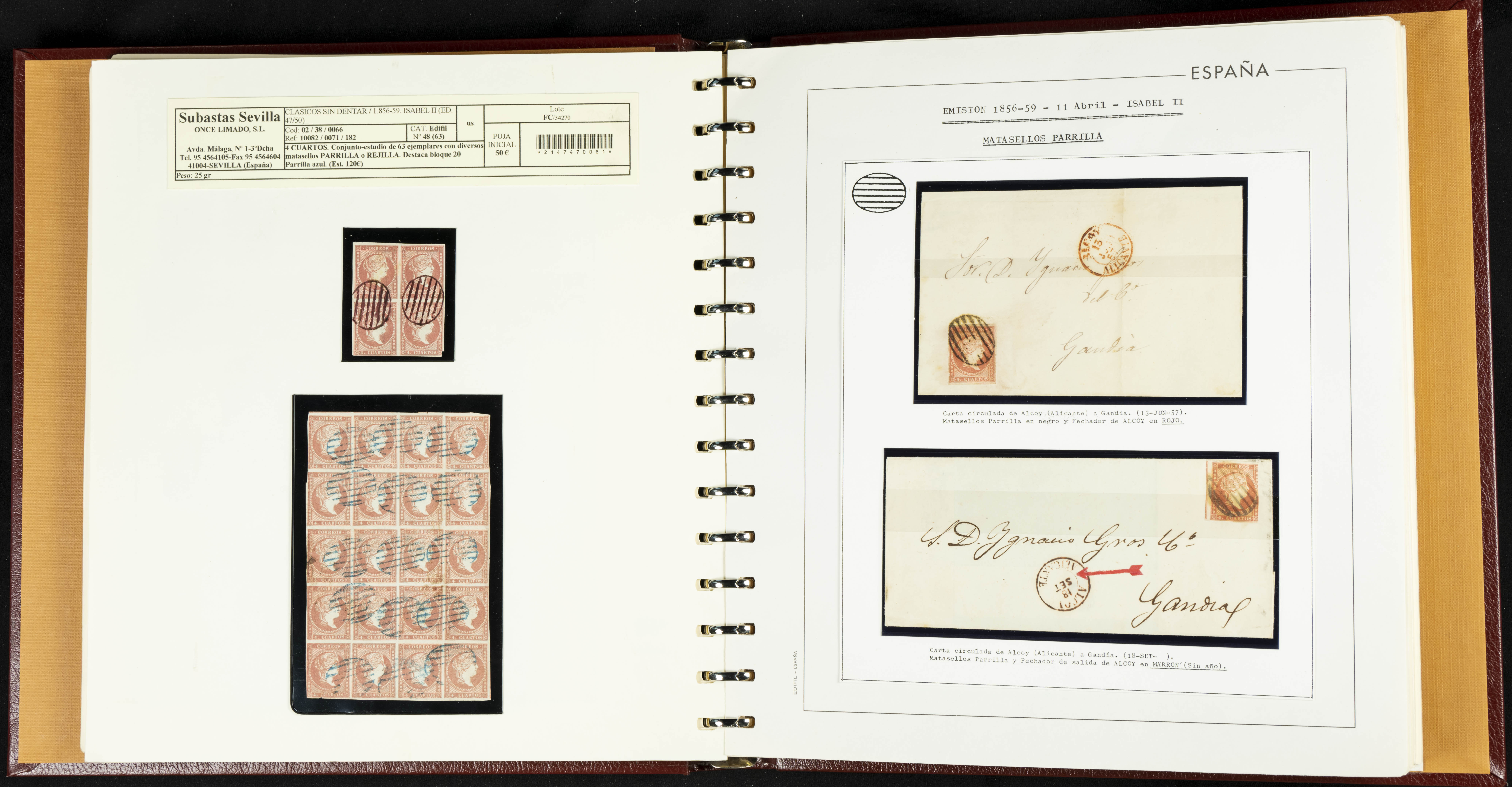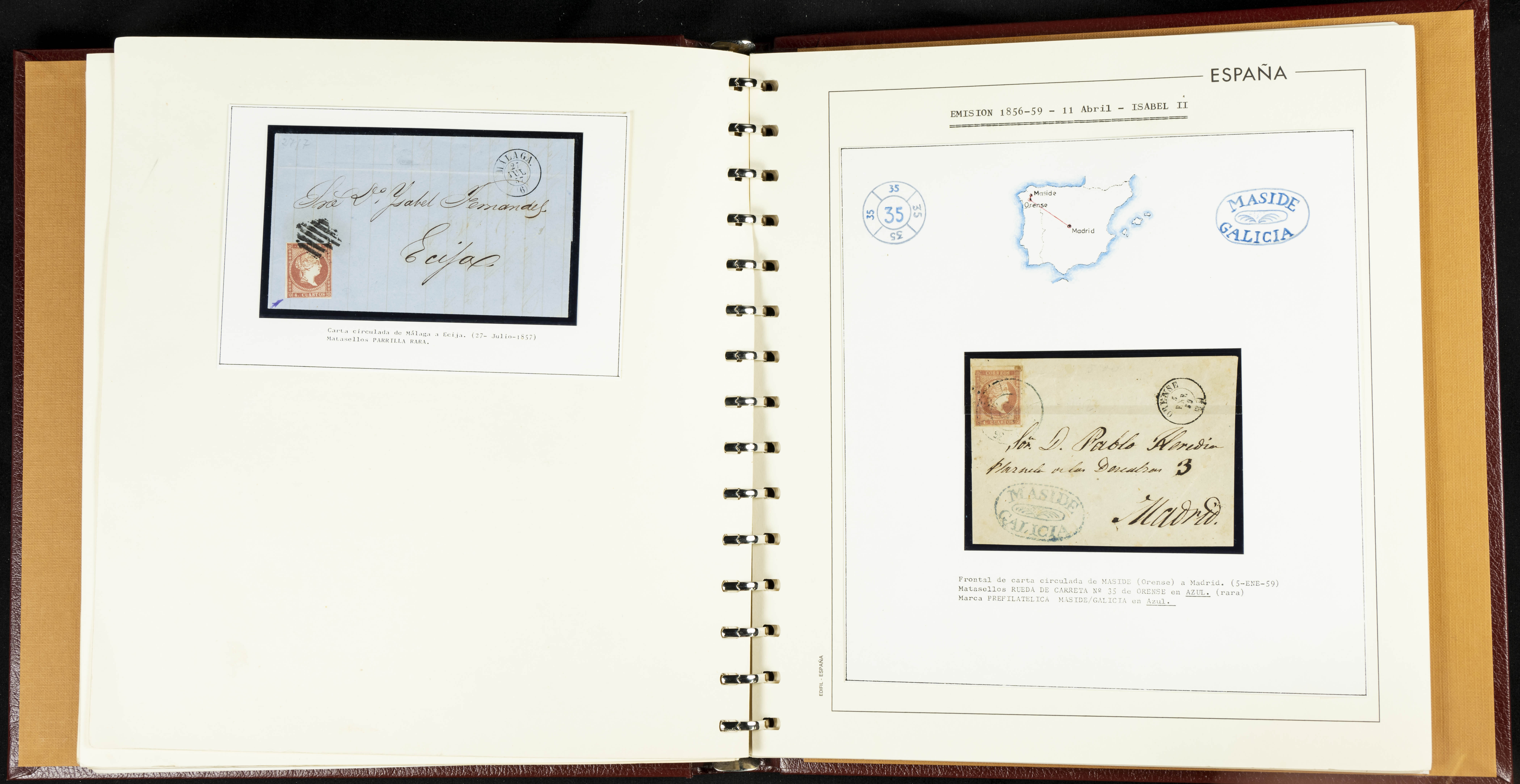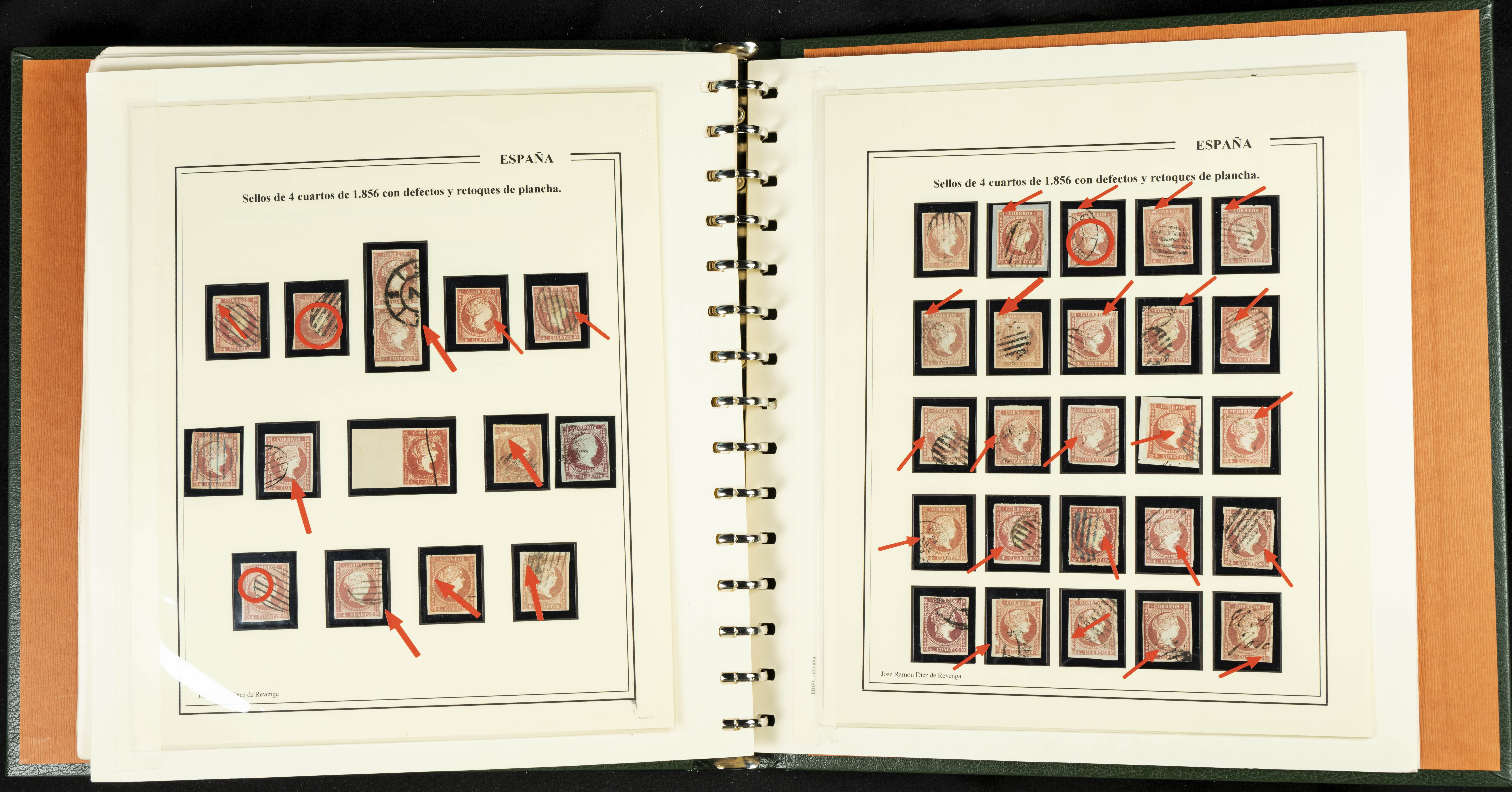 40, 44, 48. 1855. Spectacular collection/study of hundreds of 4 cuartos red stamps (three issues) from 1855, including numerous letters, some with pre-philatelic markings on the front, various multiples, cliché varieties, etc., most canceled with GRILL postmarks (first printings), date stamps (organized by Province), Wagon Wheels (organized by number), and some pre-philatelic postmarks. ESSENTIAL TO EXAMINE.