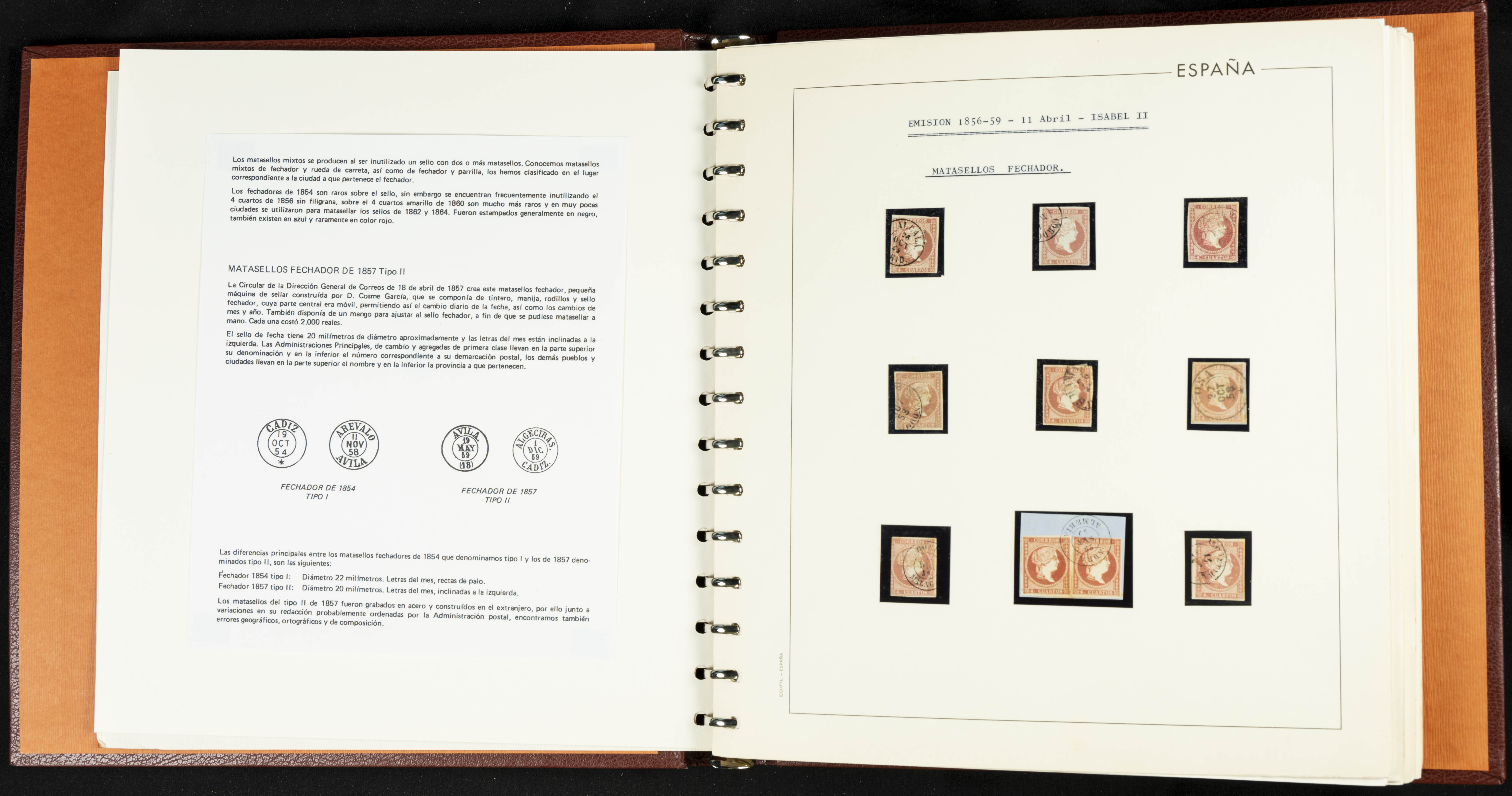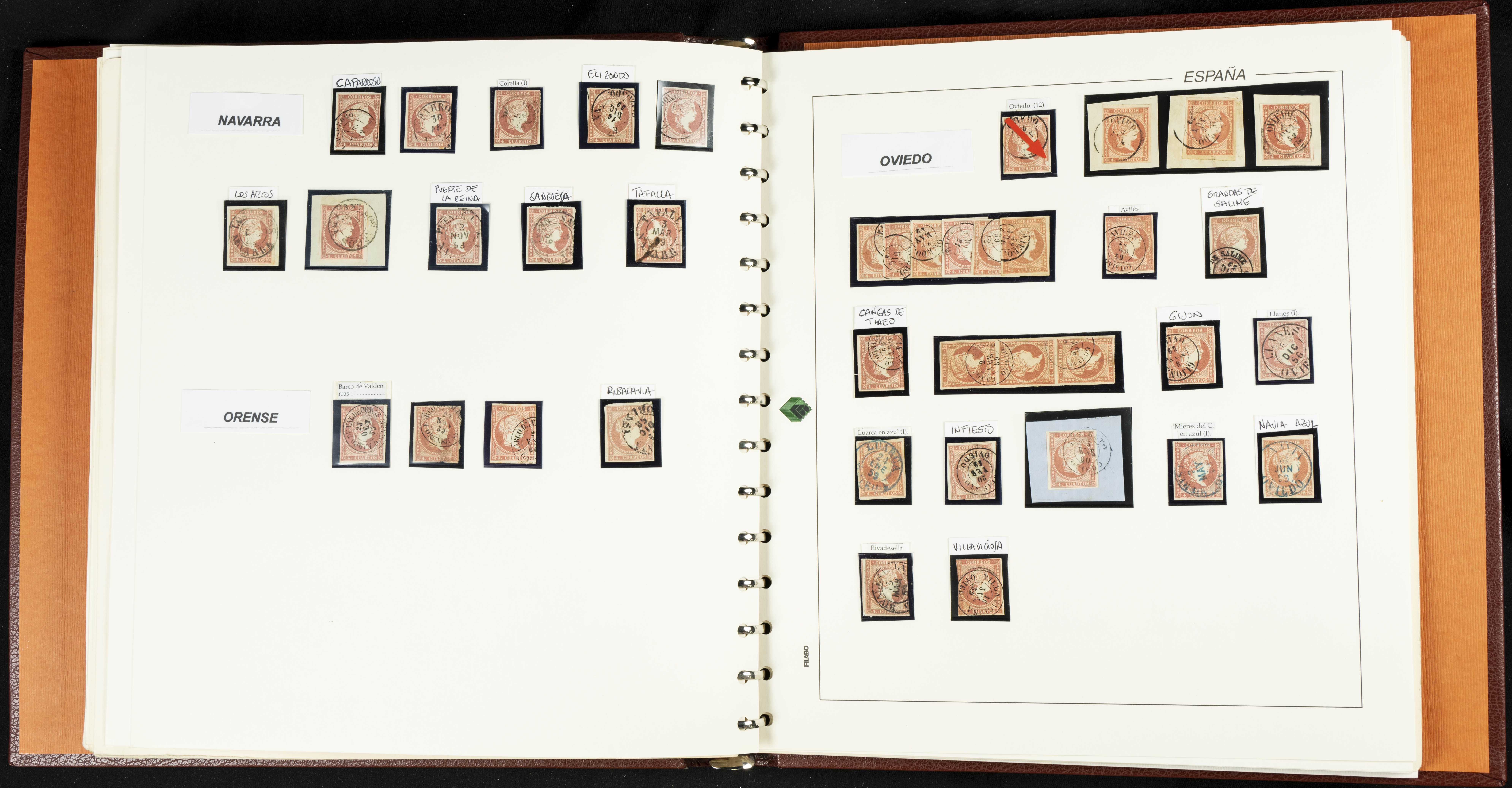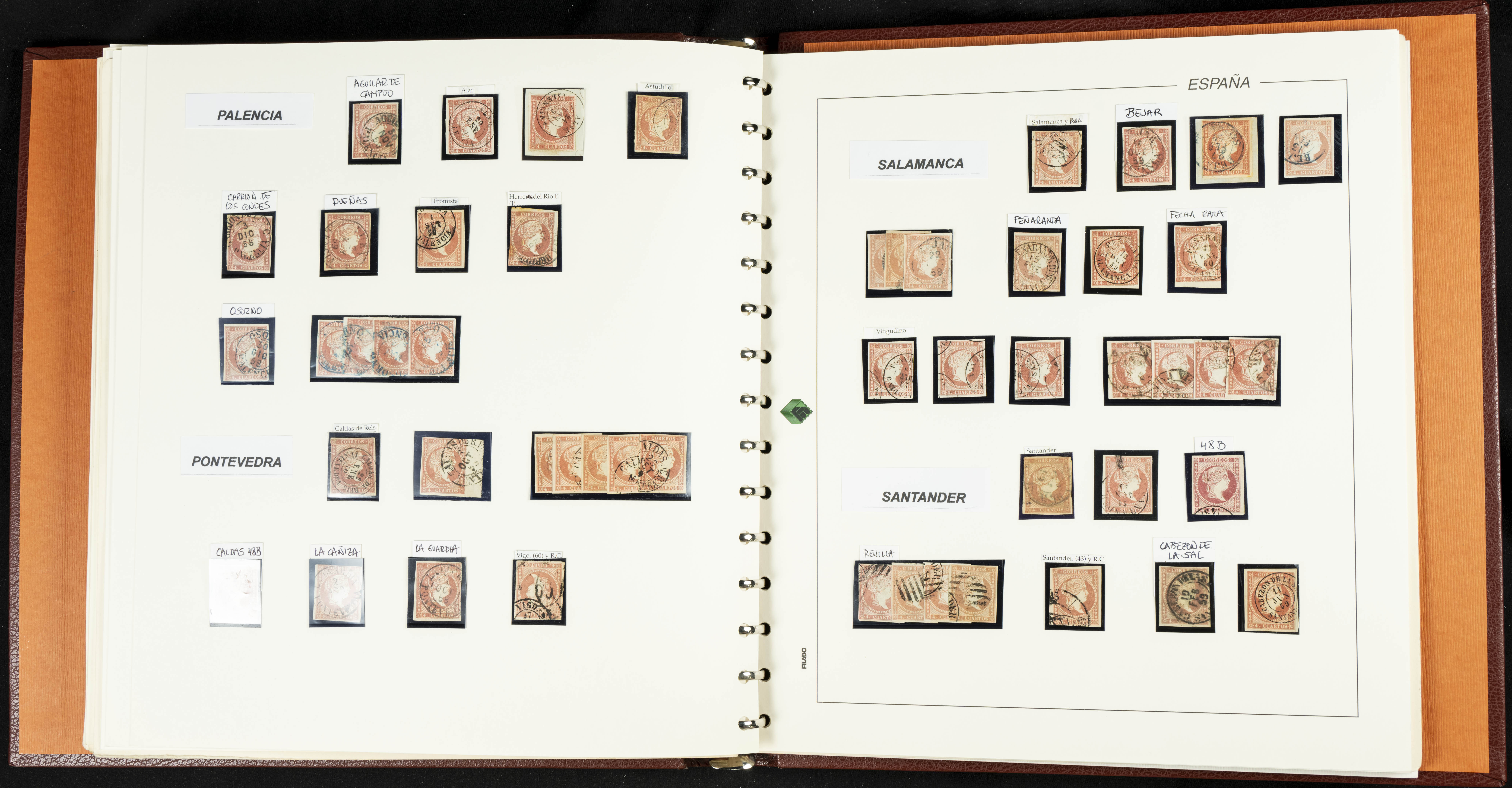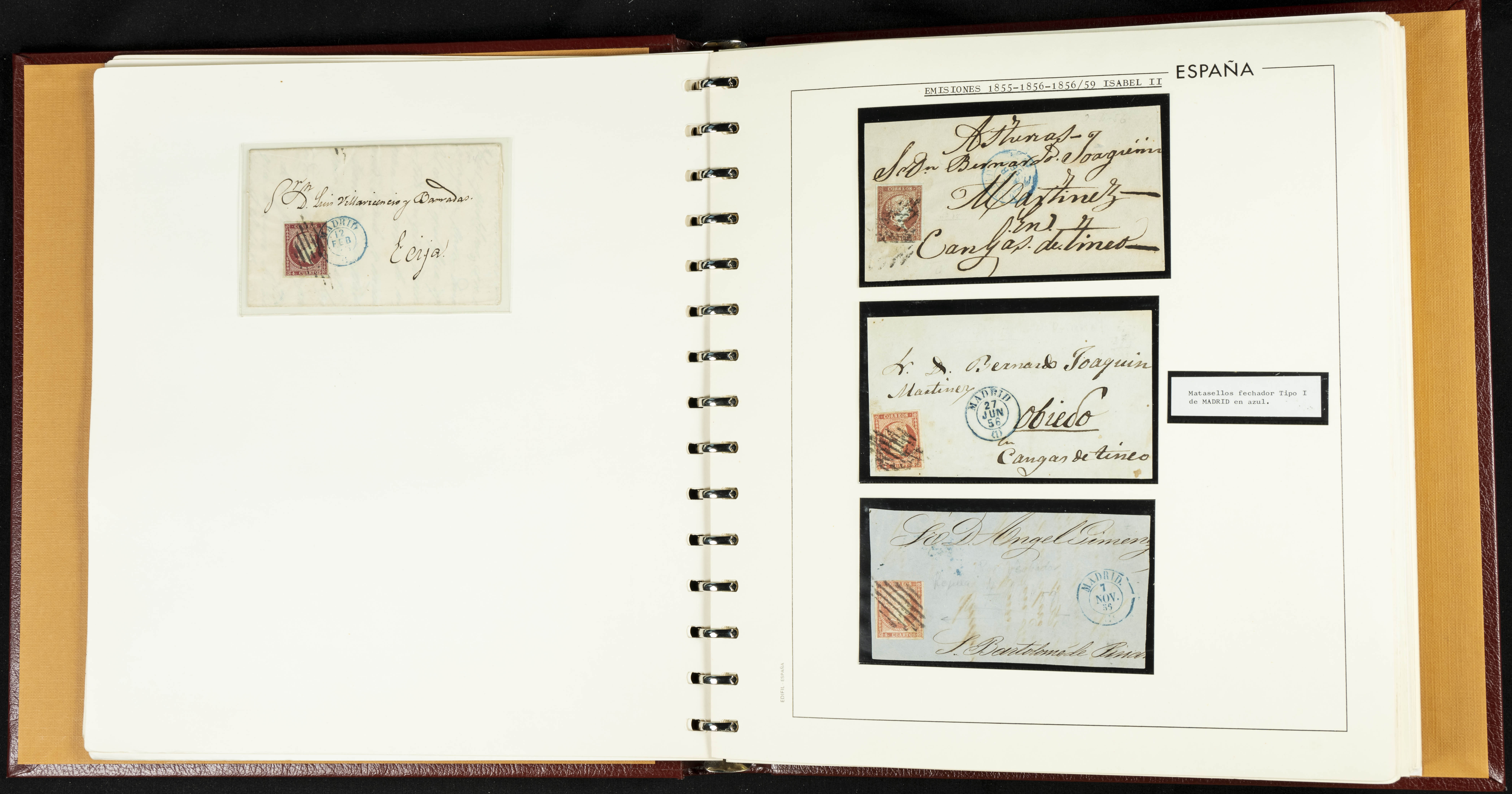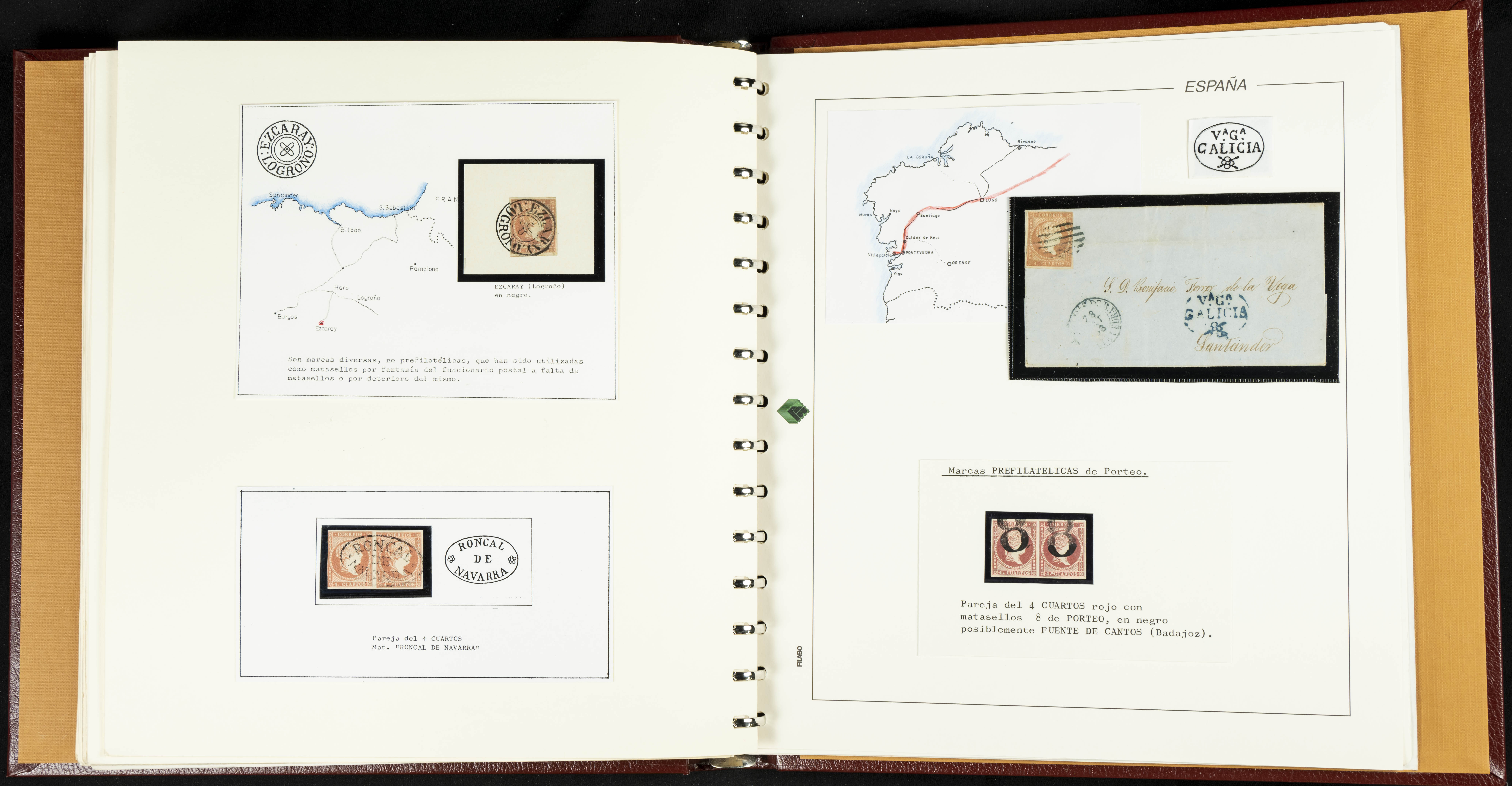 40, 44, 48. 1855. Spectacular collection/study of hundreds of 4 cuartos red stamps (three issues) from 1855, including numerous letters, some with pre-philatelic markings on the front, various multiples, cliché varieties, etc., most canceled with GRILL postmarks (first printings), date stamps (organized by Province), Wagon Wheels (organized by number), and some pre-philatelic postmarks. ESSENTIAL TO EXAMINE.