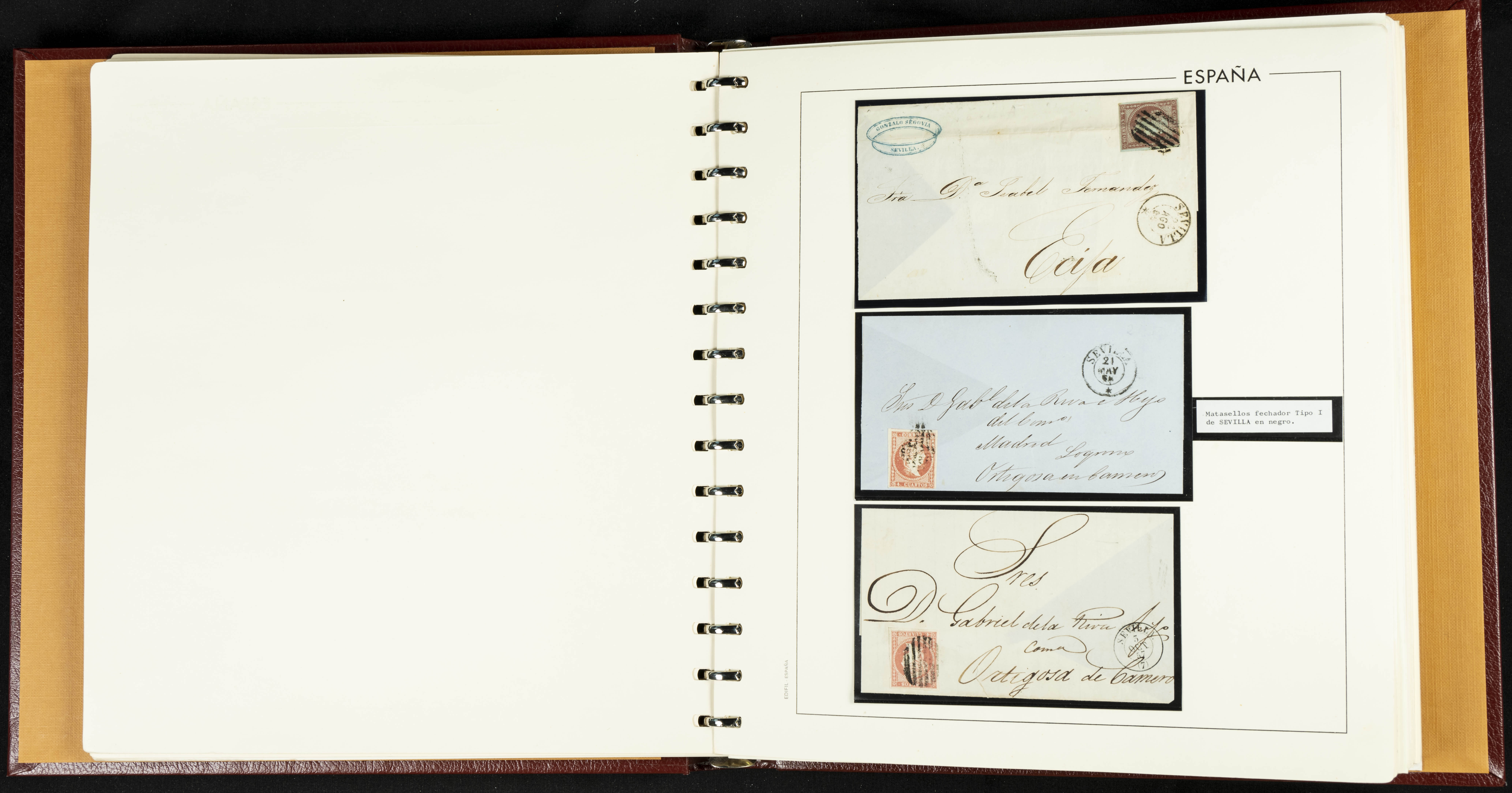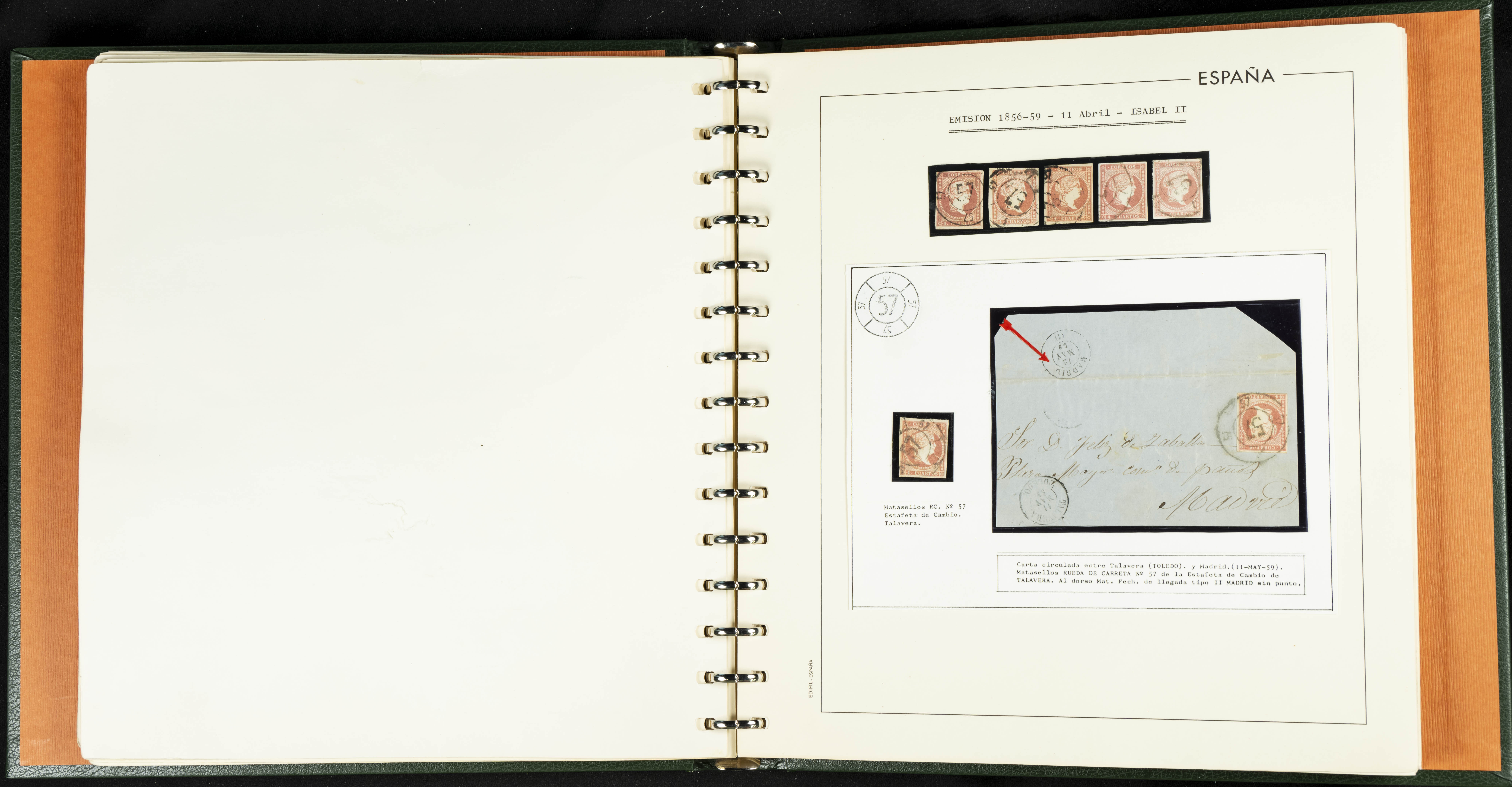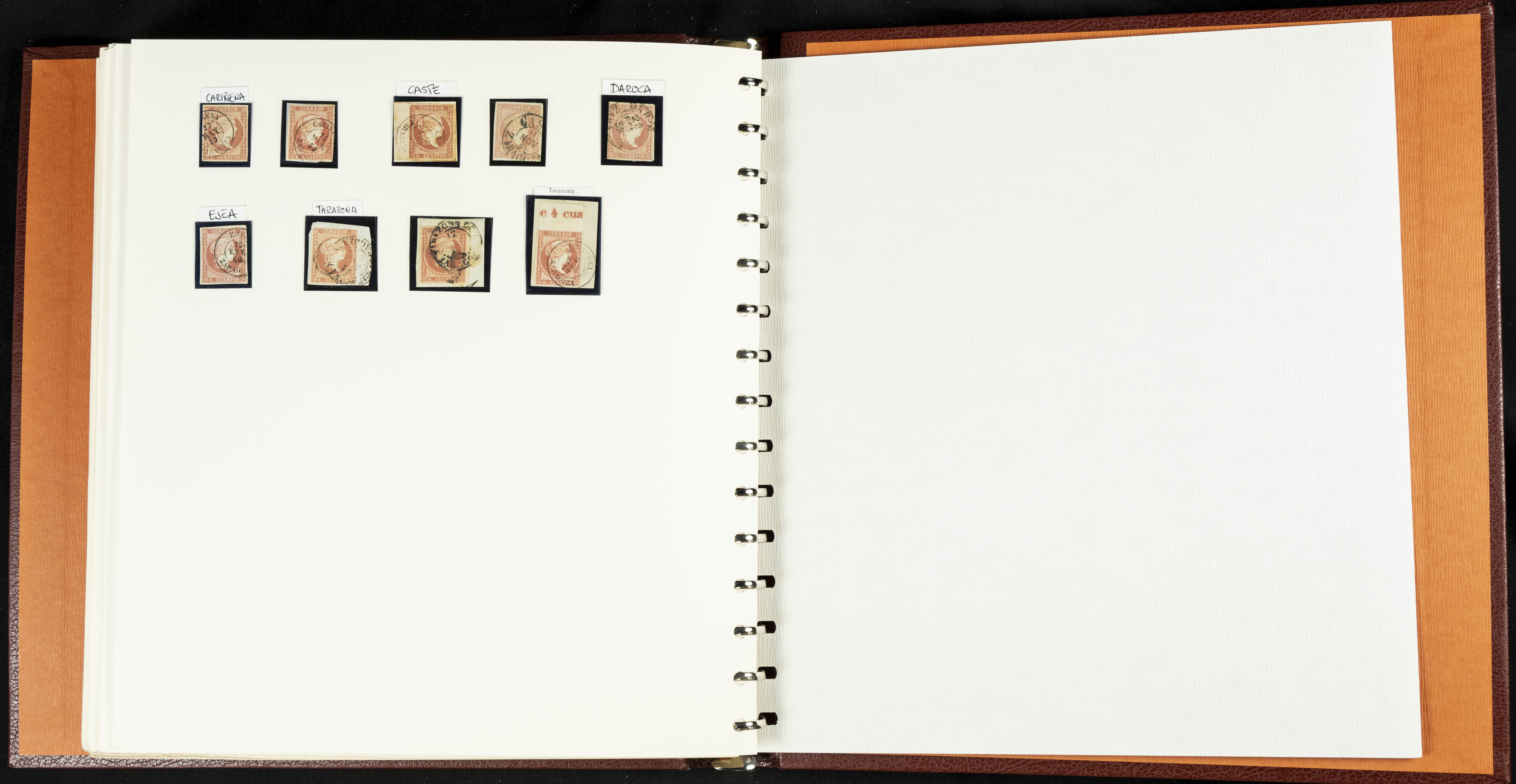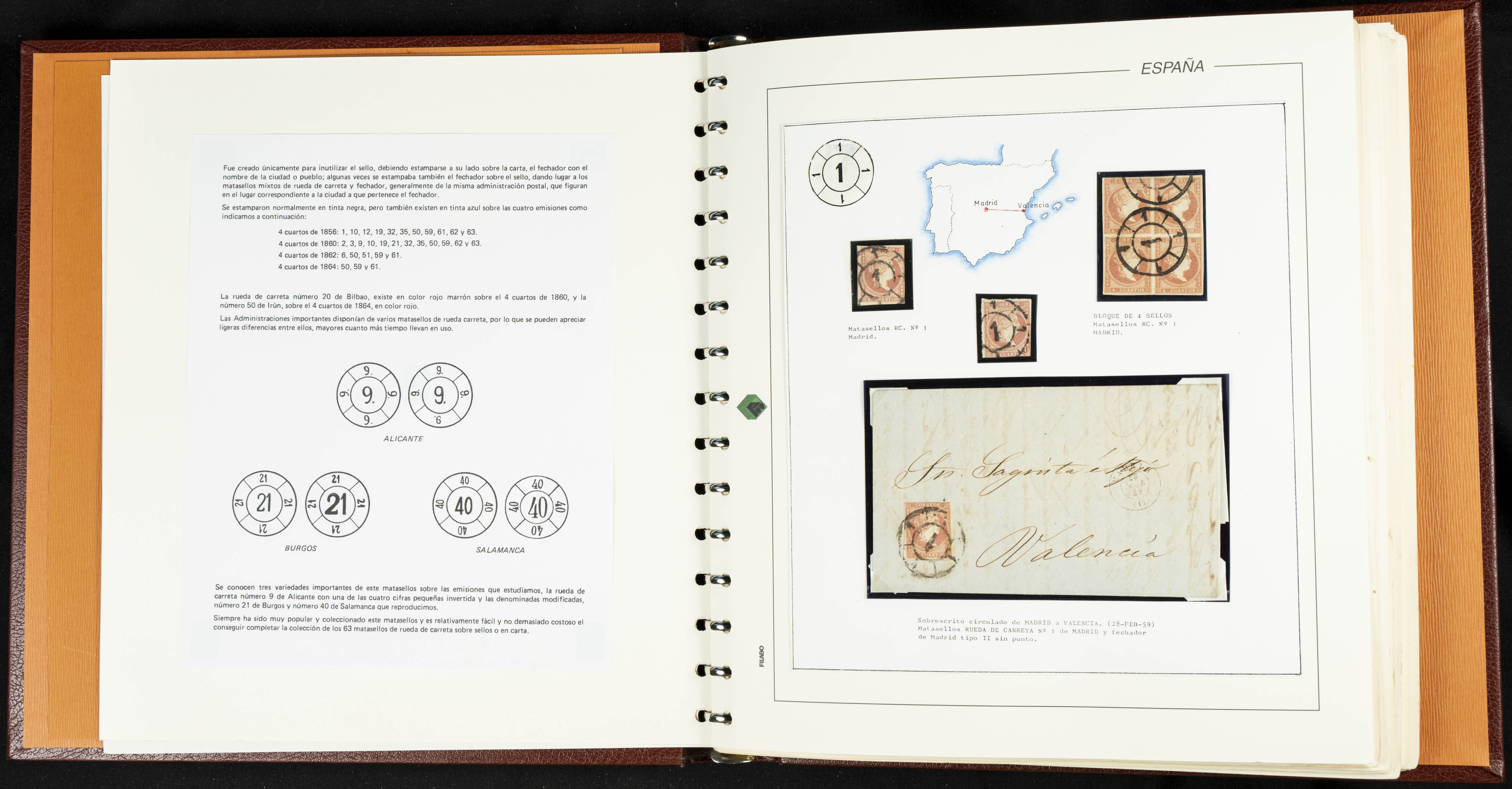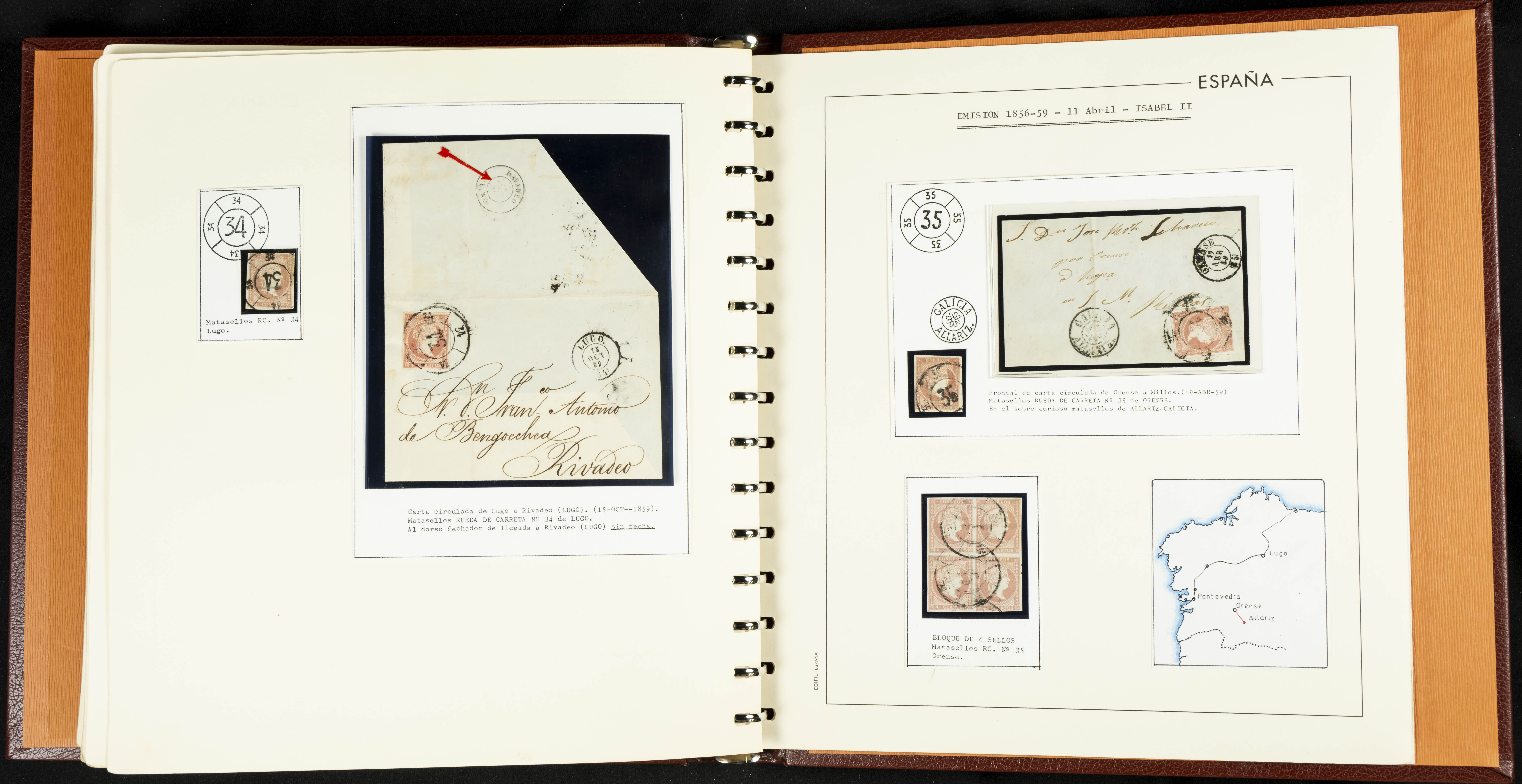 40, 44, 48. 1855. Spectacular collection/study of hundreds of 4 cuartos red stamps (three issues) from 1855, including numerous letters, some with pre-philatelic markings on the front, various multiples, cliché varieties, etc., most canceled with GRILL postmarks (first printings), date stamps (organized by Province), Wagon Wheels (organized by number), and some pre-philatelic postmarks. ESSENTIAL TO EXAMINE.