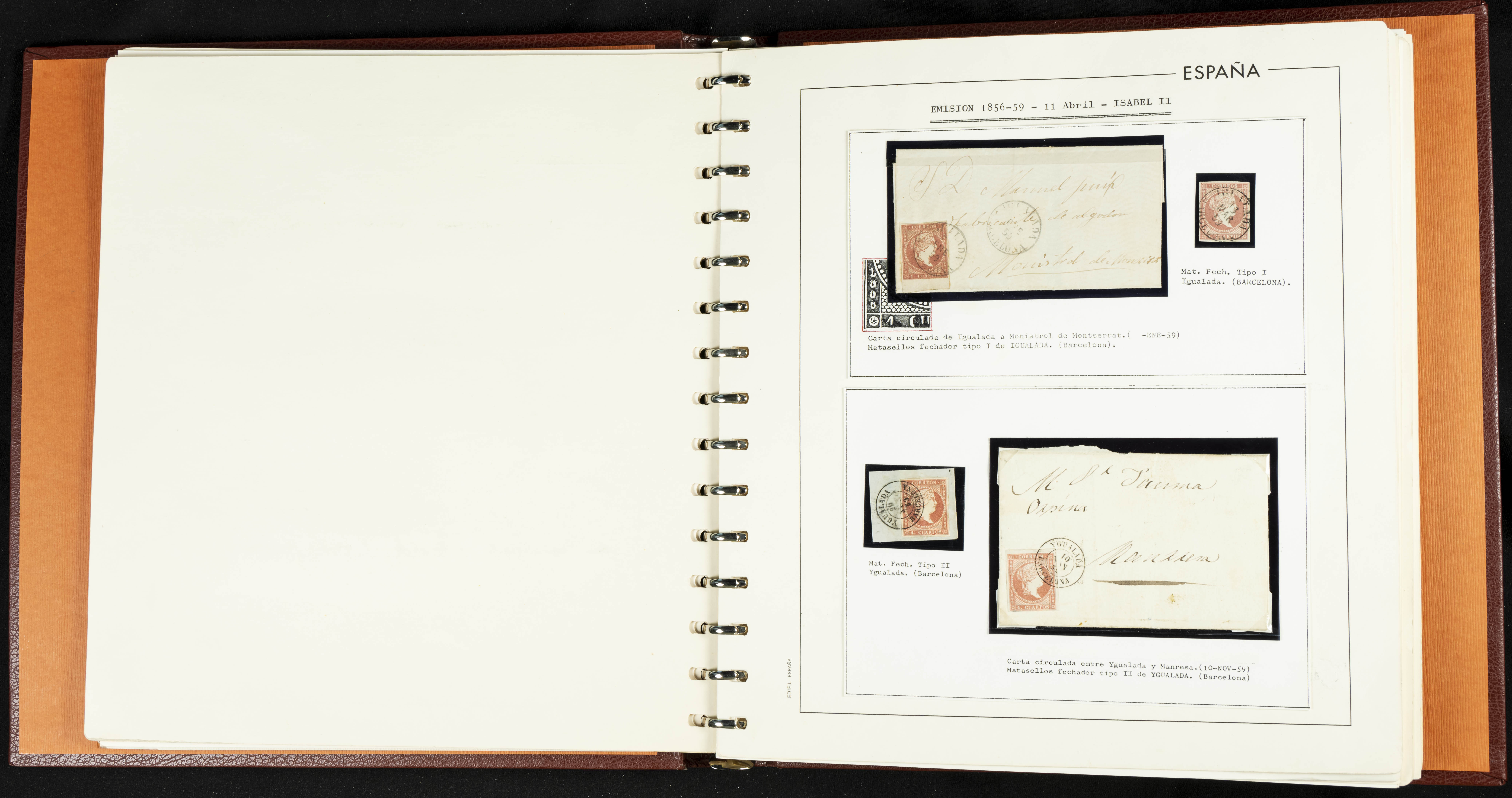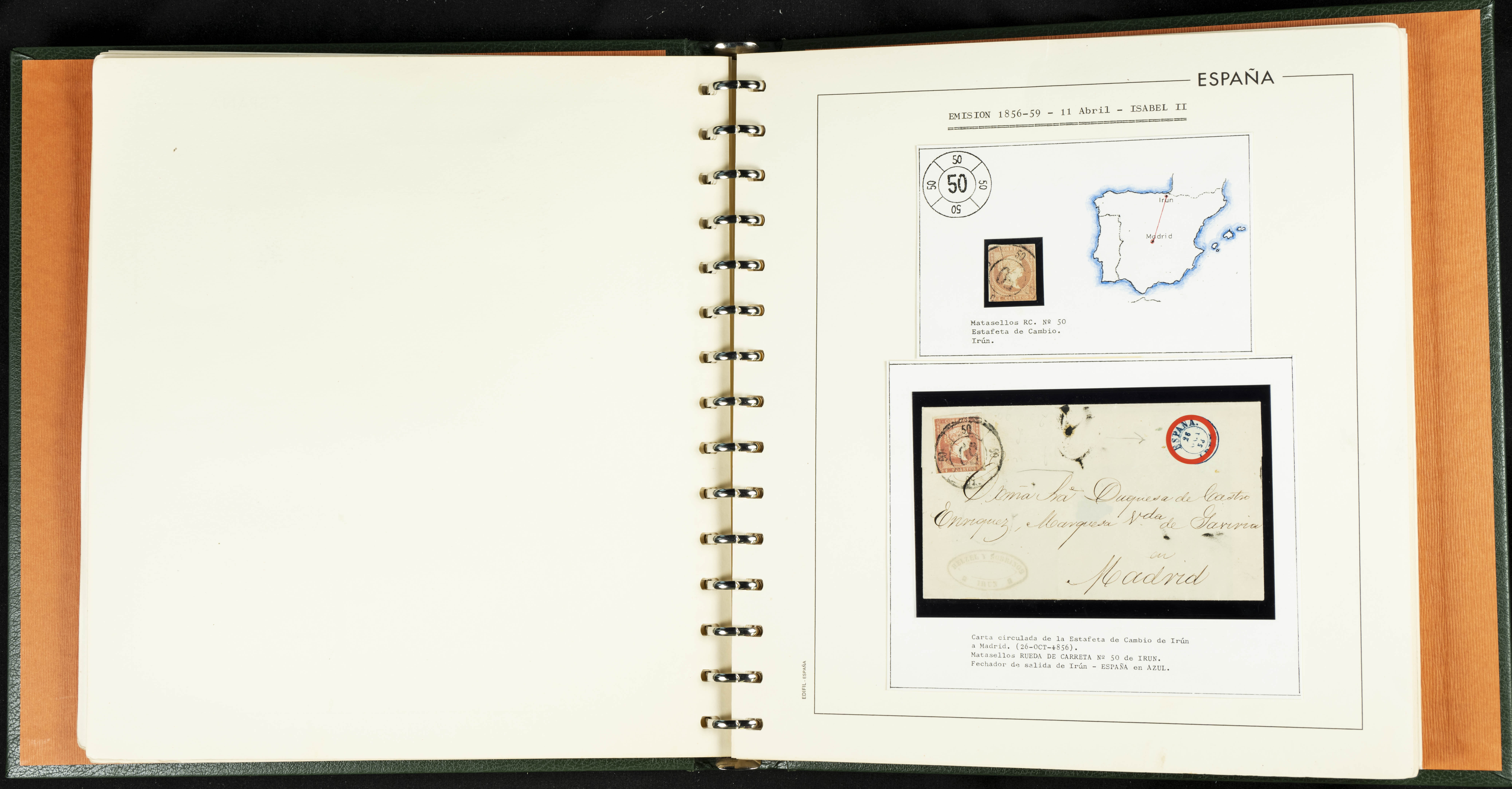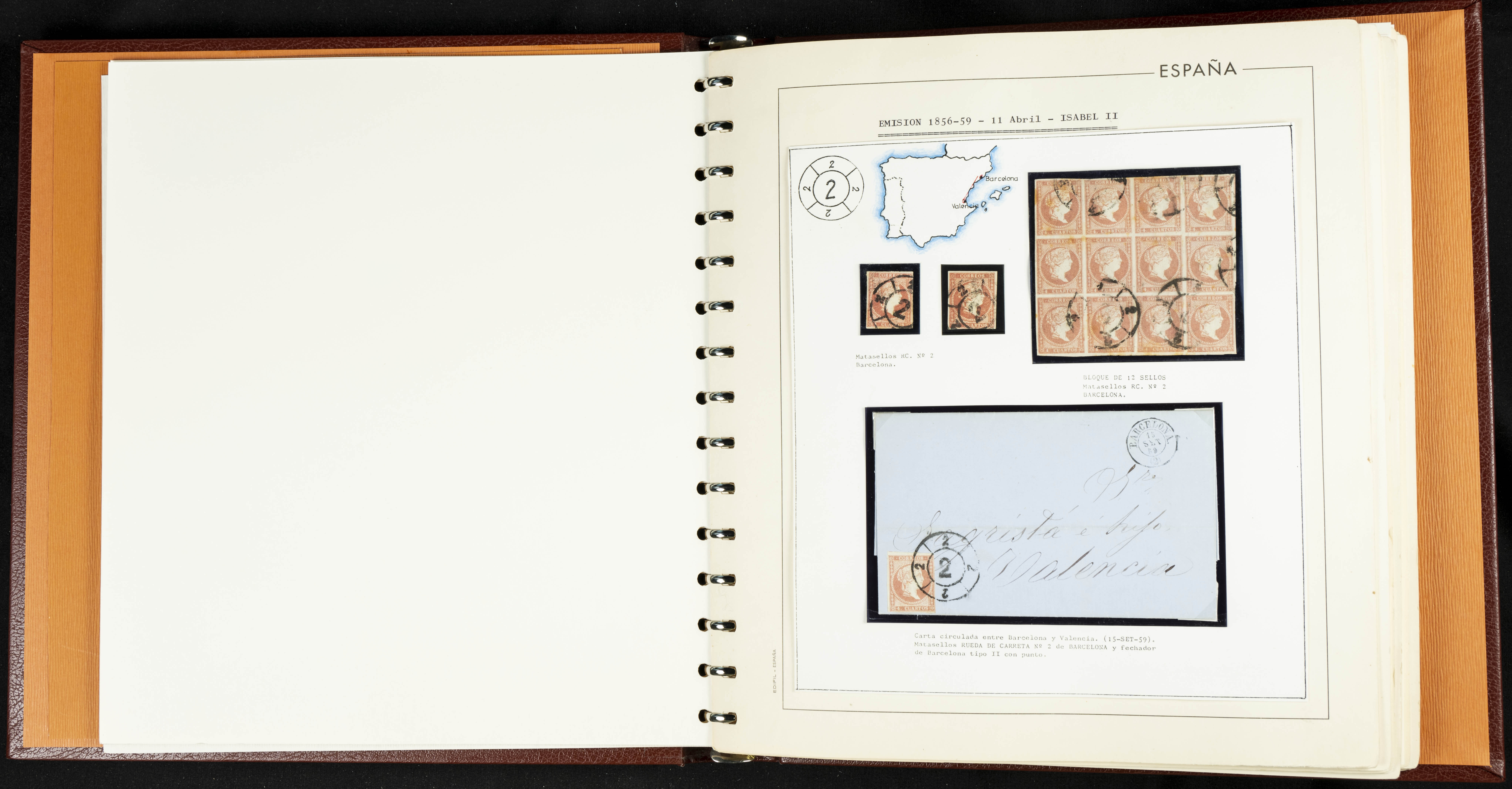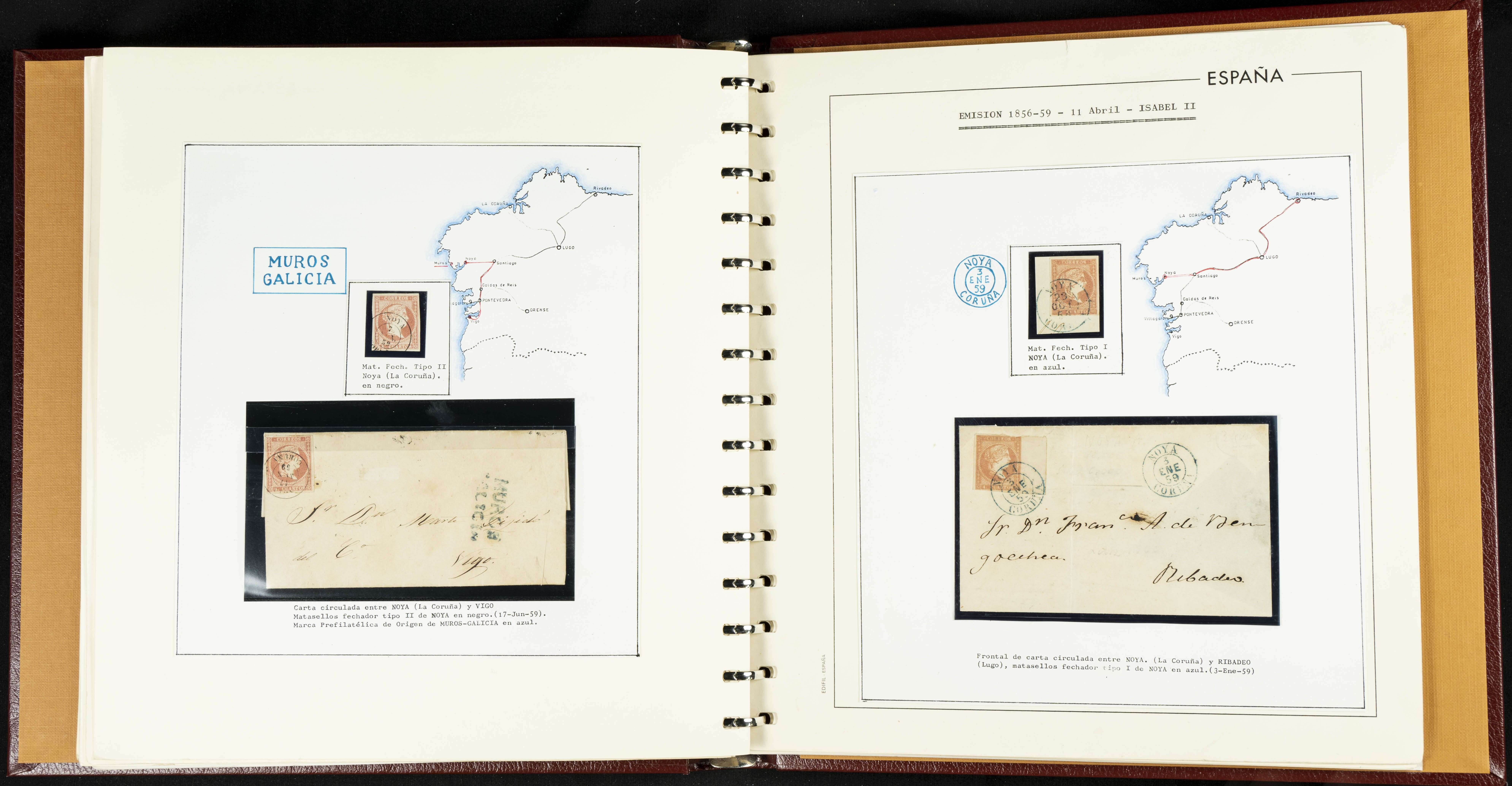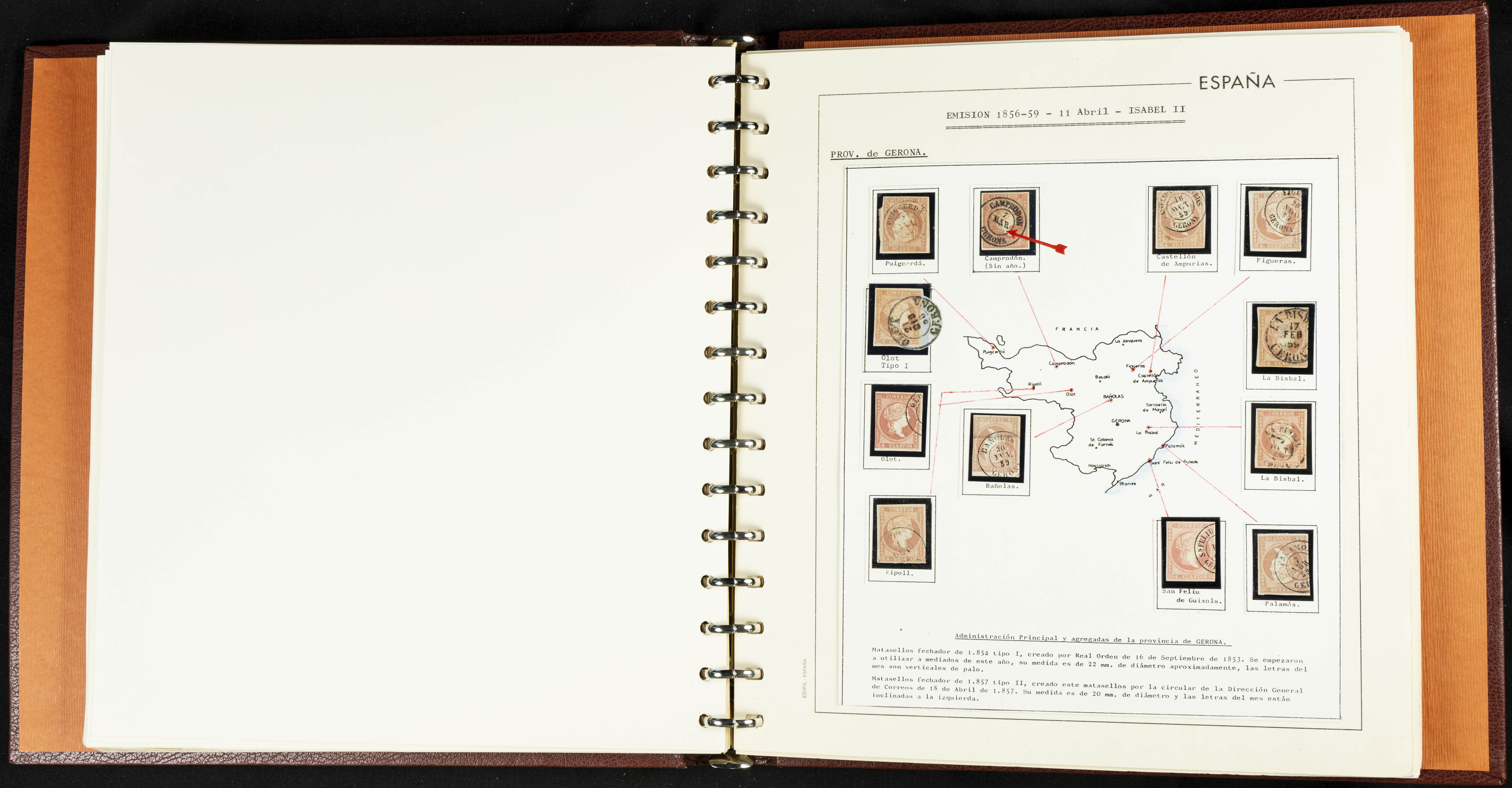 40, 44, 48. 1855. Spectacular collection/study of hundreds of 4 cuartos red stamps (three issues) from 1855, including numerous letters, some with pre-philatelic markings on the front, various multiples, cliché varieties, etc., most canceled with GRILL postmarks (first printings), date stamps (organized by Province), Wagon Wheels (organized by number), and some pre-philatelic postmarks. ESSENTIAL TO EXAMINE.