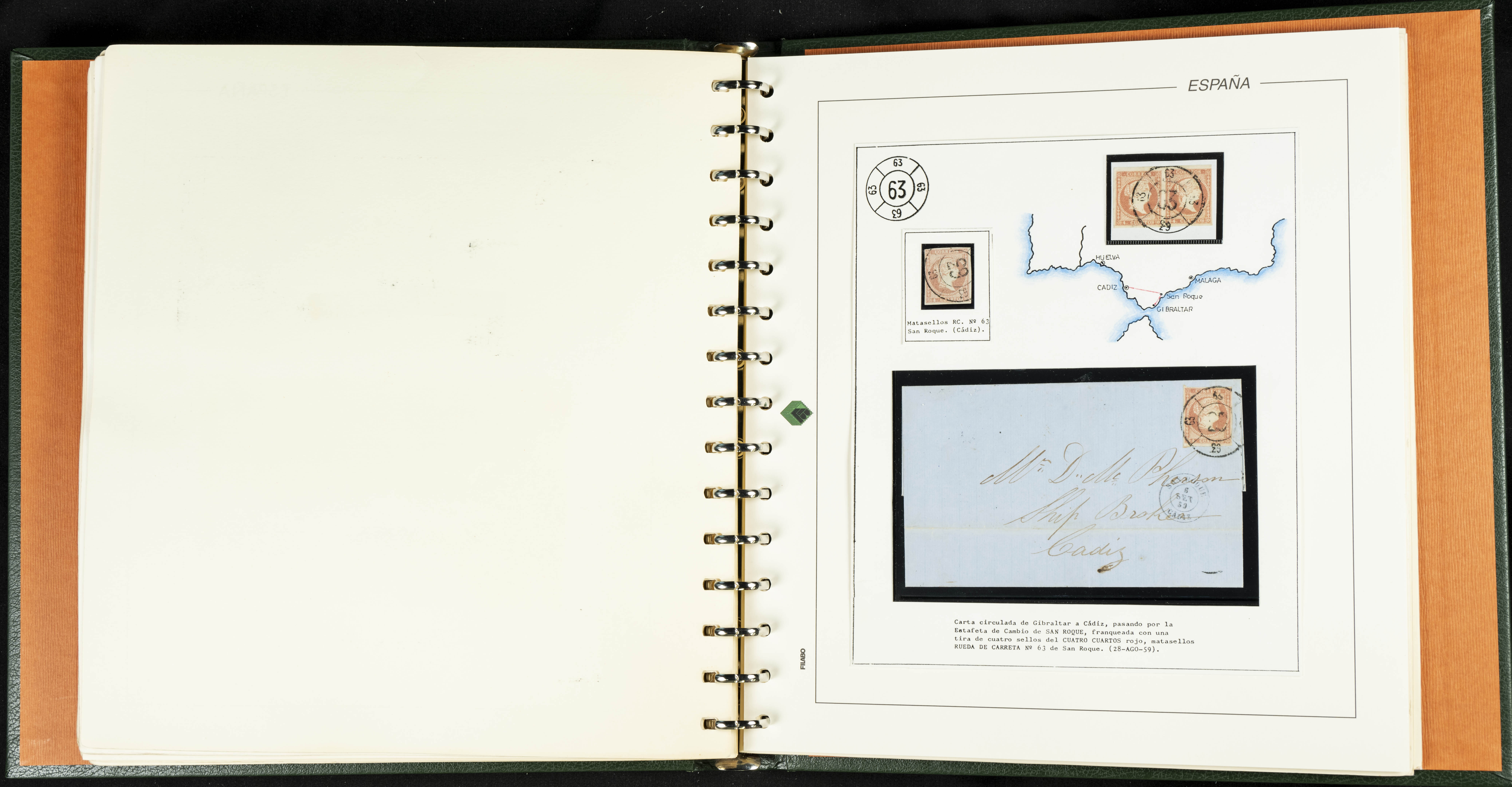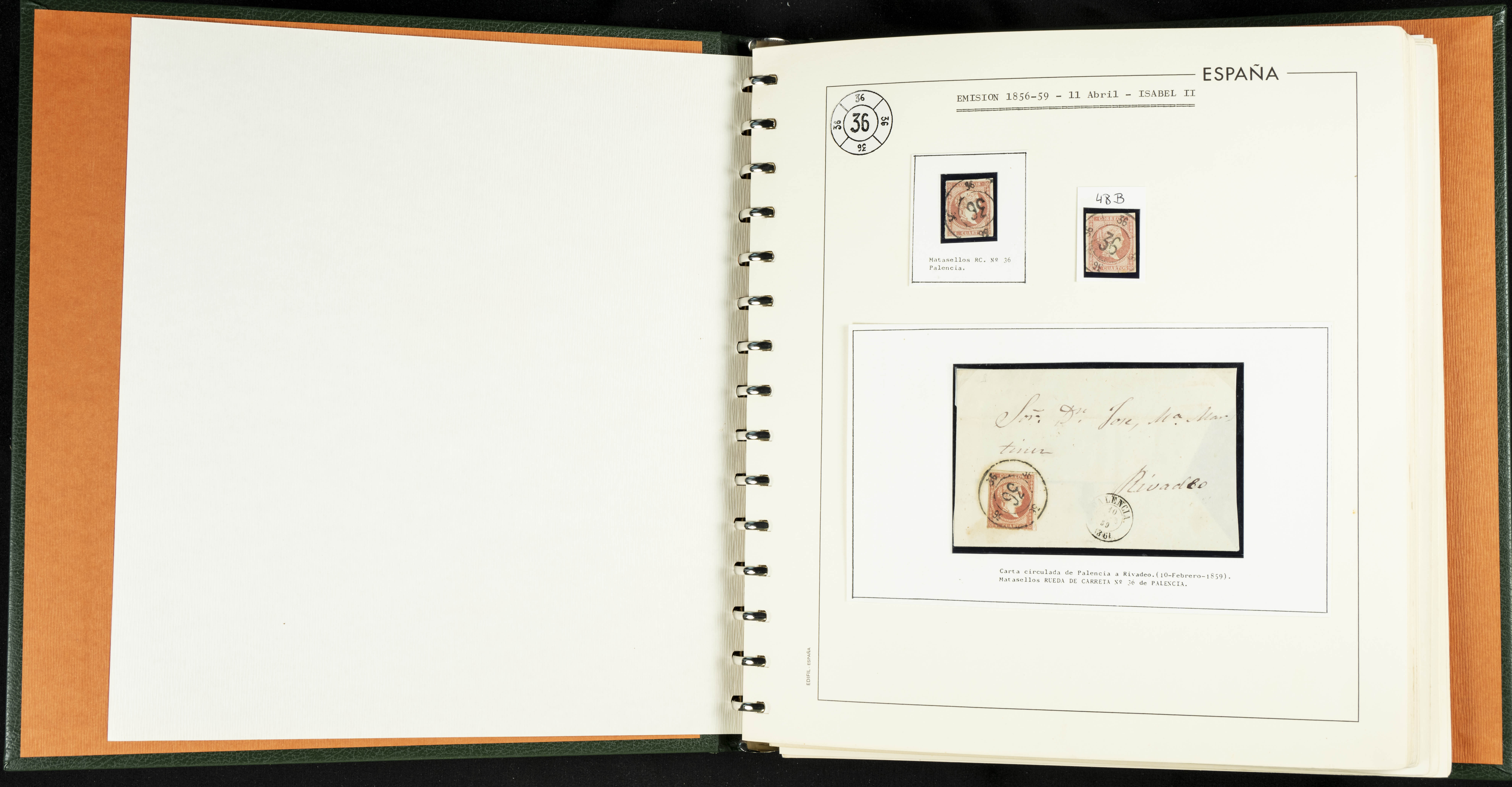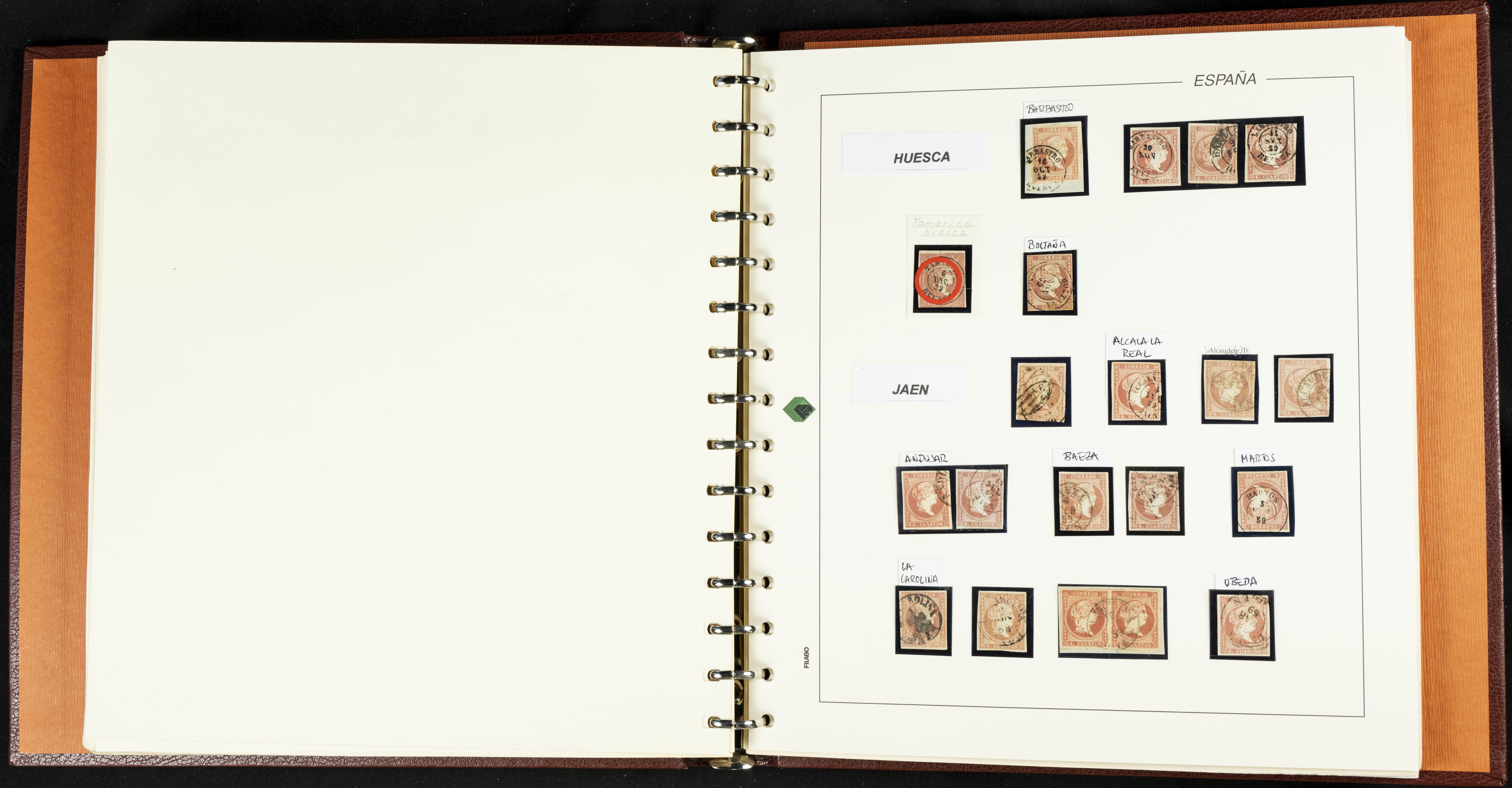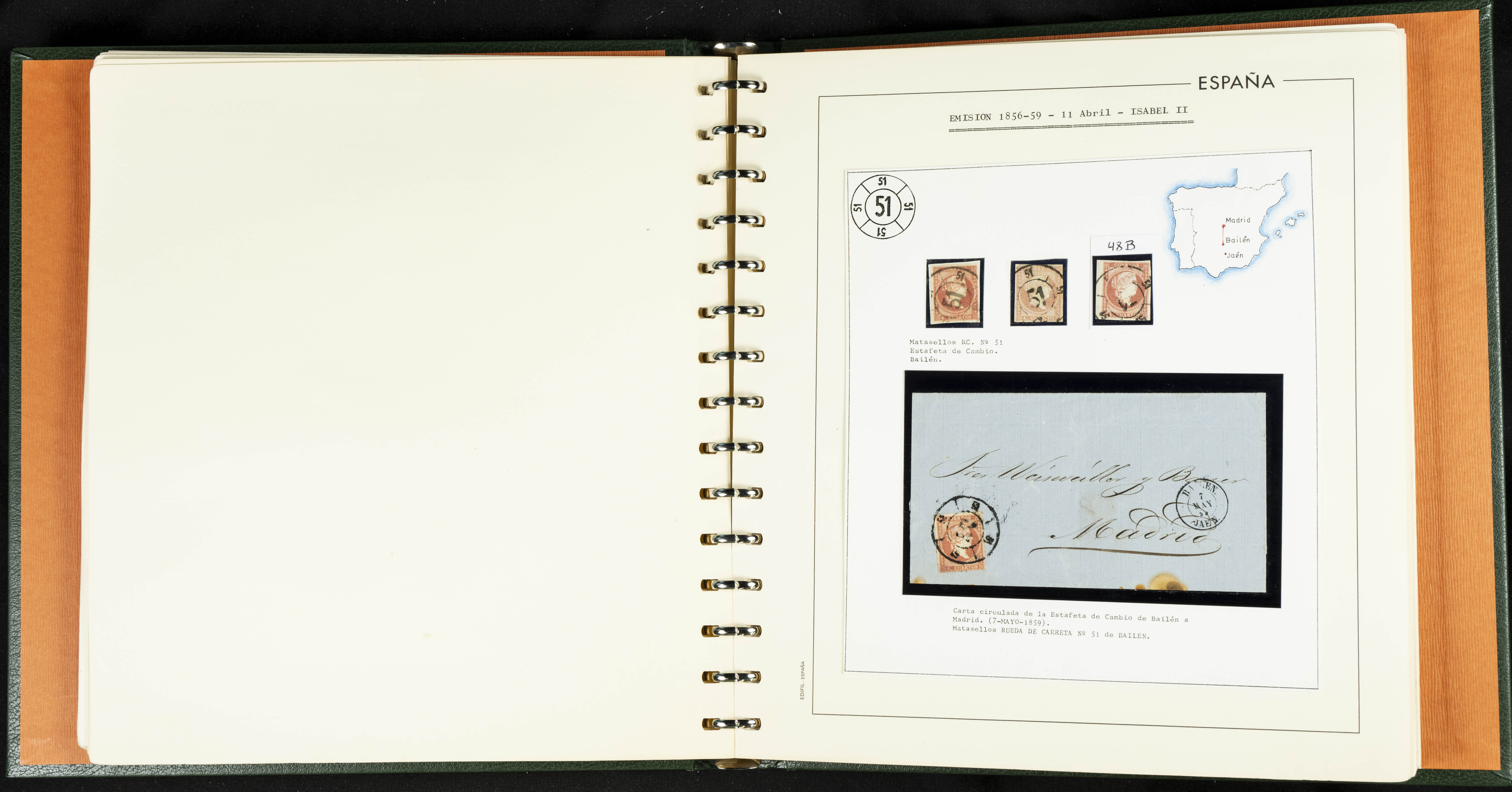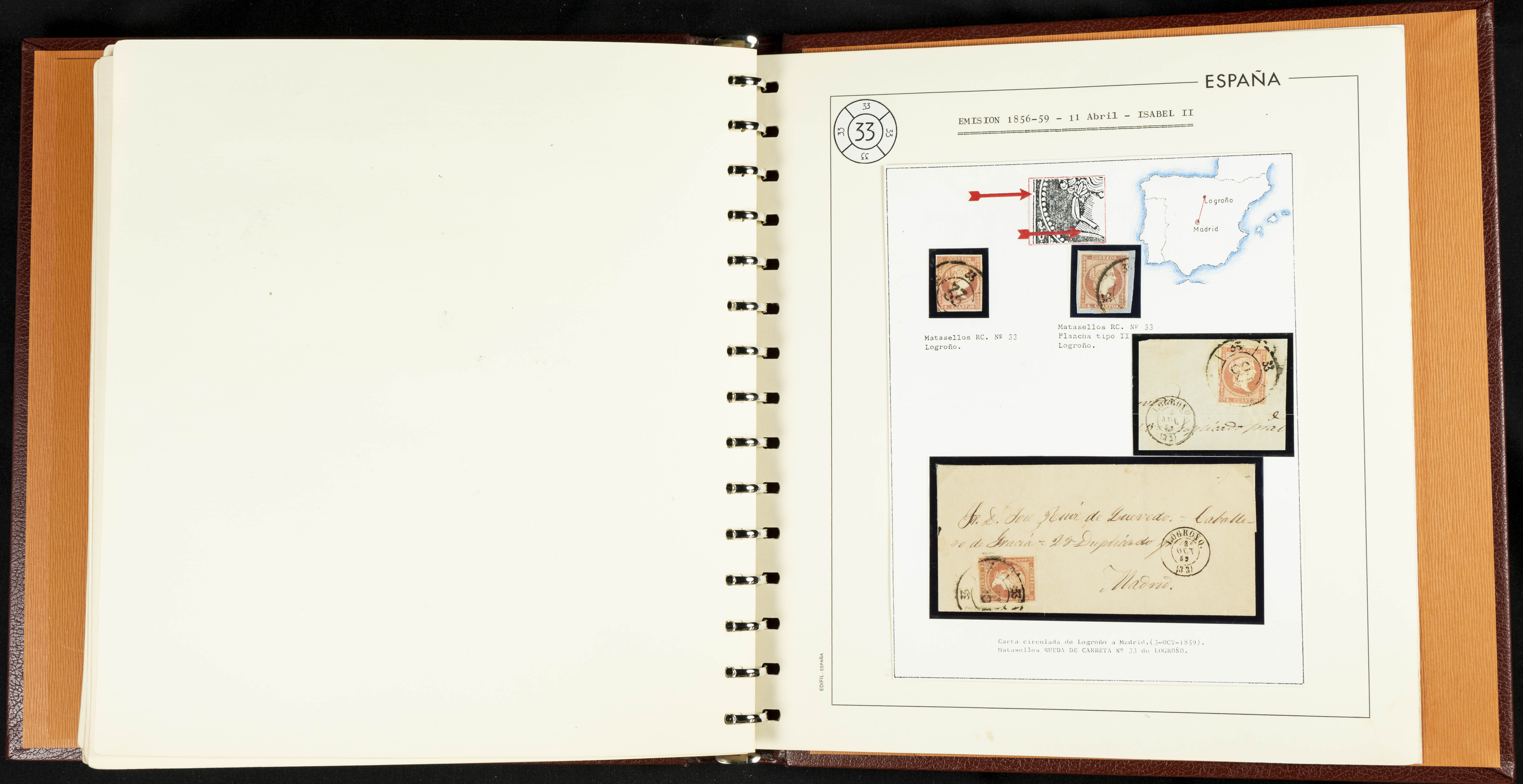 40, 44, 48. 1855. Spectacular collection/study of hundreds of 4 cuartos red stamps (three issues) from 1855, including numerous letters, some with pre-philatelic markings on the front, various multiples, cliché varieties, etc., most canceled with GRILL postmarks (first printings), date stamps (organized by Province), Wagon Wheels (organized by number), and some pre-philatelic postmarks. ESSENTIAL TO EXAMINE.