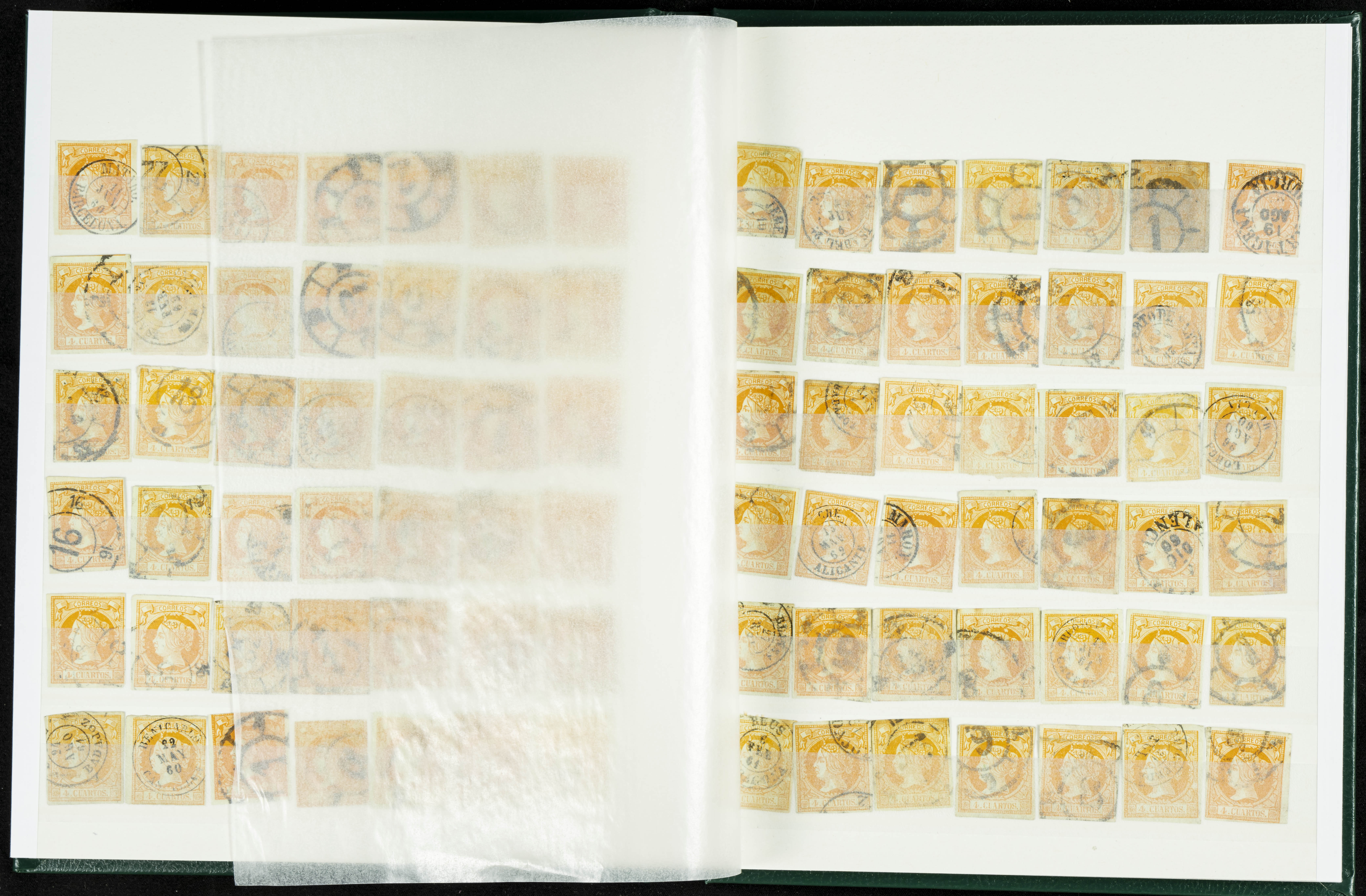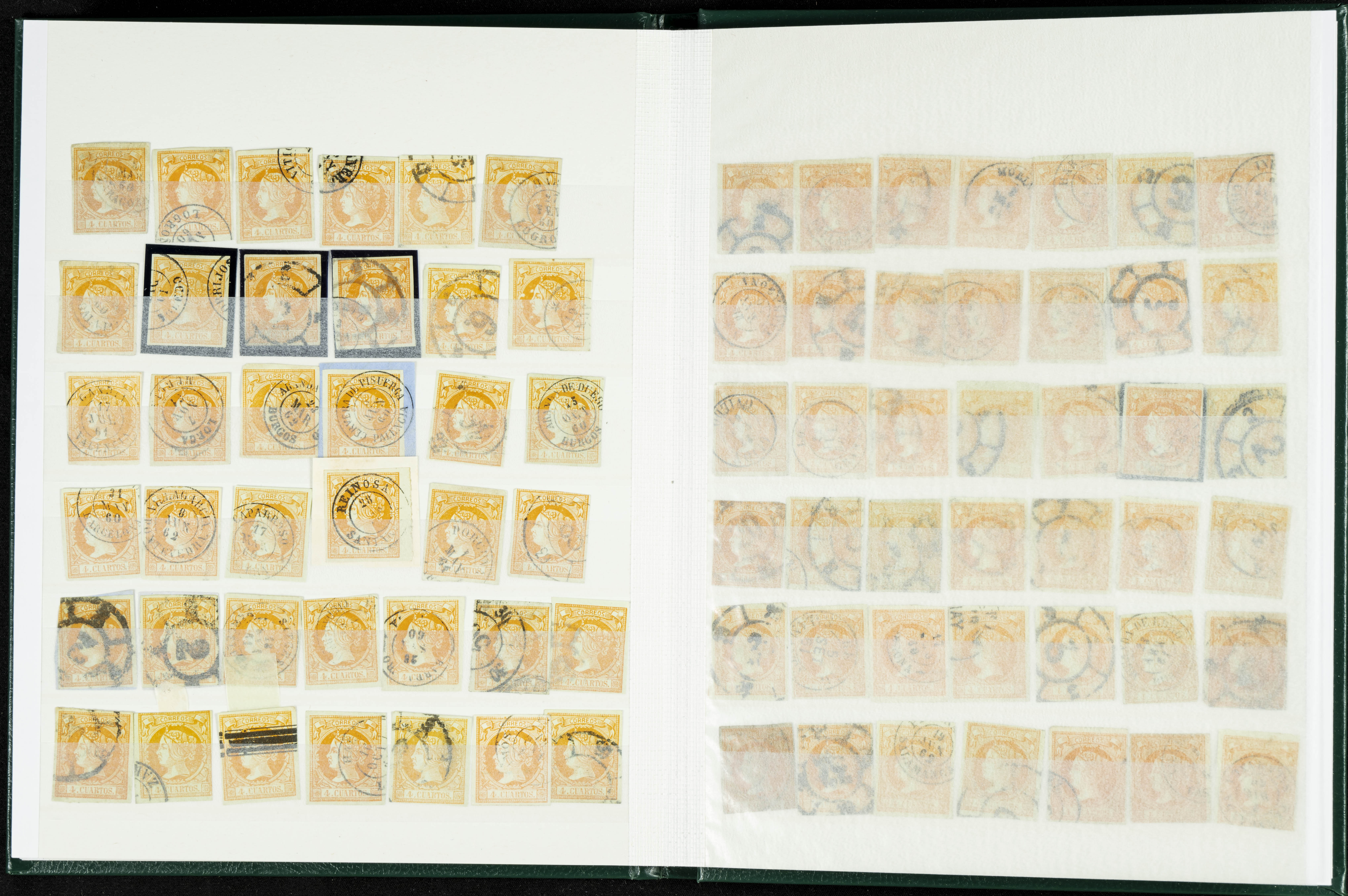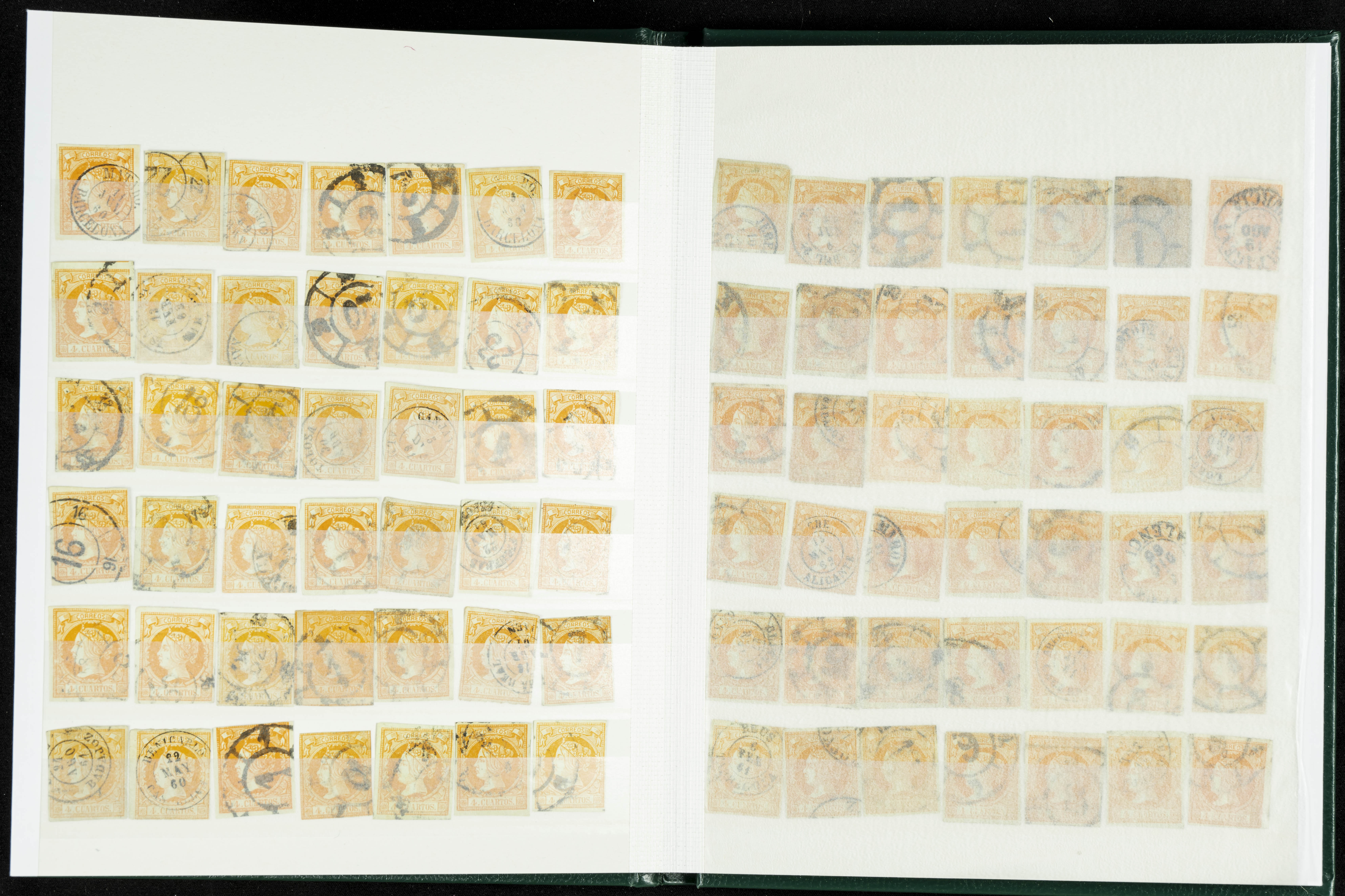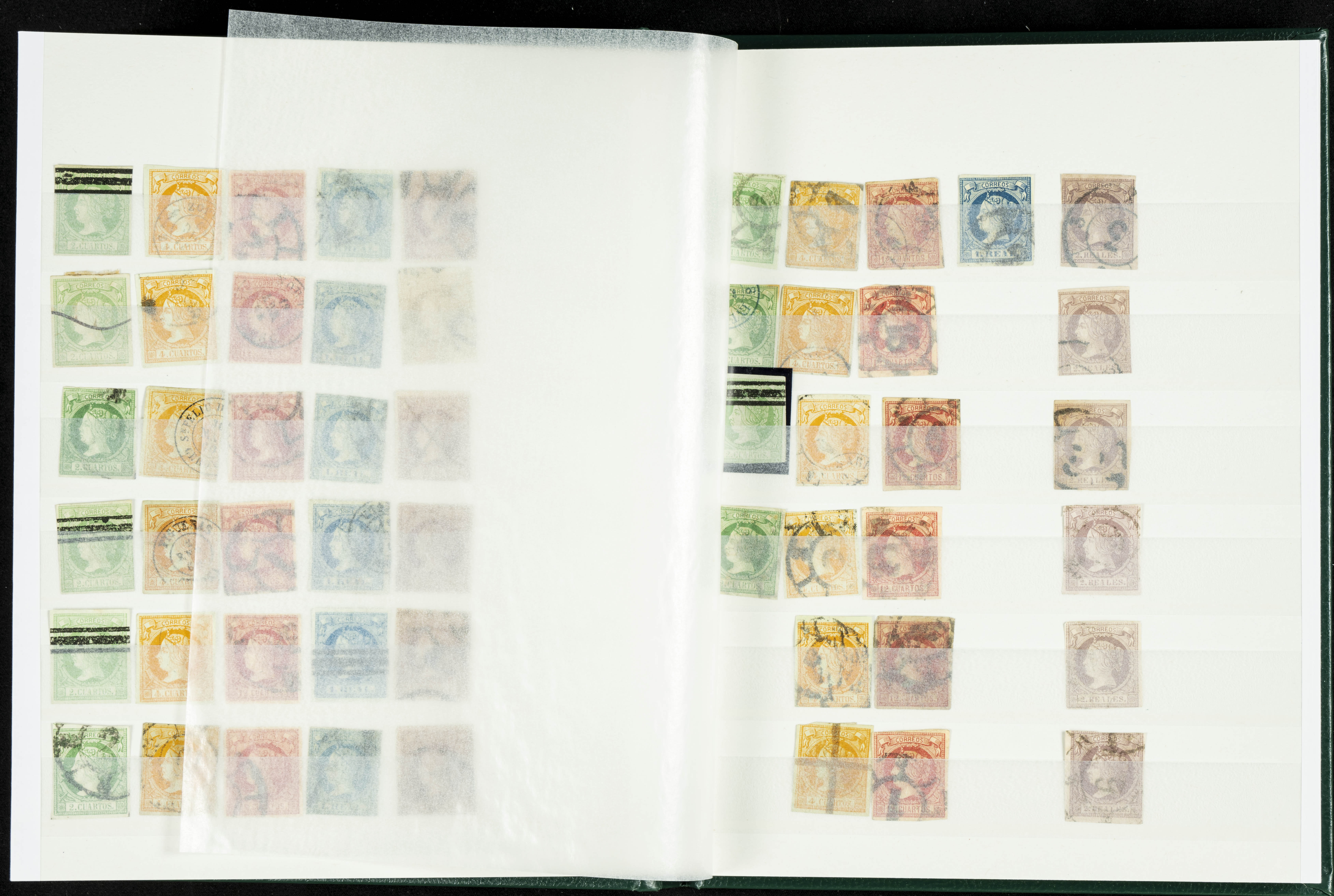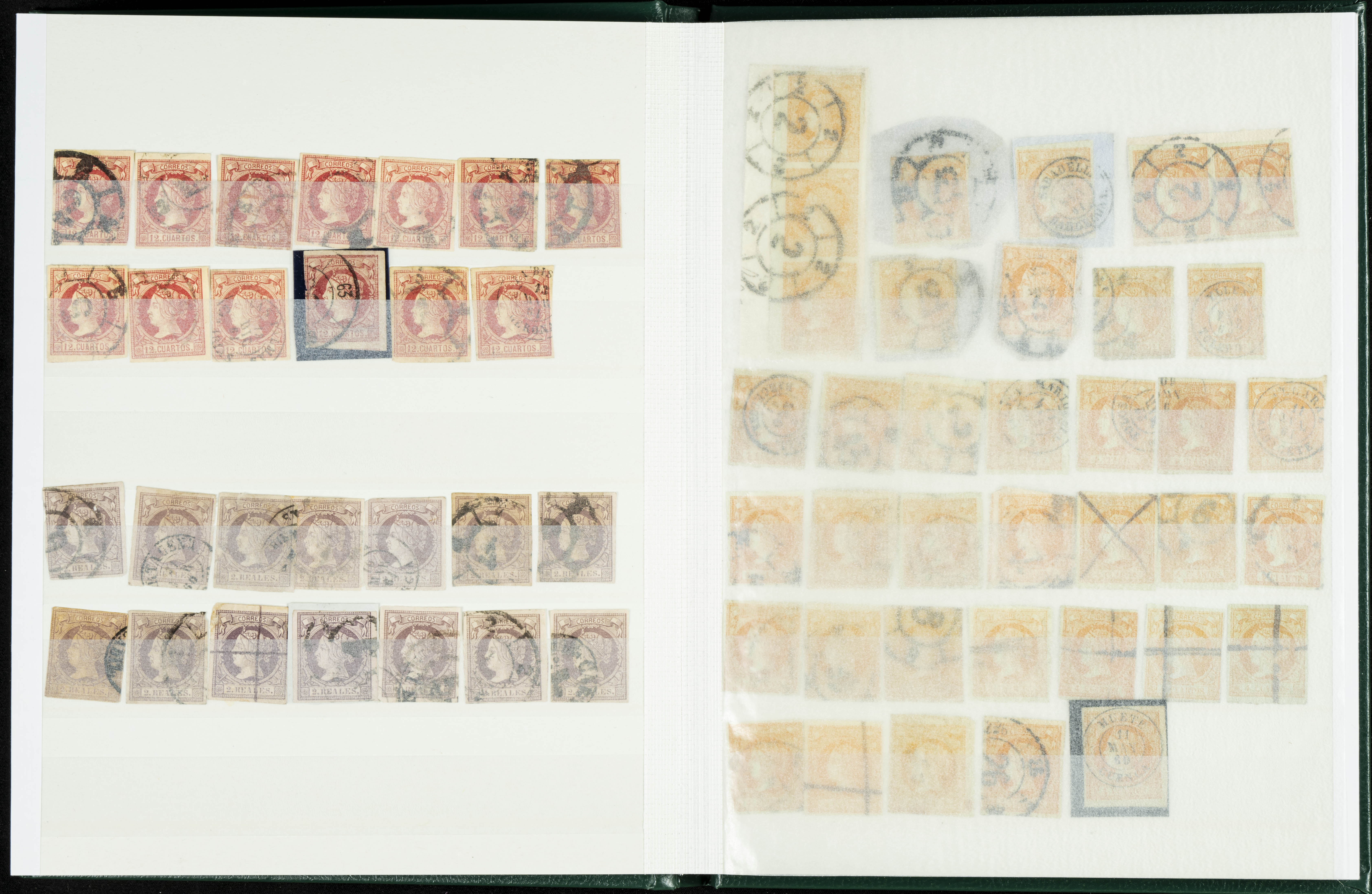 English (circa 1860). Interesting collection of over five hundred stamps from the 1860 issue, in used condition, including more than one hundred stamps of the 2 cuartos, 12 cuartos, 1 real, and 2 reales denominations, most with cartwheel postmarks and date stamps. VERY HIGH CATALOG VALUE. TO BE EXAMINED.