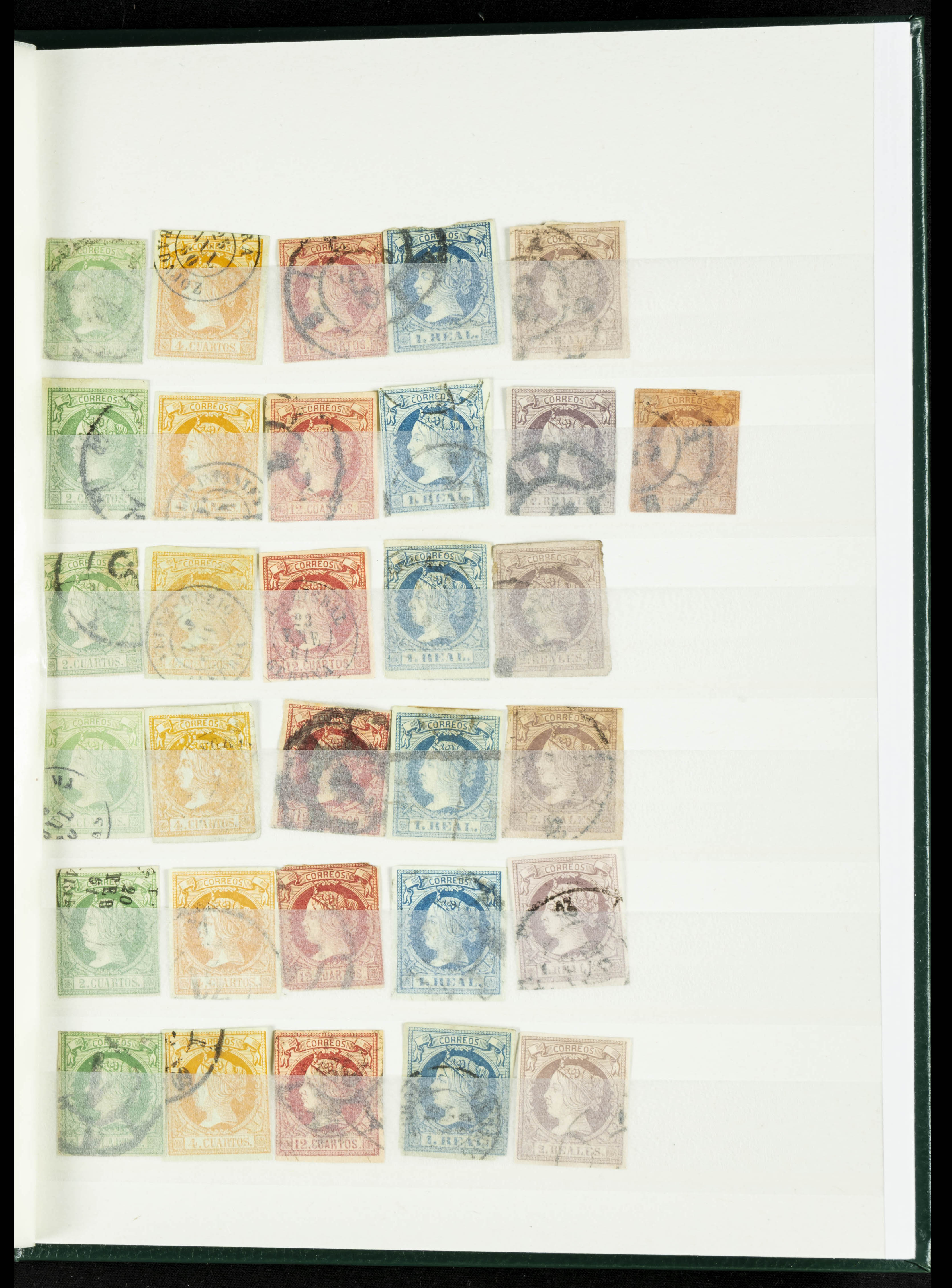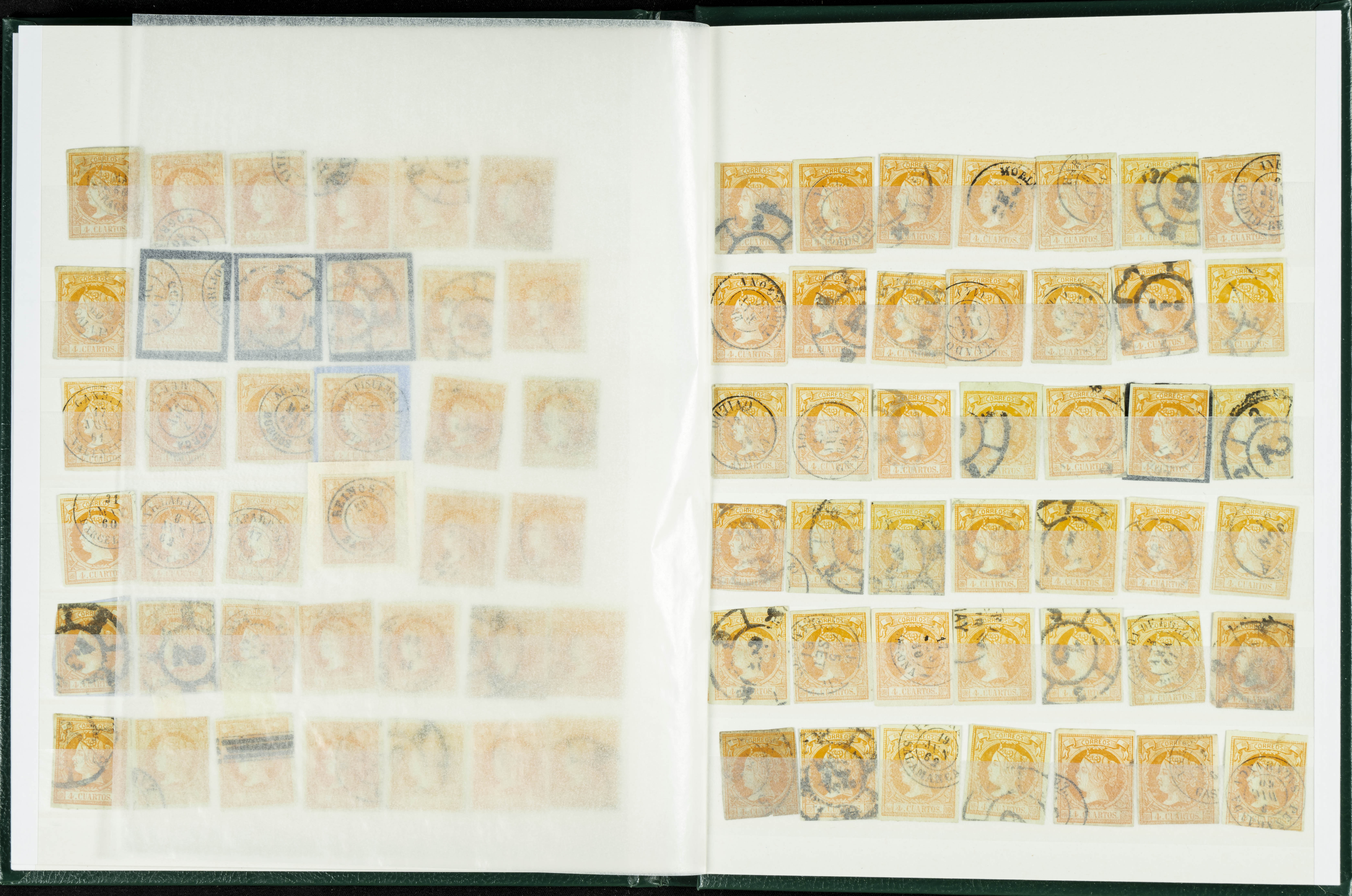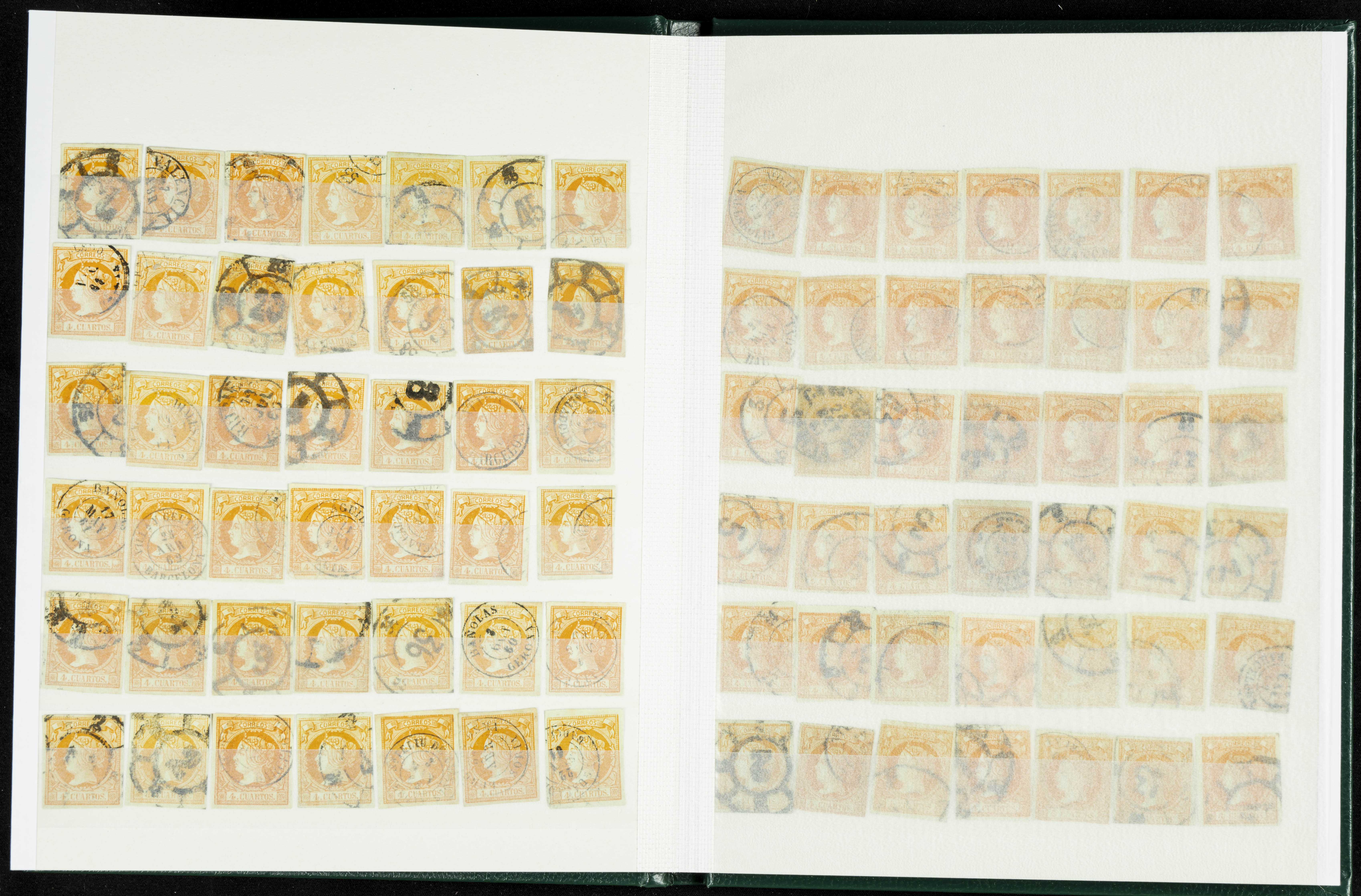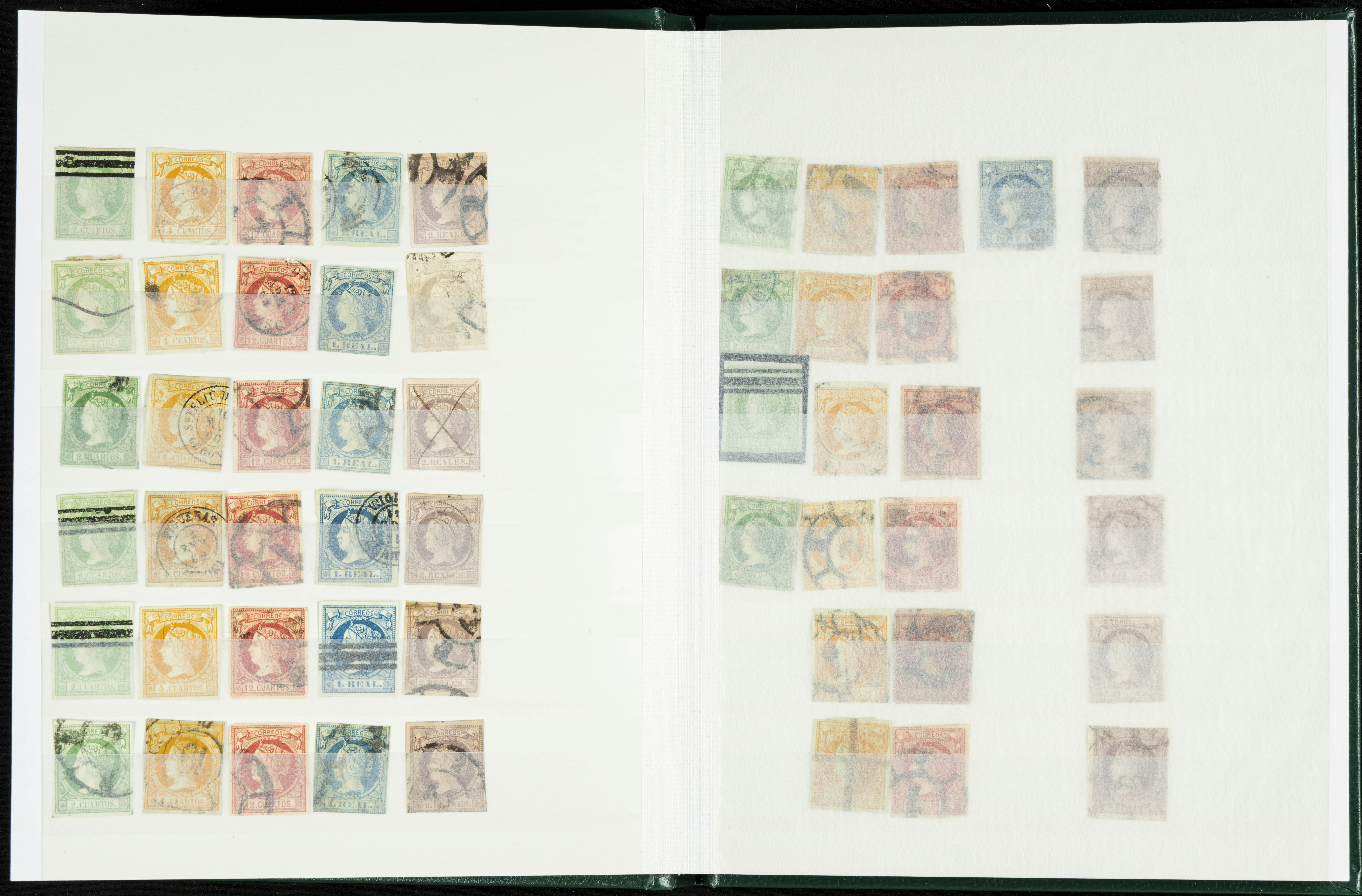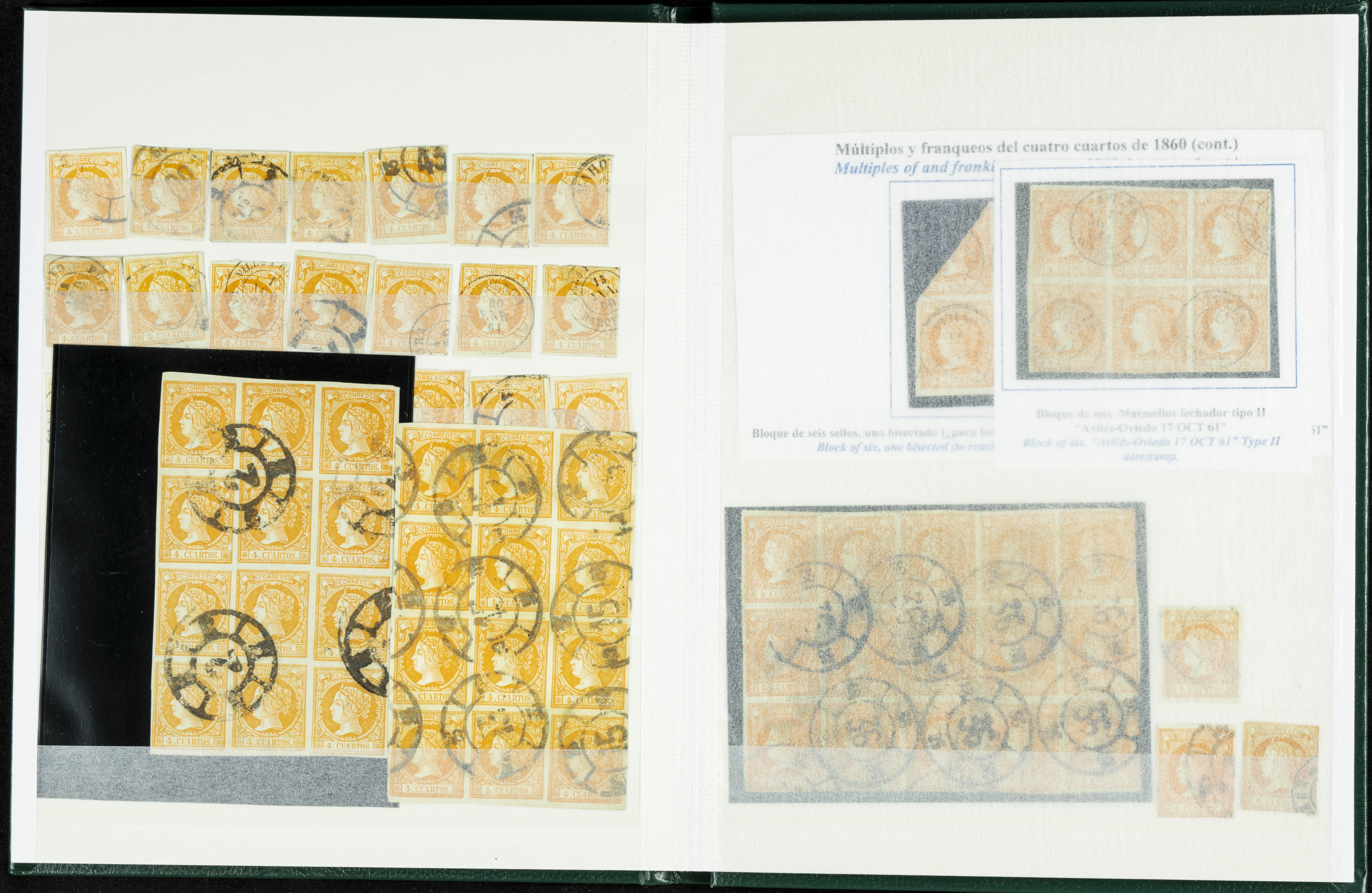 English (circa 1860). Interesting collection of over five hundred stamps from the 1860 issue, in used condition, including more than one hundred stamps of the 2 cuartos, 12 cuartos, 1 real, and 2 reales denominations, most with cartwheel postmarks and date stamps. VERY HIGH CATALOG VALUE. TO BE EXAMINED.
