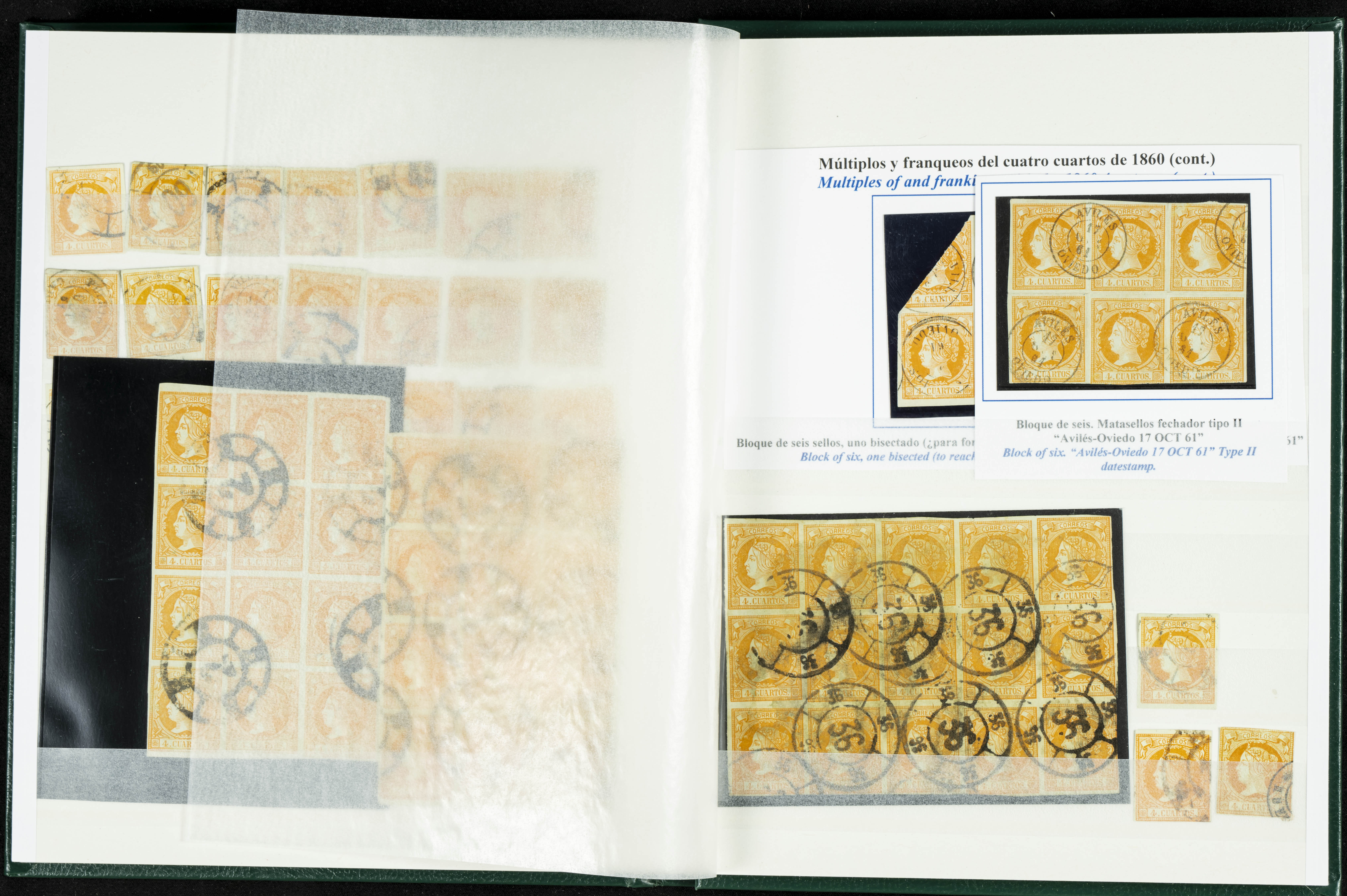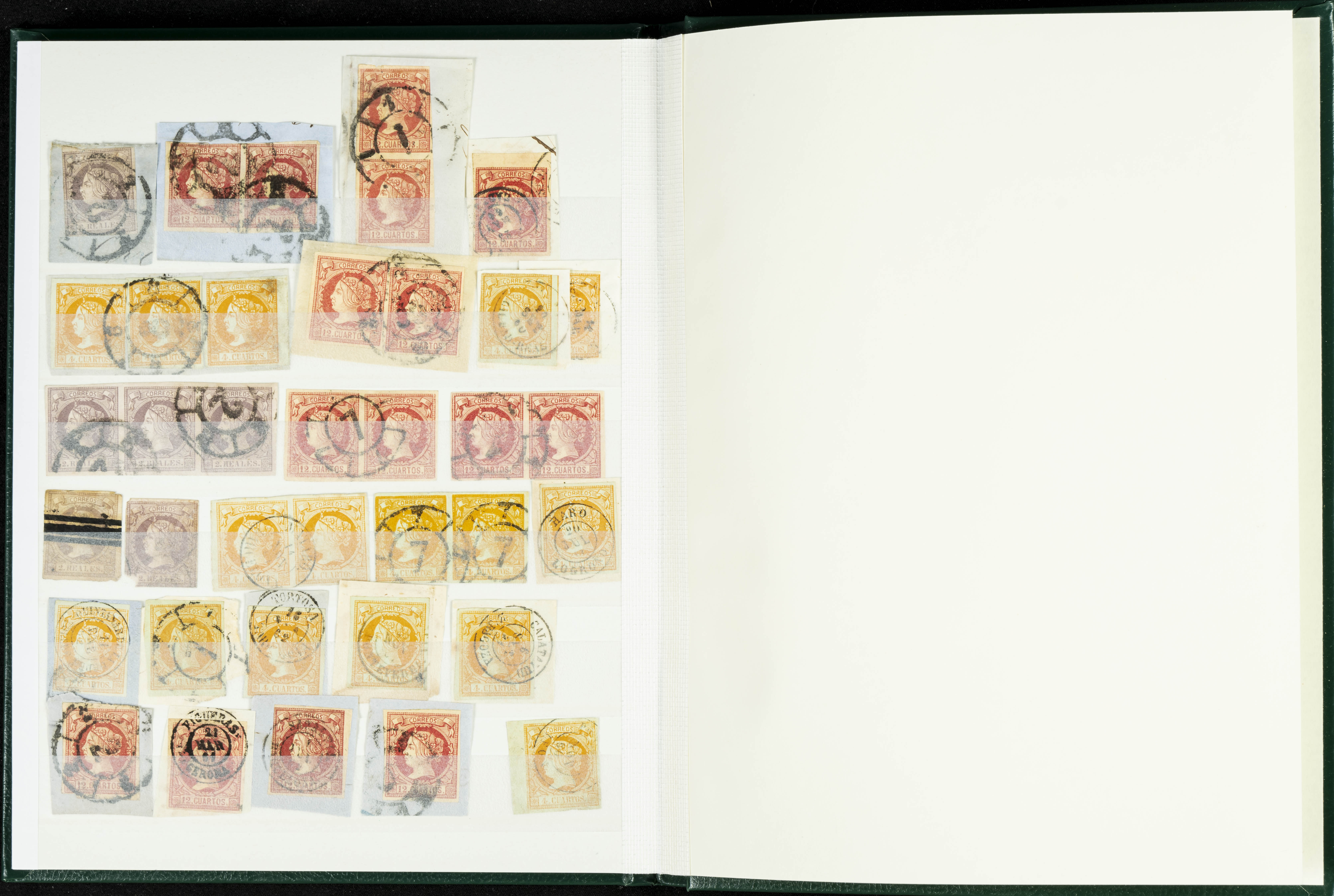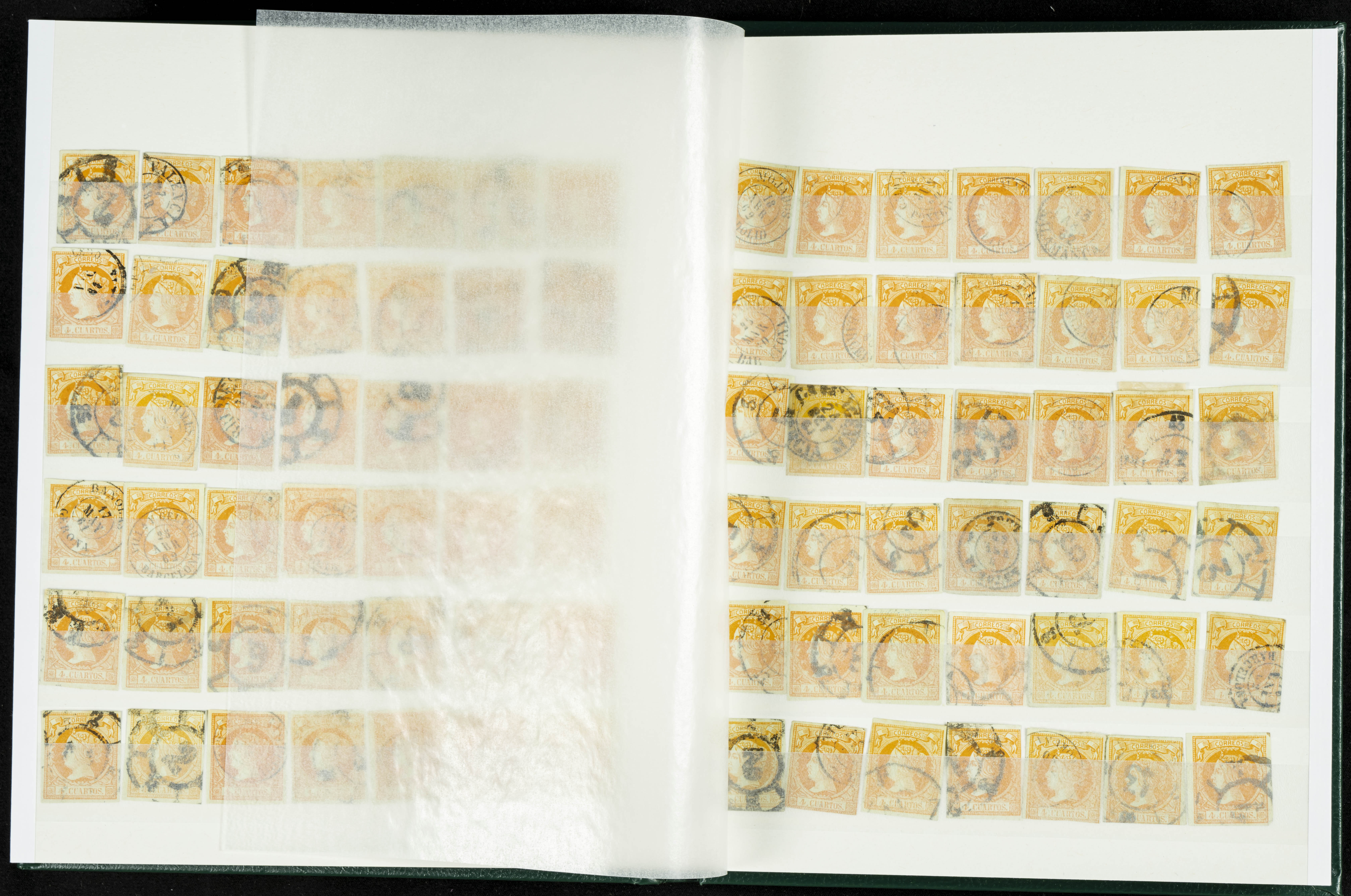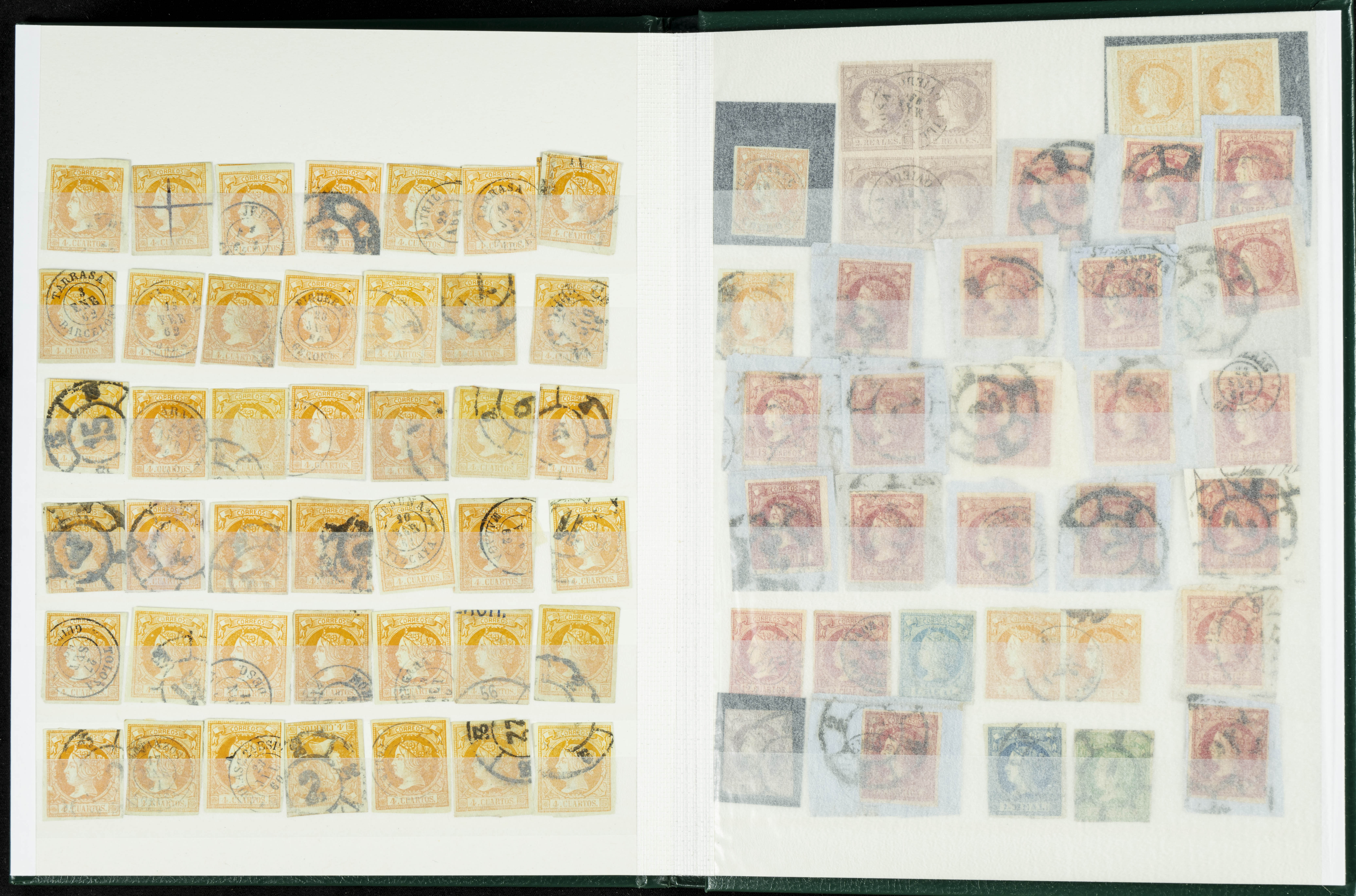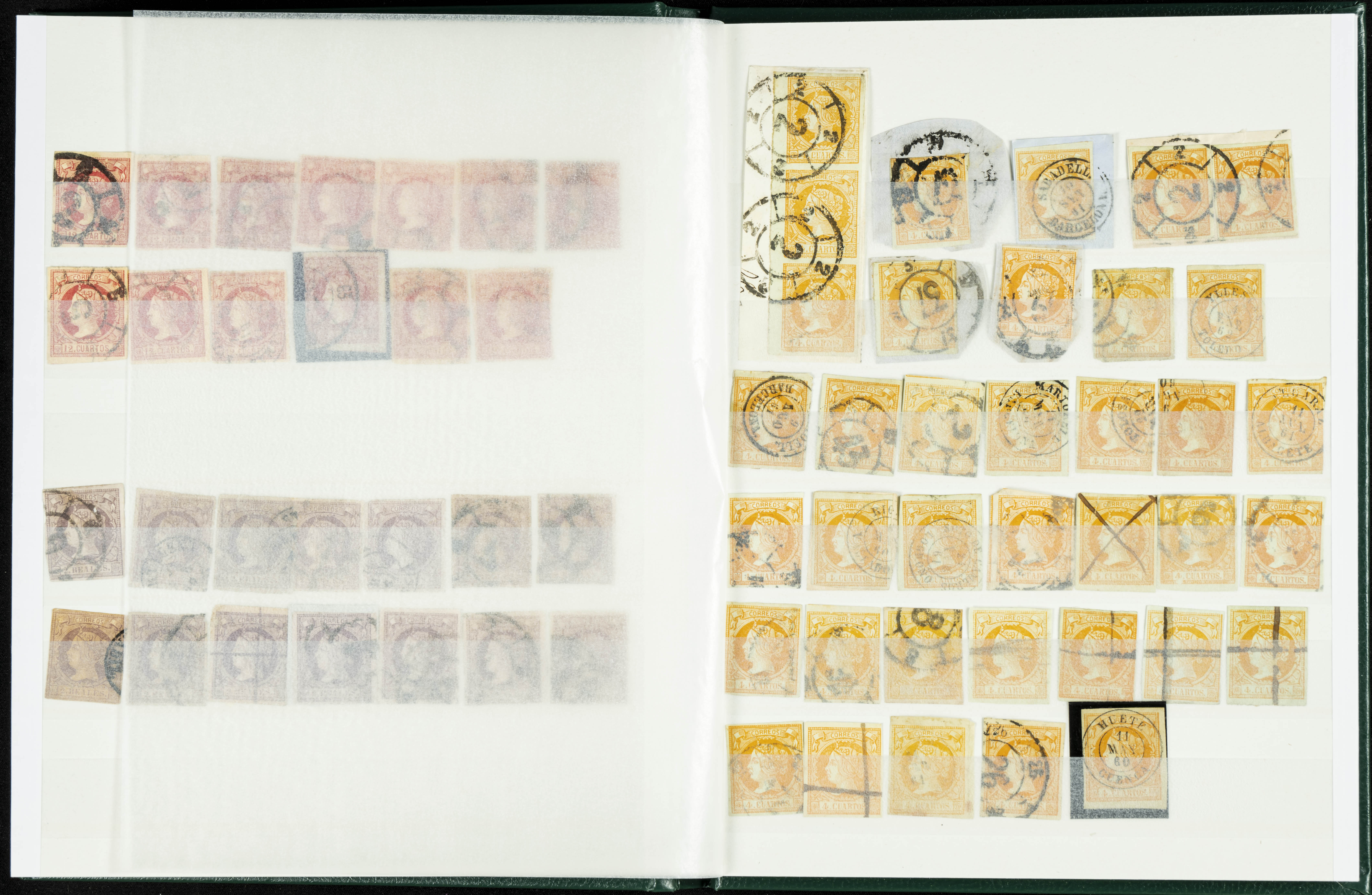 English (circa 1860). Interesting collection of over five hundred stamps from the 1860 issue, in used condition, including more than one hundred stamps of the 2 cuartos, 12 cuartos, 1 real, and 2 reales denominations, most with cartwheel postmarks and date stamps. VERY HIGH CATALOG VALUE. TO BE EXAMINED.