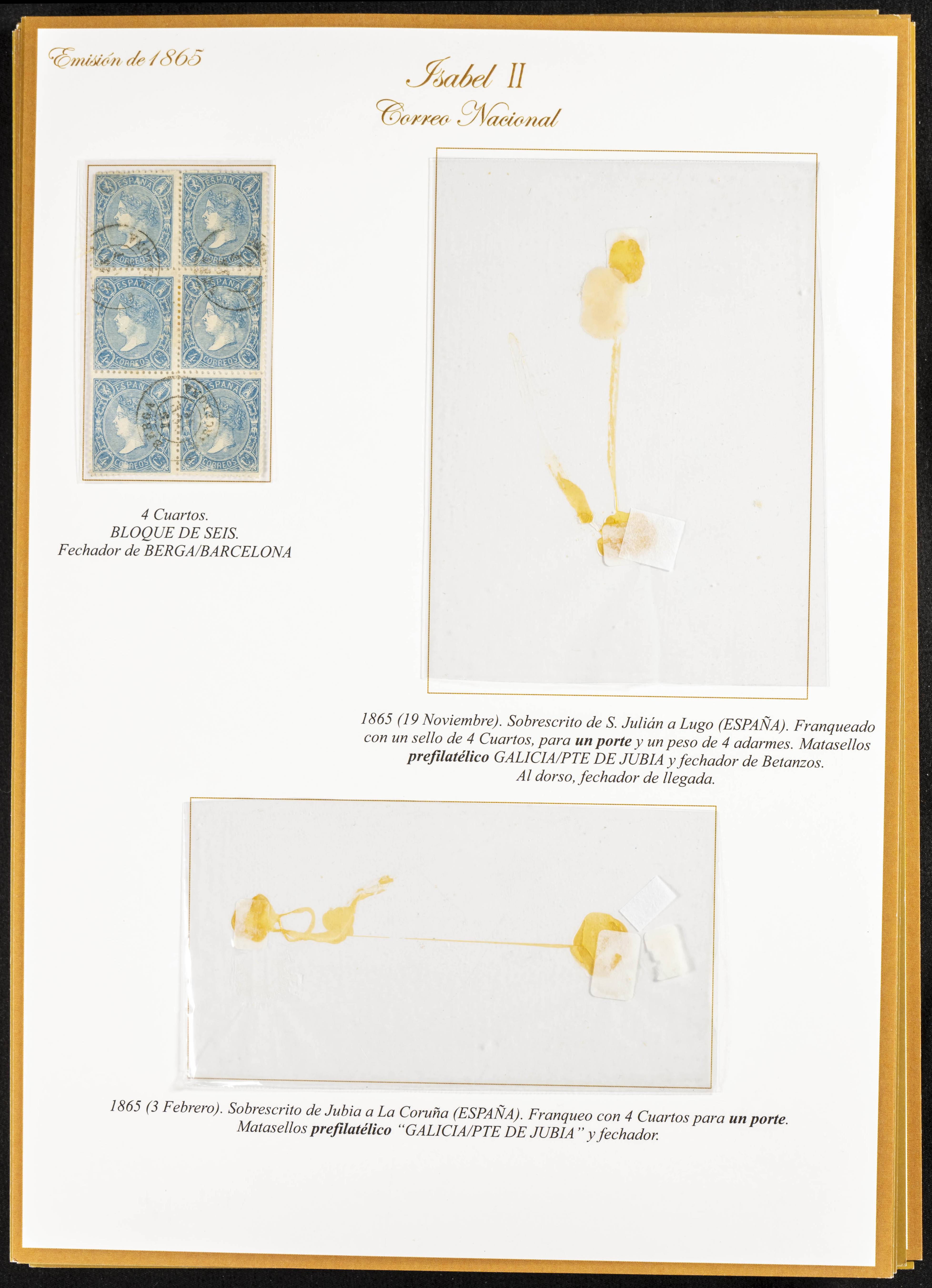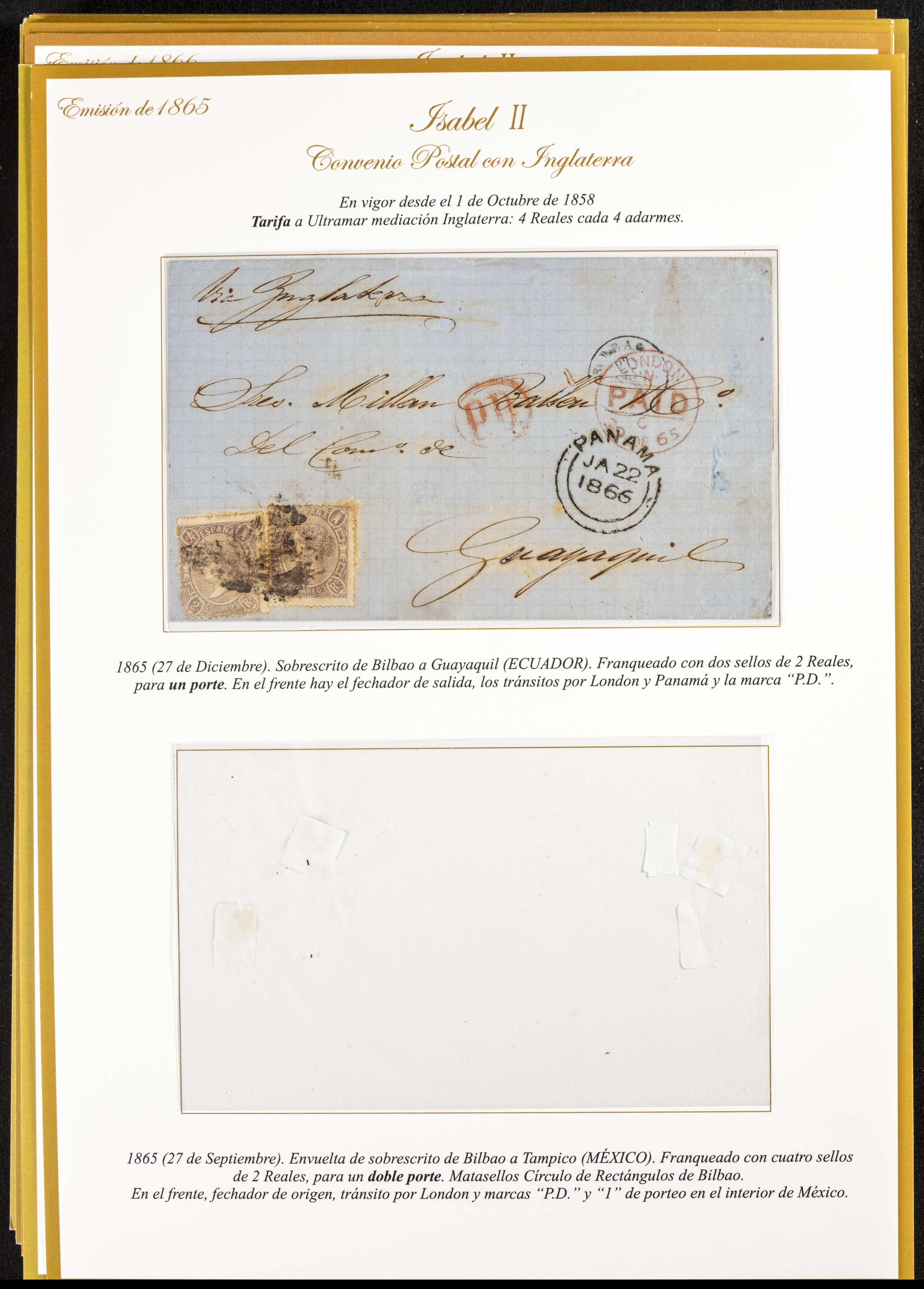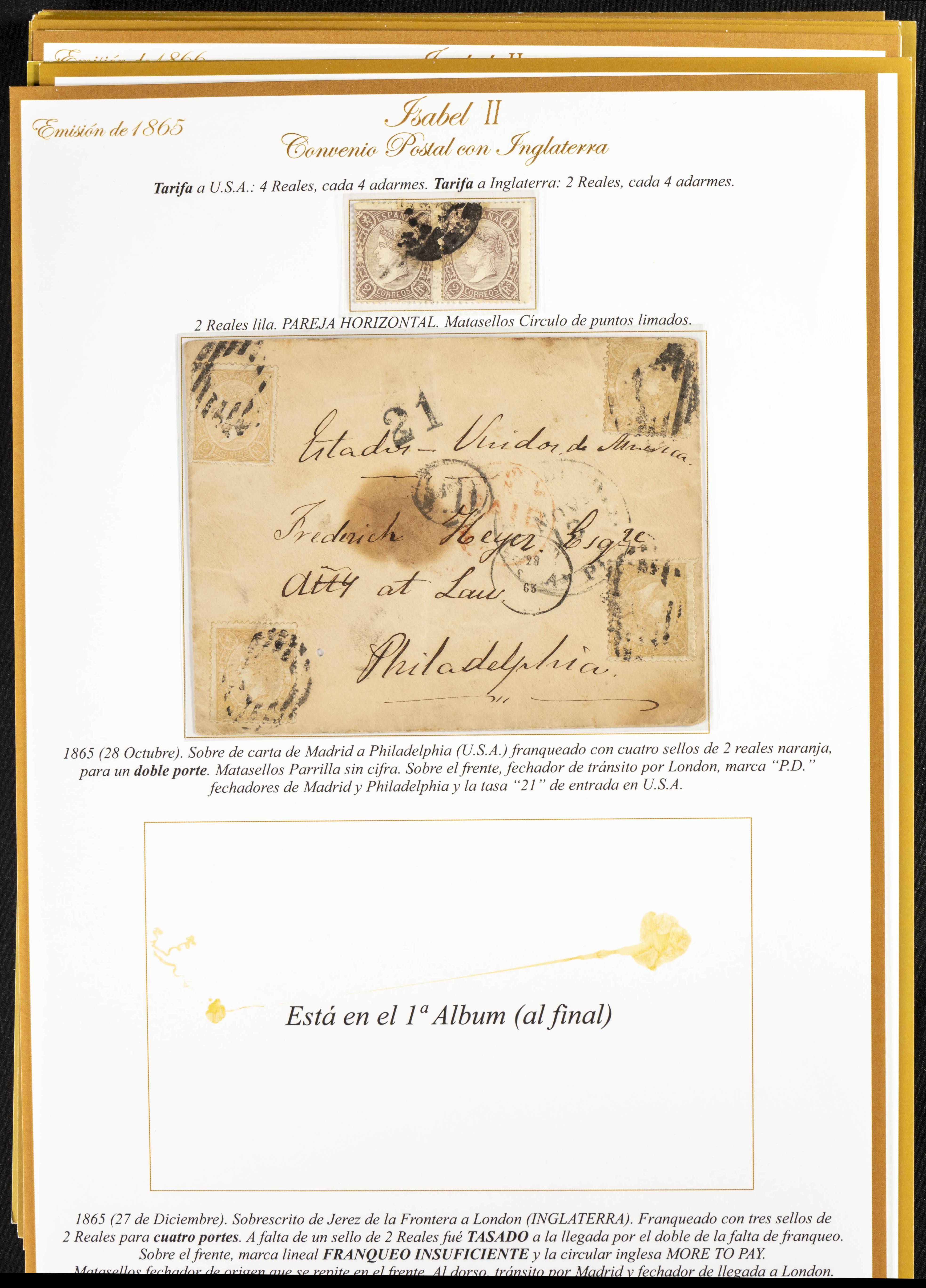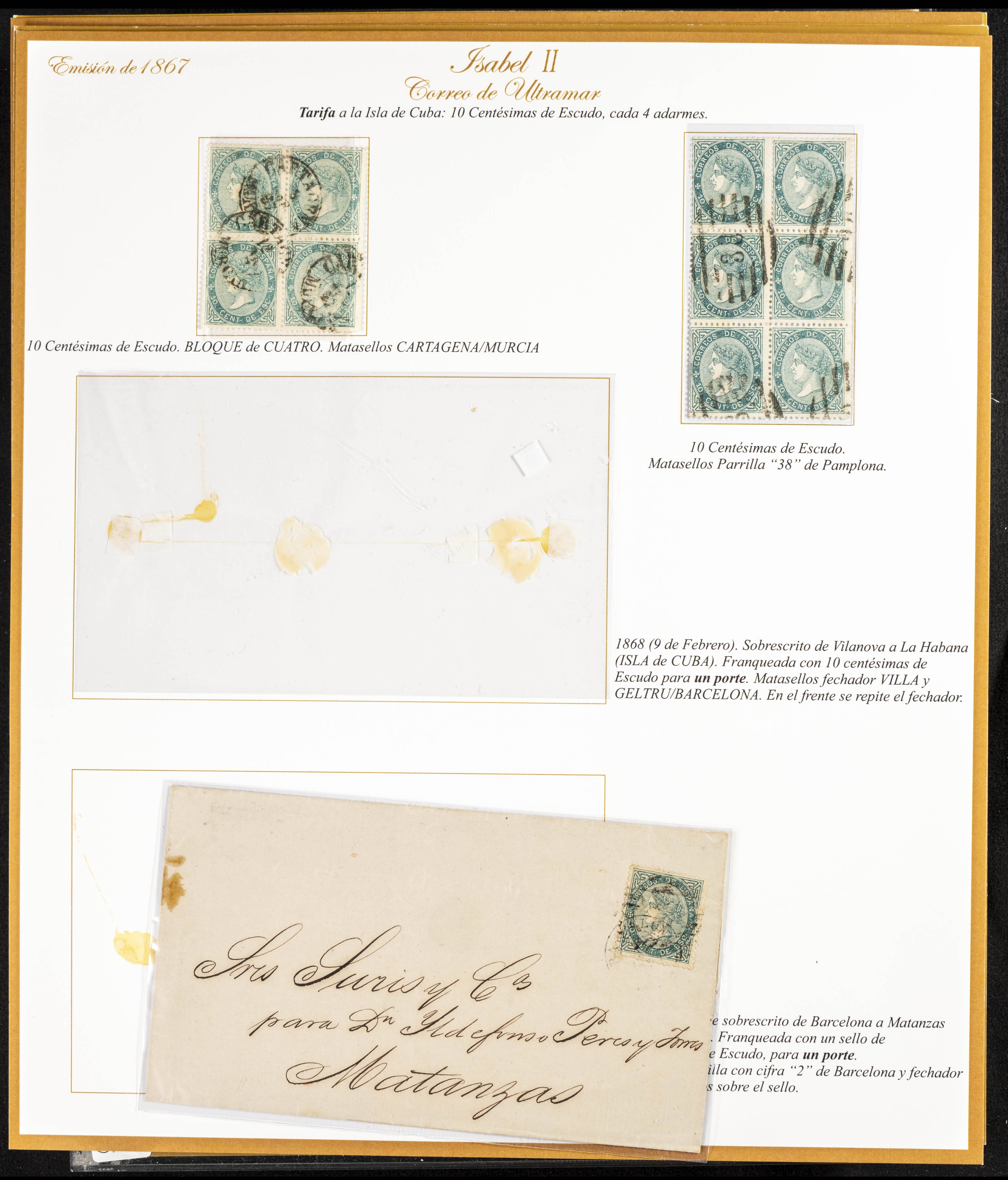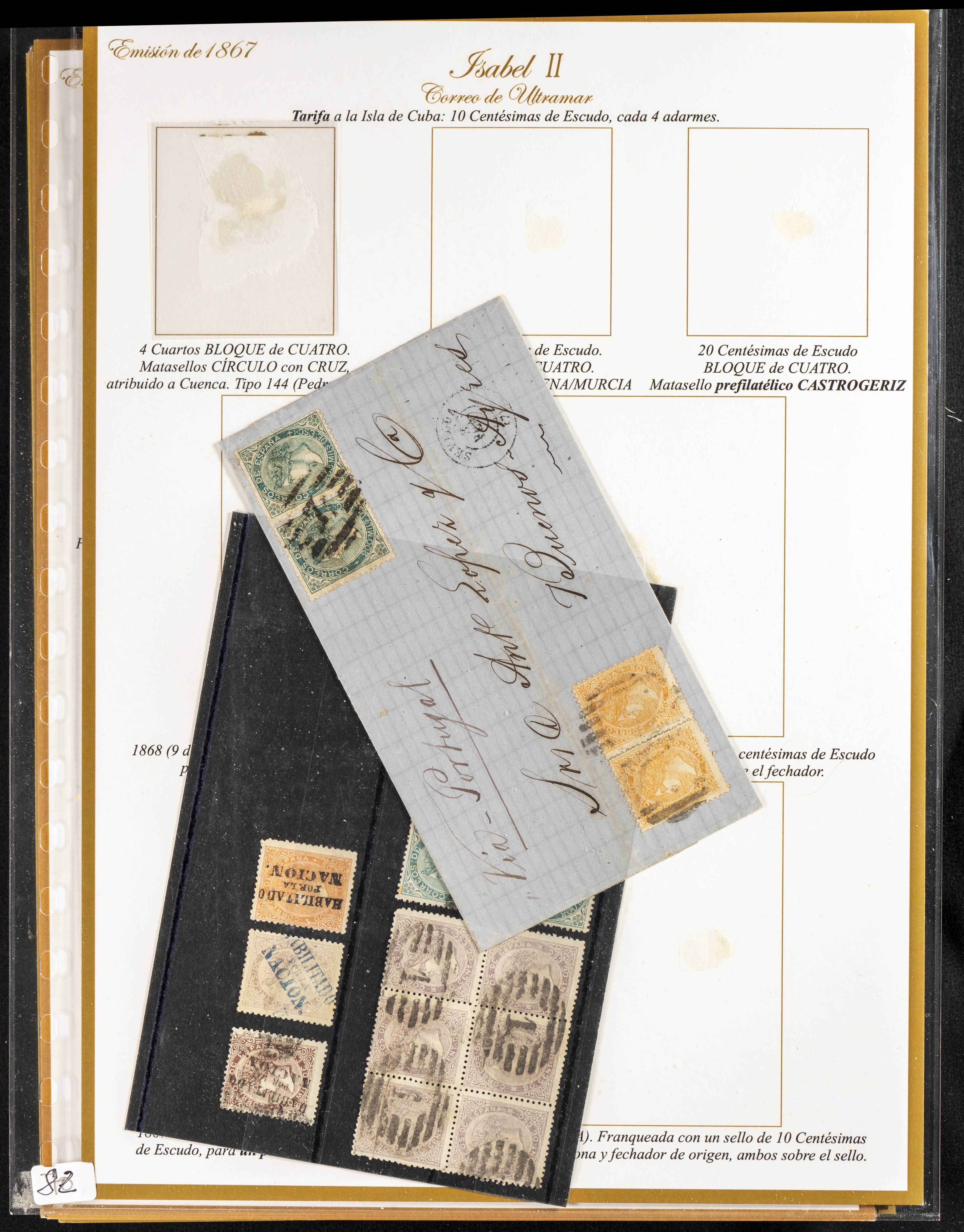 English ★/(1865ca). Spectacular remainder of a specialized collection of perforated stamps issued by Isabella II between 1865 and 1868, in mint and used condition, blocks of four and larger sizes, varieties, circulated letters, and various special postmarks. Among the letters, some addressed to the Philippines, South America, and the United States stand out, as well as several with multiple postmarks. EXAMINATION IS ESSENTIAL.