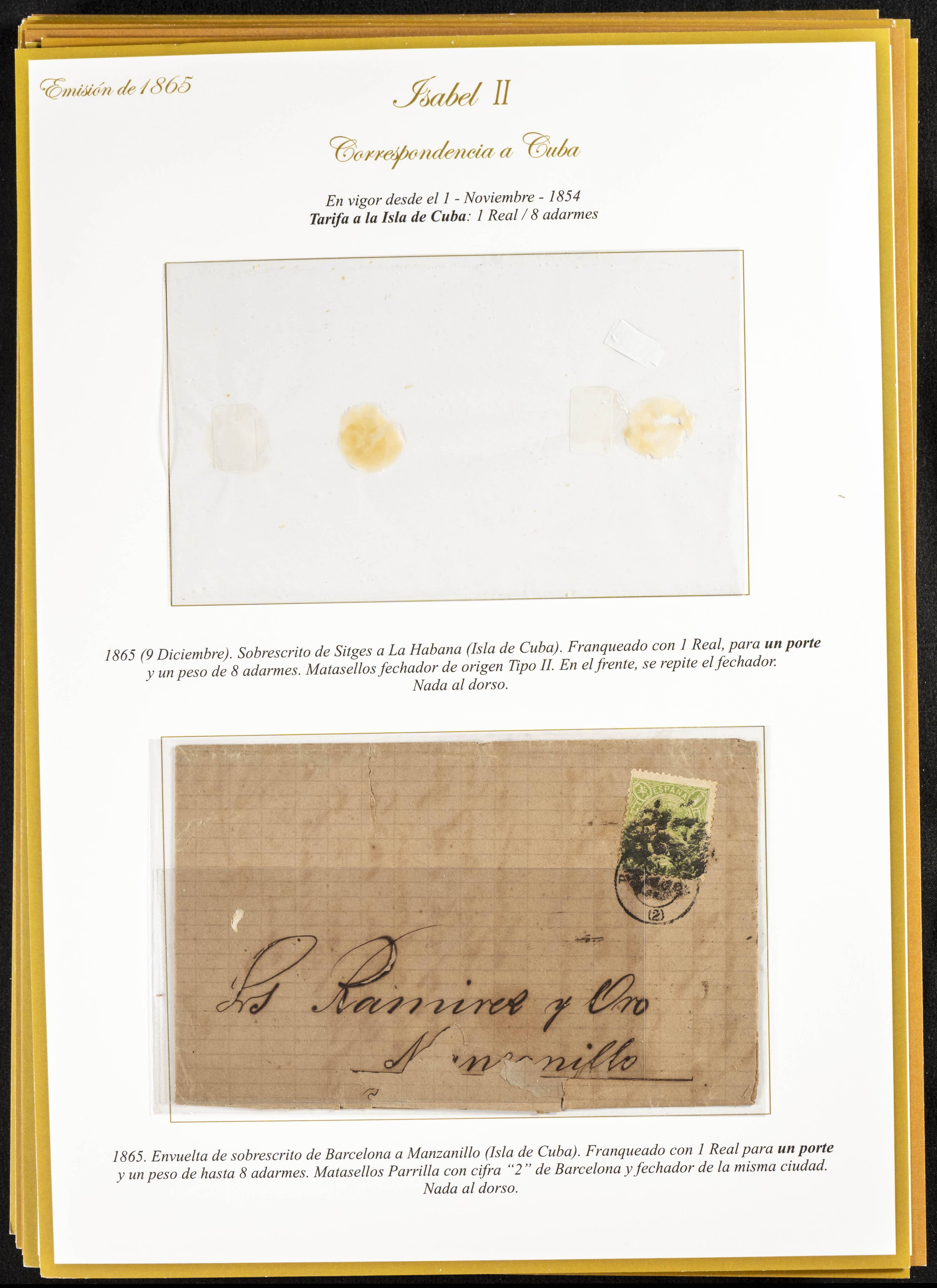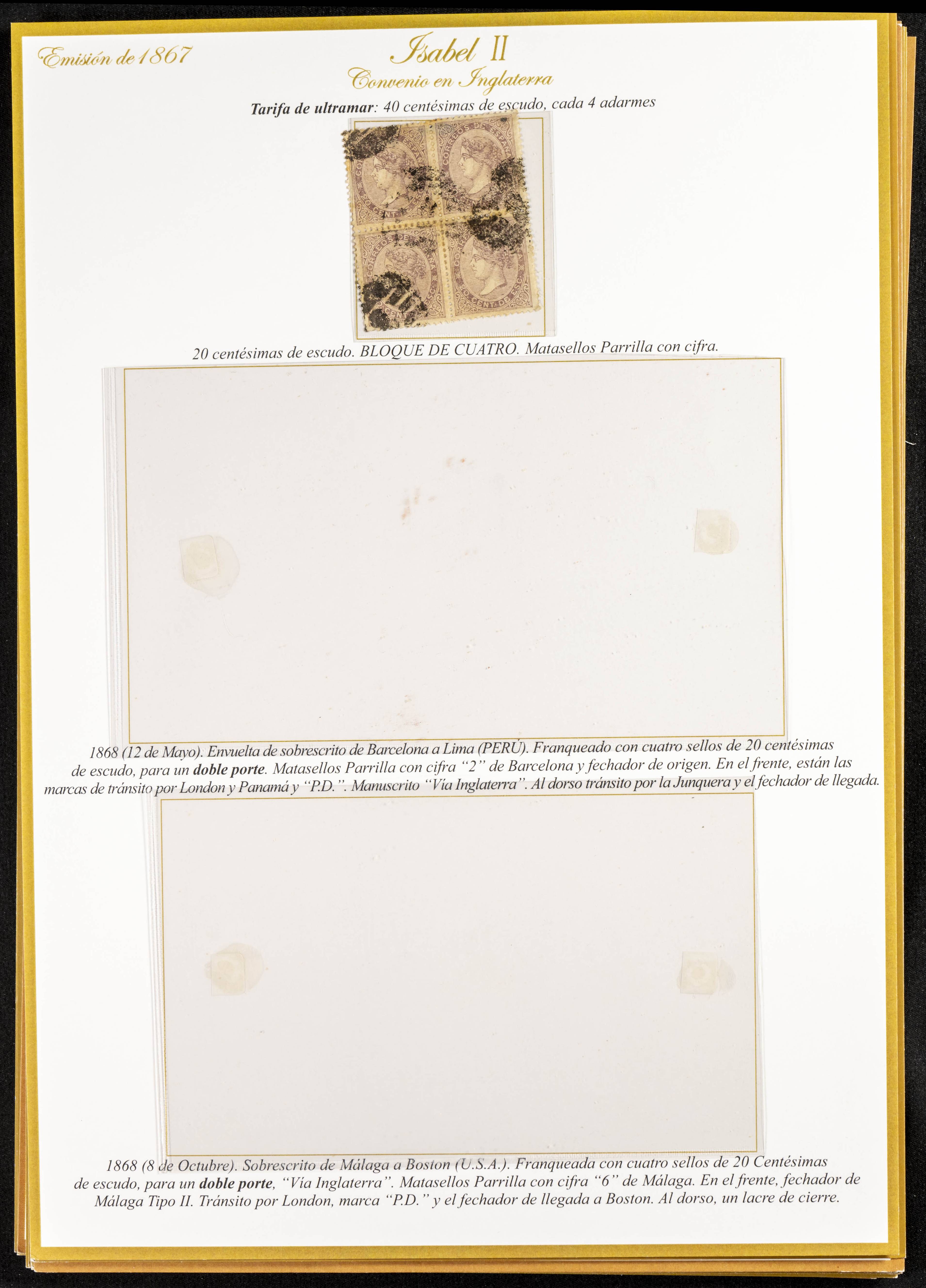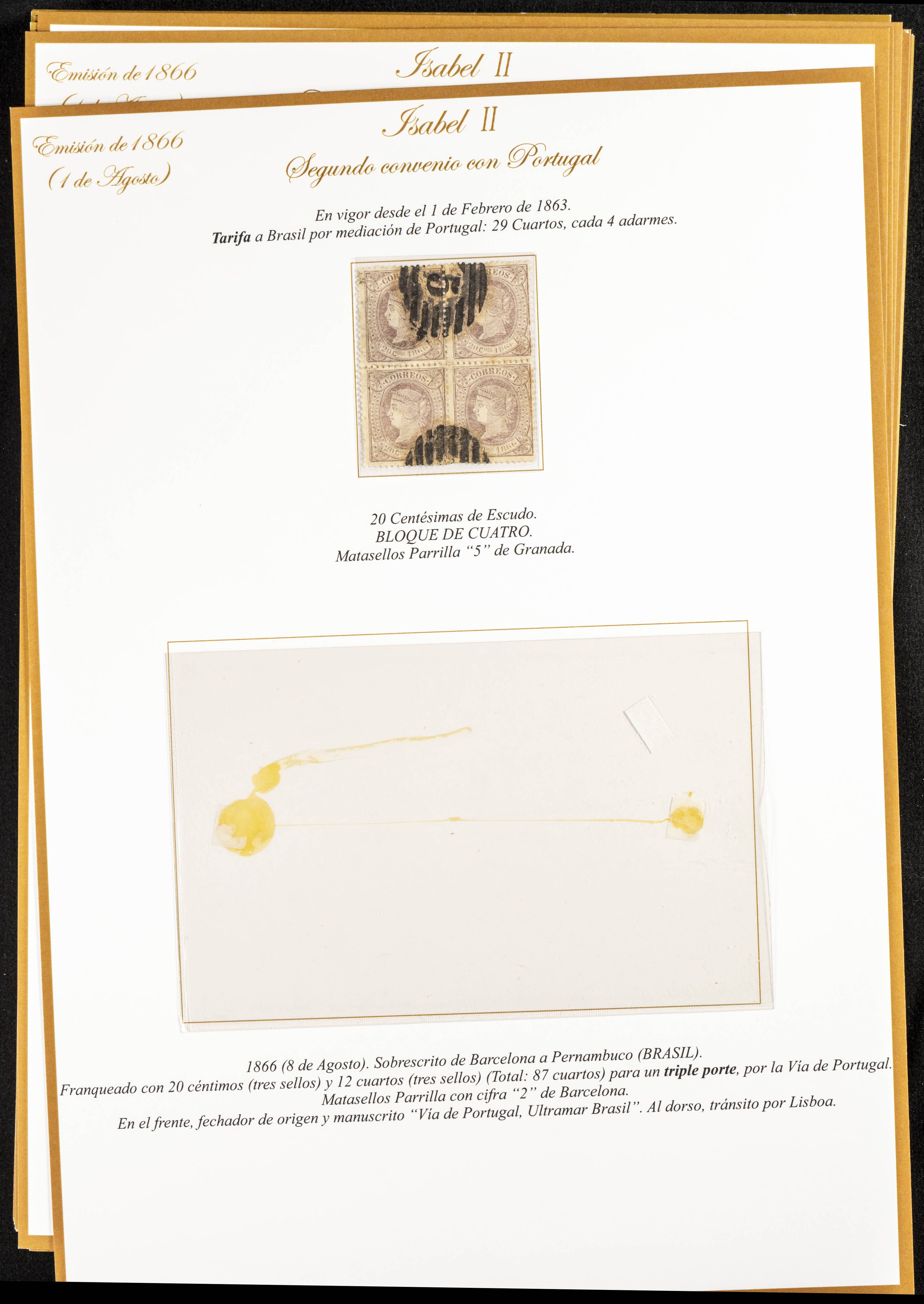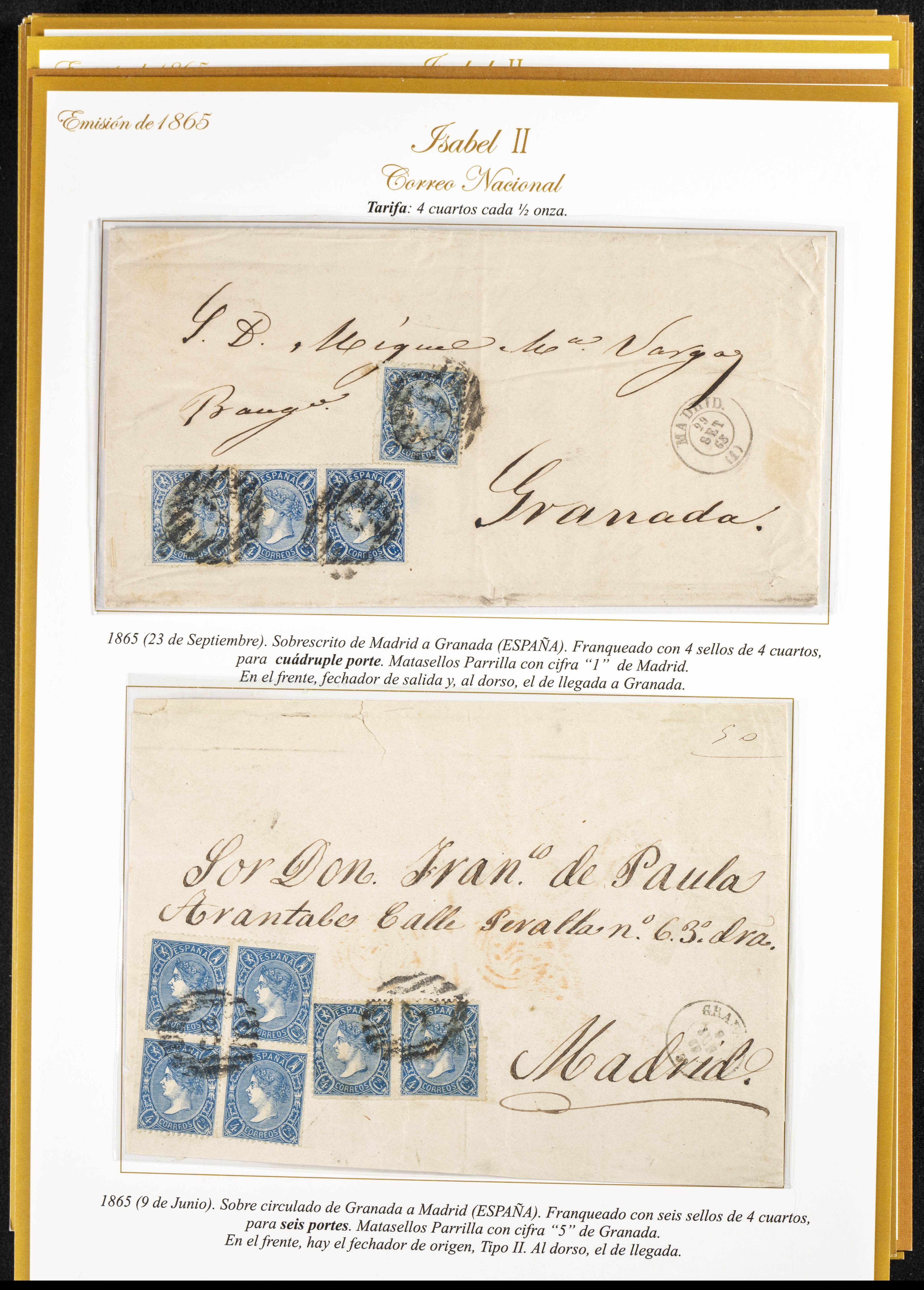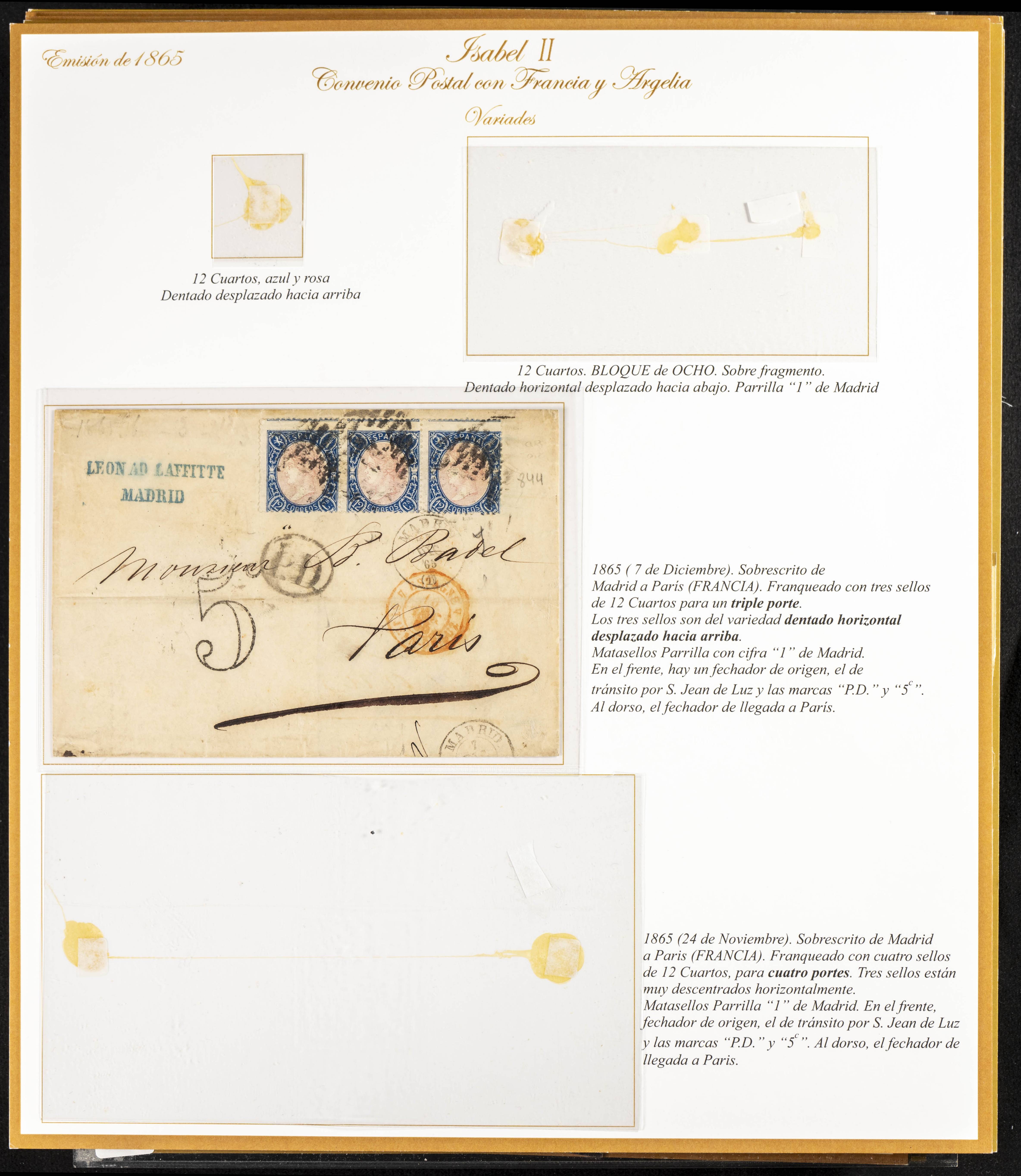 English ★/(1865ca). Spectacular remainder of a specialized collection of perforated stamps issued by Isabella II between 1865 and 1868, in mint and used condition, blocks of four and larger sizes, varieties, circulated letters, and various special postmarks. Among the letters, some addressed to the Philippines, South America, and the United States stand out, as well as several with multiple postmarks. EXAMINATION IS ESSENTIAL.
