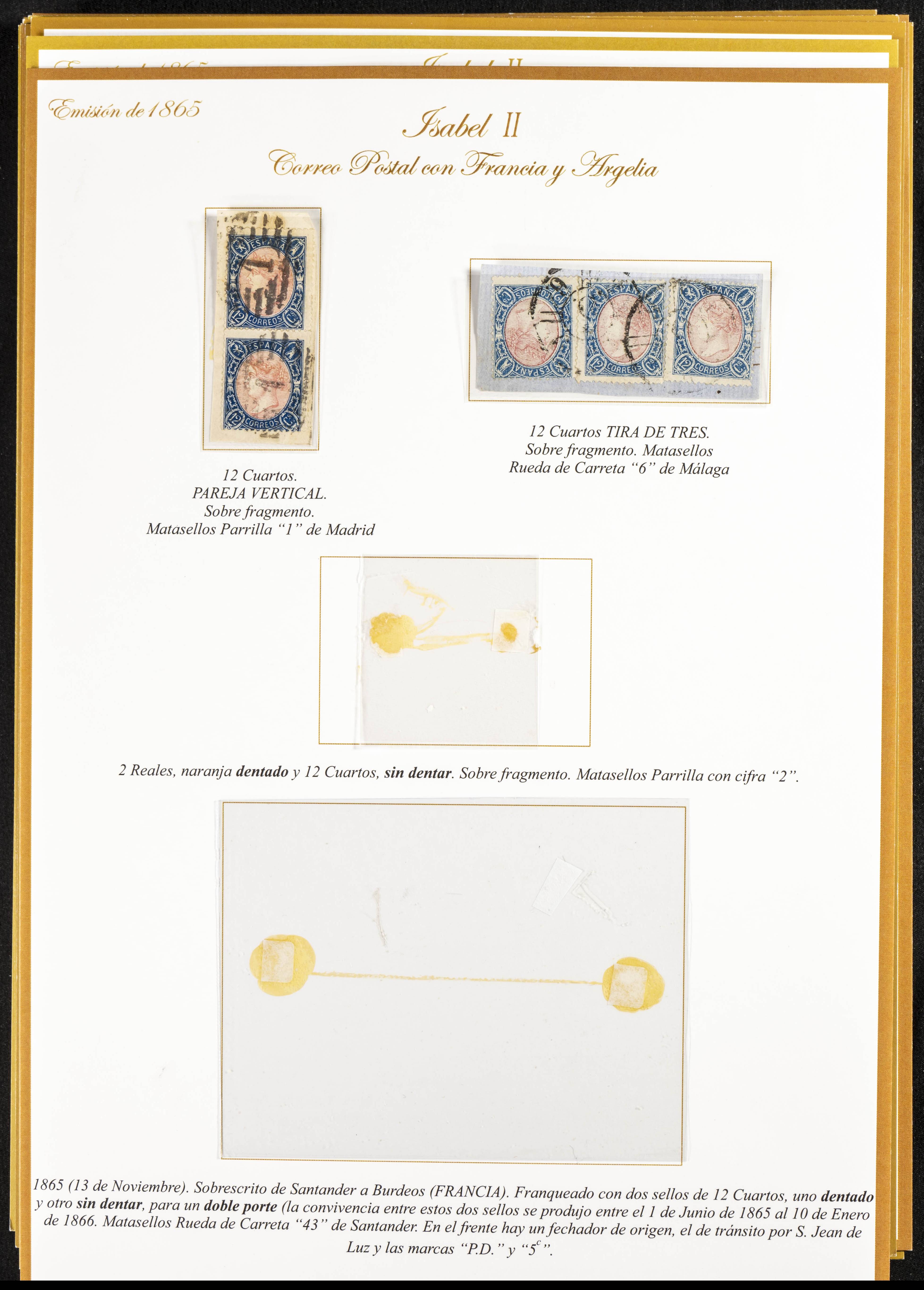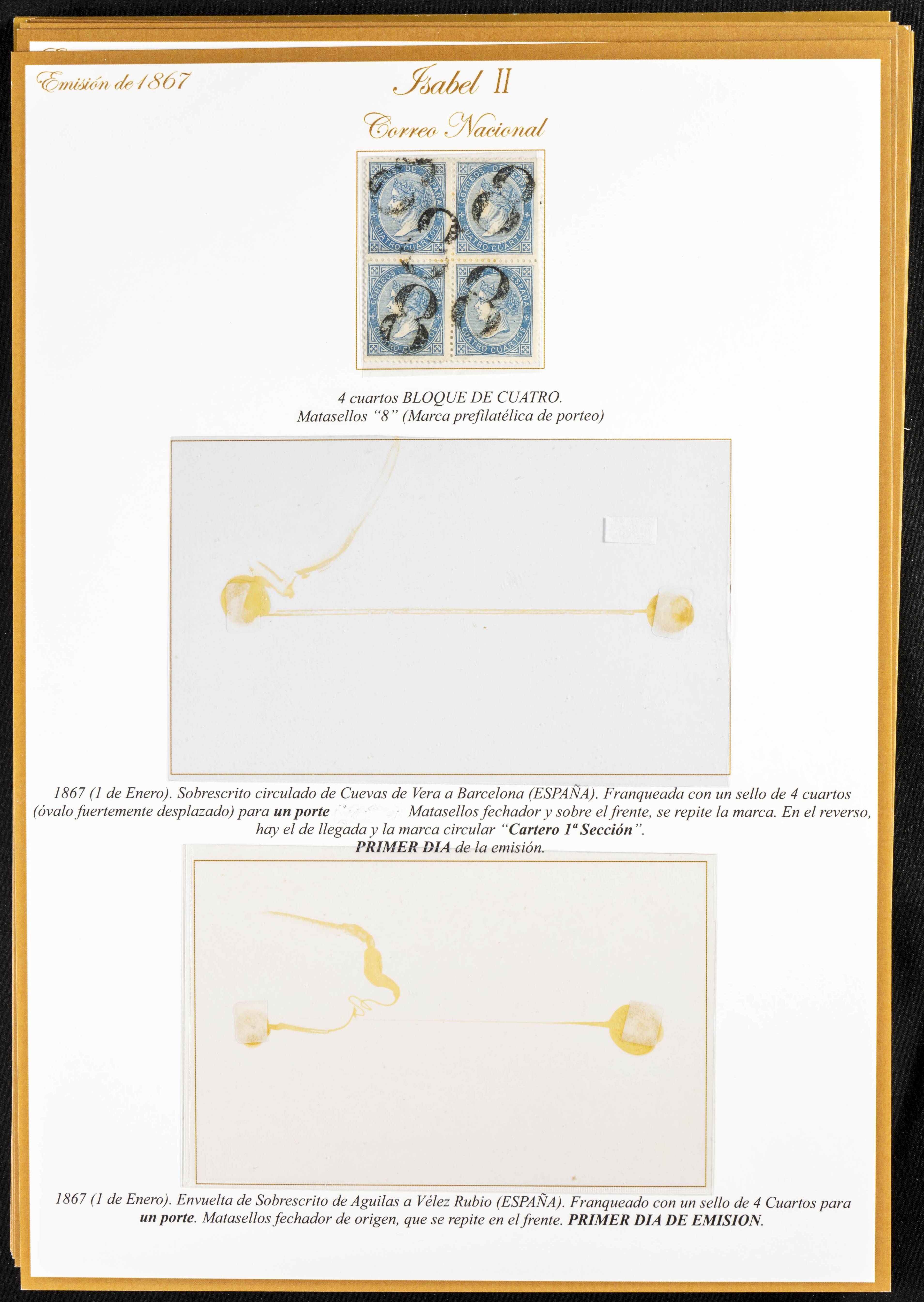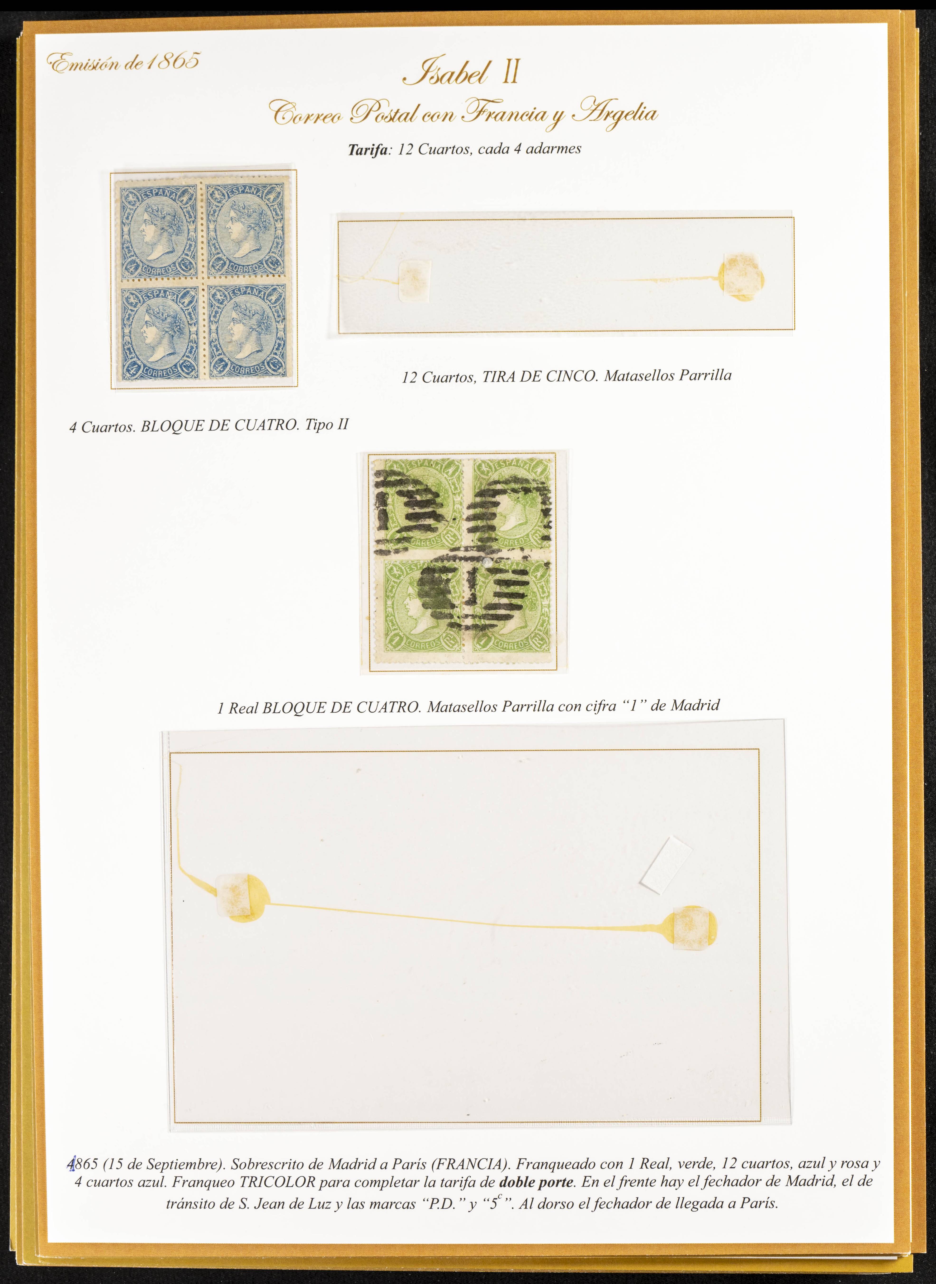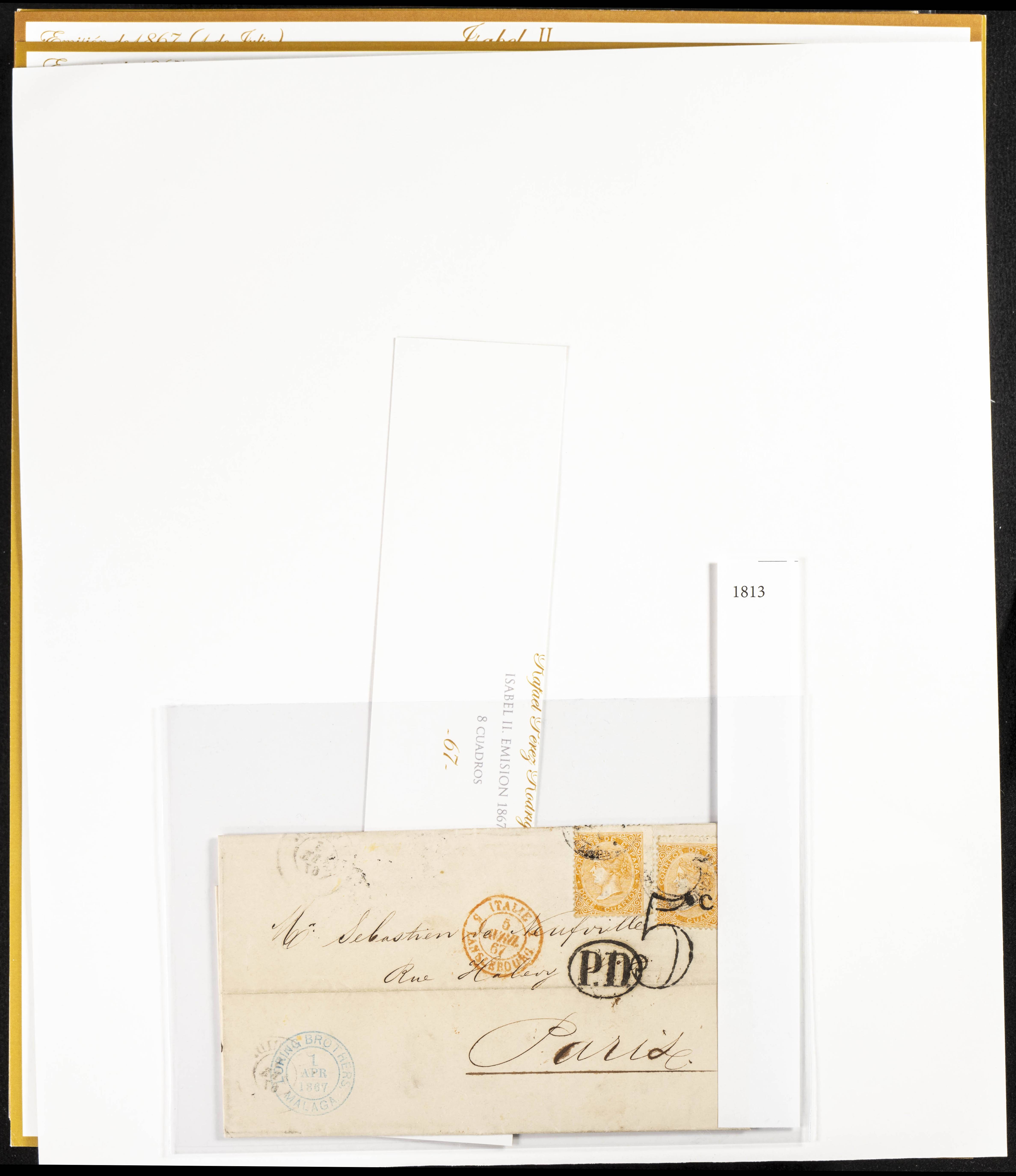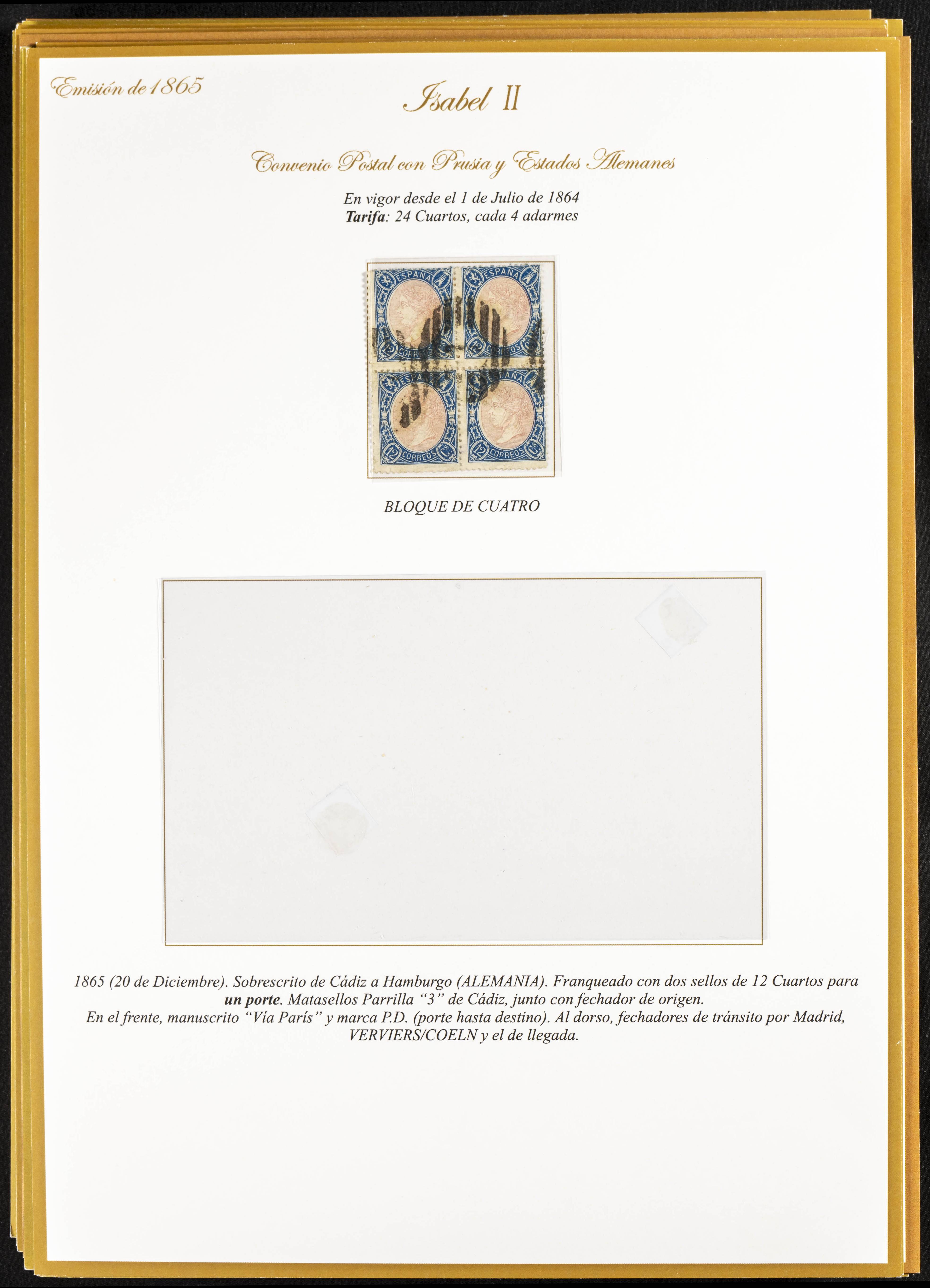 English ★/(1865ca). Spectacular remainder of a specialized collection of perforated stamps issued by Isabella II between 1865 and 1868, in mint and used condition, blocks of four and larger sizes, varieties, circulated letters, and various special postmarks. Among the letters, some addressed to the Philippines, South America, and the United States stand out, as well as several with multiple postmarks. EXAMINATION IS ESSENTIAL.