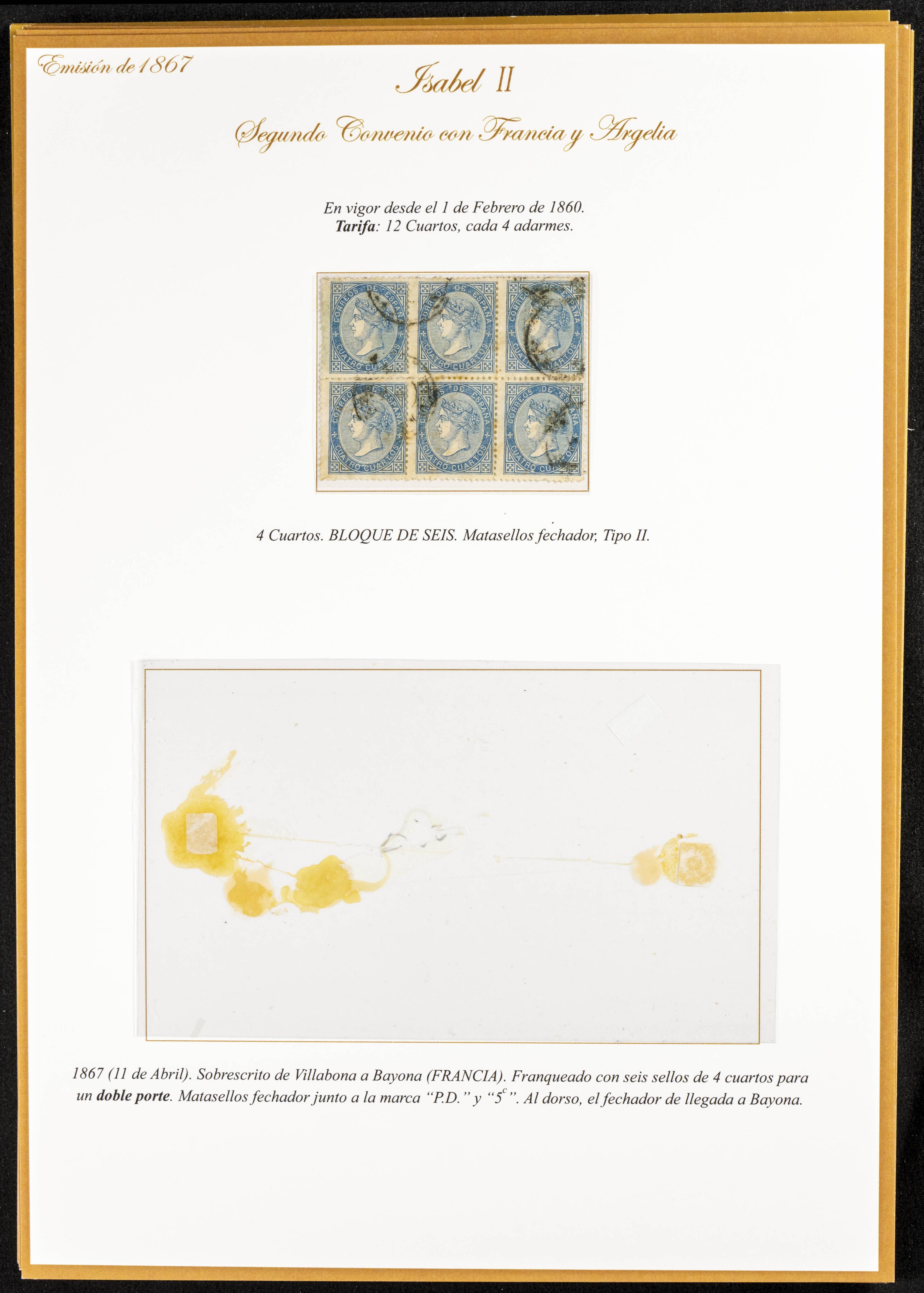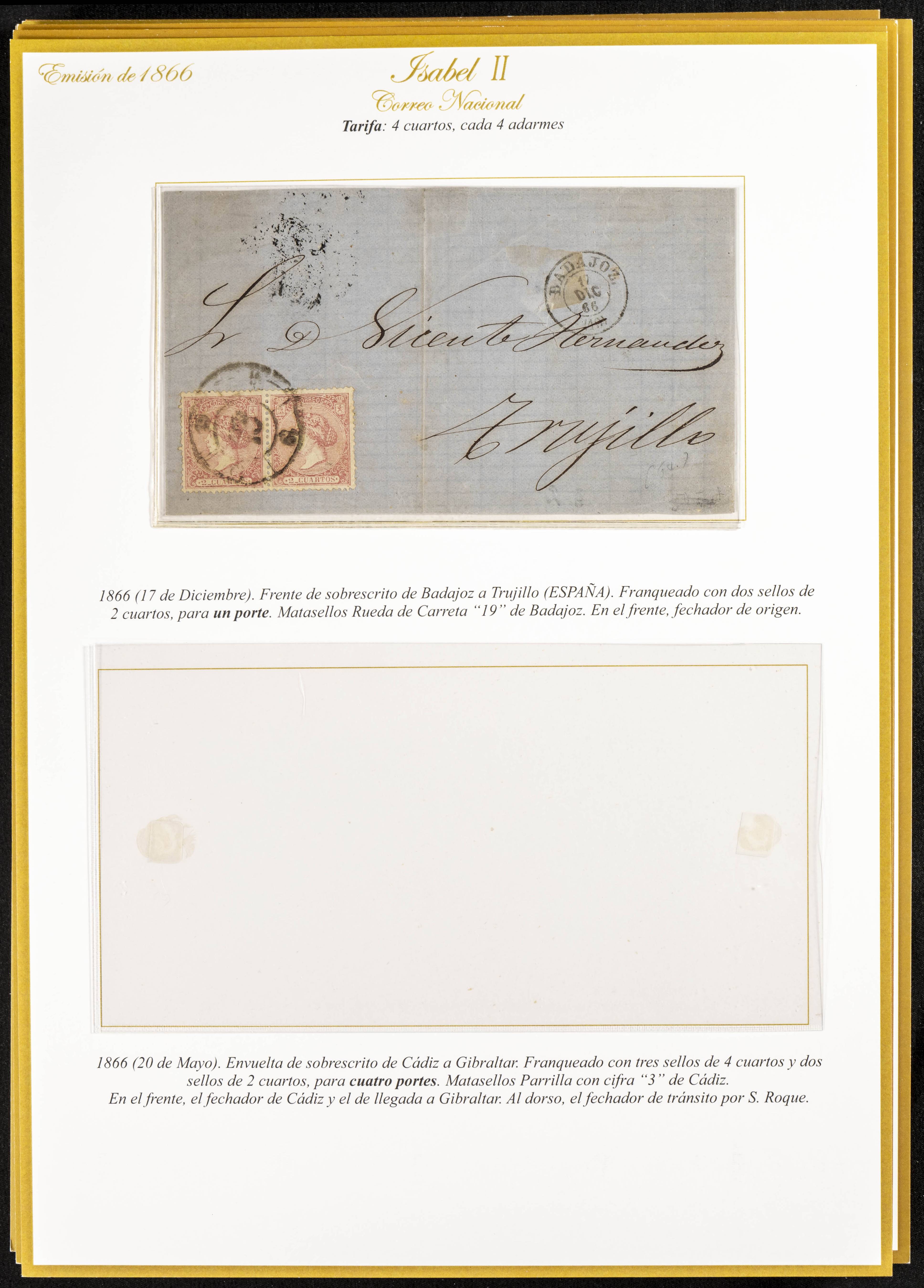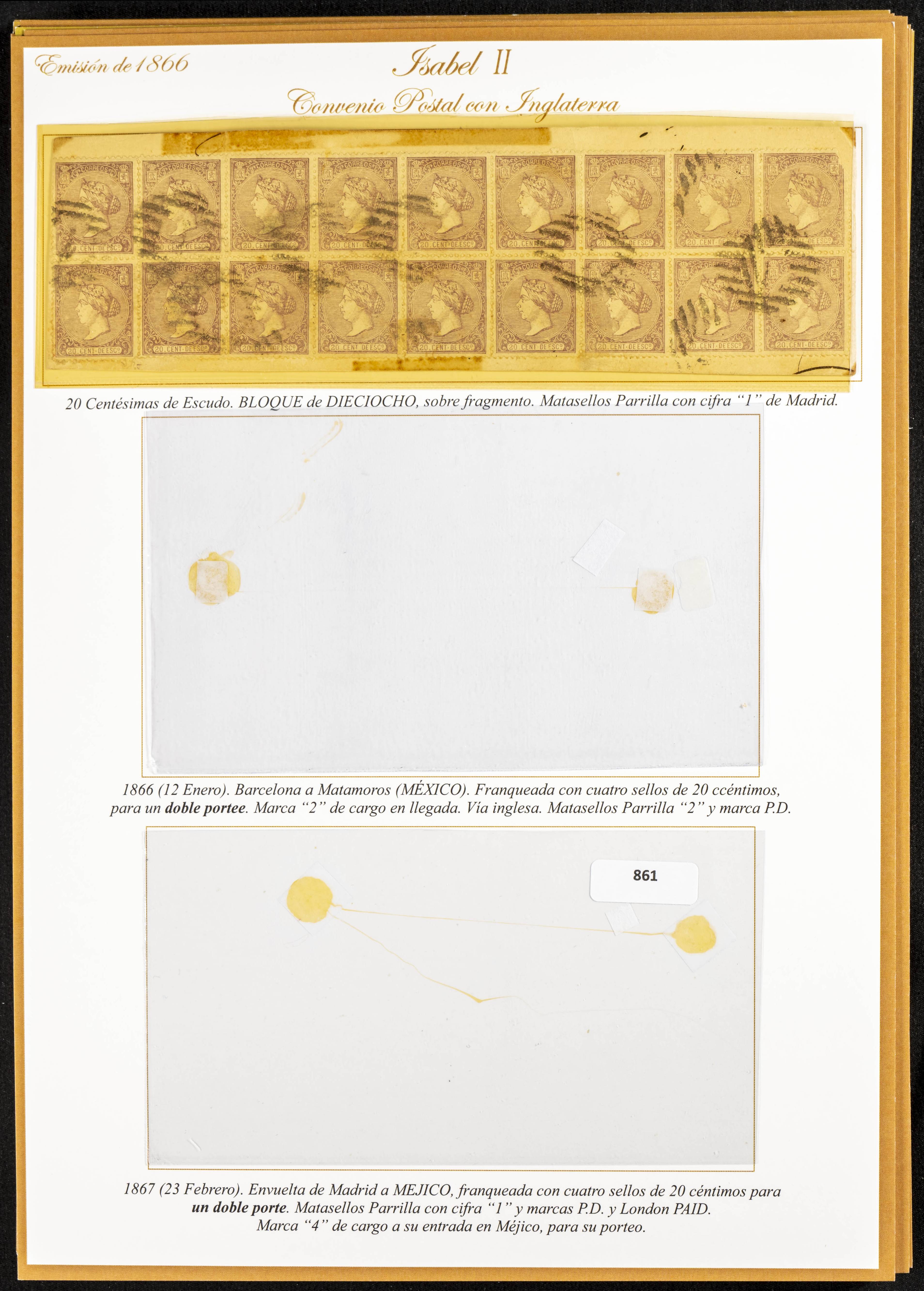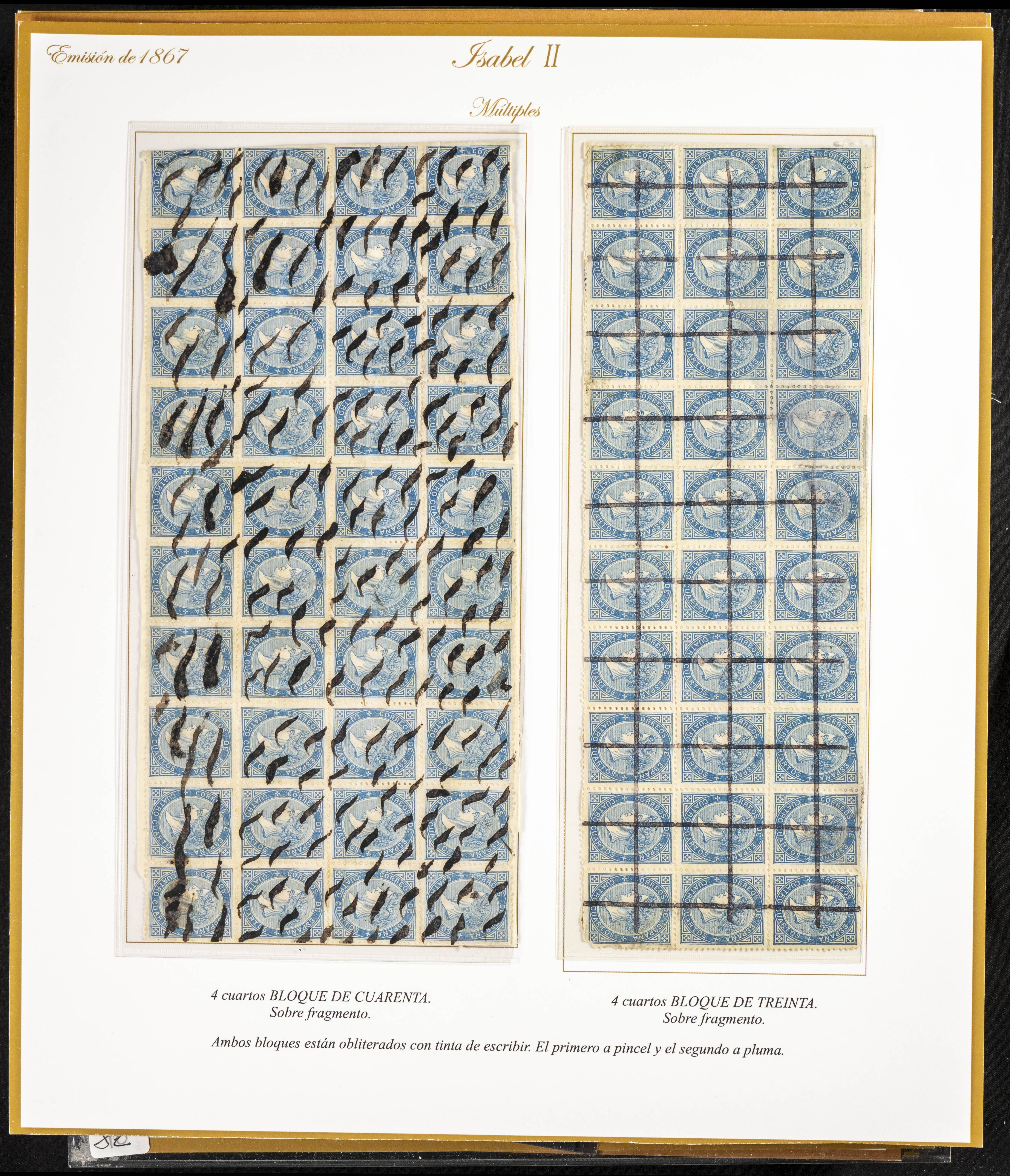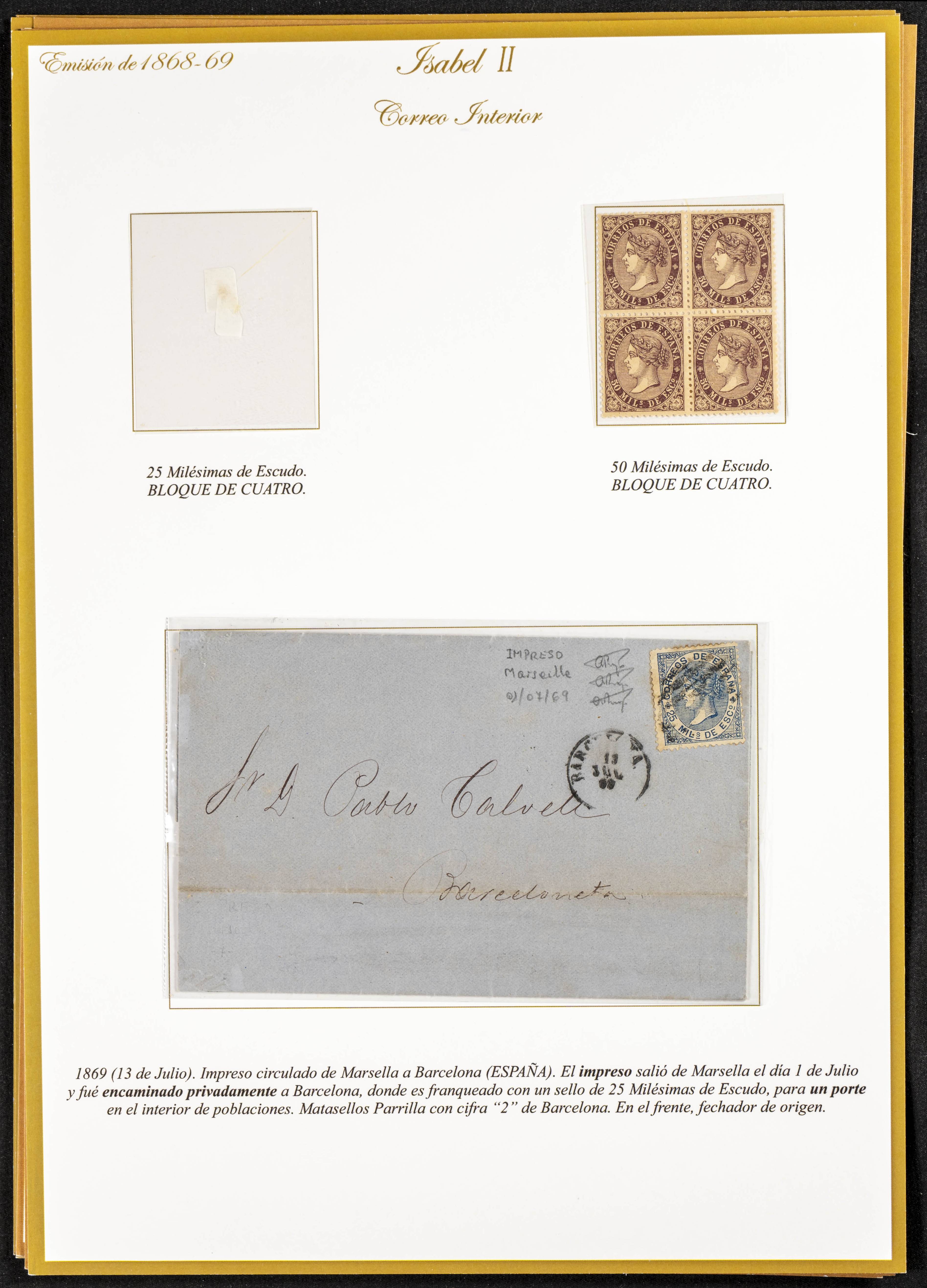 English ★/(1865ca). Spectacular remainder of a specialized collection of perforated stamps issued by Isabella II between 1865 and 1868, in mint and used condition, blocks of four and larger sizes, varieties, circulated letters, and various special postmarks. Among the letters, some addressed to the Philippines, South America, and the United States stand out, as well as several with multiple postmarks. EXAMINATION IS ESSENTIAL.