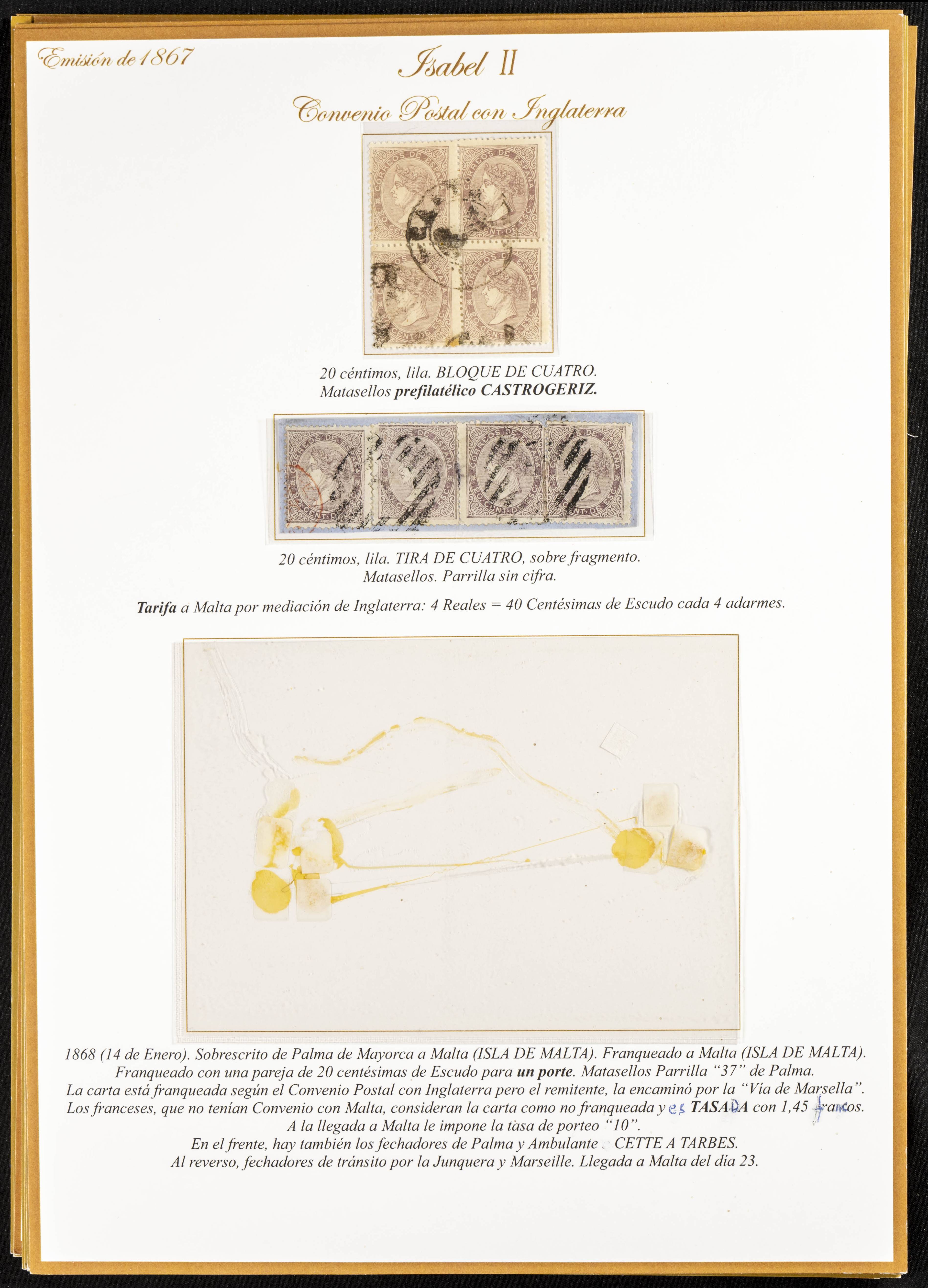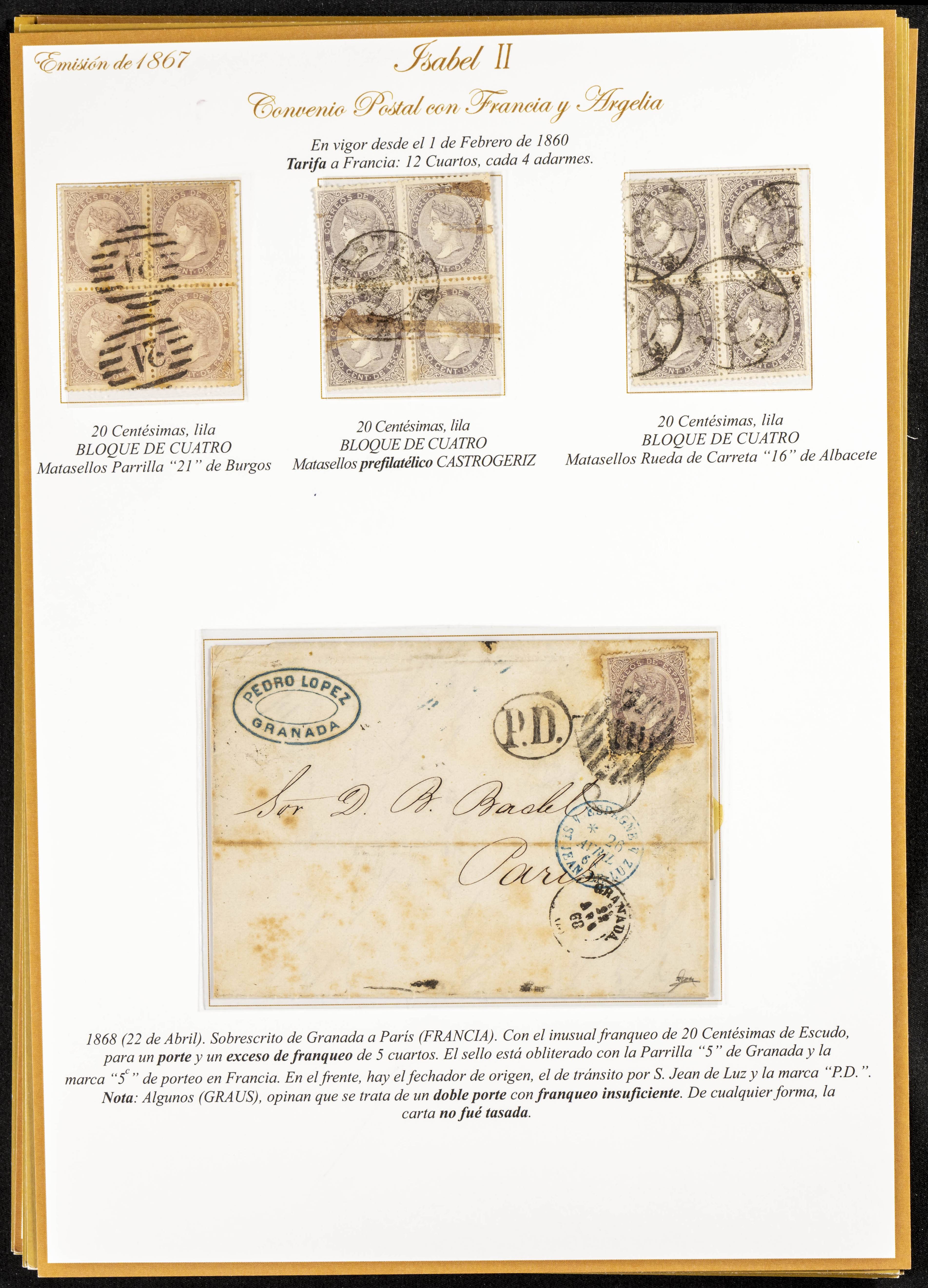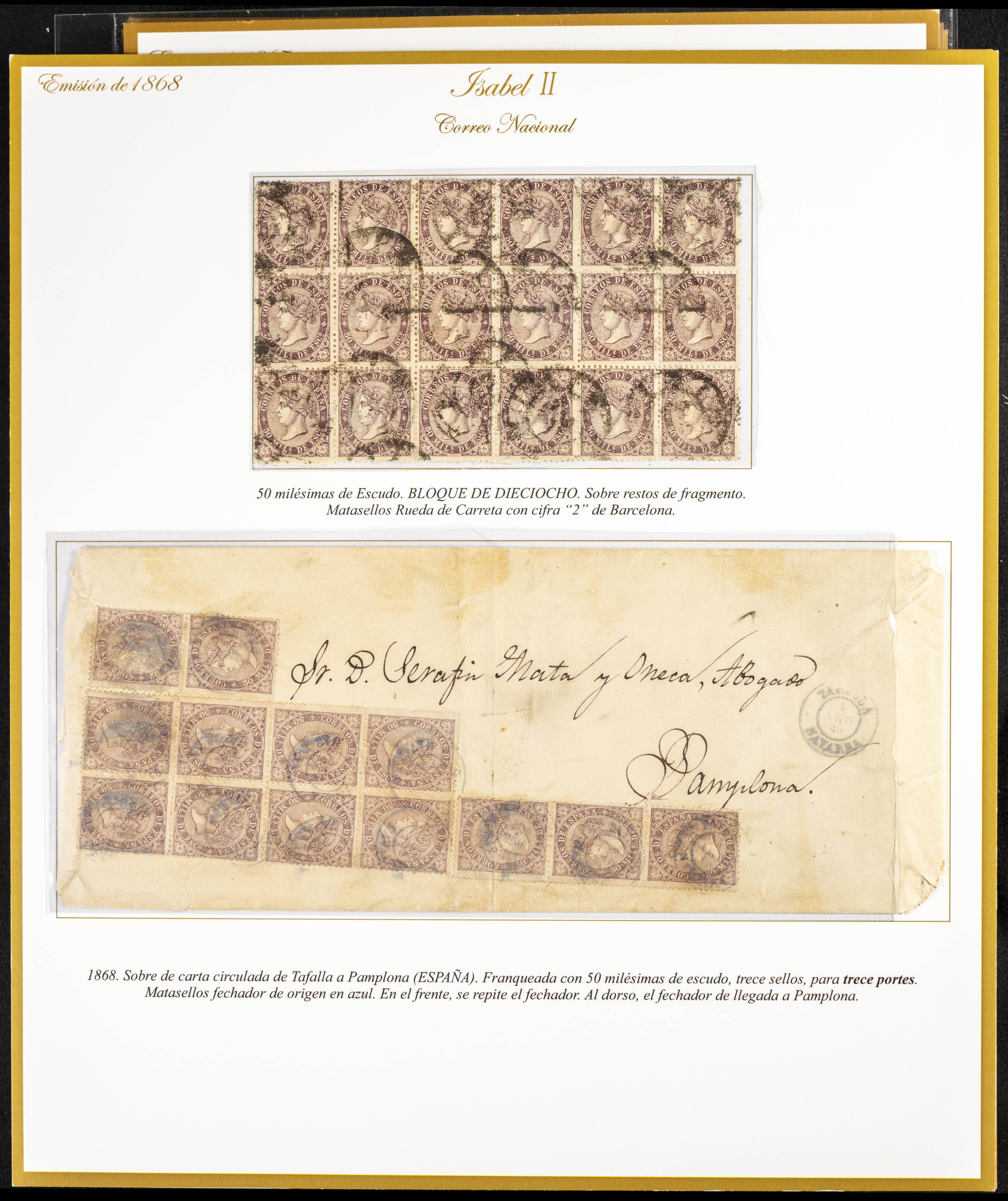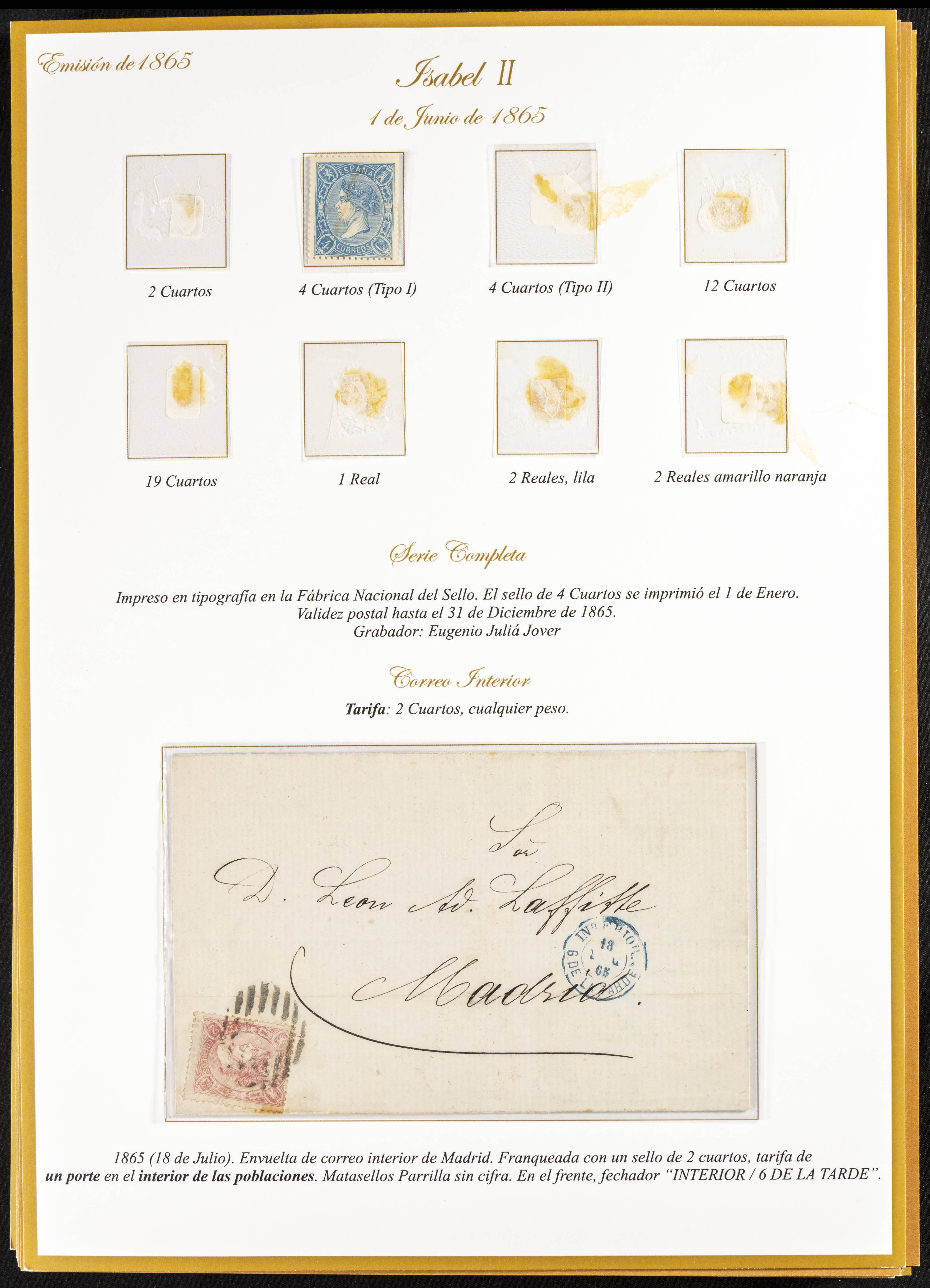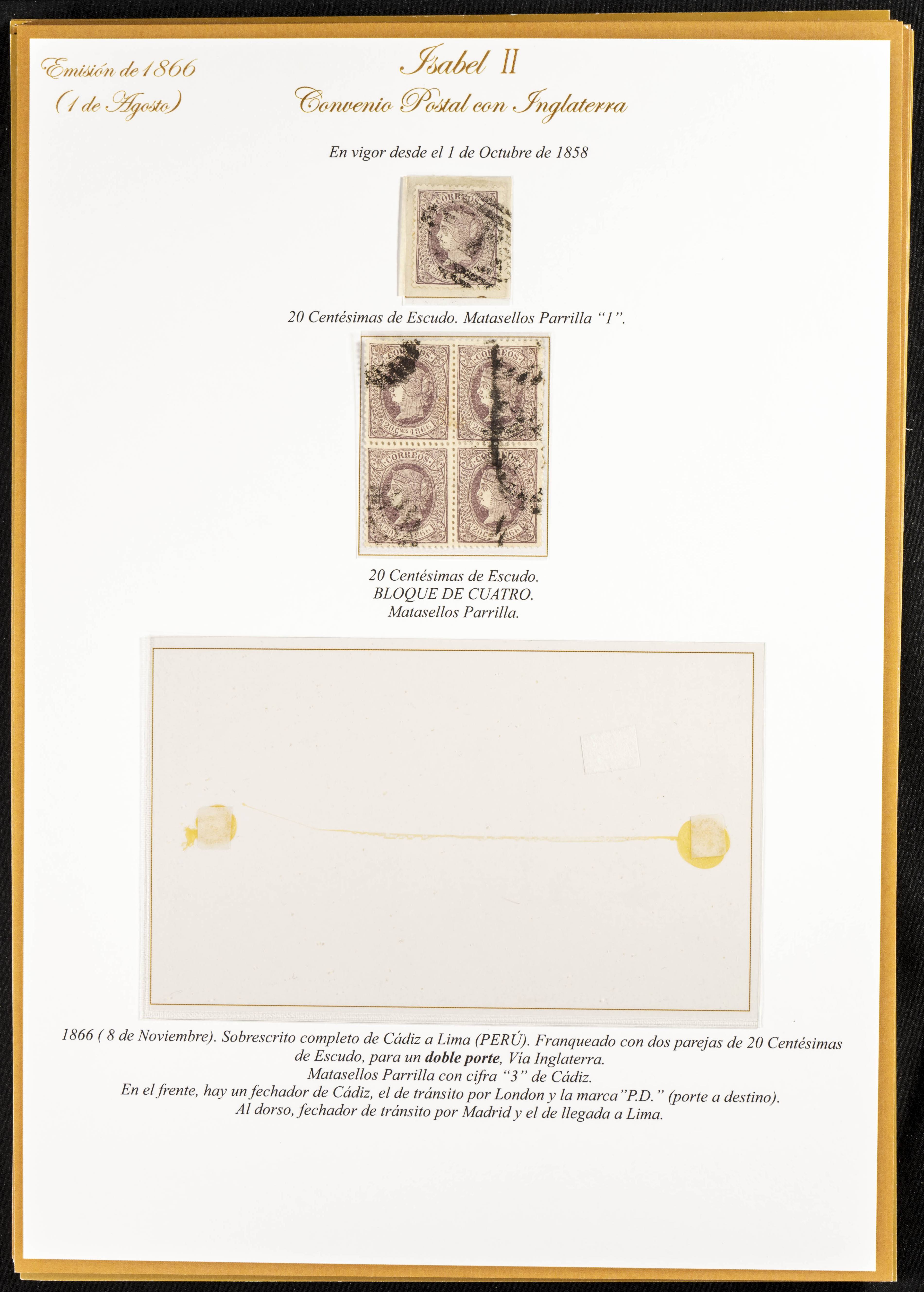 English ★/(1865ca). Spectacular remainder of a specialized collection of perforated stamps issued by Isabella II between 1865 and 1868, in mint and used condition, blocks of four and larger sizes, varieties, circulated letters, and various special postmarks. Among the letters, some addressed to the Philippines, South America, and the United States stand out, as well as several with multiple postmarks. EXAMINATION IS ESSENTIAL.