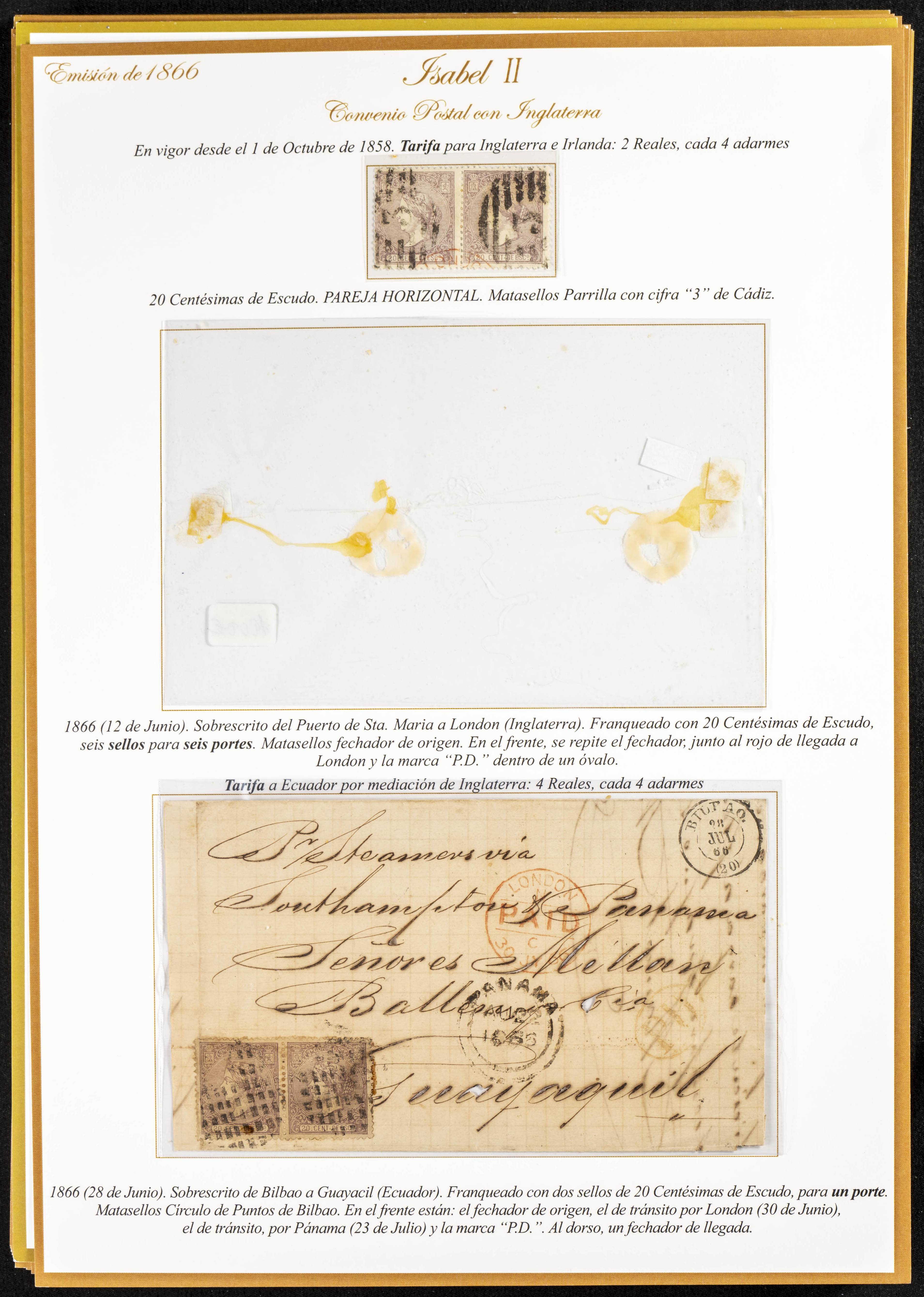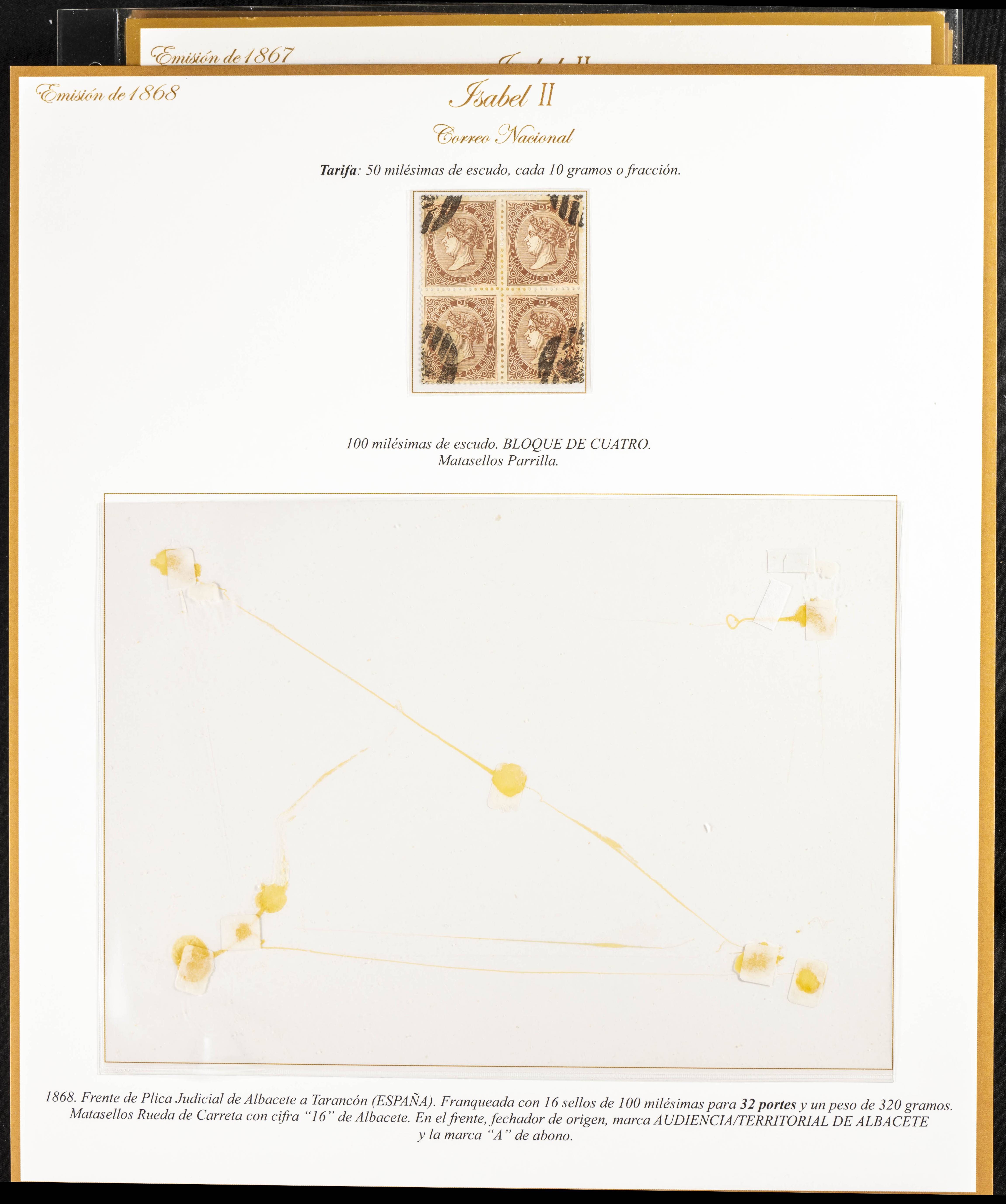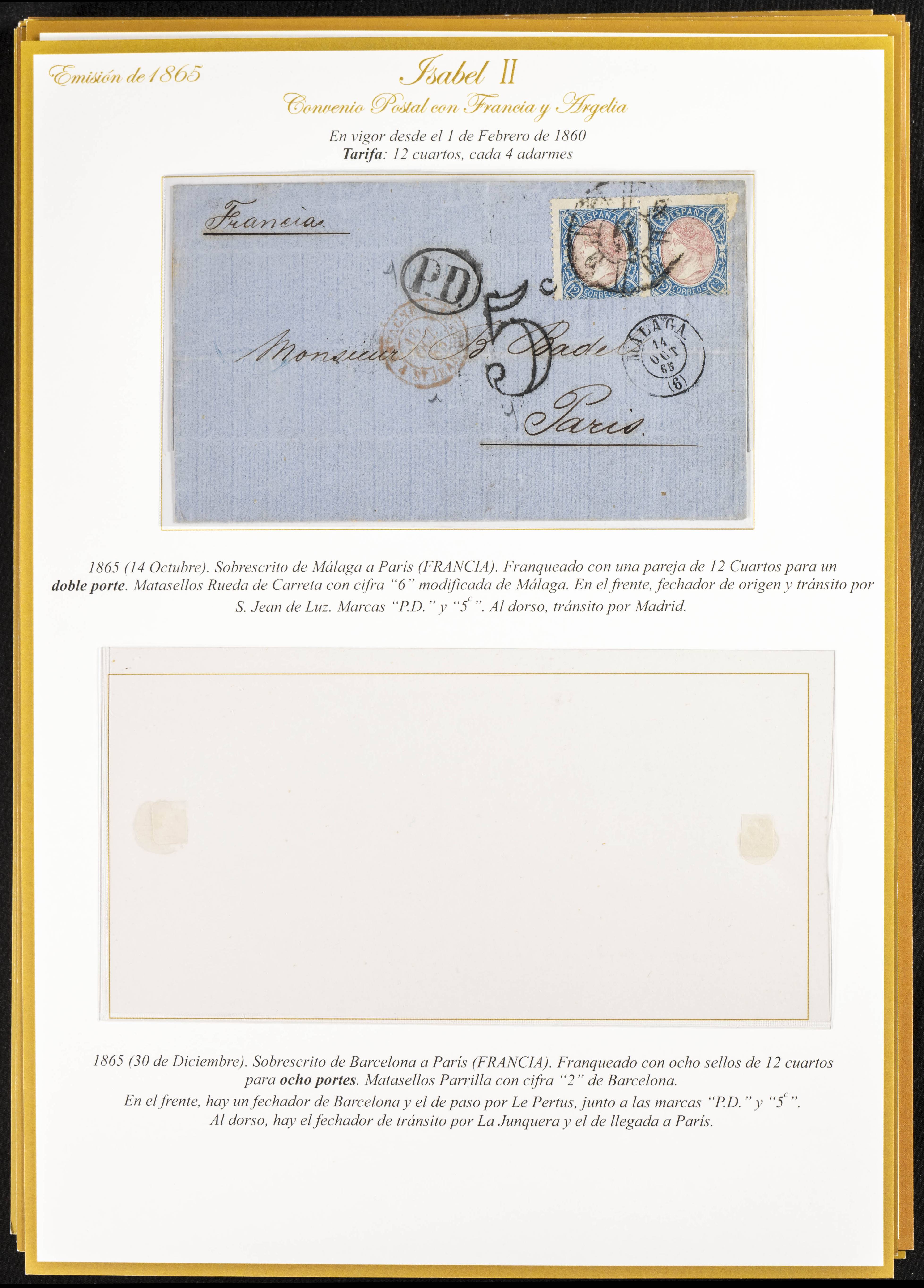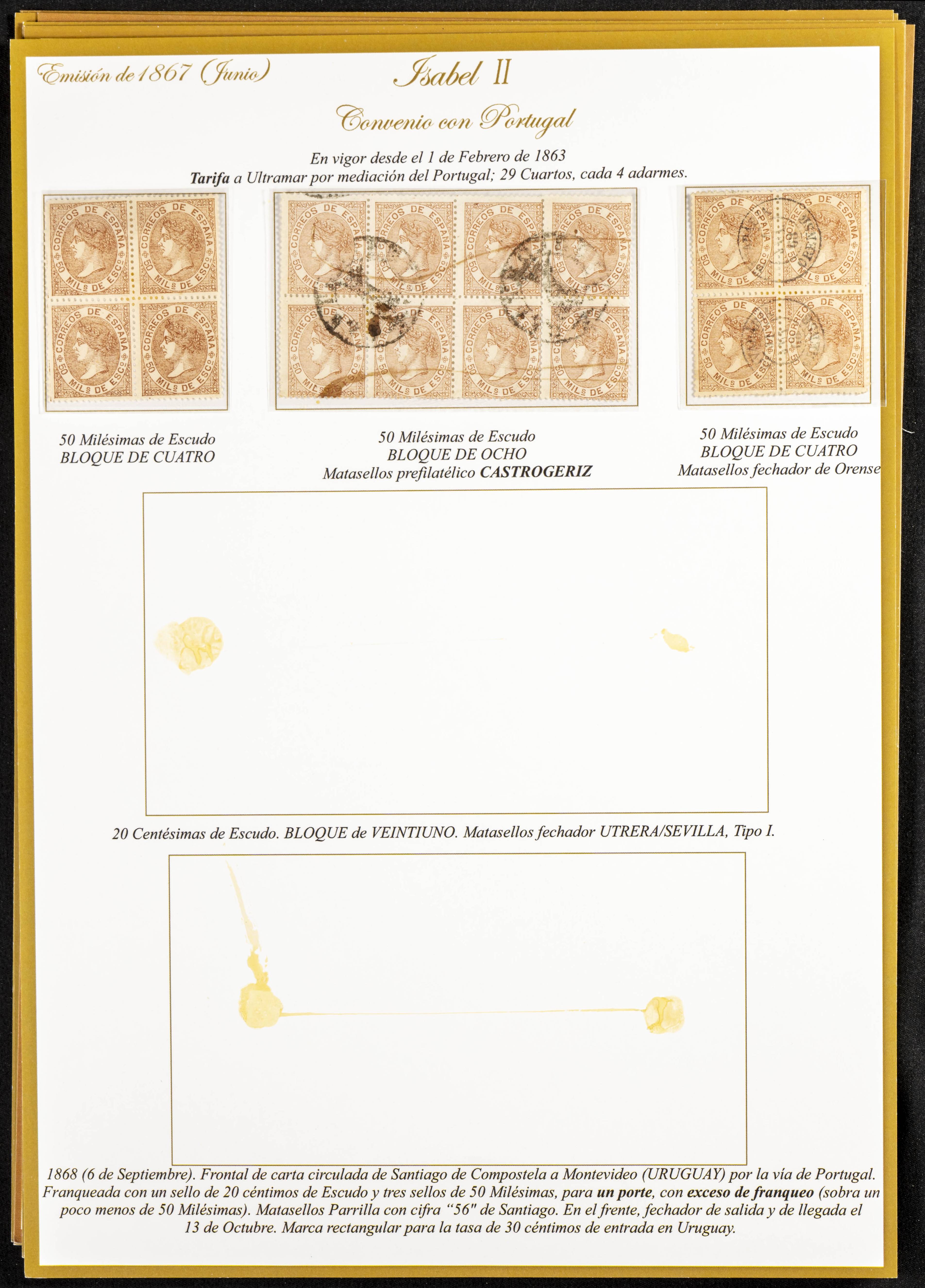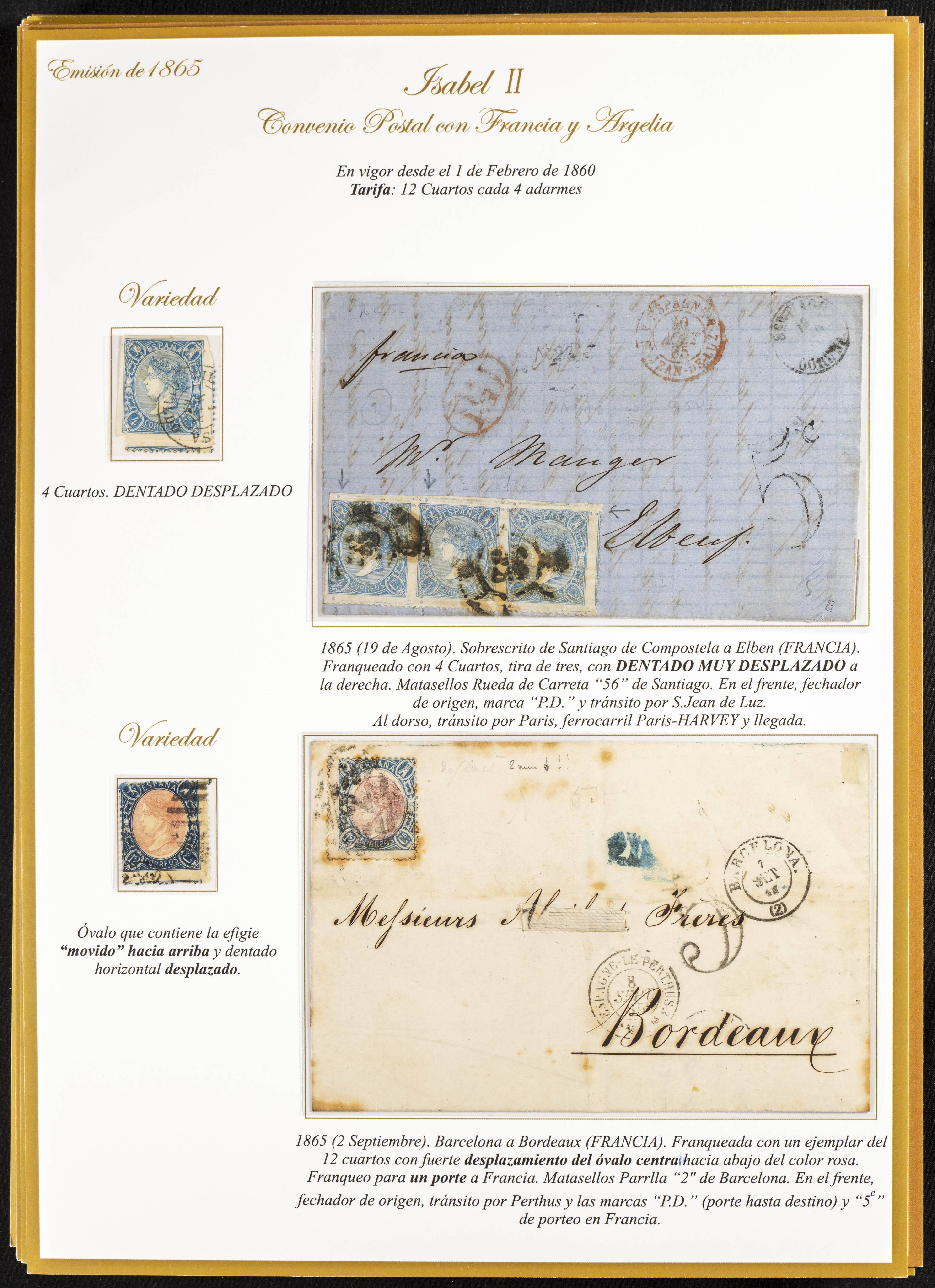 English ★/(1865ca). Spectacular remainder of a specialized collection of perforated stamps issued by Isabella II between 1865 and 1868, in mint and used condition, blocks of four and larger sizes, varieties, circulated letters, and various special postmarks. Among the letters, some addressed to the Philippines, South America, and the United States stand out, as well as several with multiple postmarks. EXAMINATION IS ESSENTIAL.