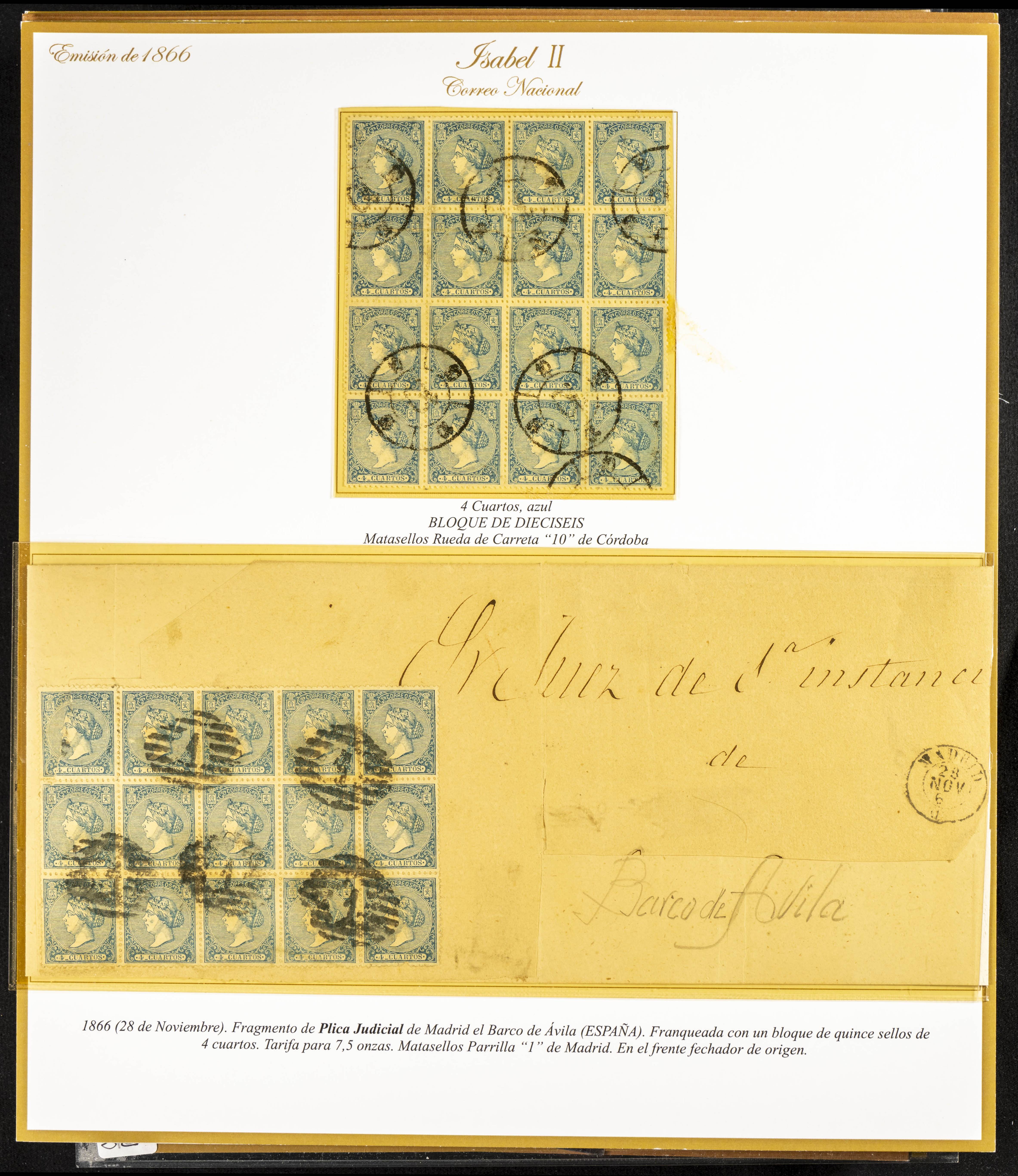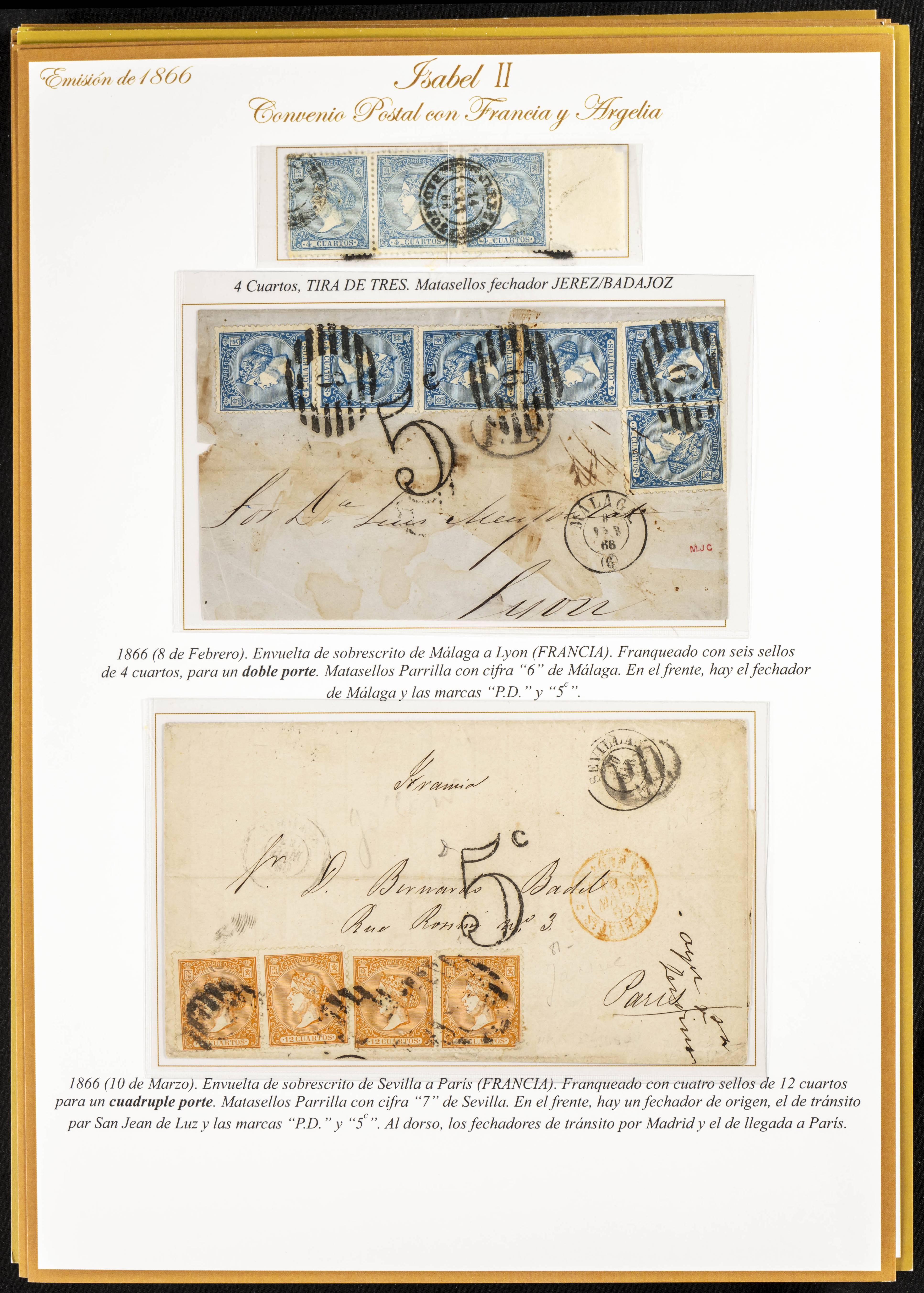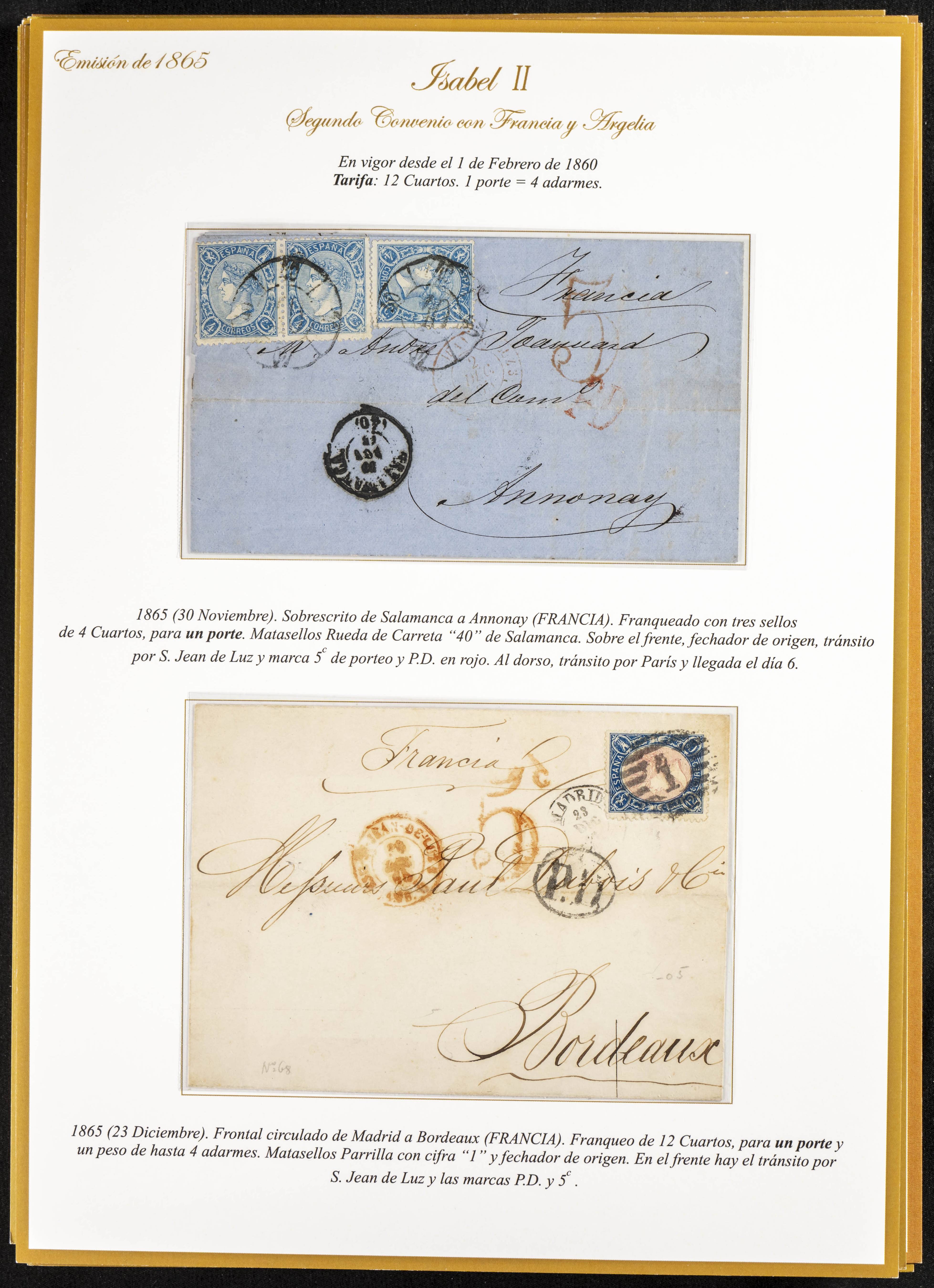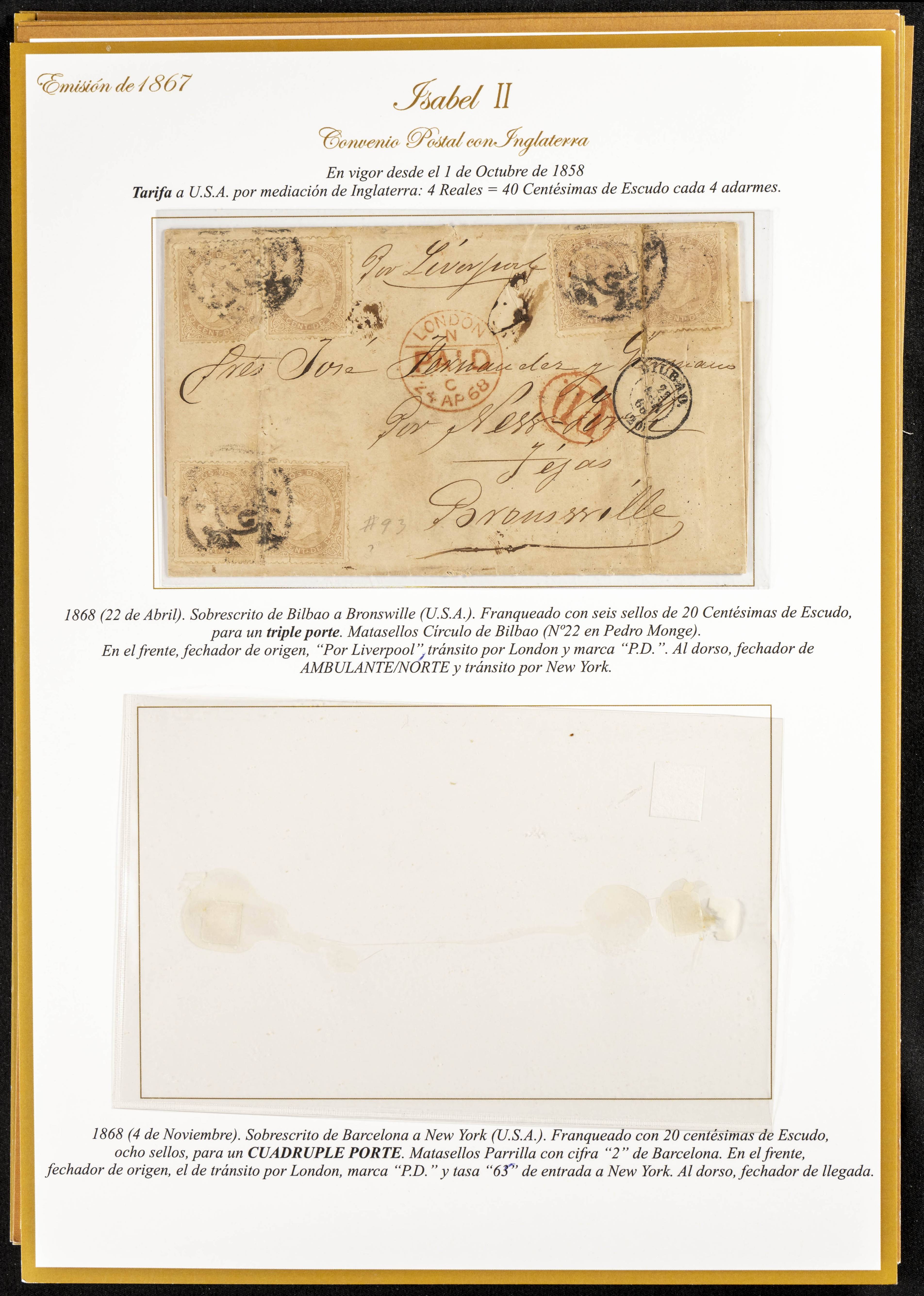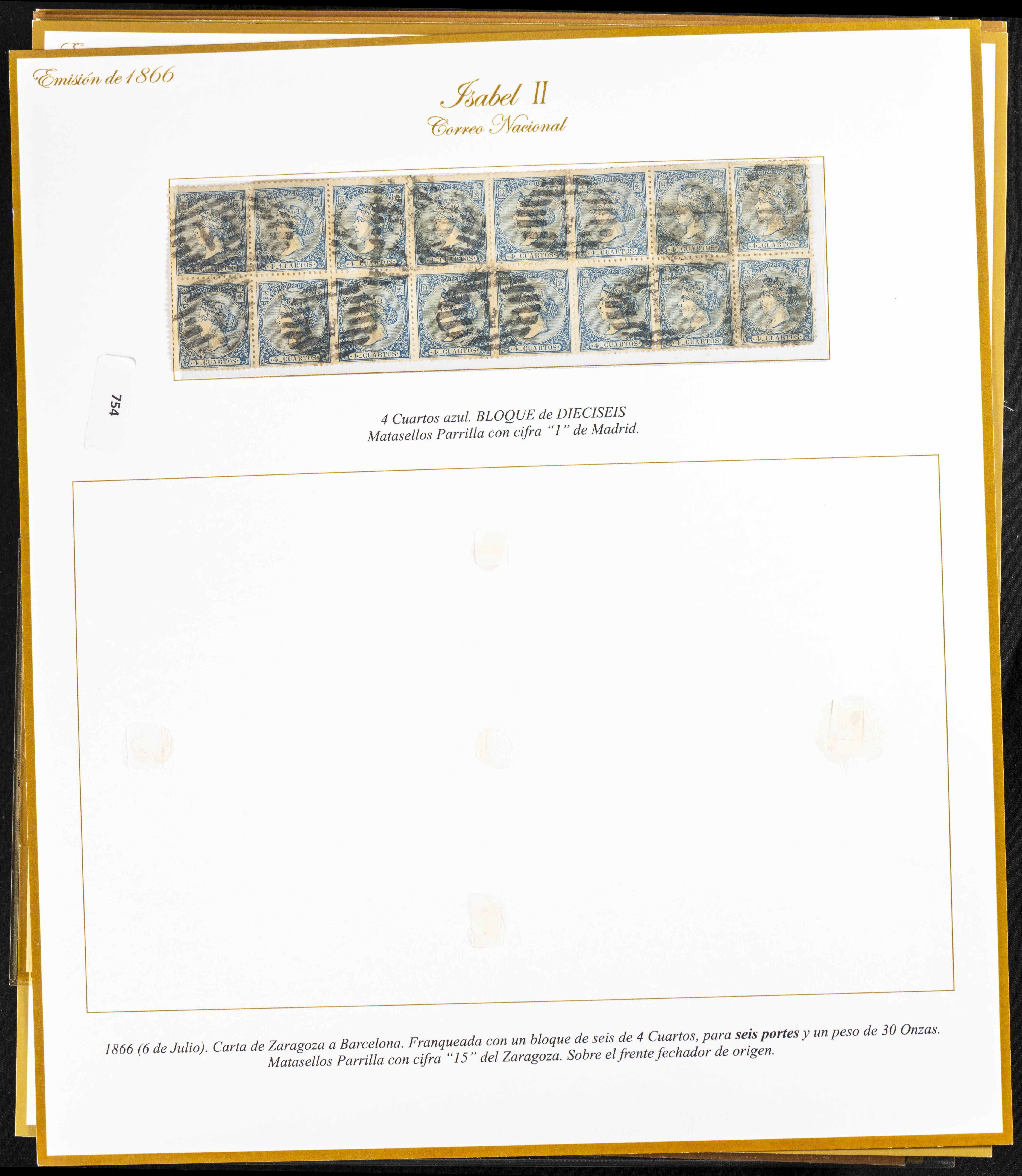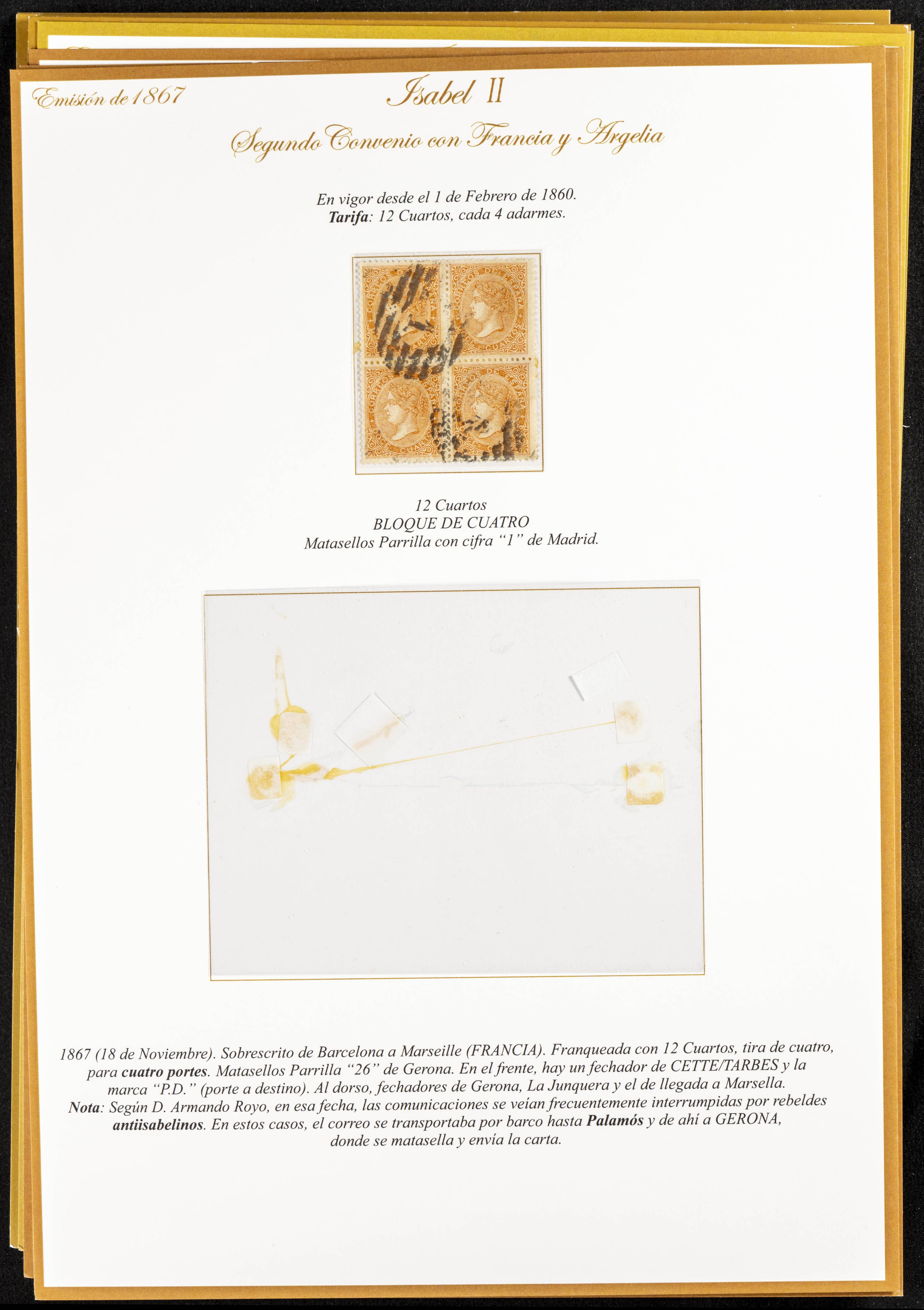 English ★/(1865ca). Spectacular remainder of a specialized collection of perforated stamps issued by Isabella II between 1865 and 1868, in mint and used condition, blocks of four and larger sizes, varieties, circulated letters, and various special postmarks. Among the letters, some addressed to the Philippines, South America, and the United States stand out, as well as several with multiple postmarks. EXAMINATION IS ESSENTIAL.