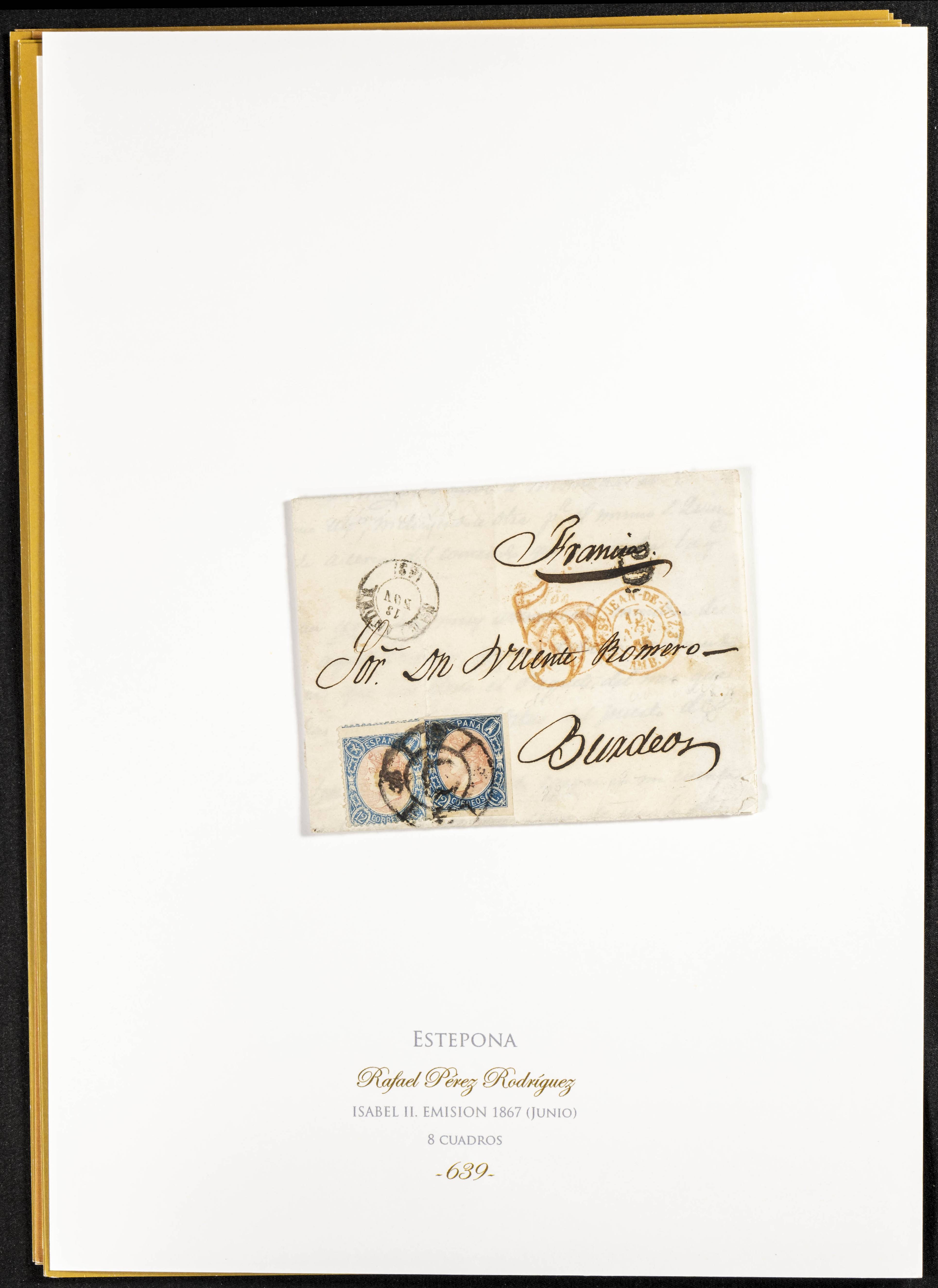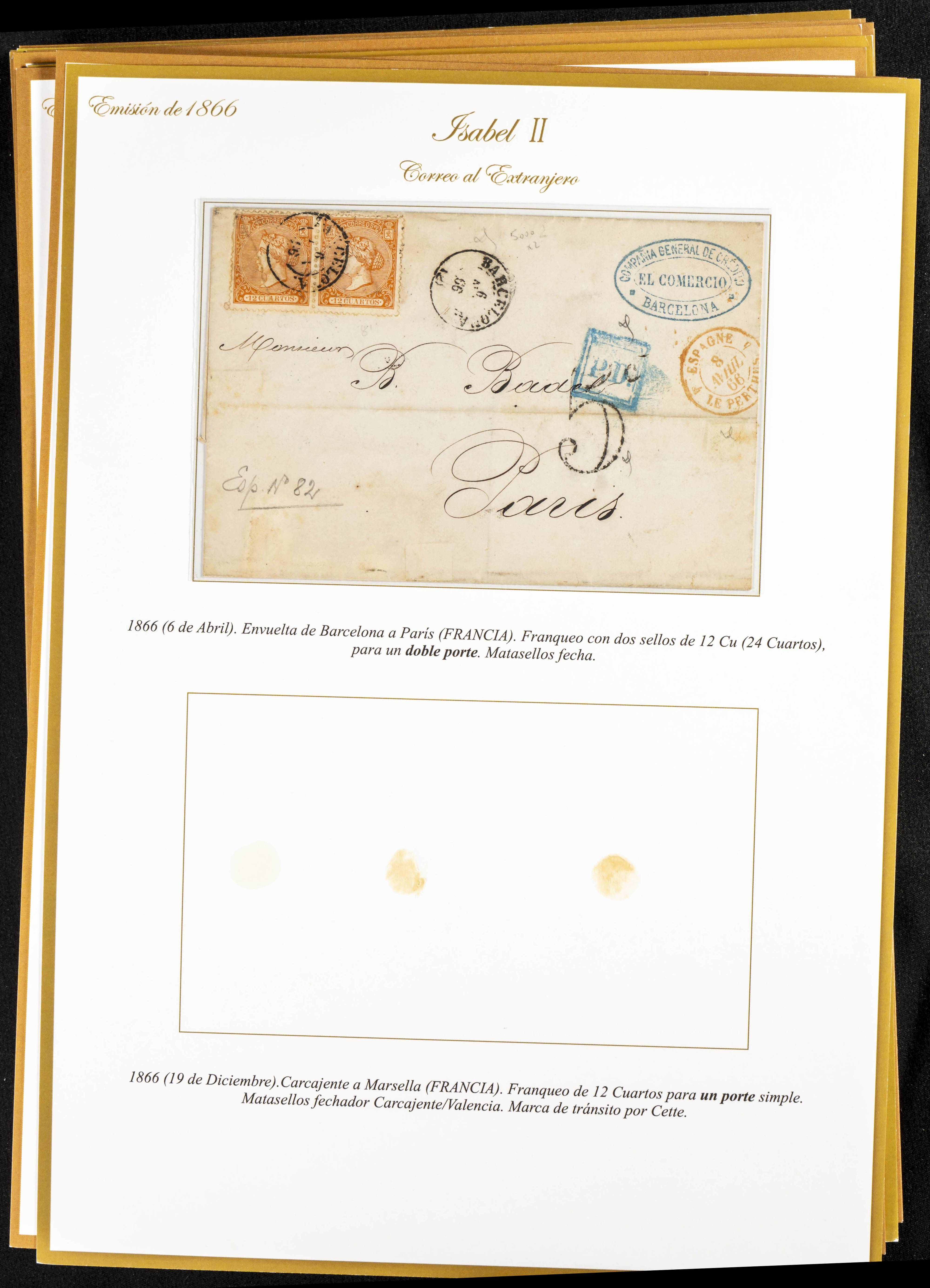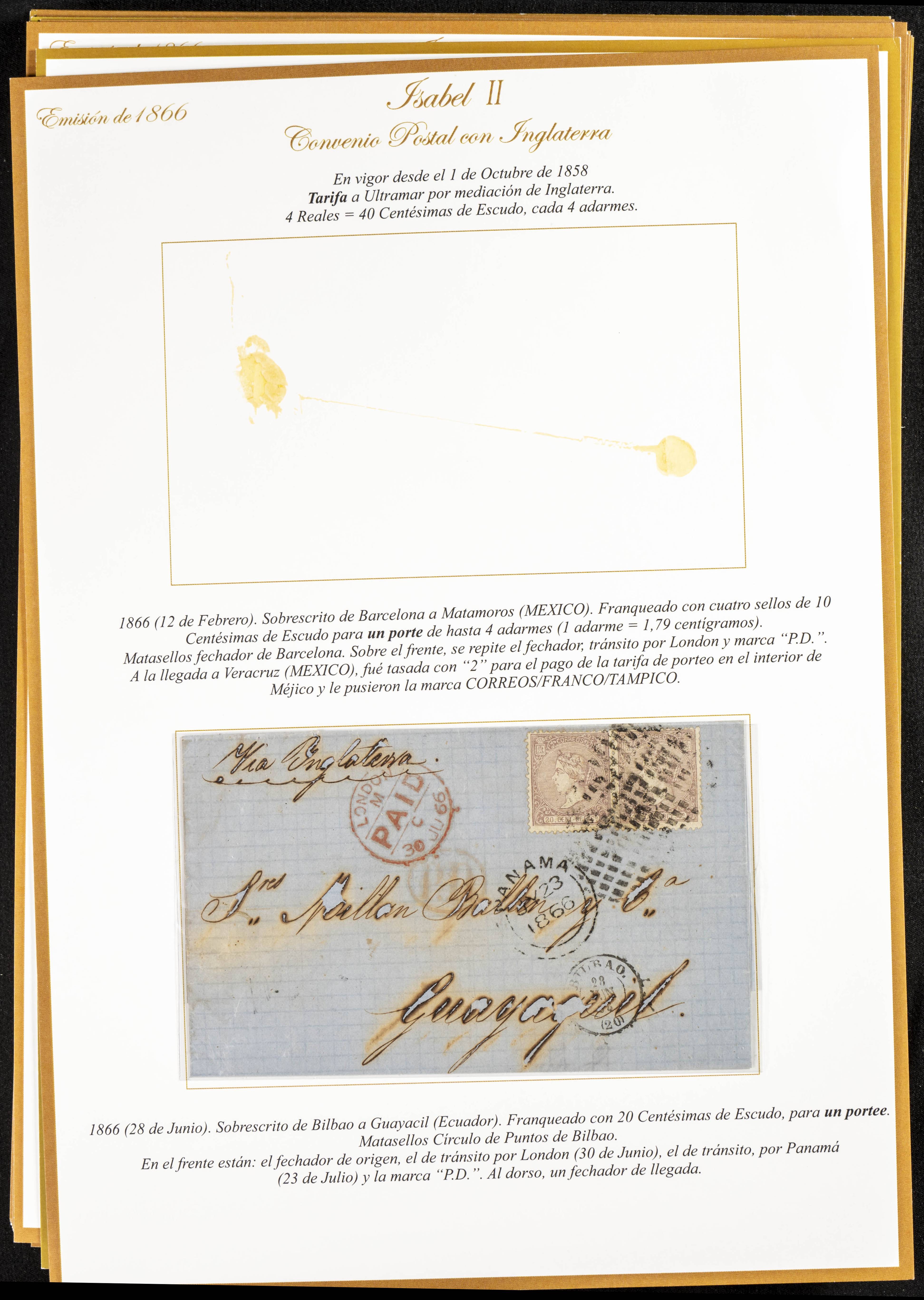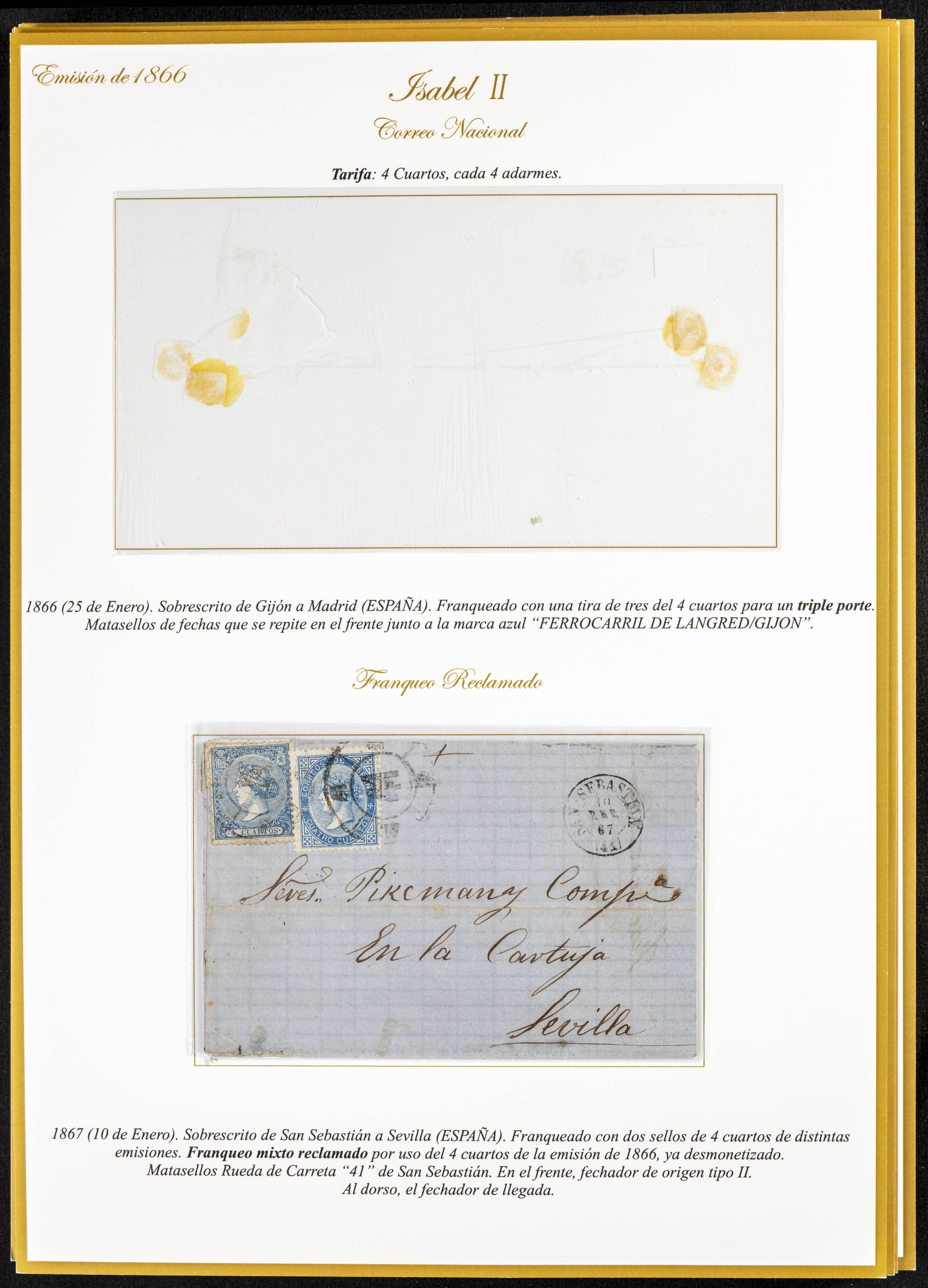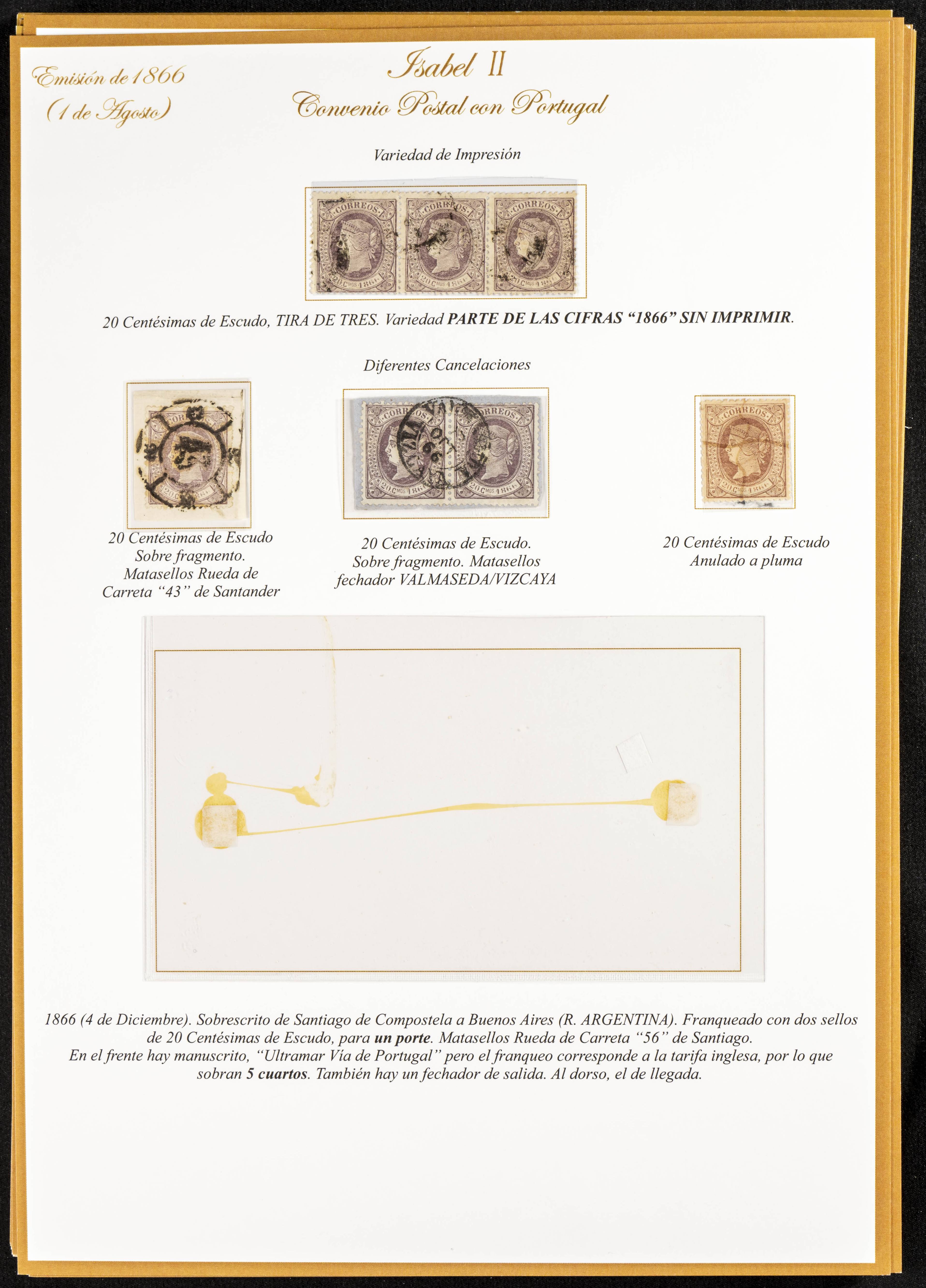 English ★/(1865ca). Spectacular remainder of a specialized collection of perforated stamps issued by Isabella II between 1865 and 1868, in mint and used condition, blocks of four and larger sizes, varieties, circulated letters, and various special postmarks. Among the letters, some addressed to the Philippines, South America, and the United States stand out, as well as several with multiple postmarks. EXAMINATION IS ESSENTIAL.