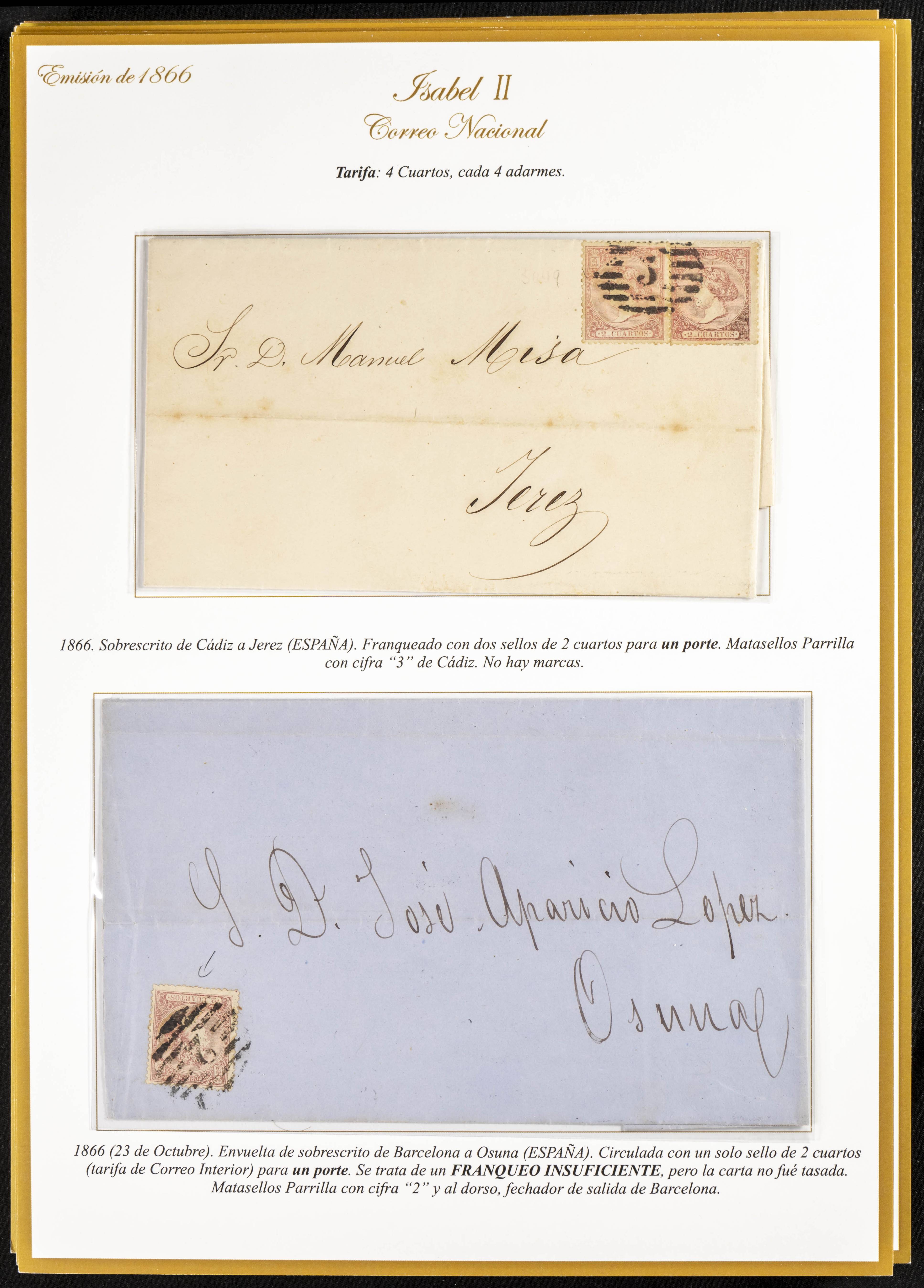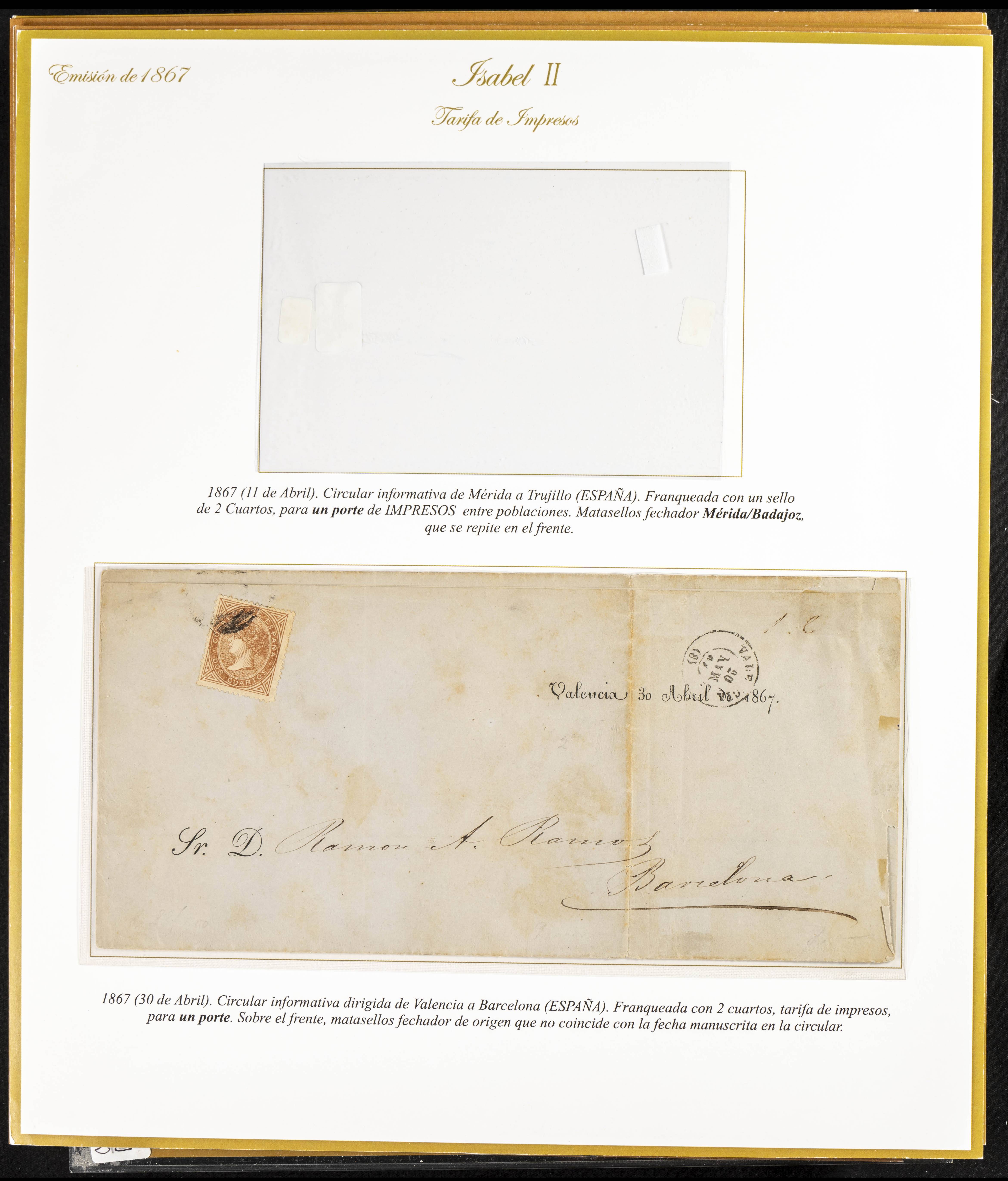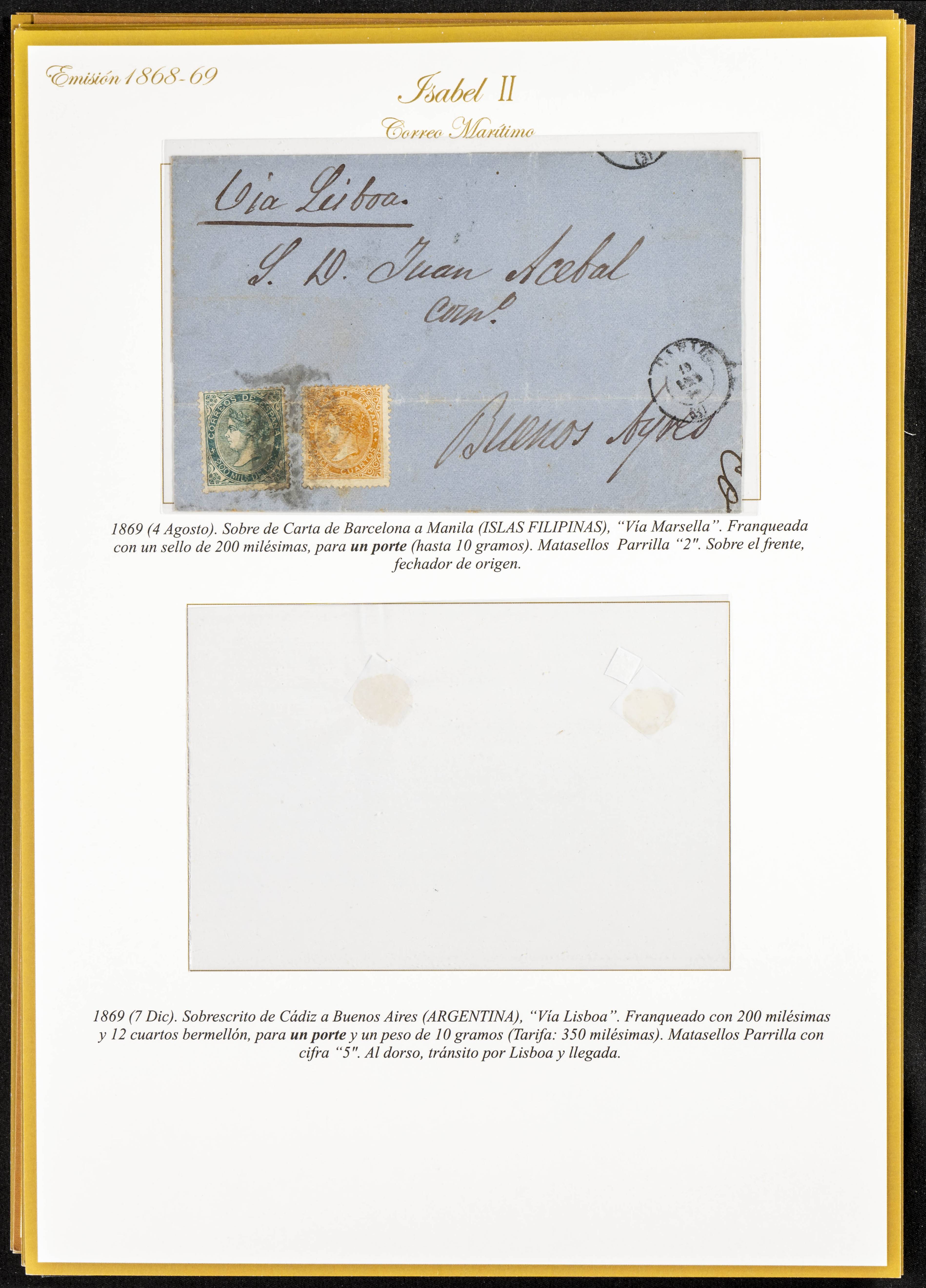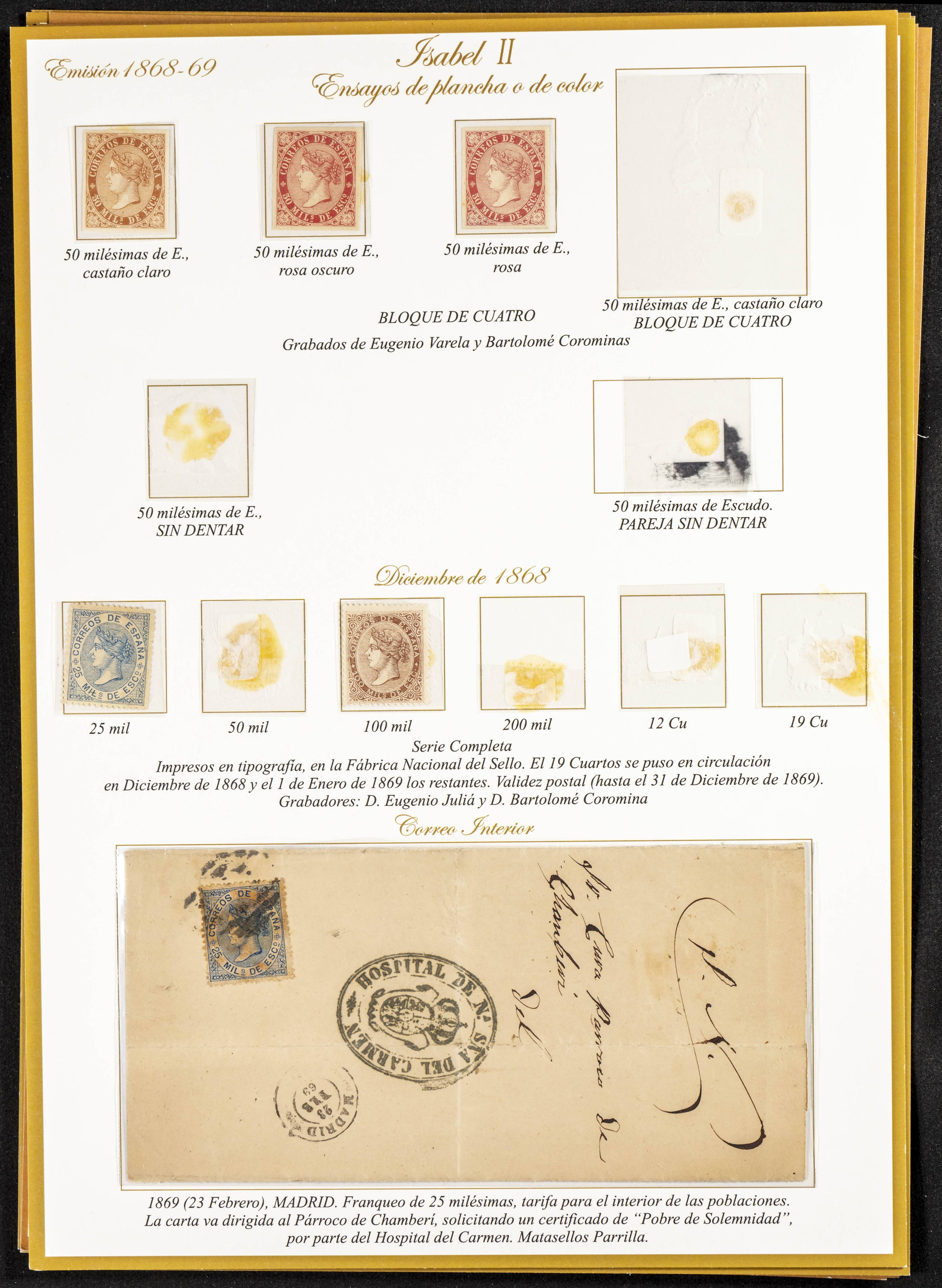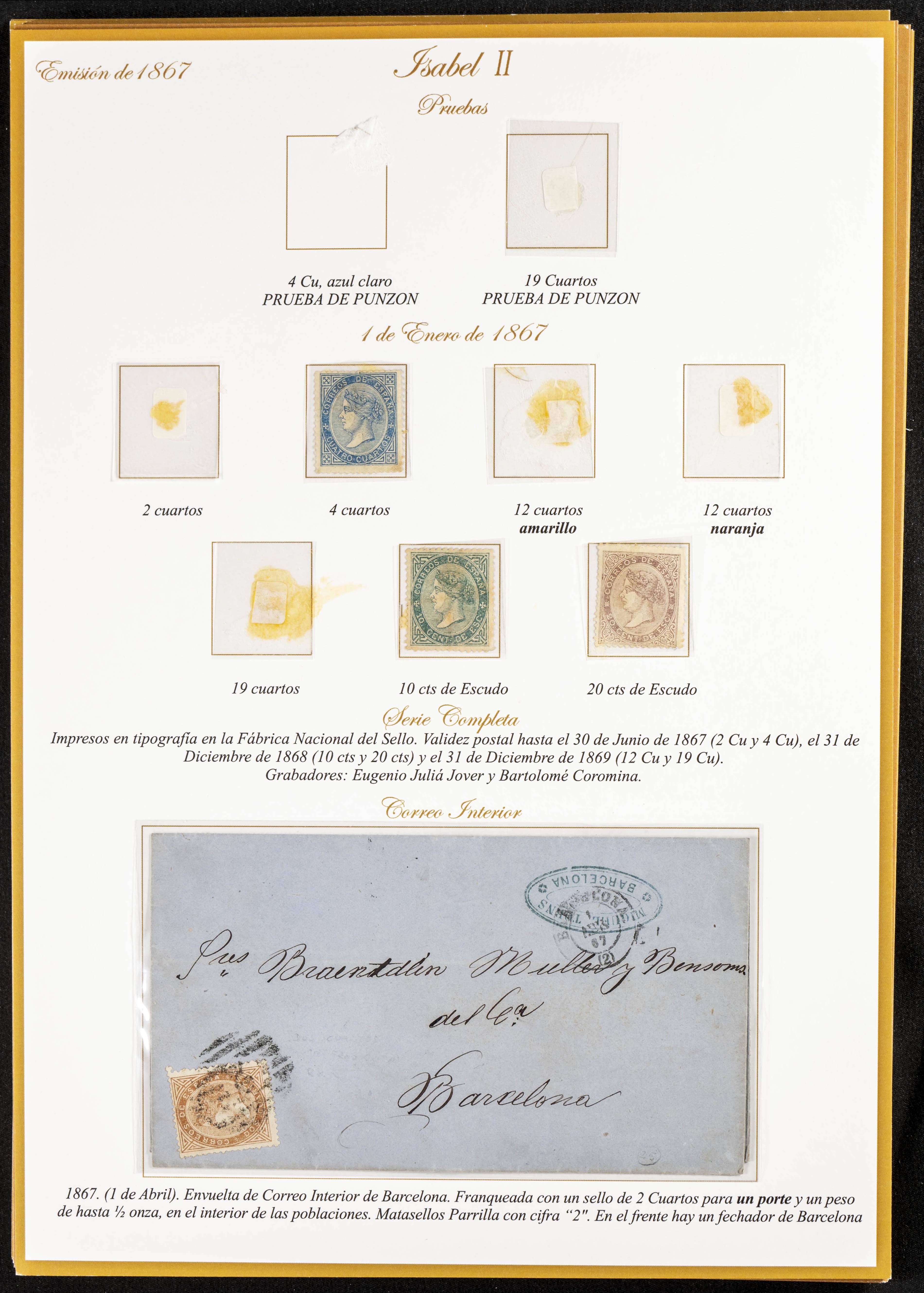 English ★/(1865ca). Spectacular remainder of a specialized collection of perforated stamps issued by Isabella II between 1865 and 1868, in mint and used condition, blocks of four and larger sizes, varieties, circulated letters, and various special postmarks. Among the letters, some addressed to the Philippines, South America, and the United States stand out, as well as several with multiple postmarks. EXAMINATION IS ESSENTIAL.