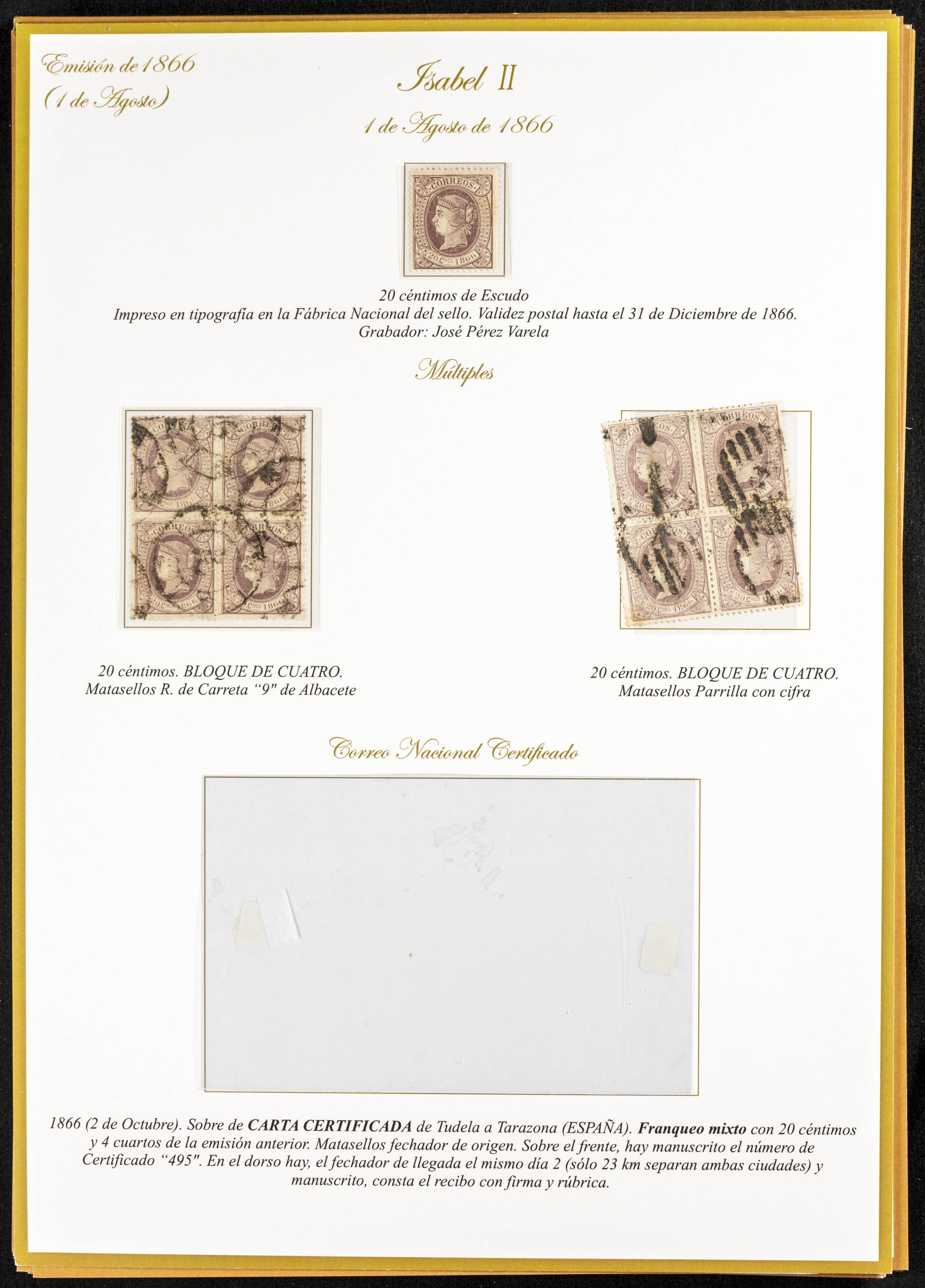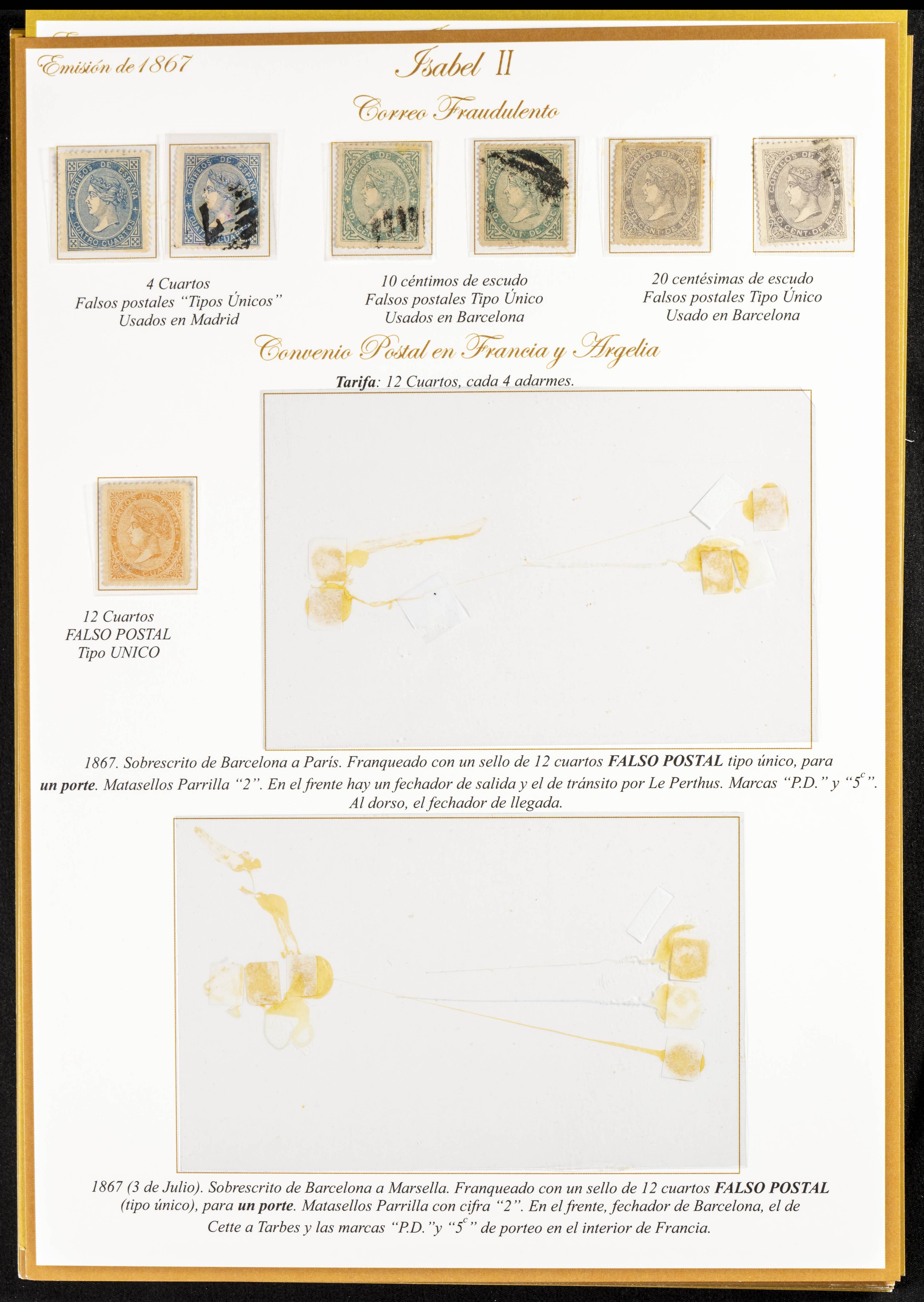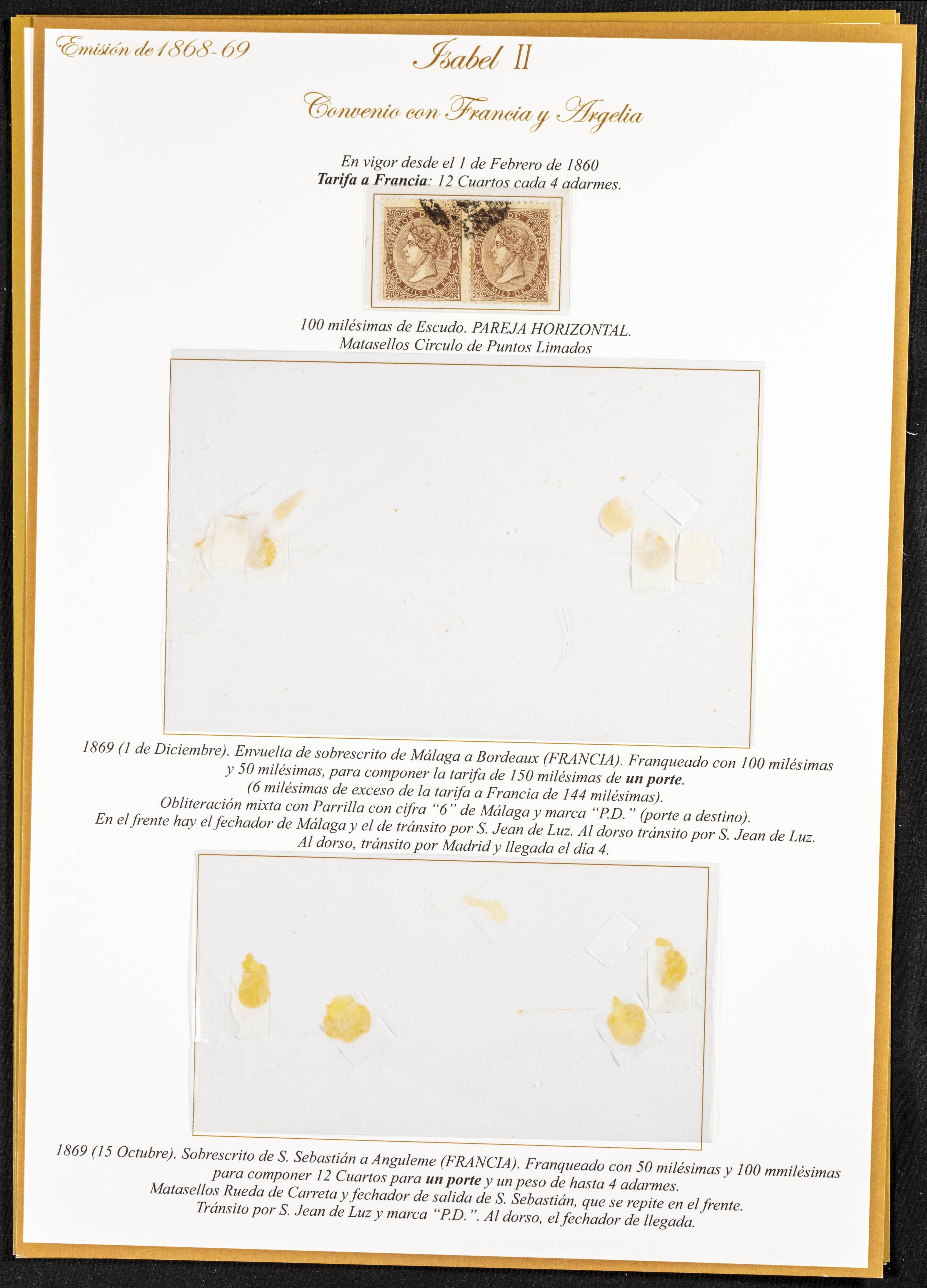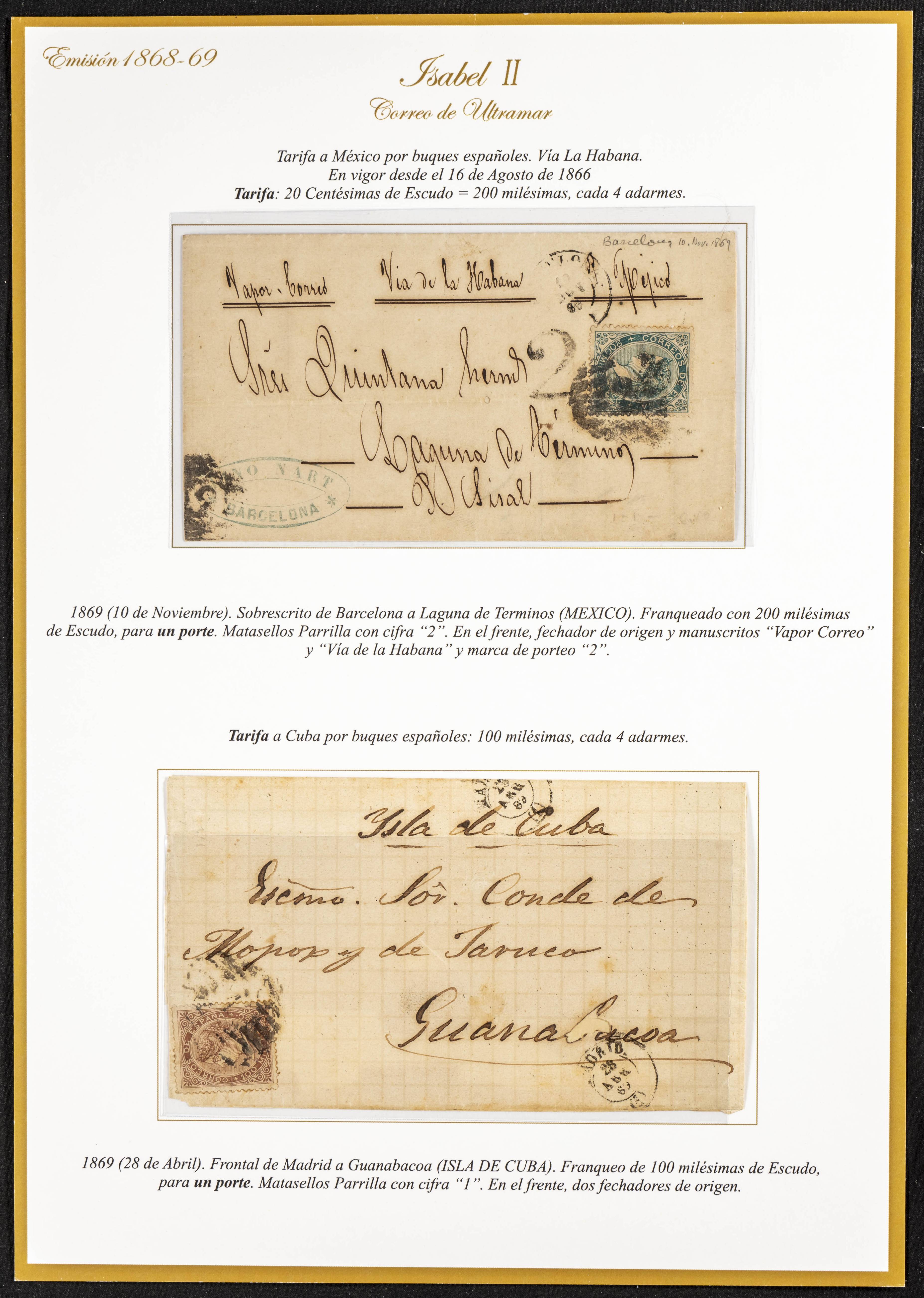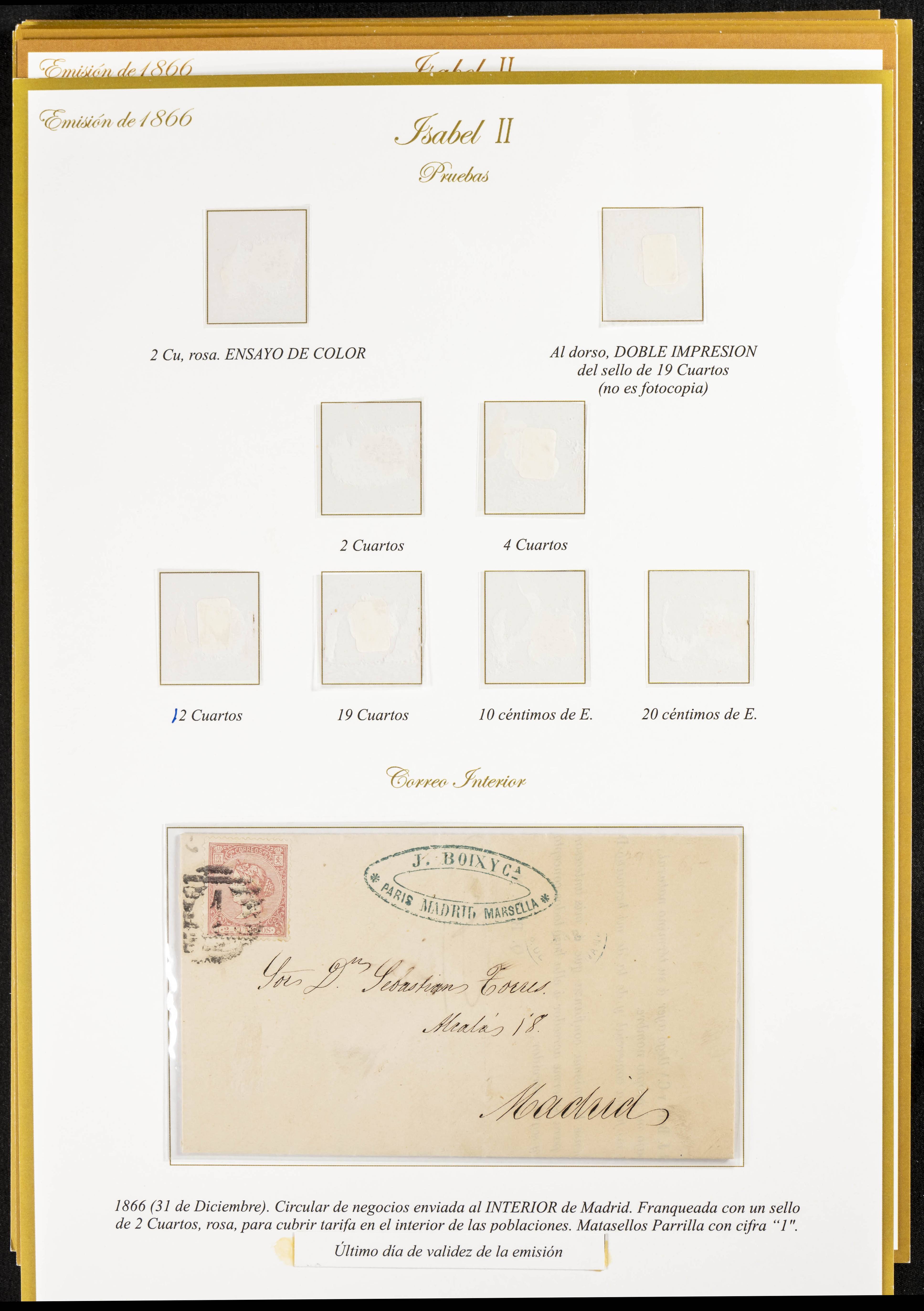 English ★/(1865ca). Spectacular remainder of a specialized collection of perforated stamps issued by Isabella II between 1865 and 1868, in mint and used condition, blocks of four and larger sizes, varieties, circulated letters, and various special postmarks. Among the letters, some addressed to the Philippines, South America, and the United States stand out, as well as several with multiple postmarks. EXAMINATION IS ESSENTIAL.