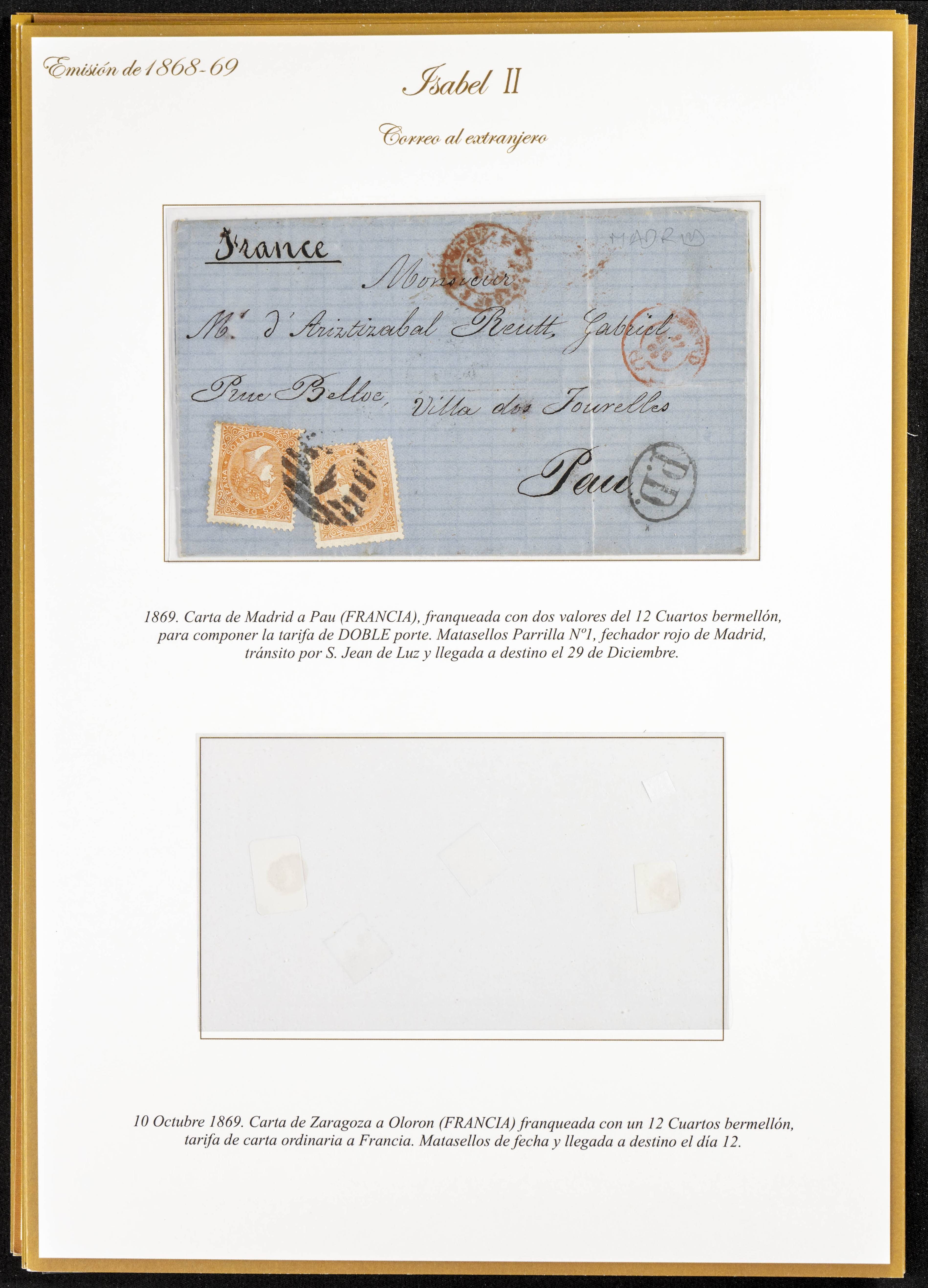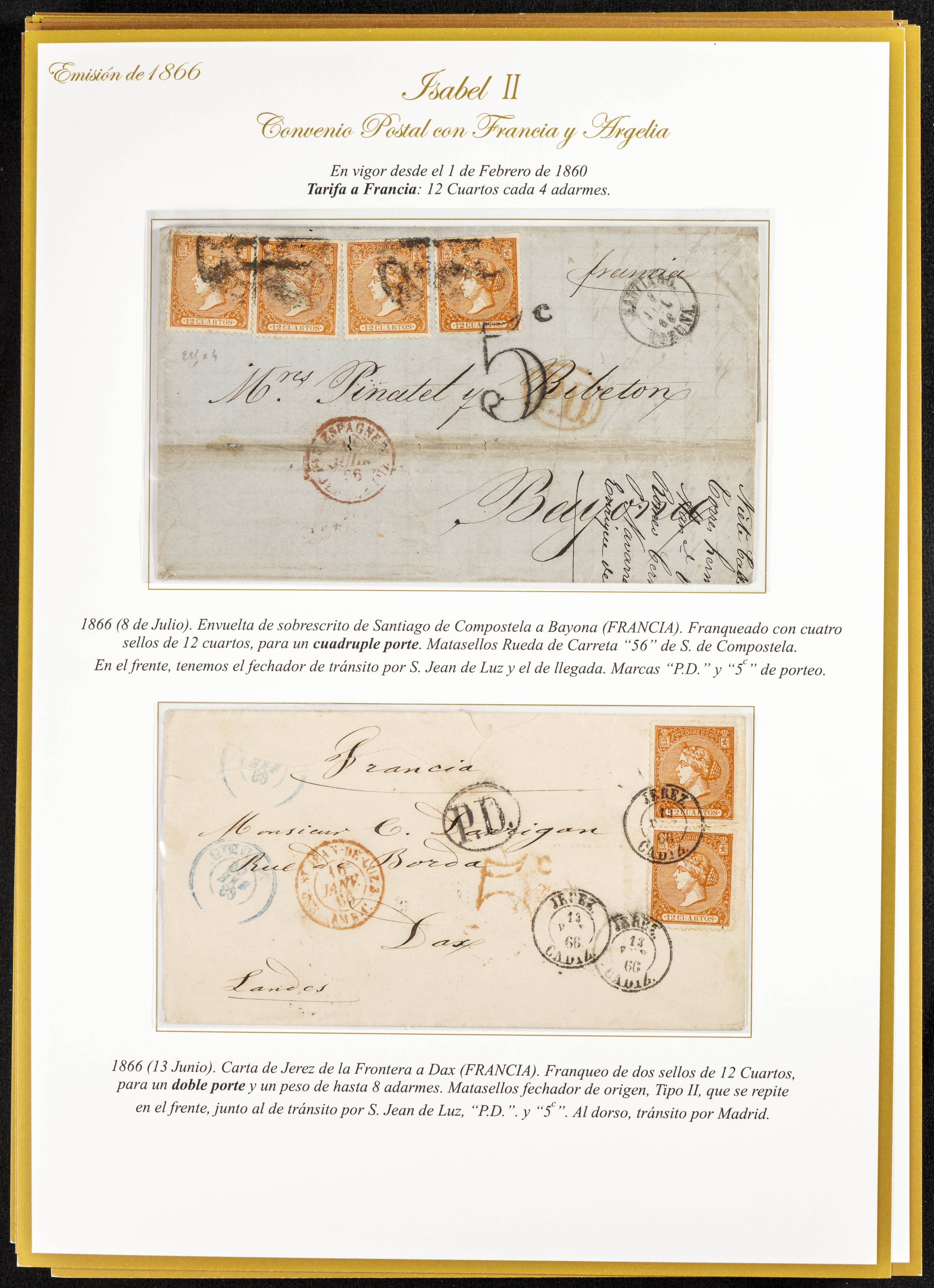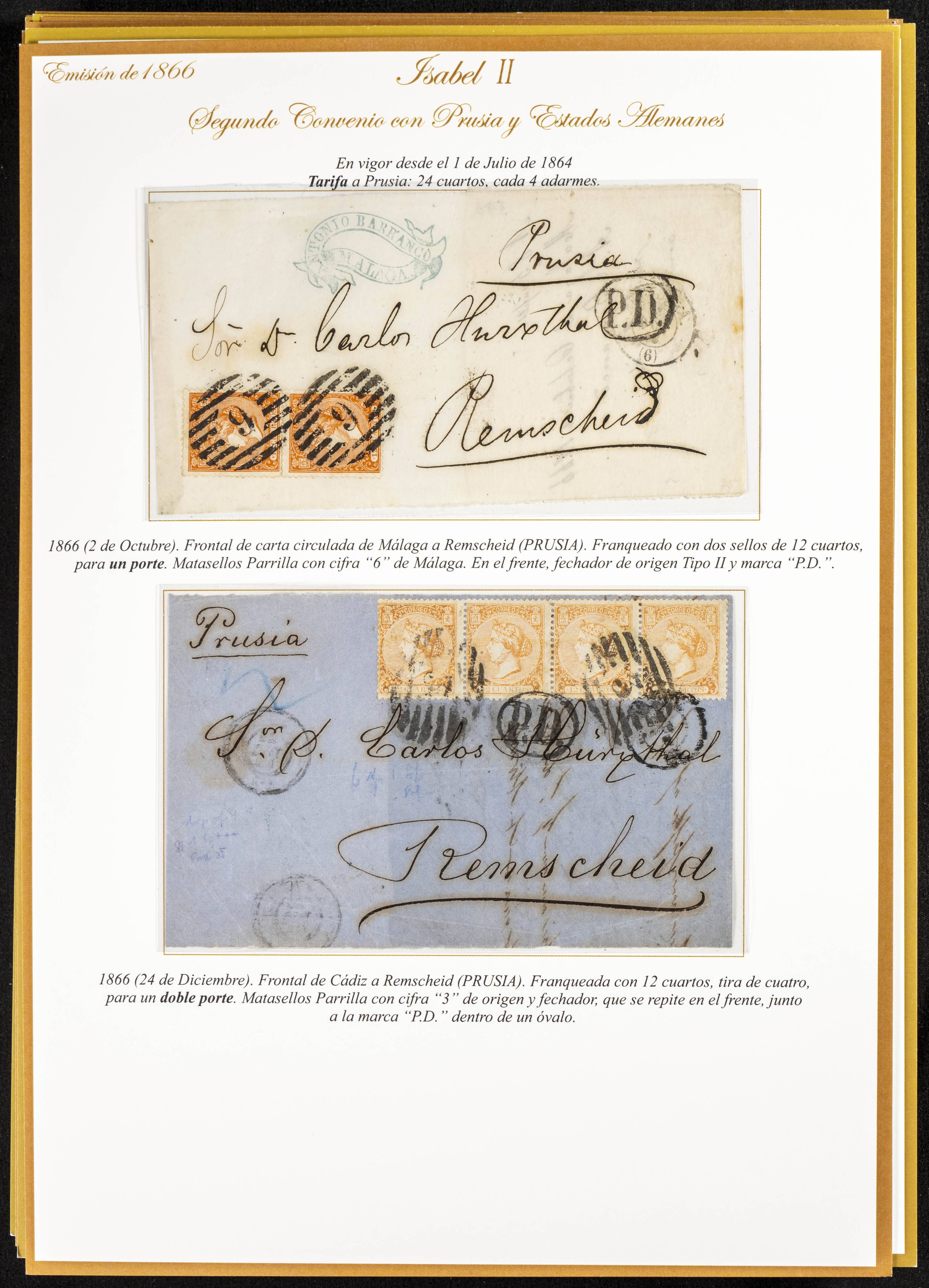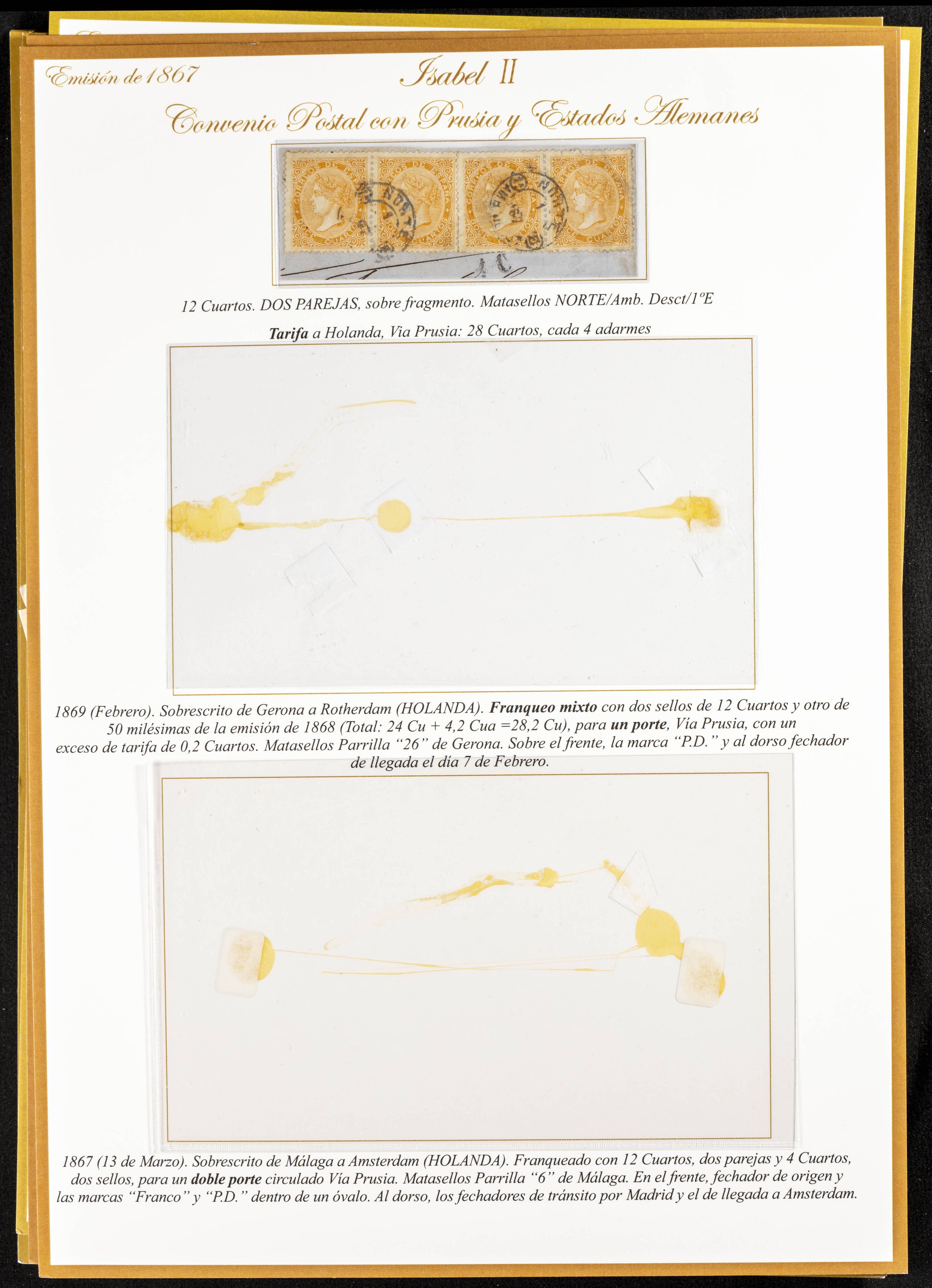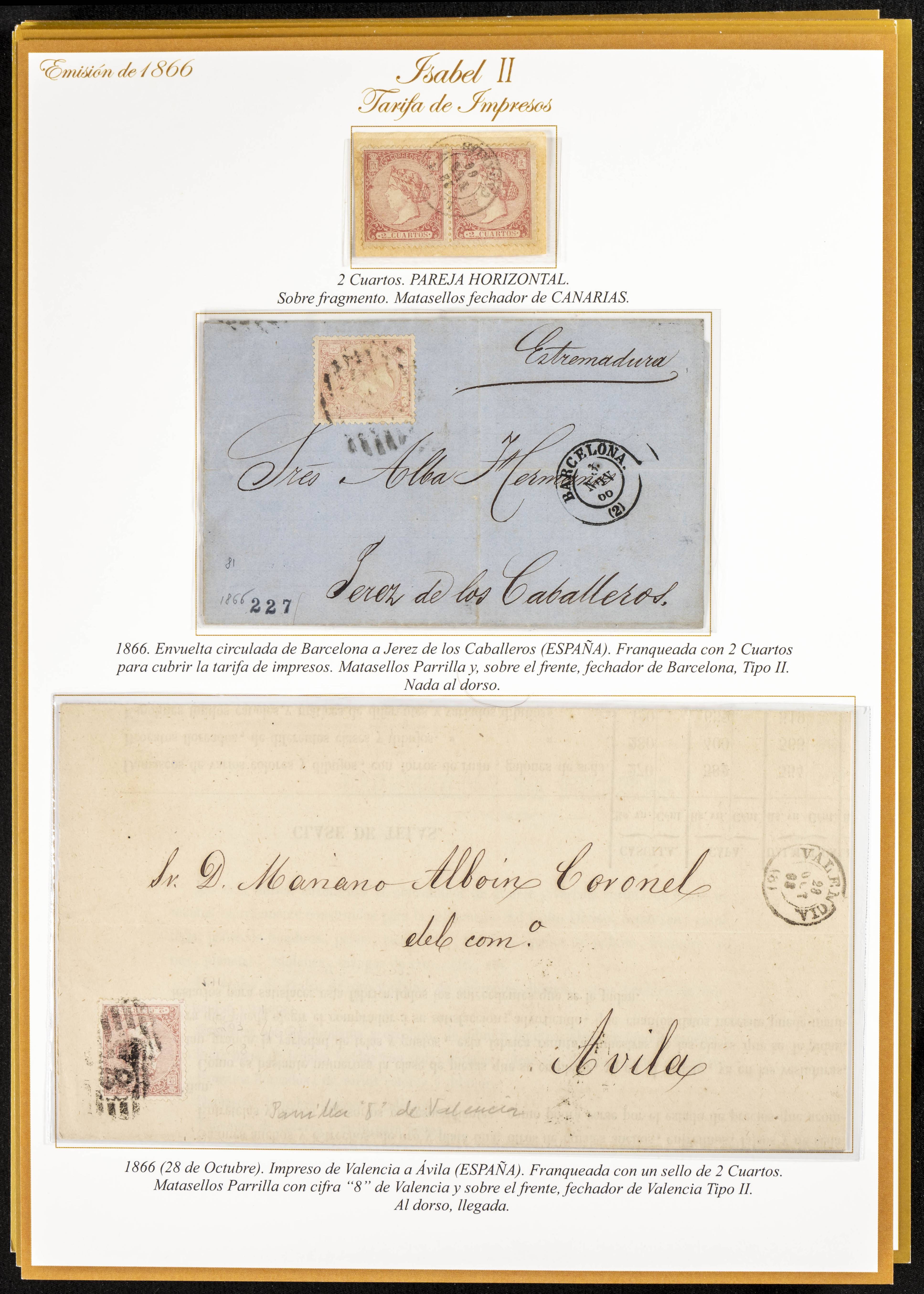 English ★/(1865ca). Spectacular remainder of a specialized collection of perforated stamps issued by Isabella II between 1865 and 1868, in mint and used condition, blocks of four and larger sizes, varieties, circulated letters, and various special postmarks. Among the letters, some addressed to the Philippines, South America, and the United States stand out, as well as several with multiple postmarks. EXAMINATION IS ESSENTIAL.