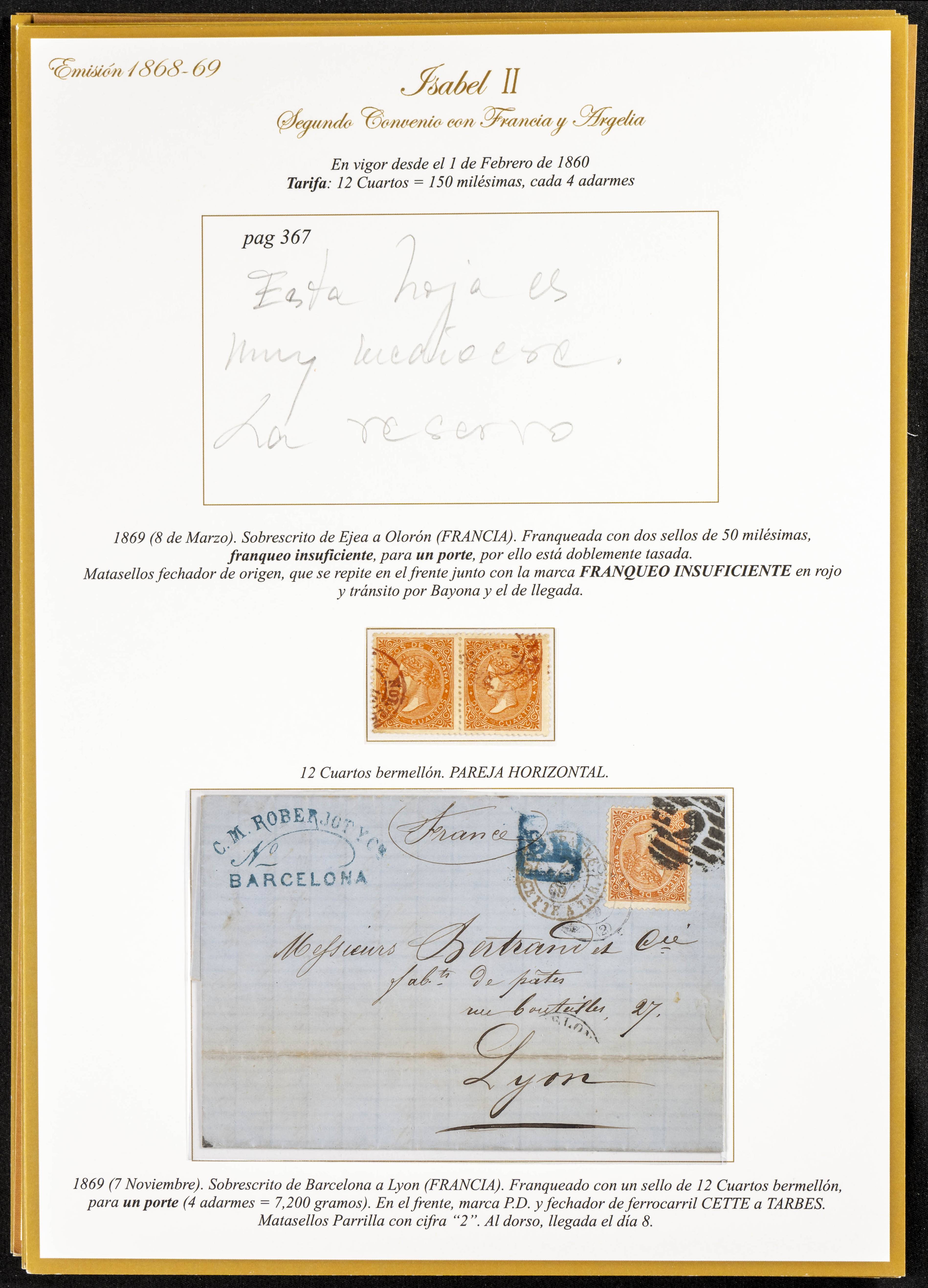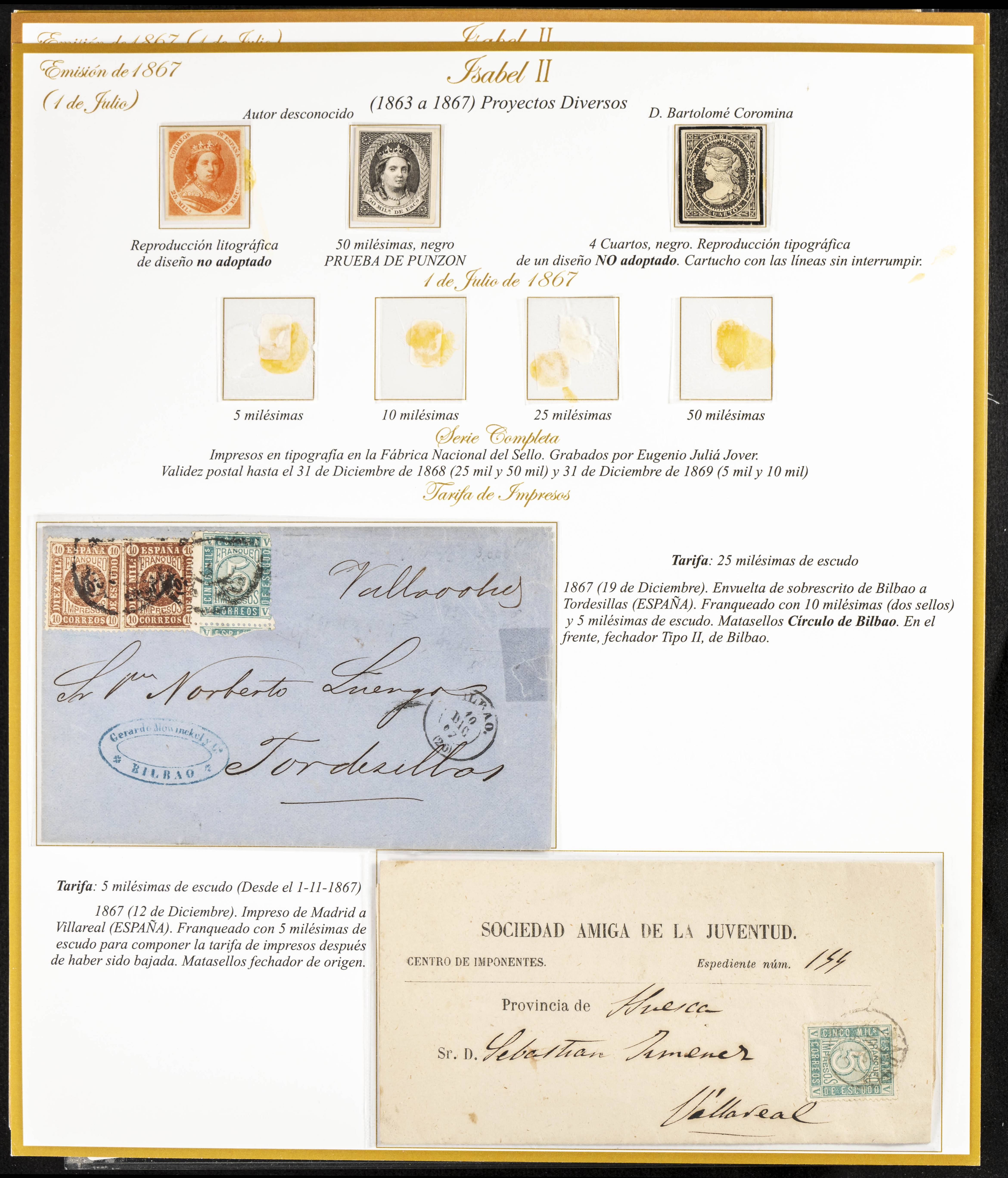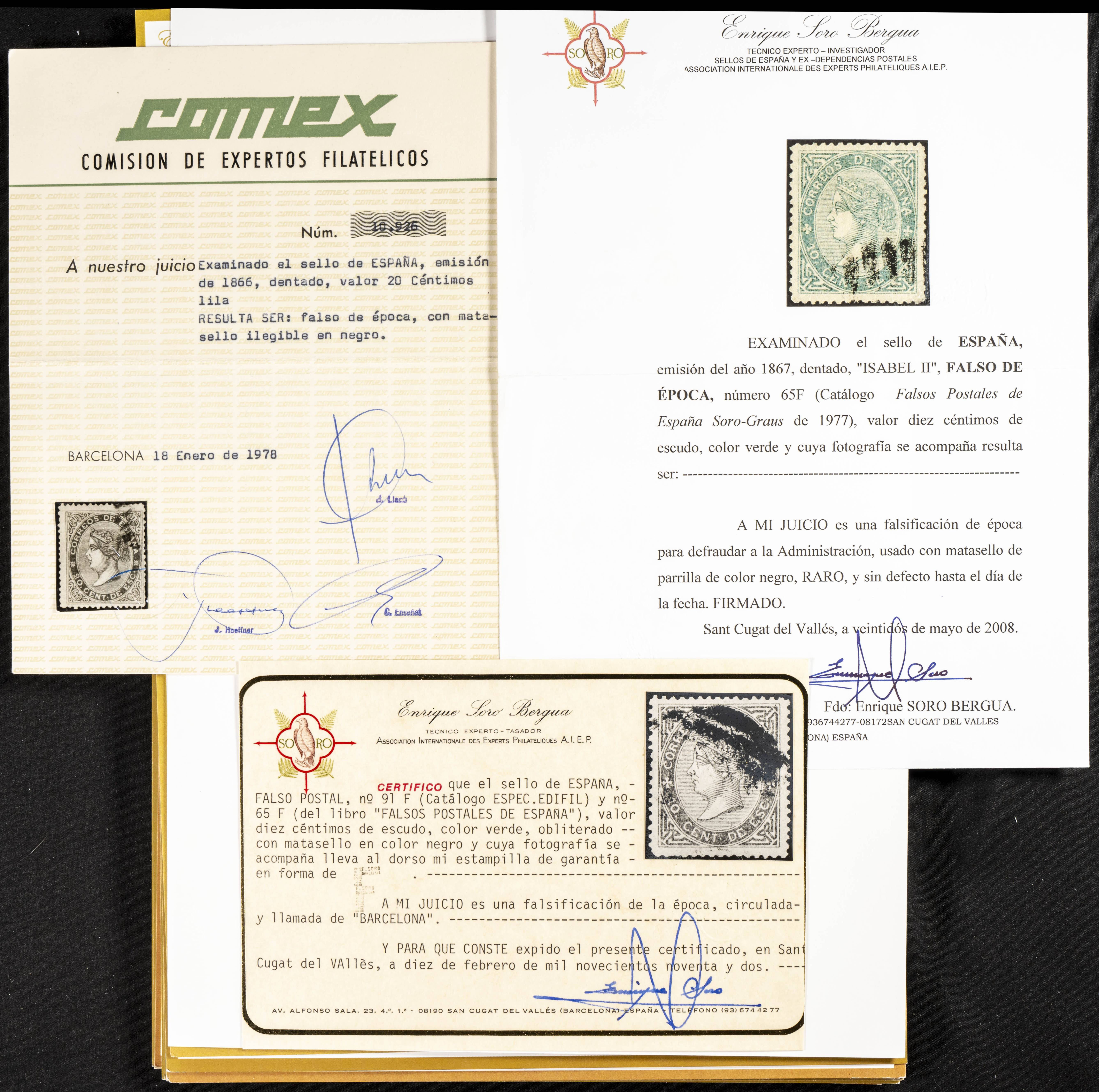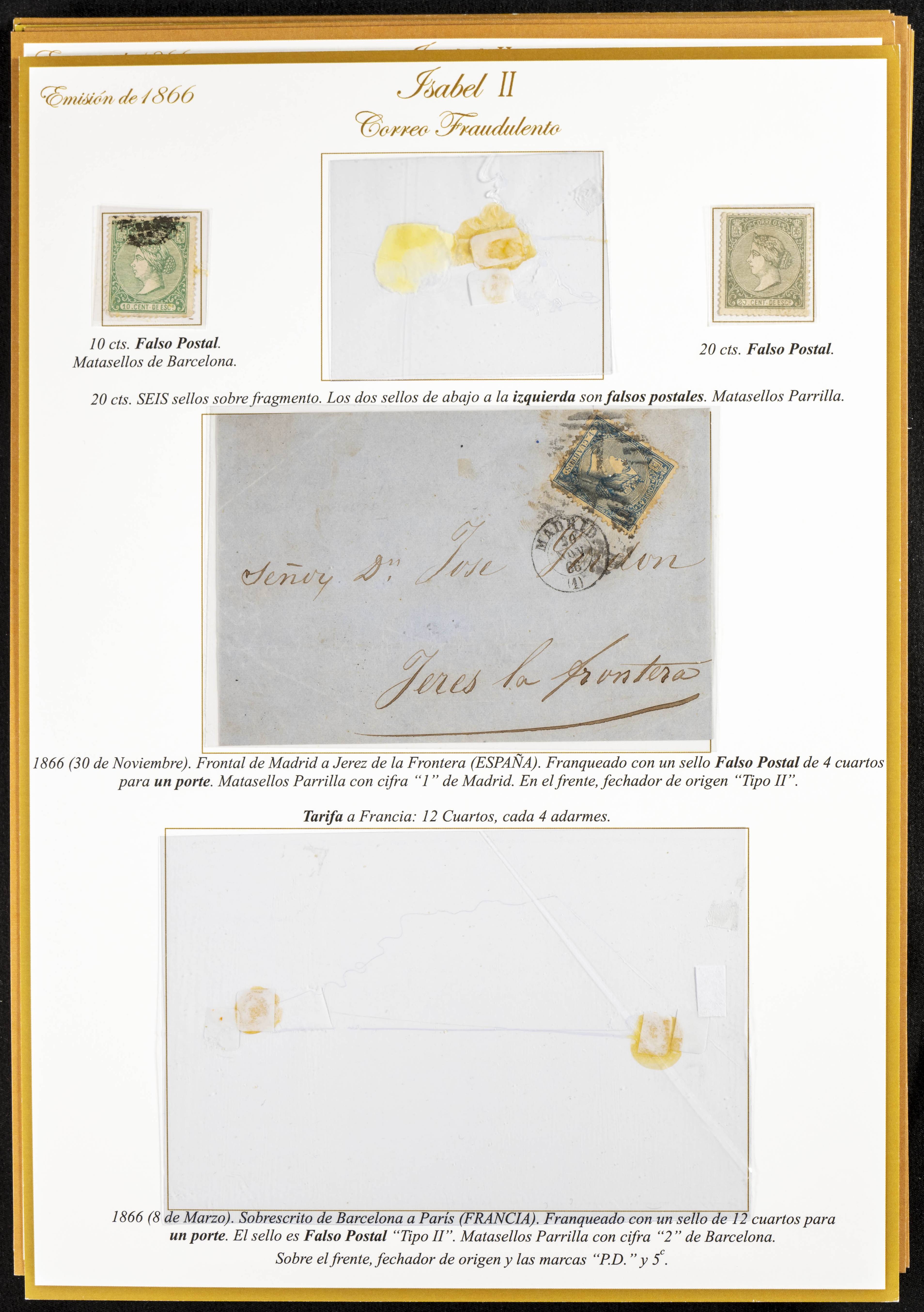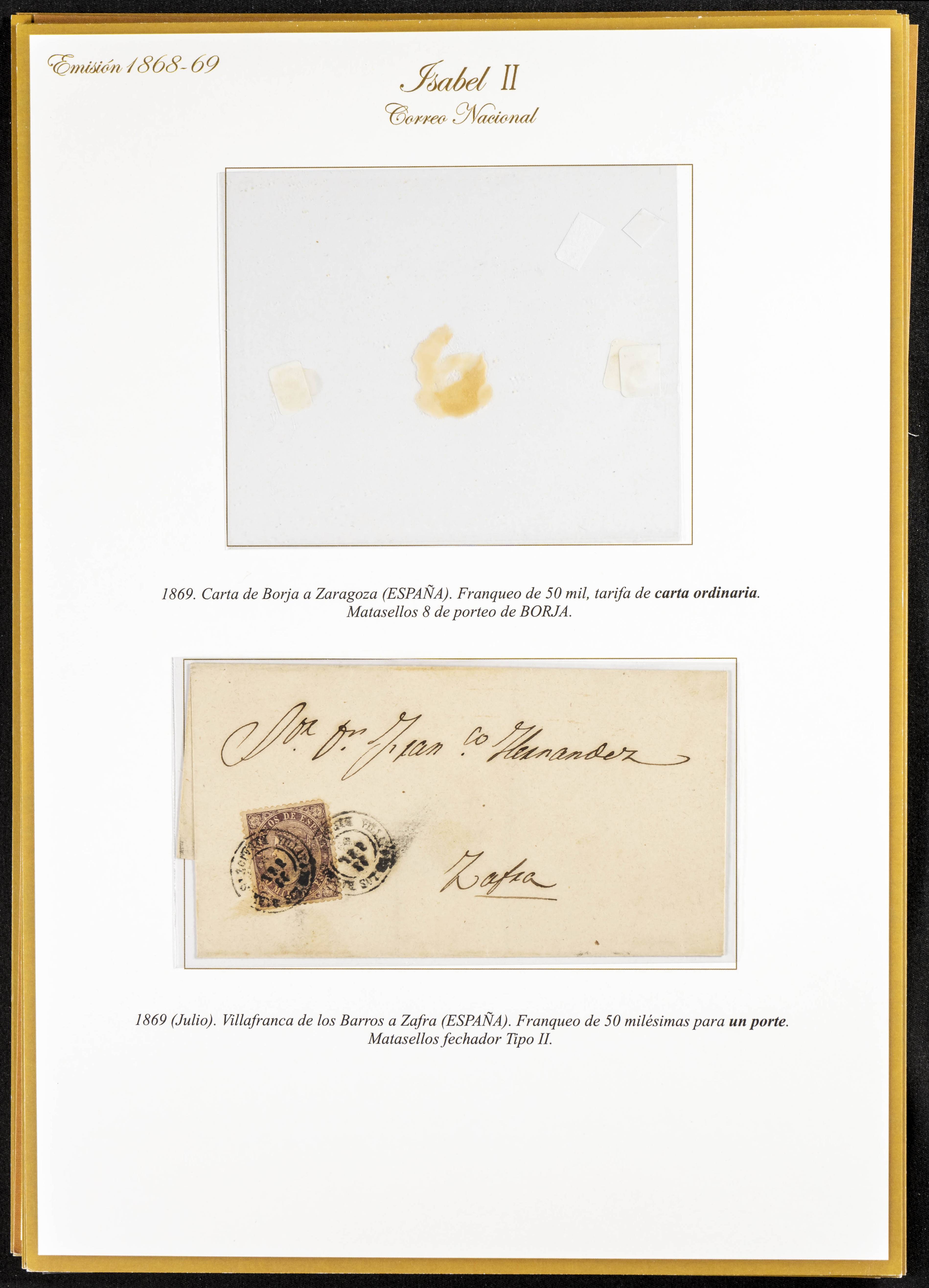 English ★/(1865ca). Spectacular remainder of a specialized collection of perforated stamps issued by Isabella II between 1865 and 1868, in mint and used condition, blocks of four and larger sizes, varieties, circulated letters, and various special postmarks. Among the letters, some addressed to the Philippines, South America, and the United States stand out, as well as several with multiple postmarks. EXAMINATION IS ESSENTIAL.