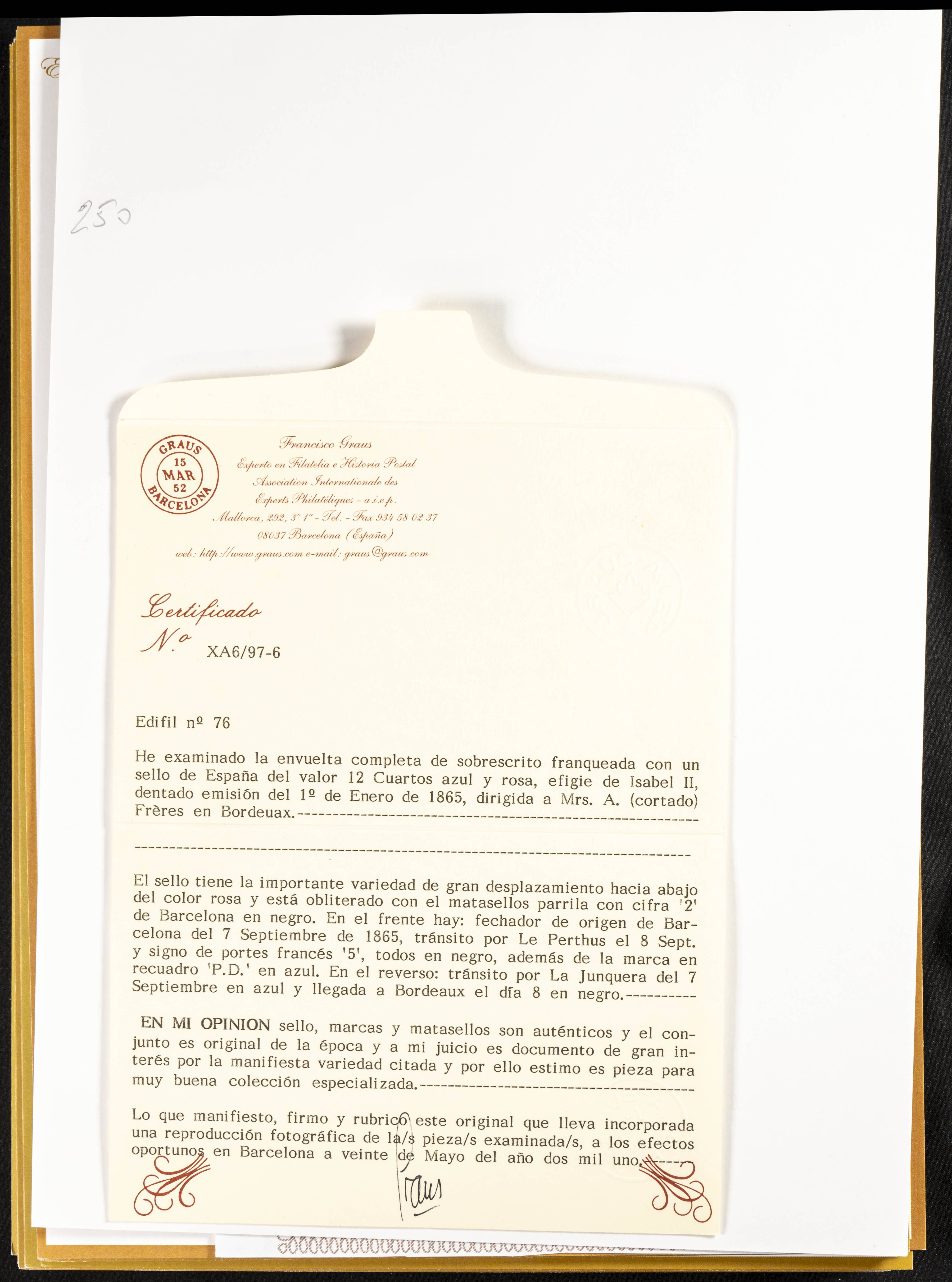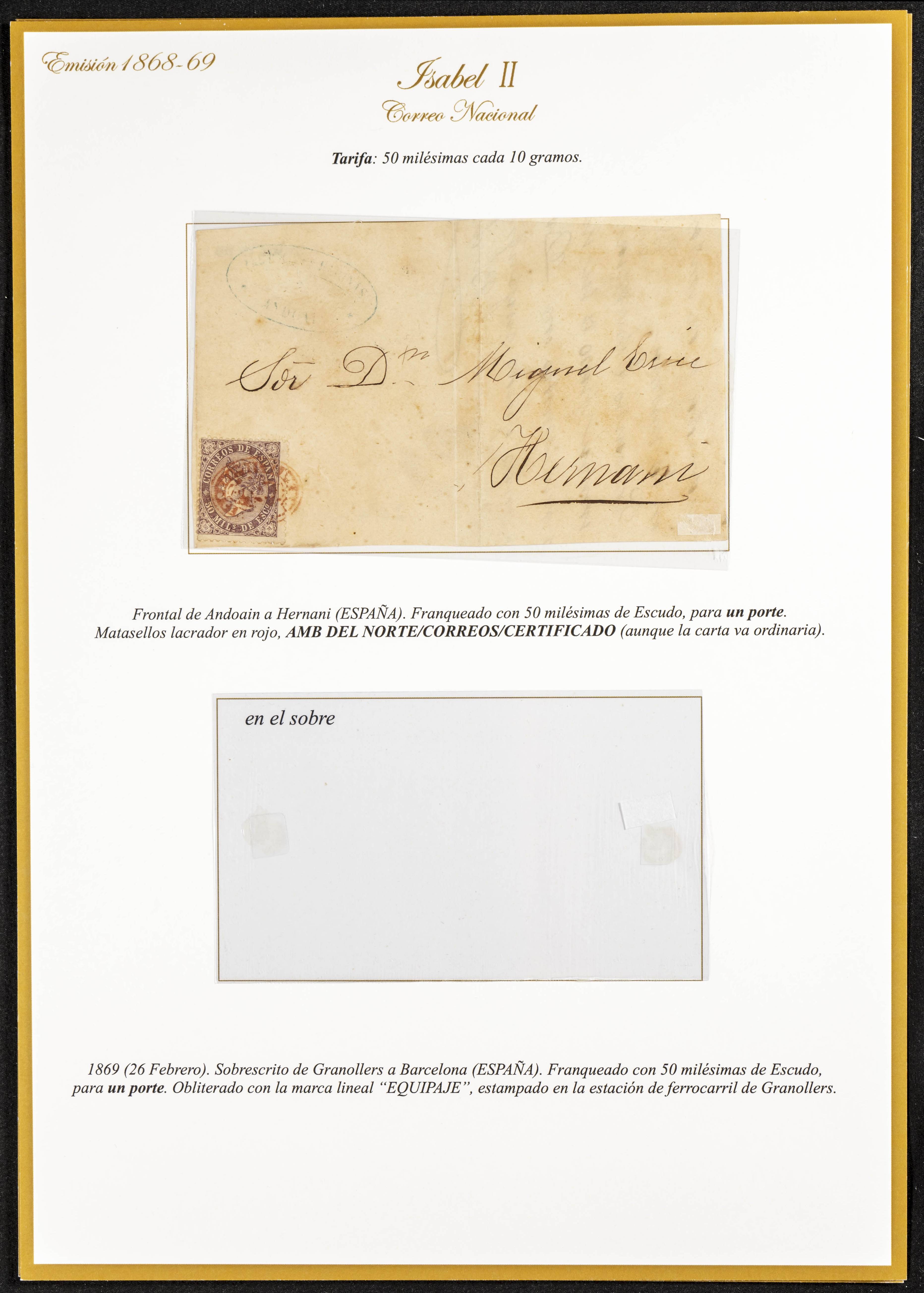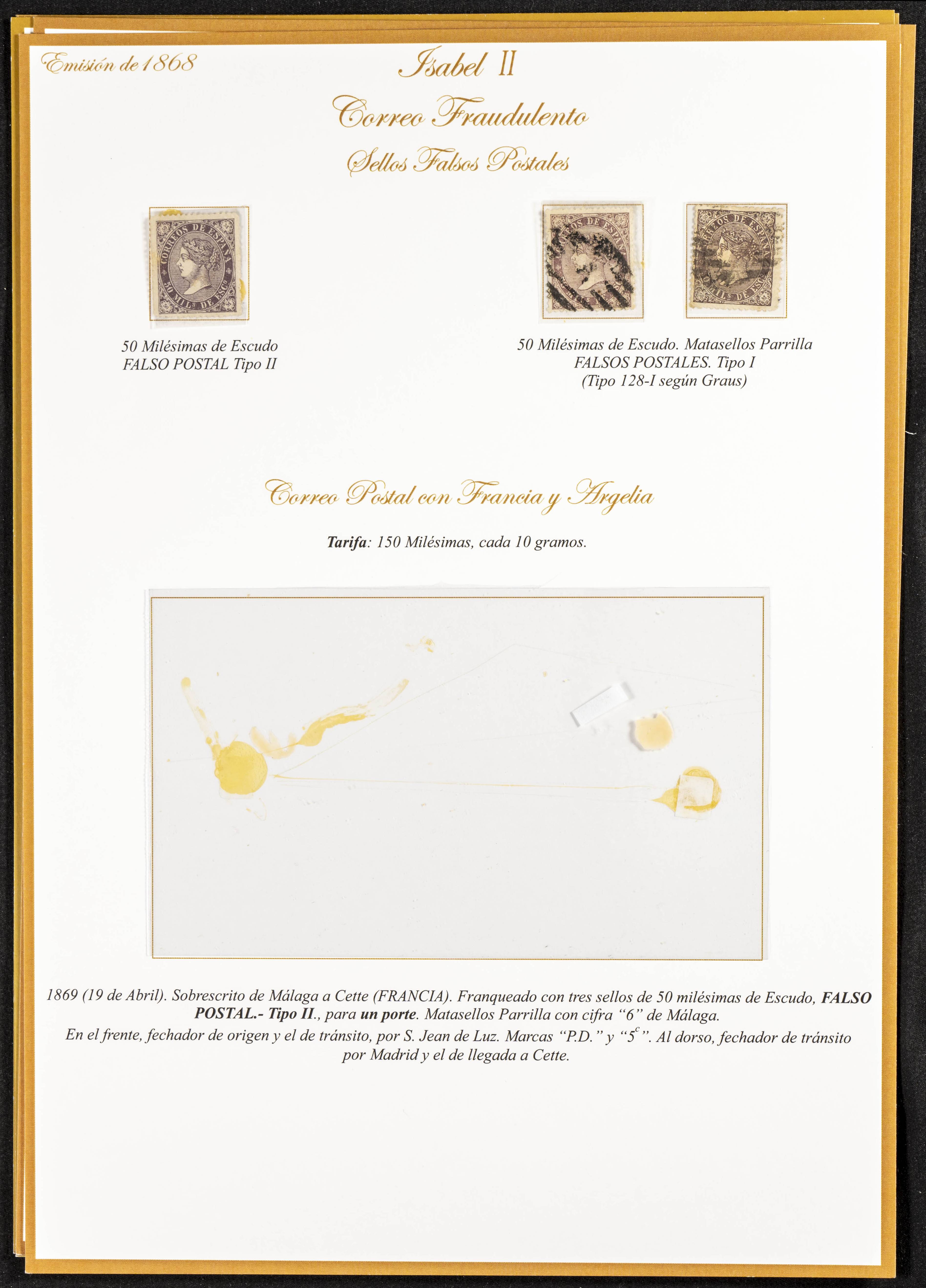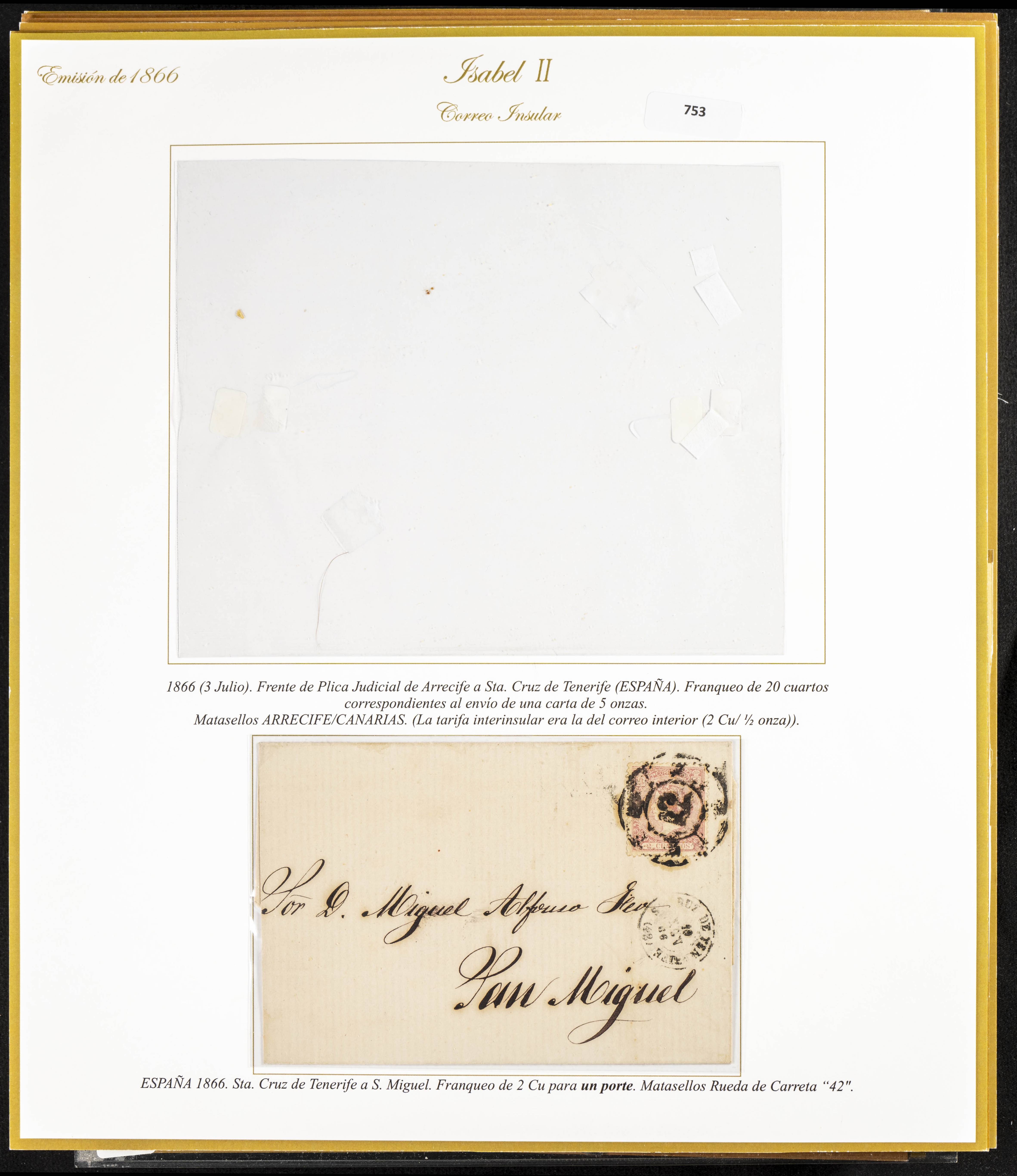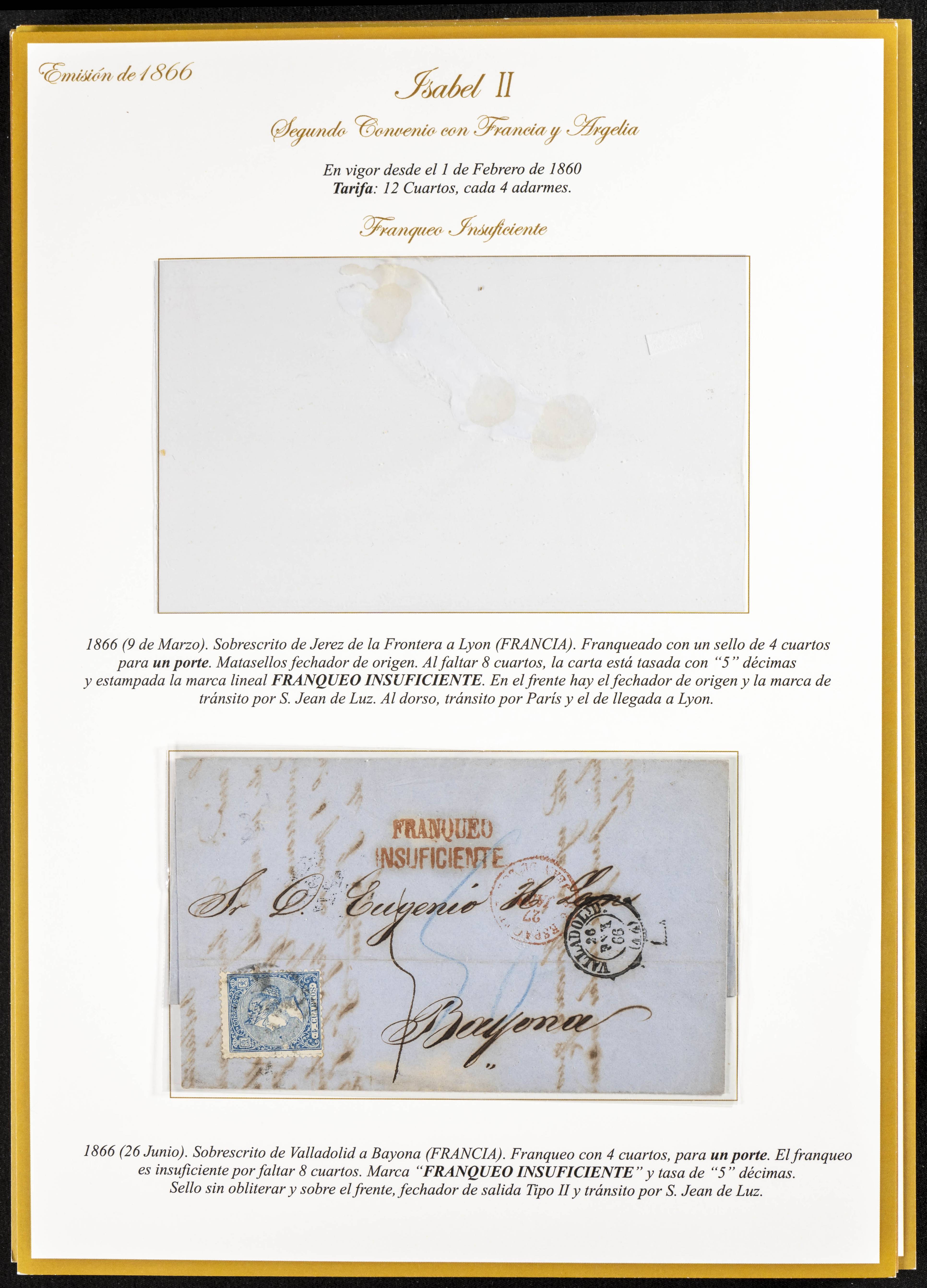 English ★/(1865ca). Spectacular remainder of a specialized collection of perforated stamps issued by Isabella II between 1865 and 1868, in mint and used condition, blocks of four and larger sizes, varieties, circulated letters, and various special postmarks. Among the letters, some addressed to the Philippines, South America, and the United States stand out, as well as several with multiple postmarks. EXAMINATION IS ESSENTIAL.